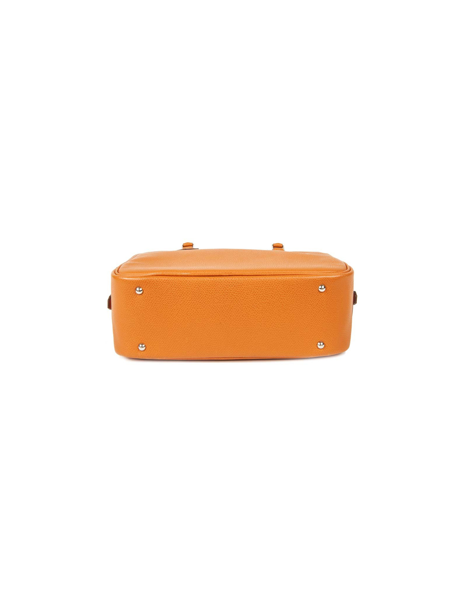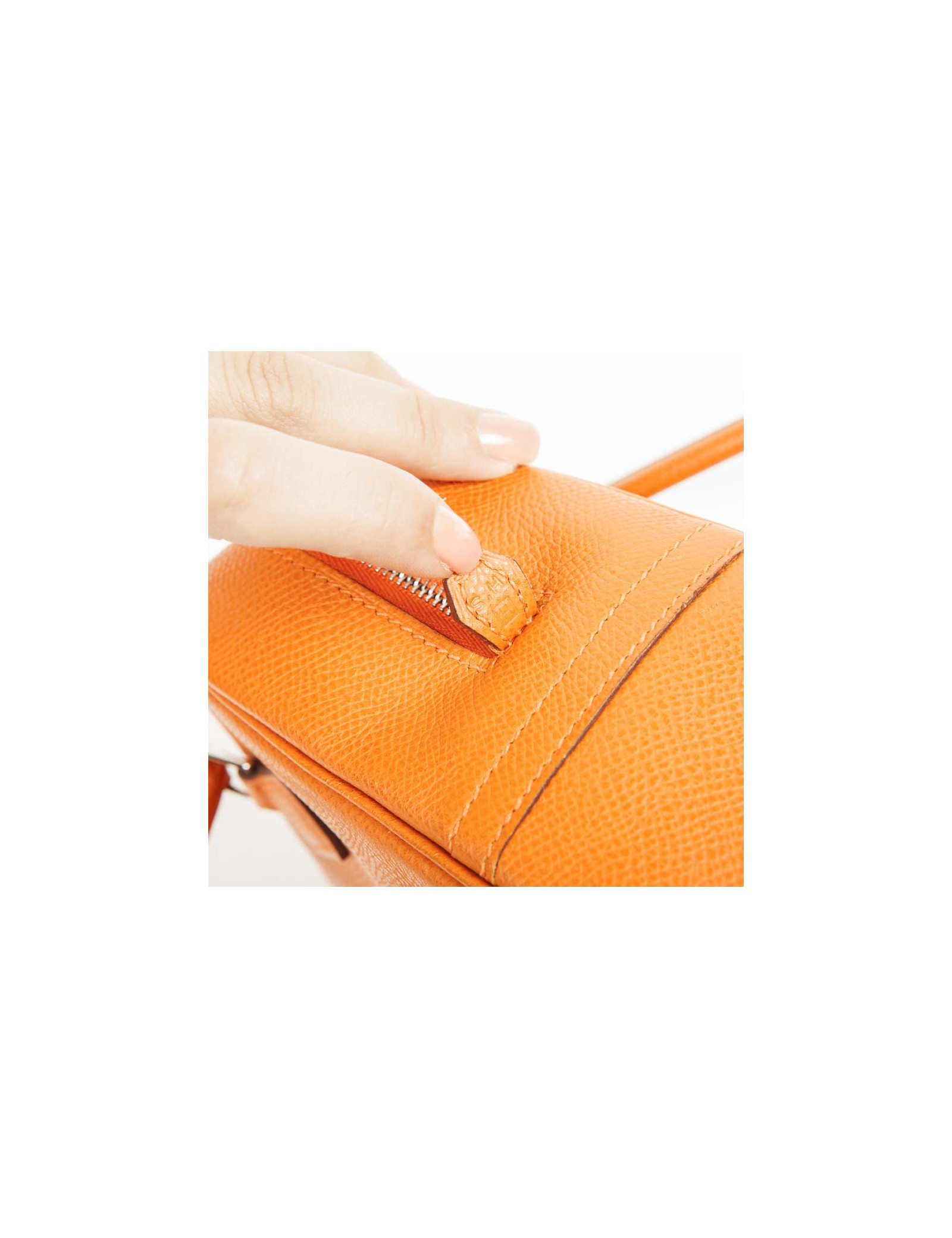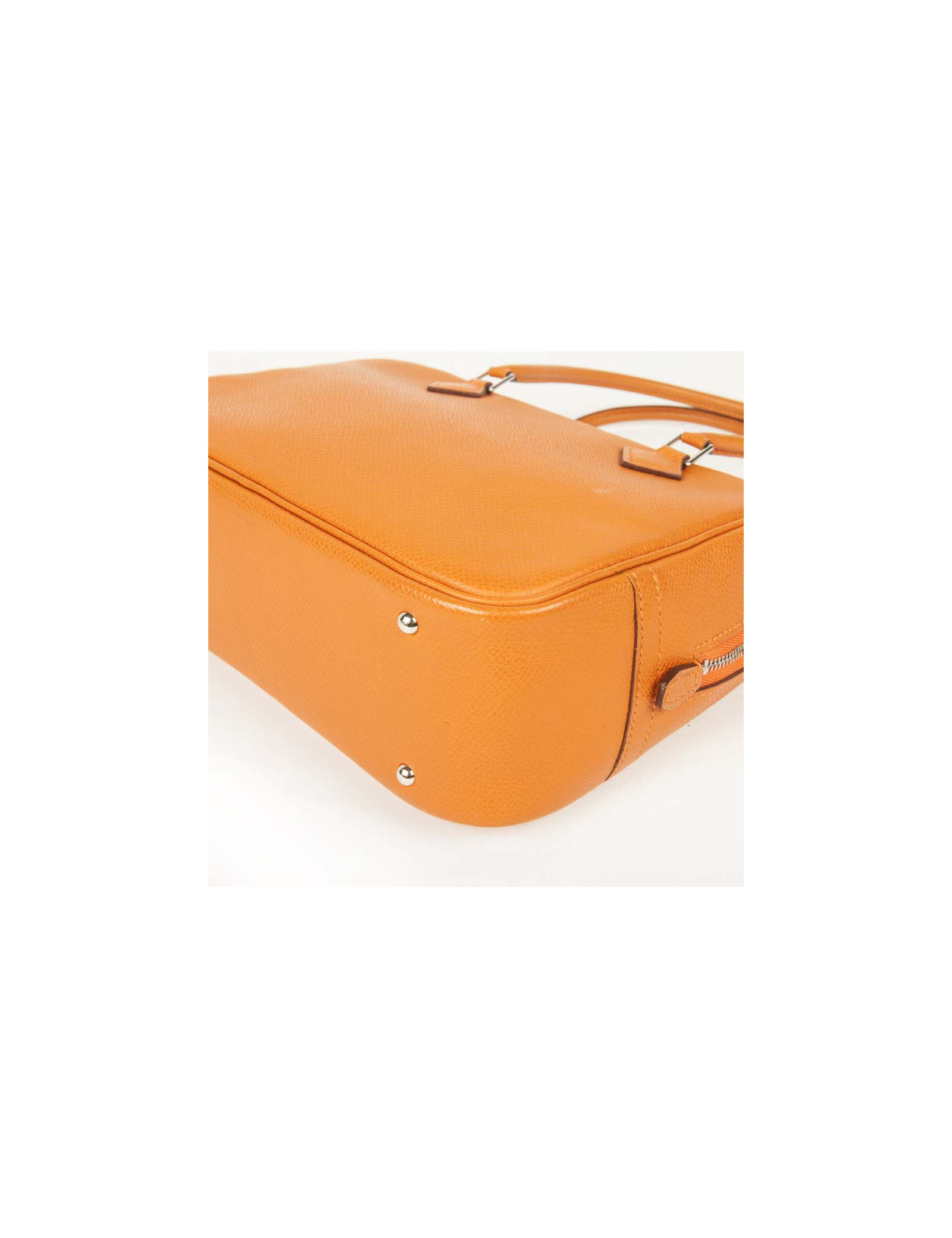 Mini sac 'Plume' de la Maison Hermès en cuir grainé orange. Bijouterie argentée. Fermeture zippée. Lettre H dans un carré (sous la languette droite extérieure). En très bon état. Très légère usure des coins sous le sac ainsi qu'une petite marque de stylo. Il se porte au bras.