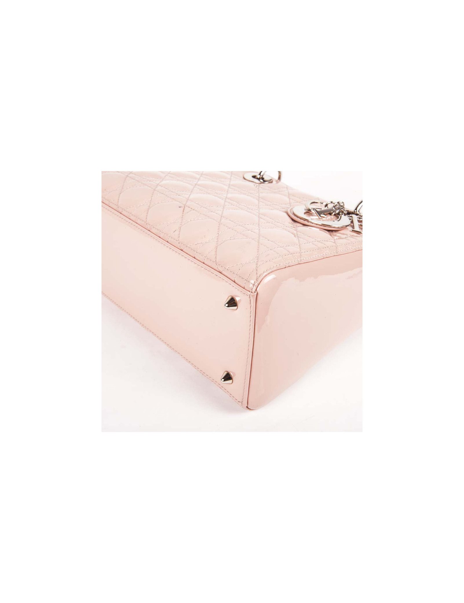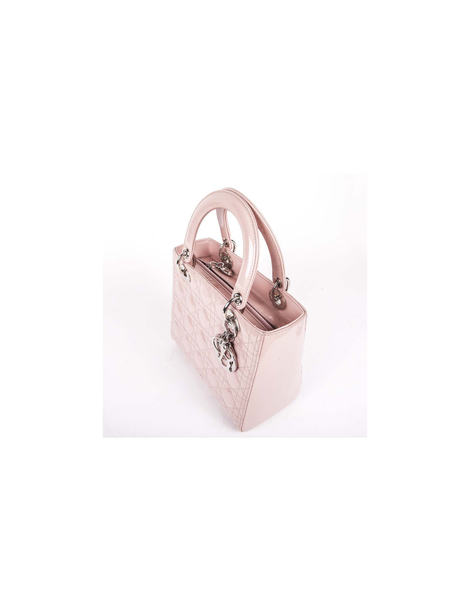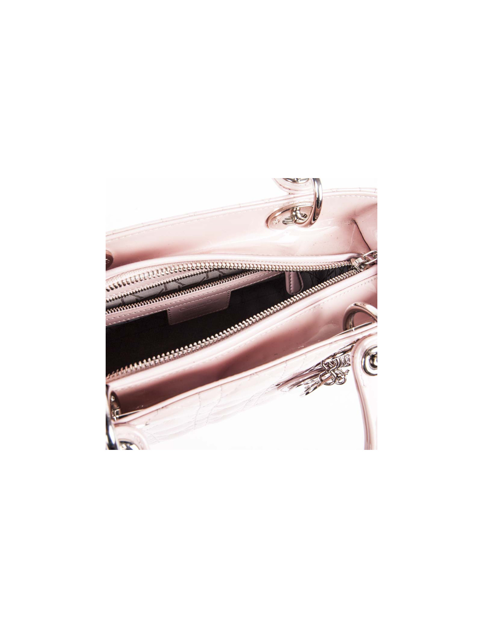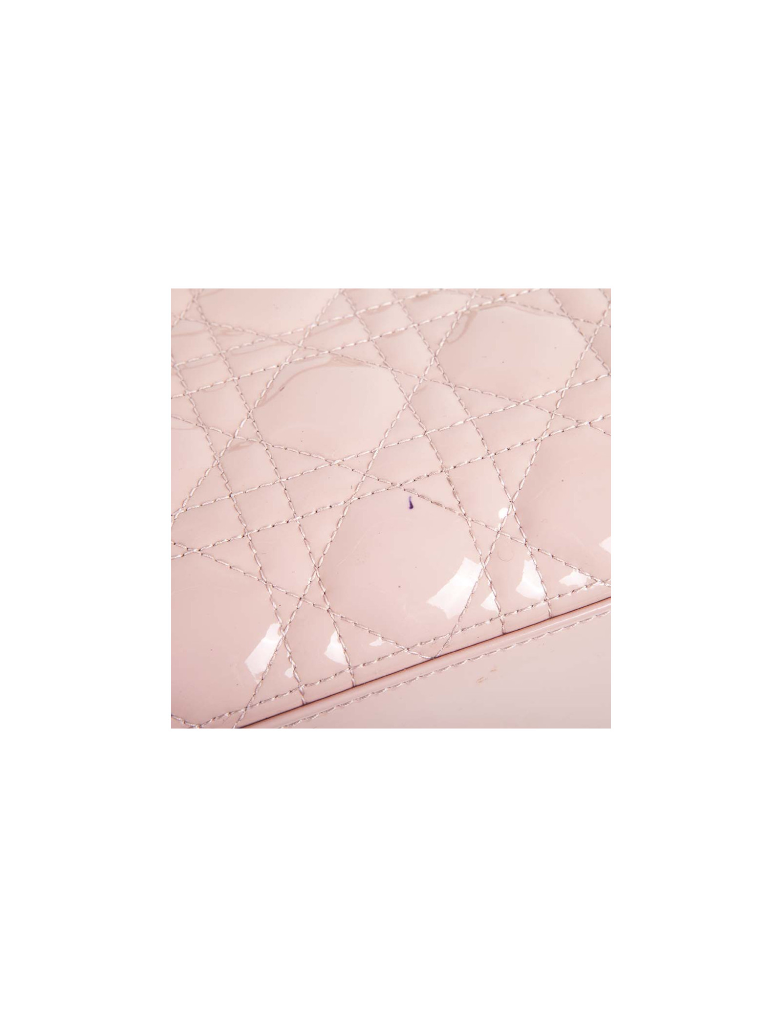 Sac Lady D Dior en cuir verni rose matelassé cannage, intérieur en toile cannage gris poche zippé en très bon état (2 petites traces de stylo, voir photo).