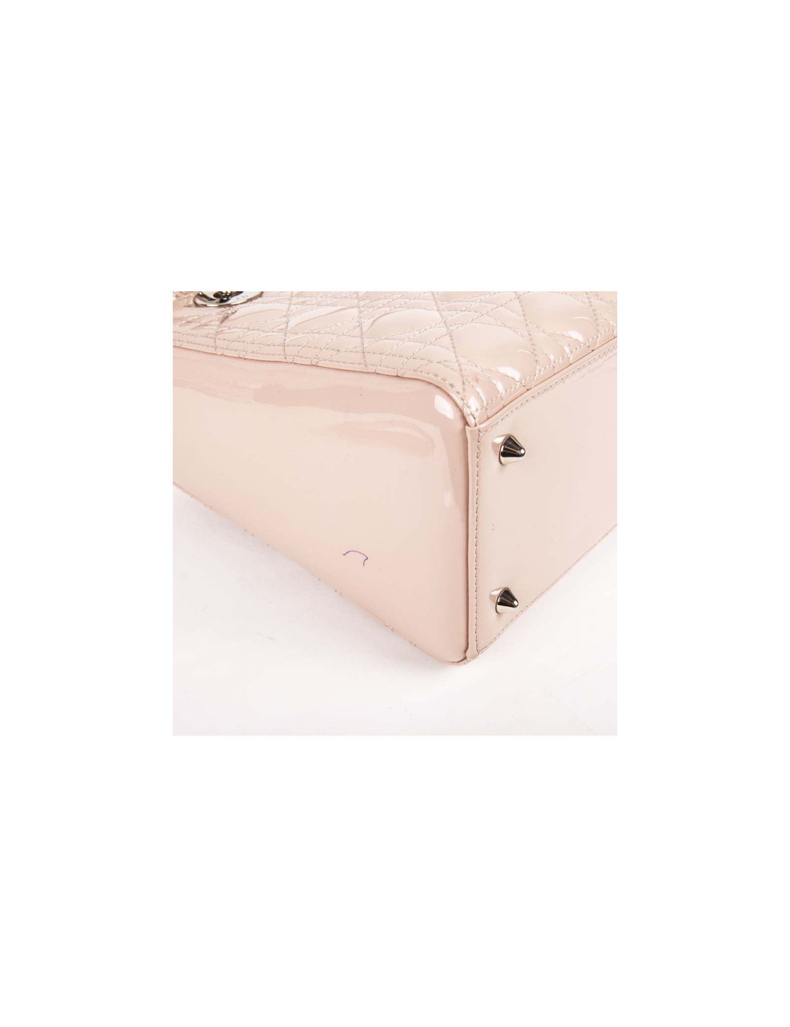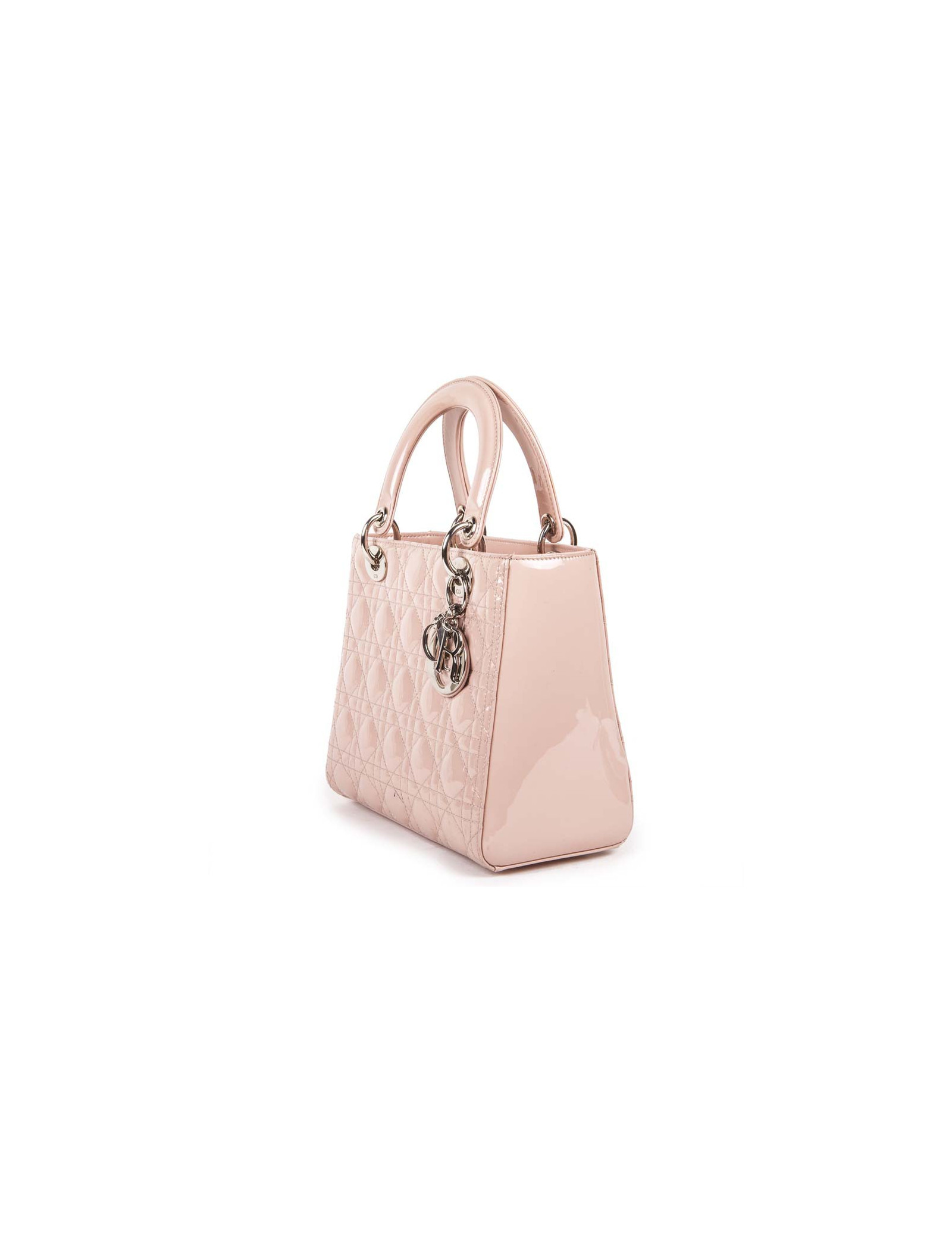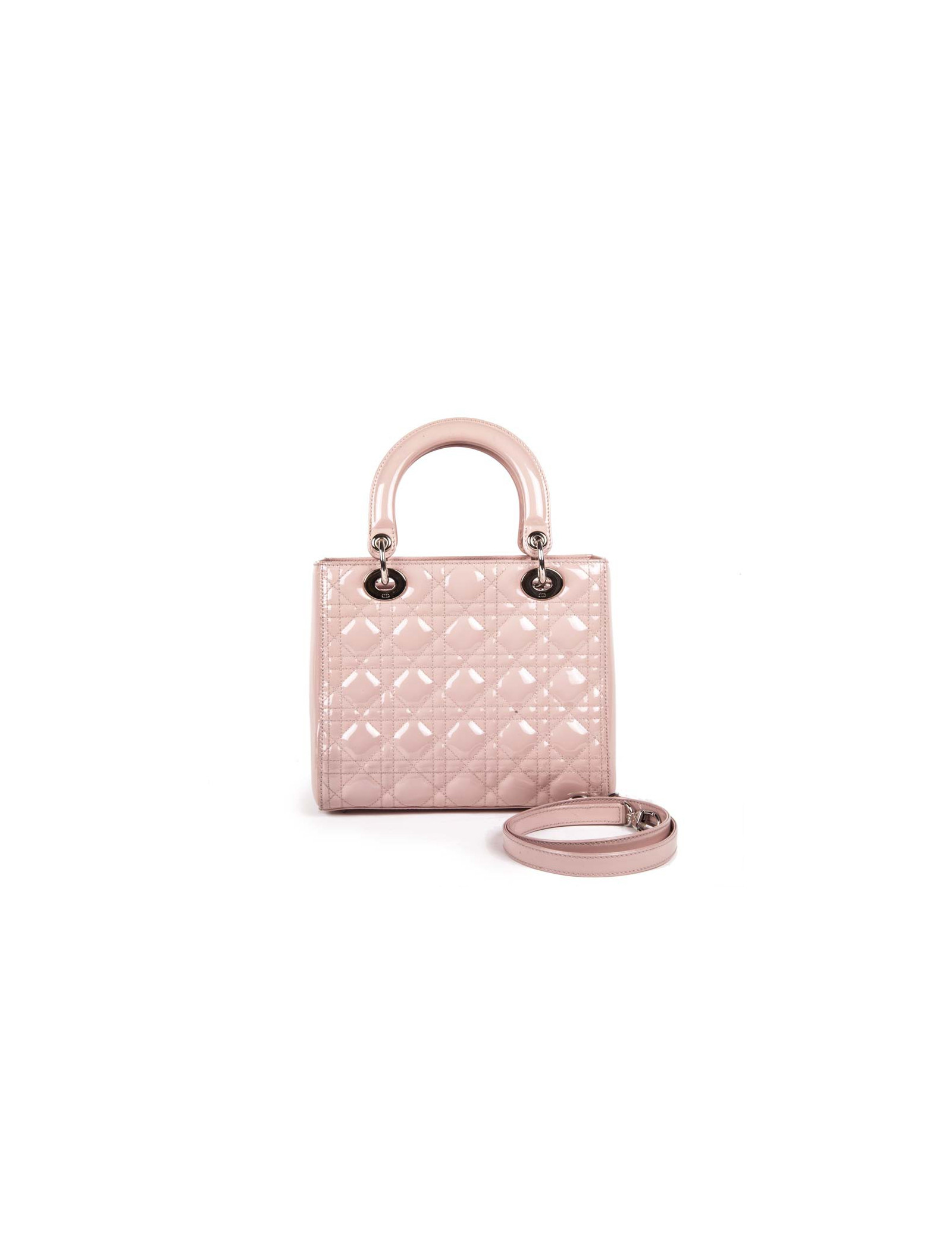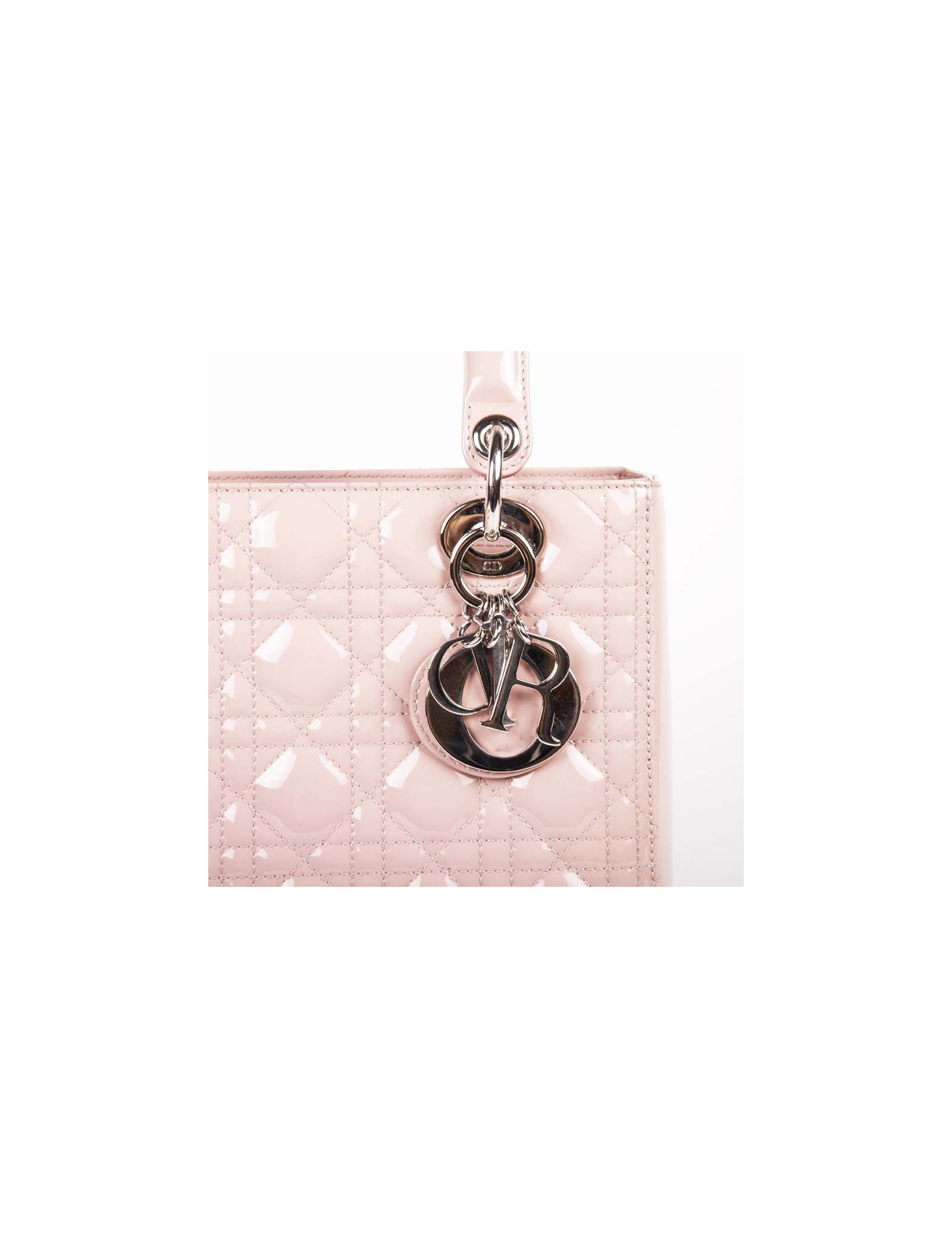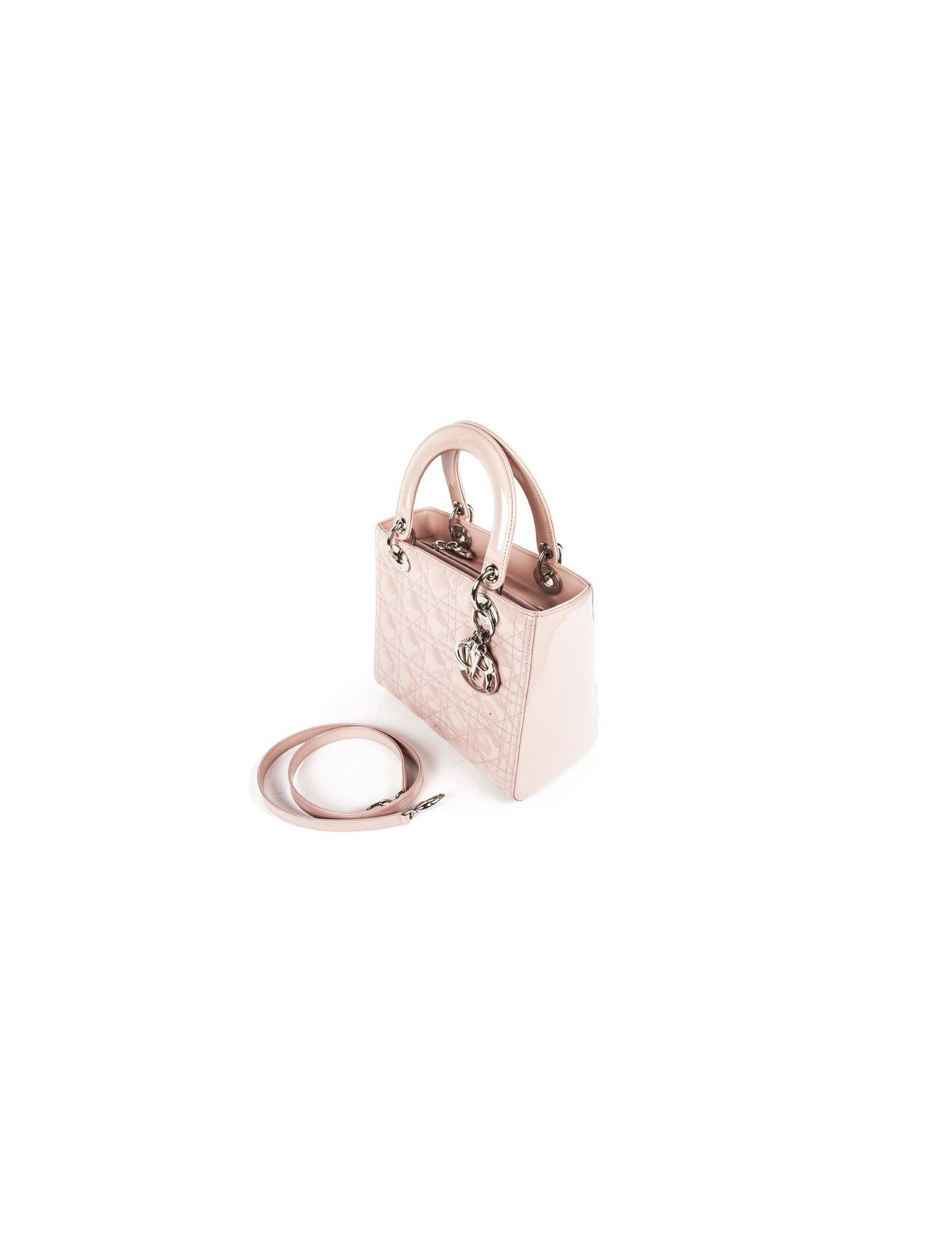 Sac Lady D Dior en cuir verni rose matelassé cannage, intérieur en toile cannage gris poche zippé en très bon état (2 petites traces de stylo, voir photo).