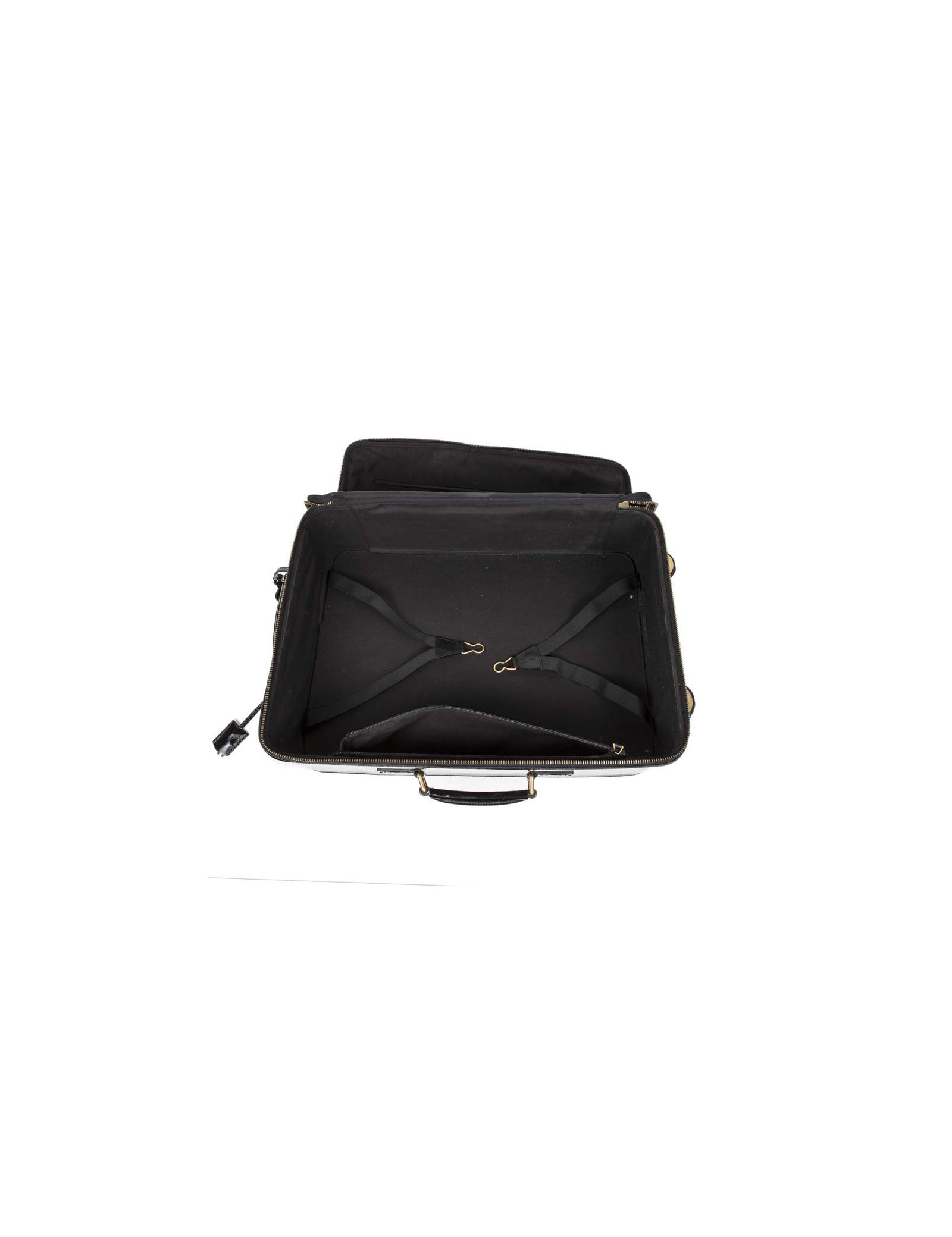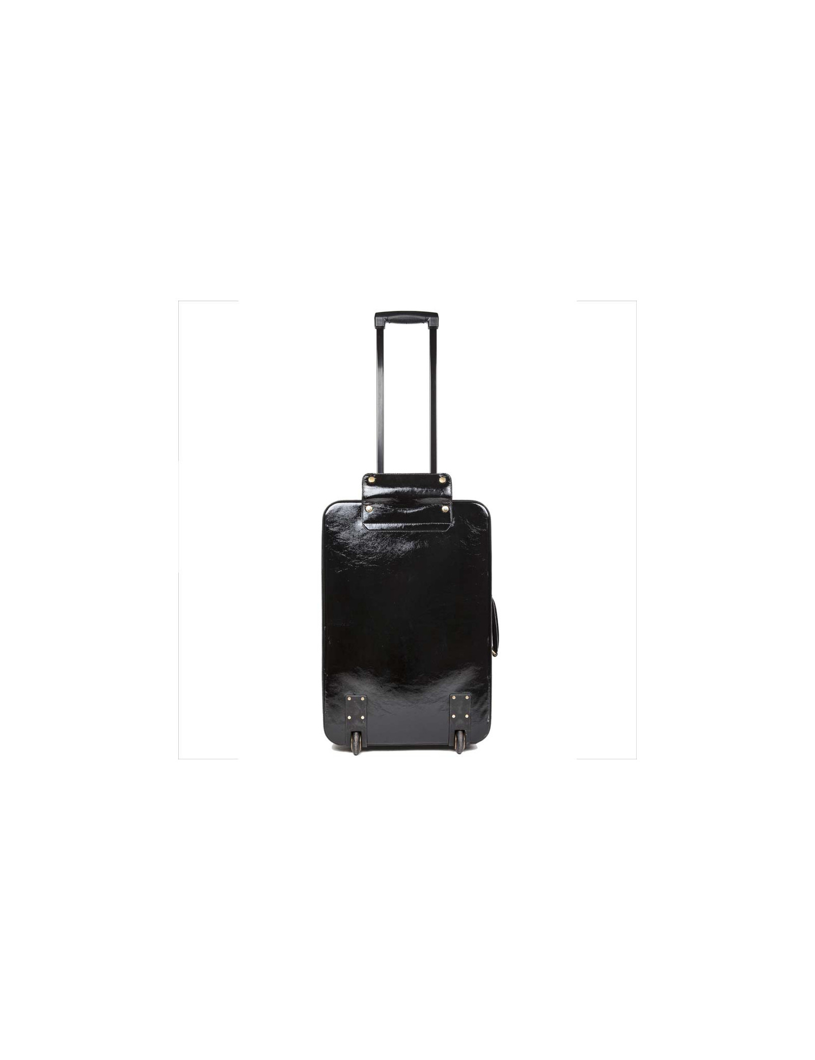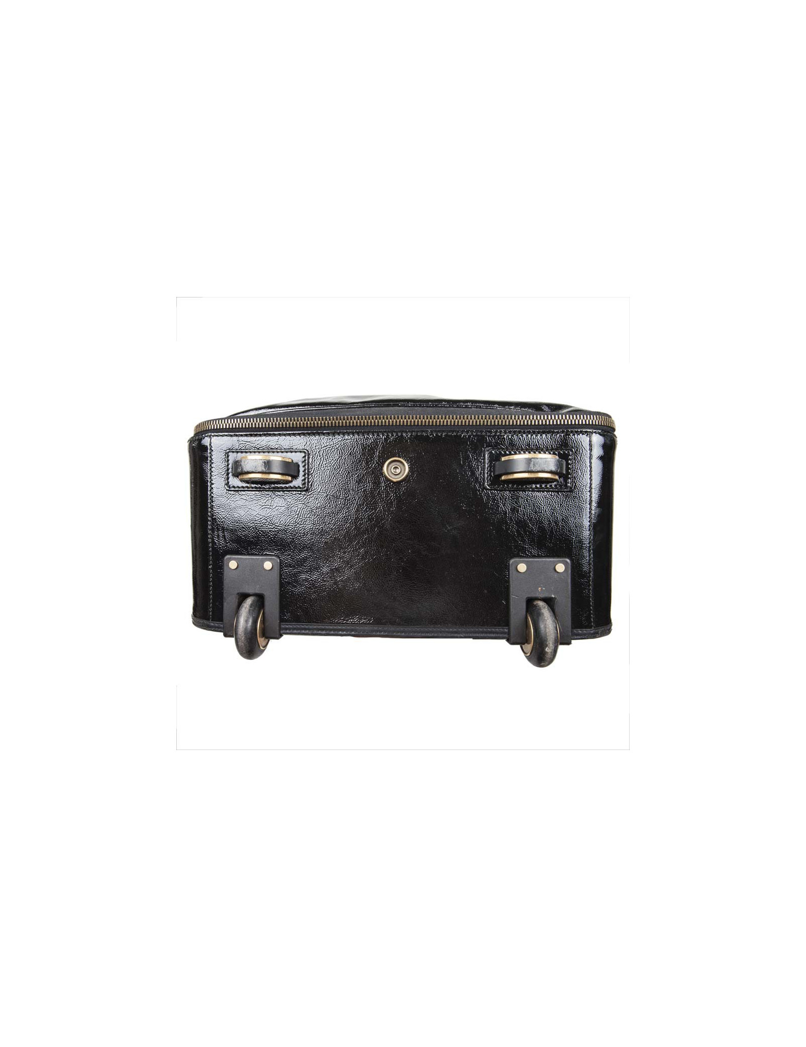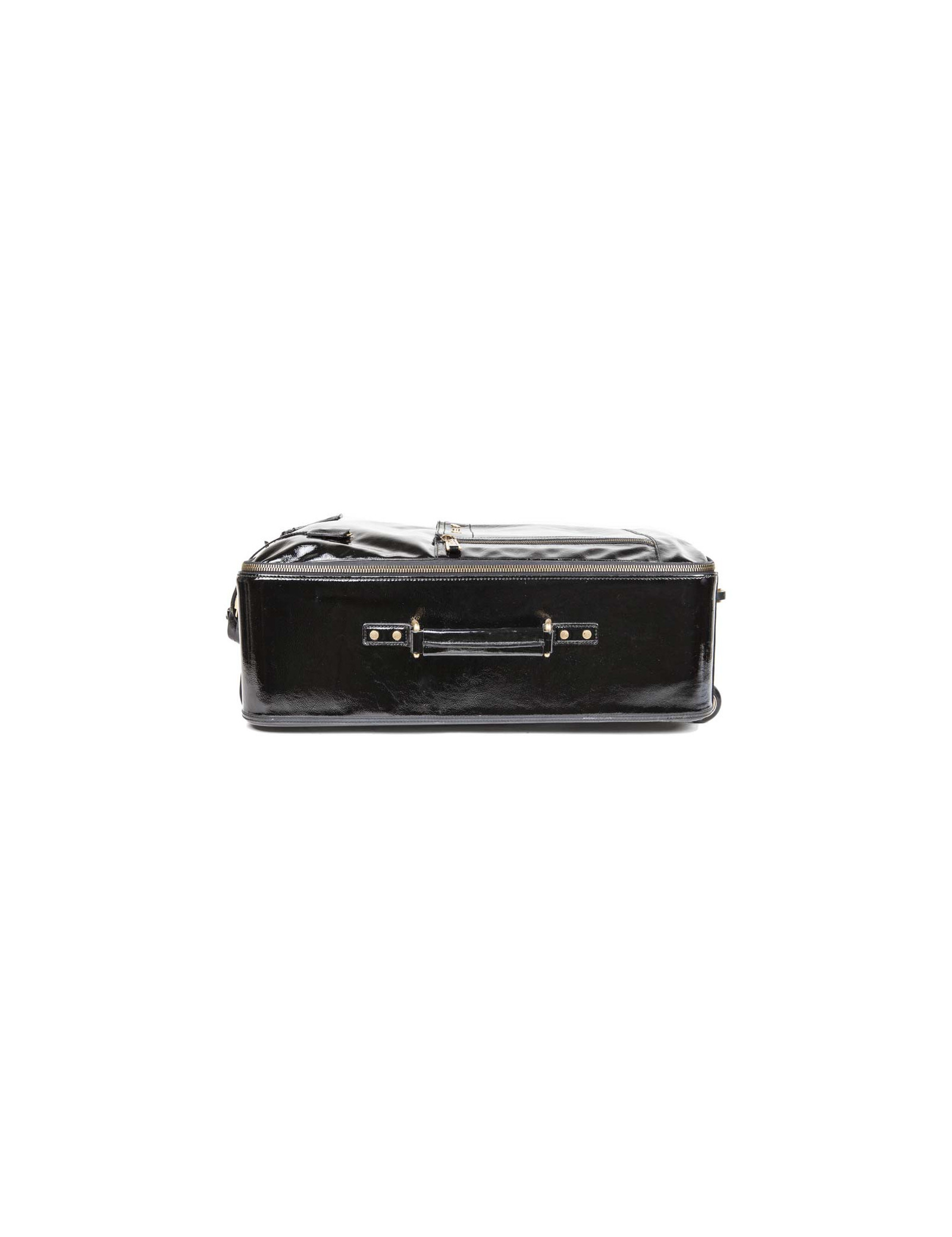 Valise à roulettes en cuir verni noir de la Maison Yves Saint Laurent. Bijouterie dorée vieilli. Fermeture zippée. L'intérieur est en tissu noir avec une grande poche zippée et une plus petite ainsi que deux lanières pour tenir les vêtements. Porté main avec une poignée simple ainsi qu'avec une poignée étirable pour faciliter le porté. Cadenas, tirette, clochette et clefs. Porte adresse. En très bon état.