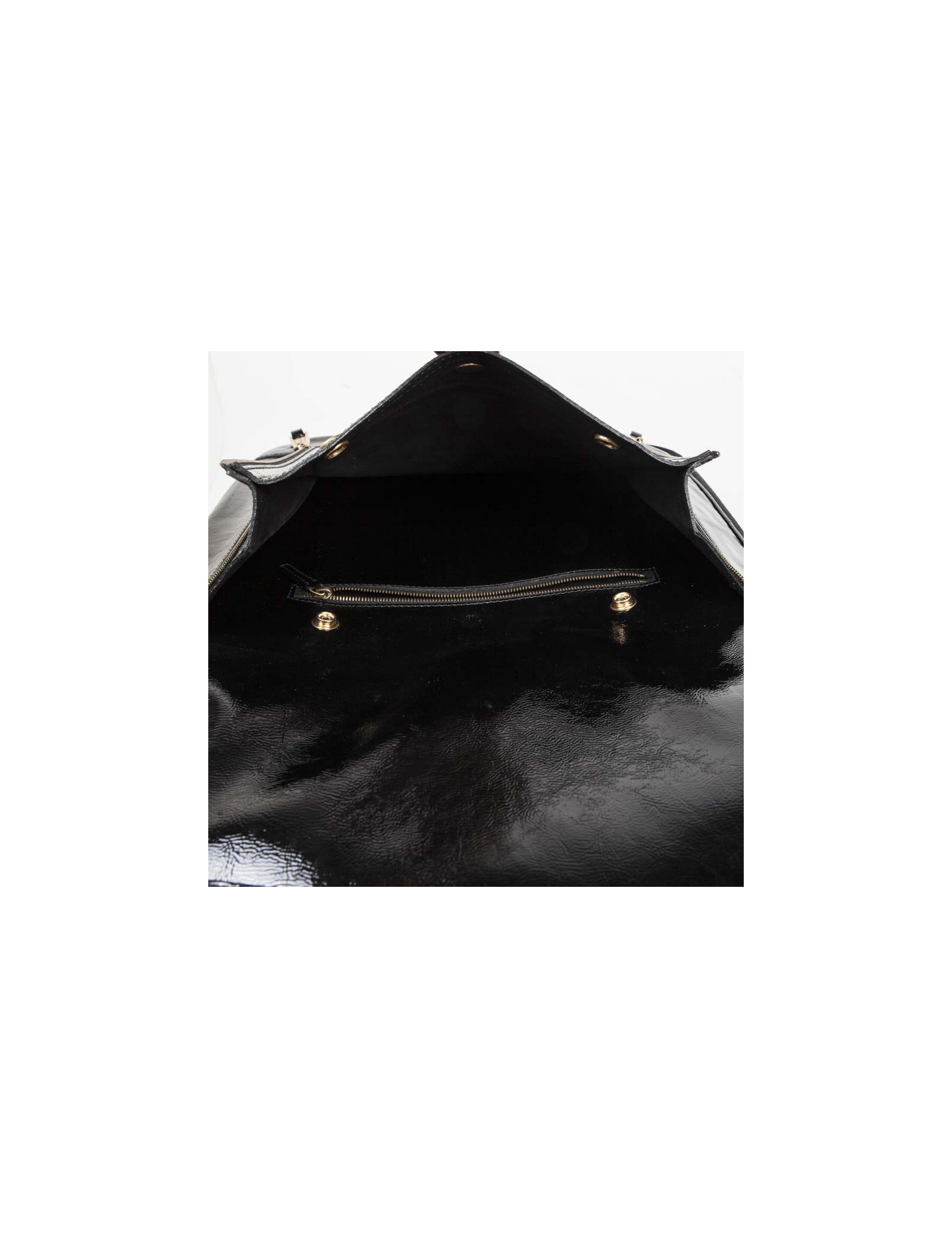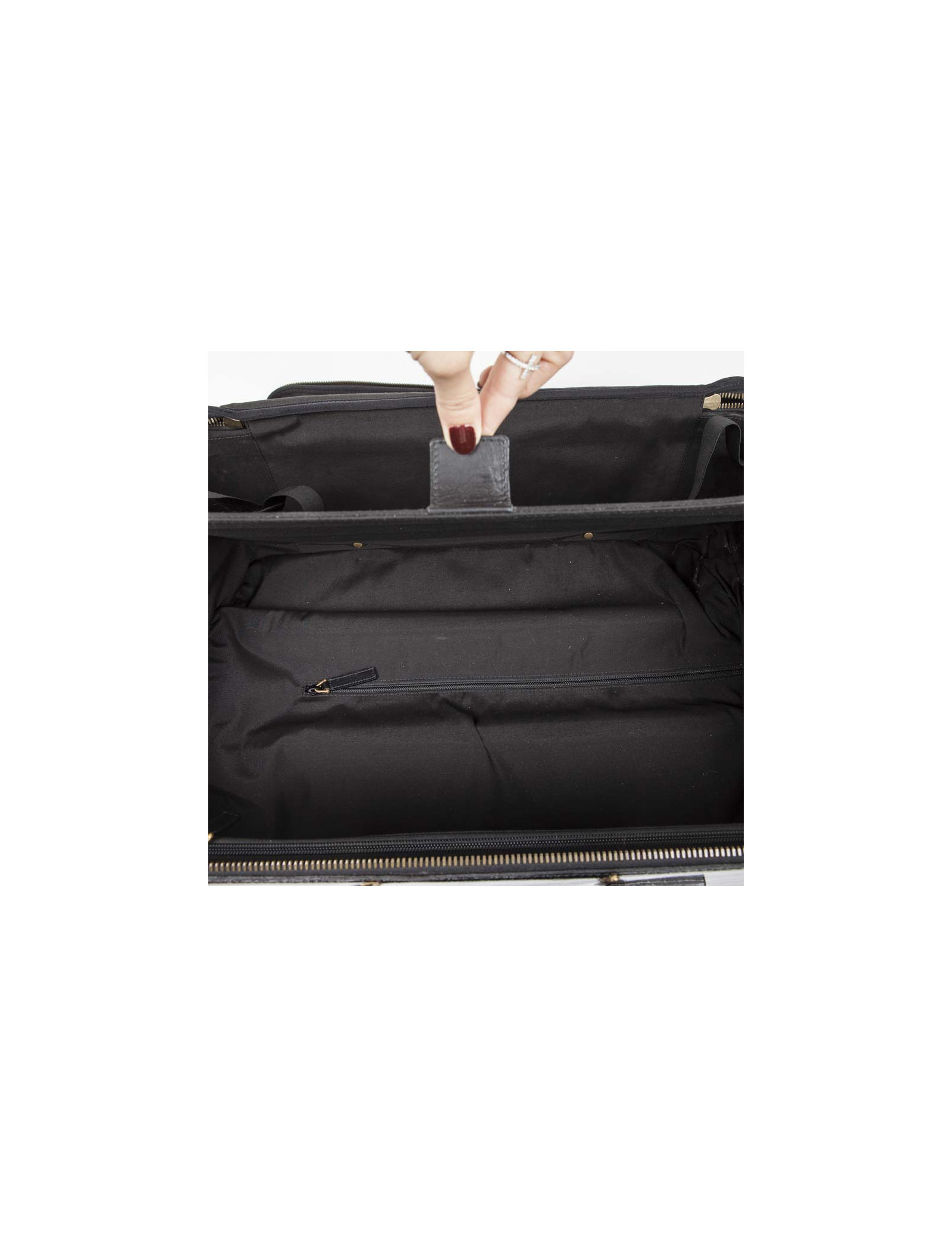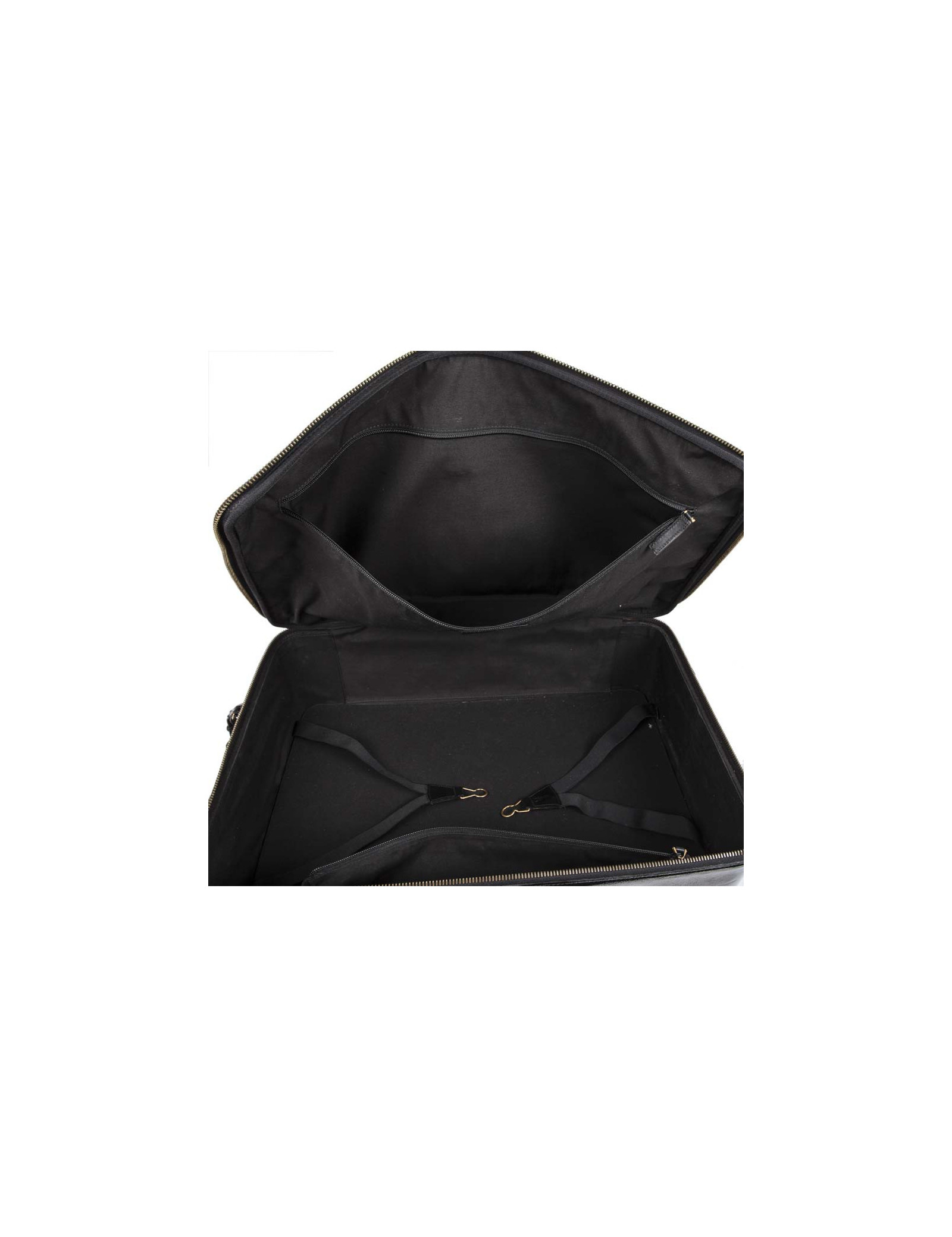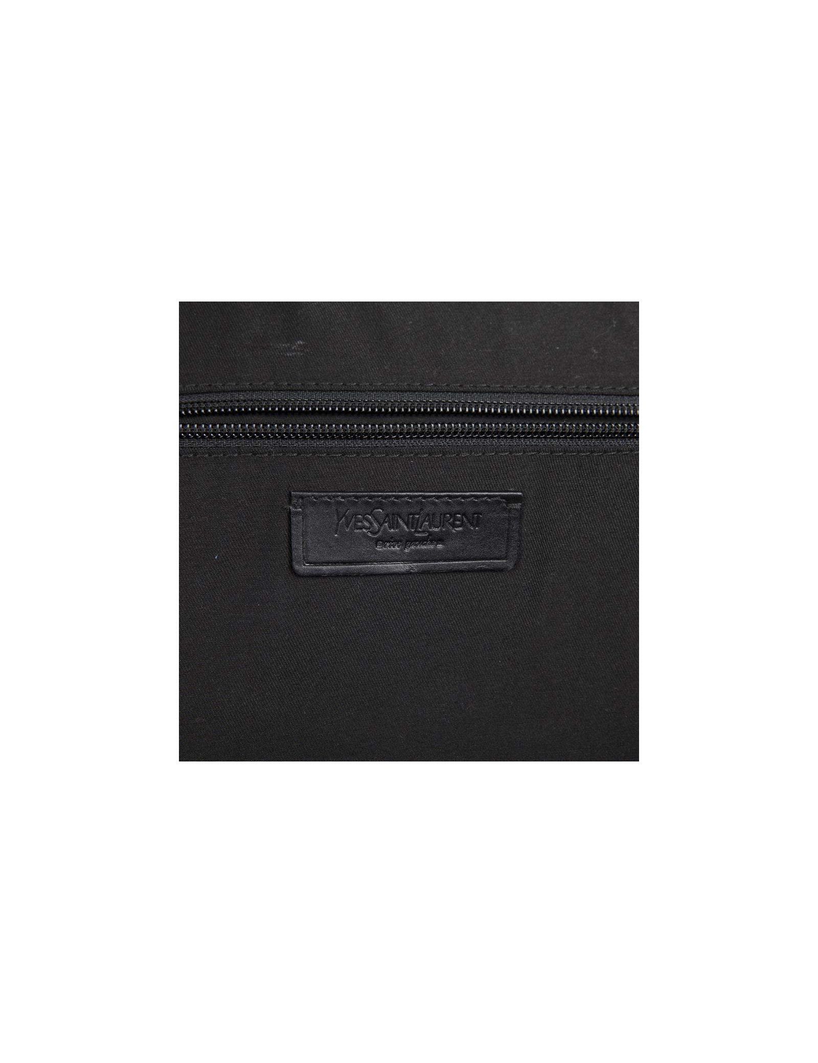 Valise à roulettes en cuir verni noir de la Maison Yves Saint Laurent. Bijouterie dorée vieilli. Fermeture zippée. L'intérieur est en tissu noir avec une grande poche zippée et une plus petite ainsi que deux lanières pour tenir les vêtements. Porté main avec une poignée simple ainsi qu'avec une poignée étirable pour faciliter le porté. Cadenas, tirette, clochette et clefs. Porte adresse. En très bon état.