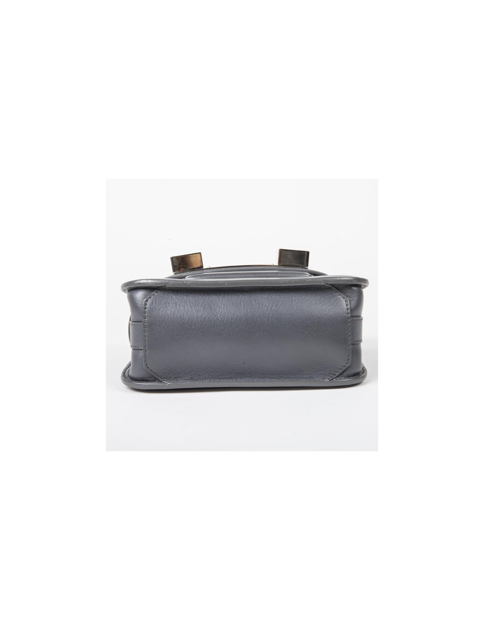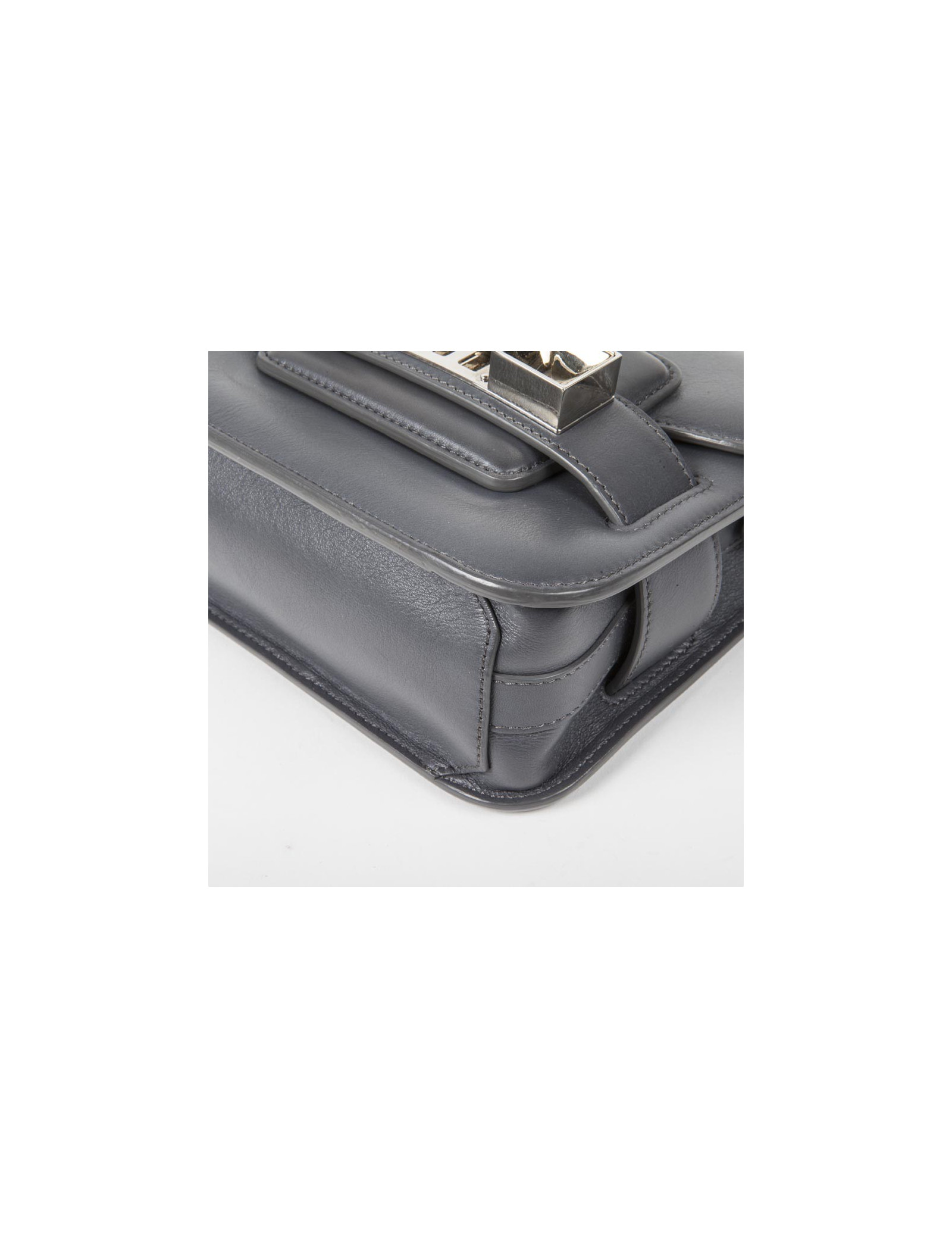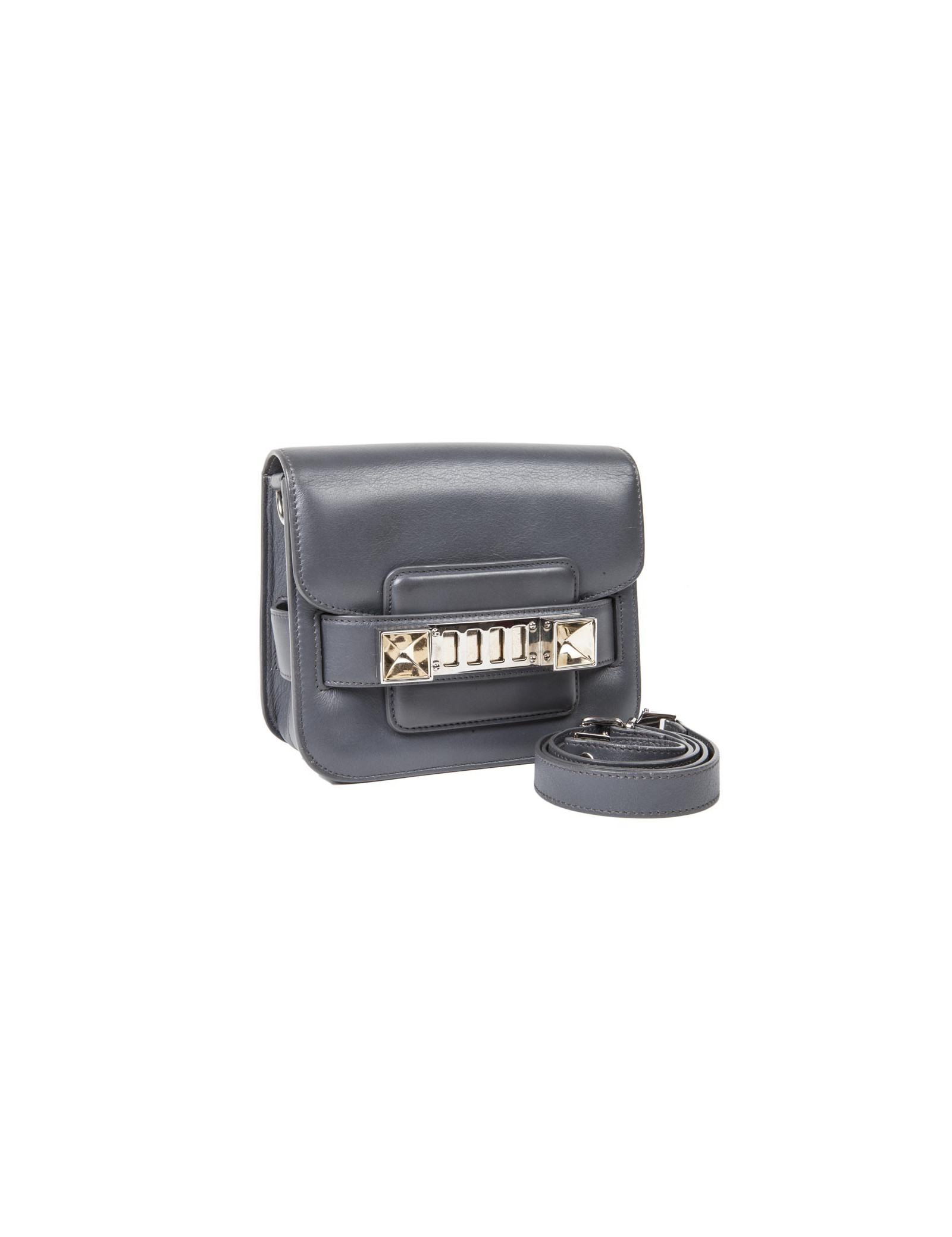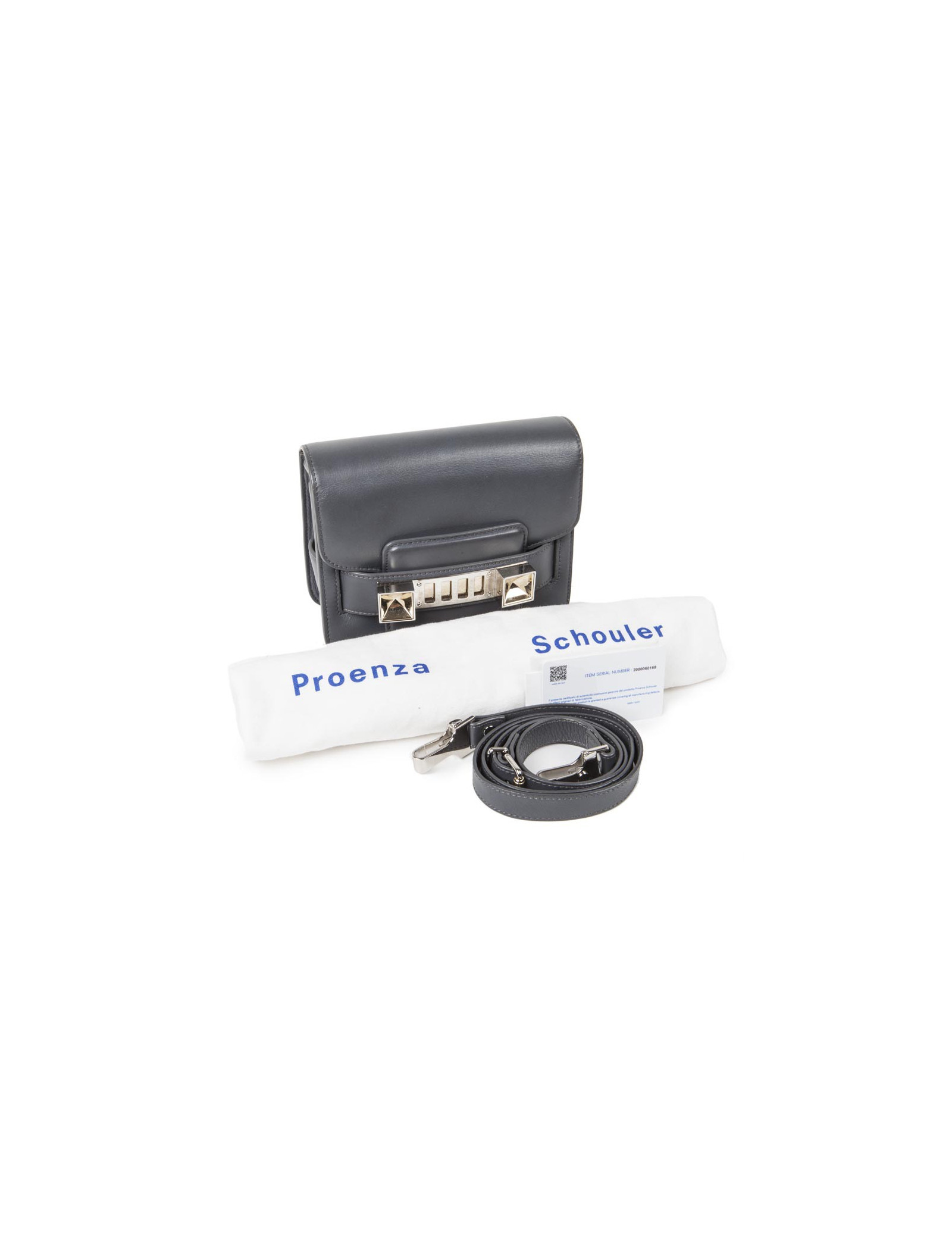 Sac Proenza Schouler, collection PS11 Tiny, en cuir lisse gris porté épaule et croisé, empiècements métalliques or et argent sur le fermoir.