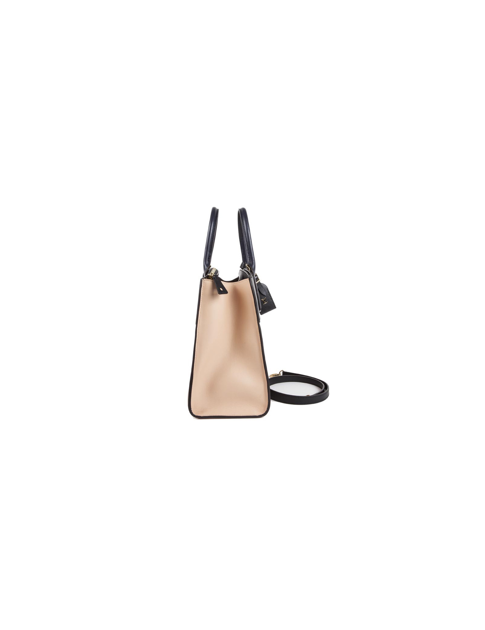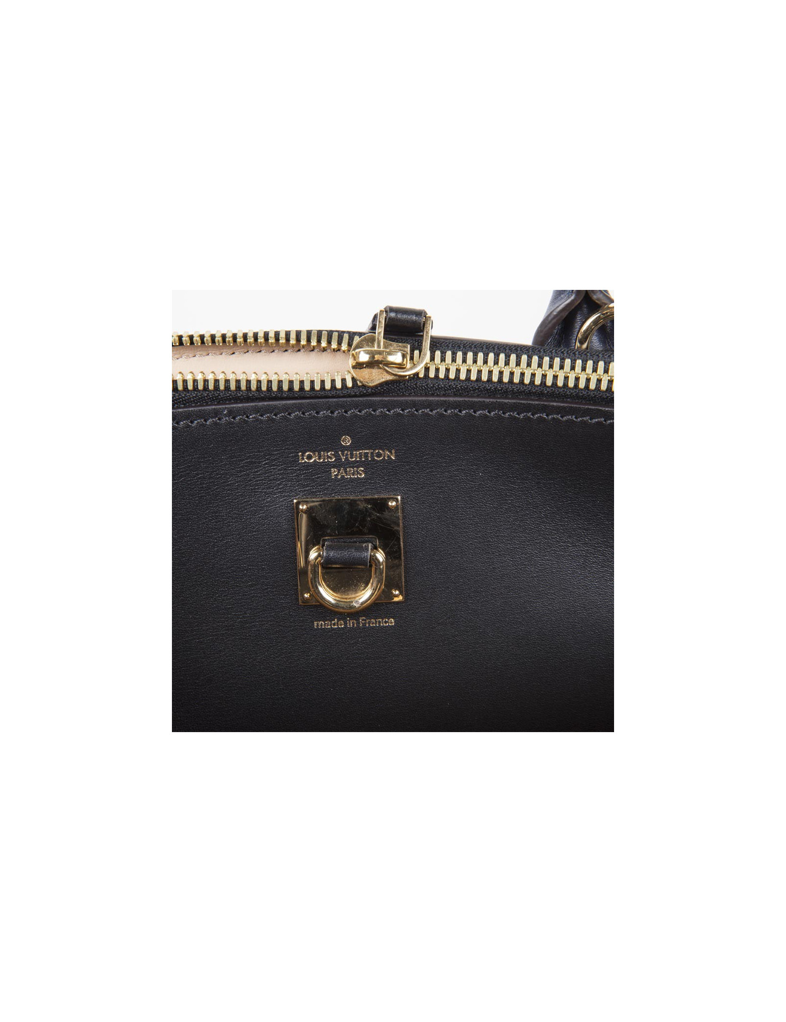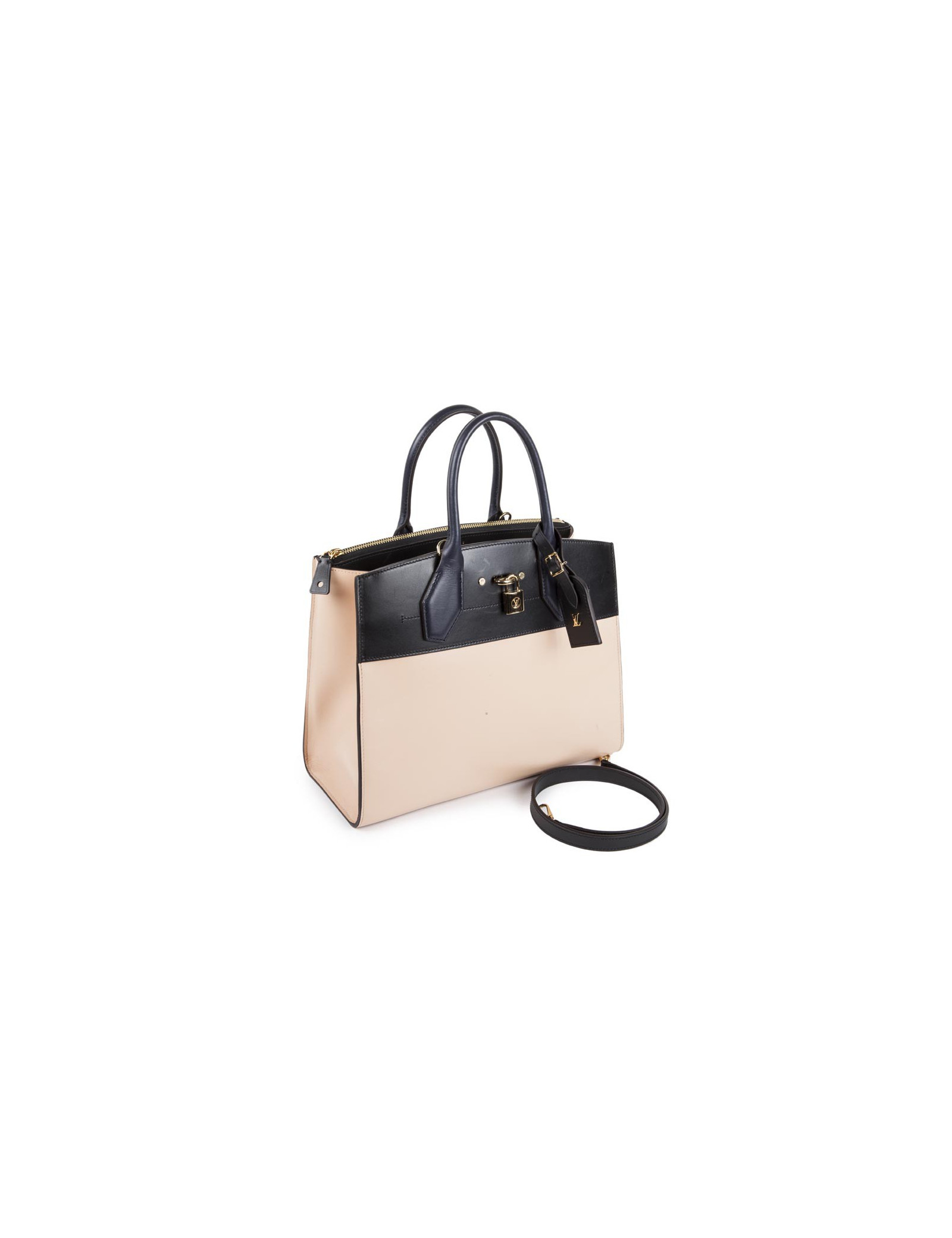 Sac "City steamer MM" de la Maison Louis Vuitton en cuir lisse tricolore beige et bleu marine et noir. Pièces métalliques dorées. Porte-adresse avec signature LV métallisée. Cadenas gravé. Signature LV cerclée marquée à chaud sur l’arrière. Bandoulière amovible en cuir de 65 cm.