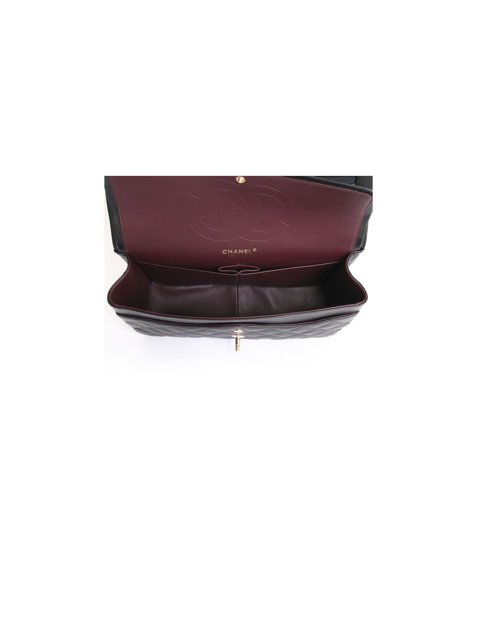 Superbe sac Jumbo de la Maison Chanel en cuir caviar noir et bijouterie doré. Double rabat. Fermoir "CC". L'intérieur est en cuir d'agneau bordeaux avec deux plaquées. Il y en a également deux poches plaquées, une à l'avant et une à l'arrière. La bandoulière est en cuir et chaine doré. s des soldes.