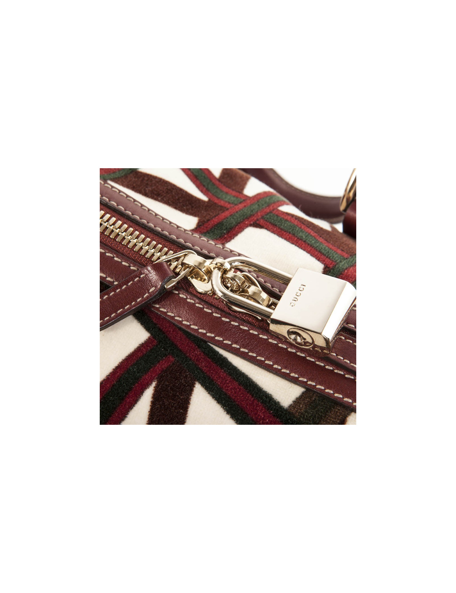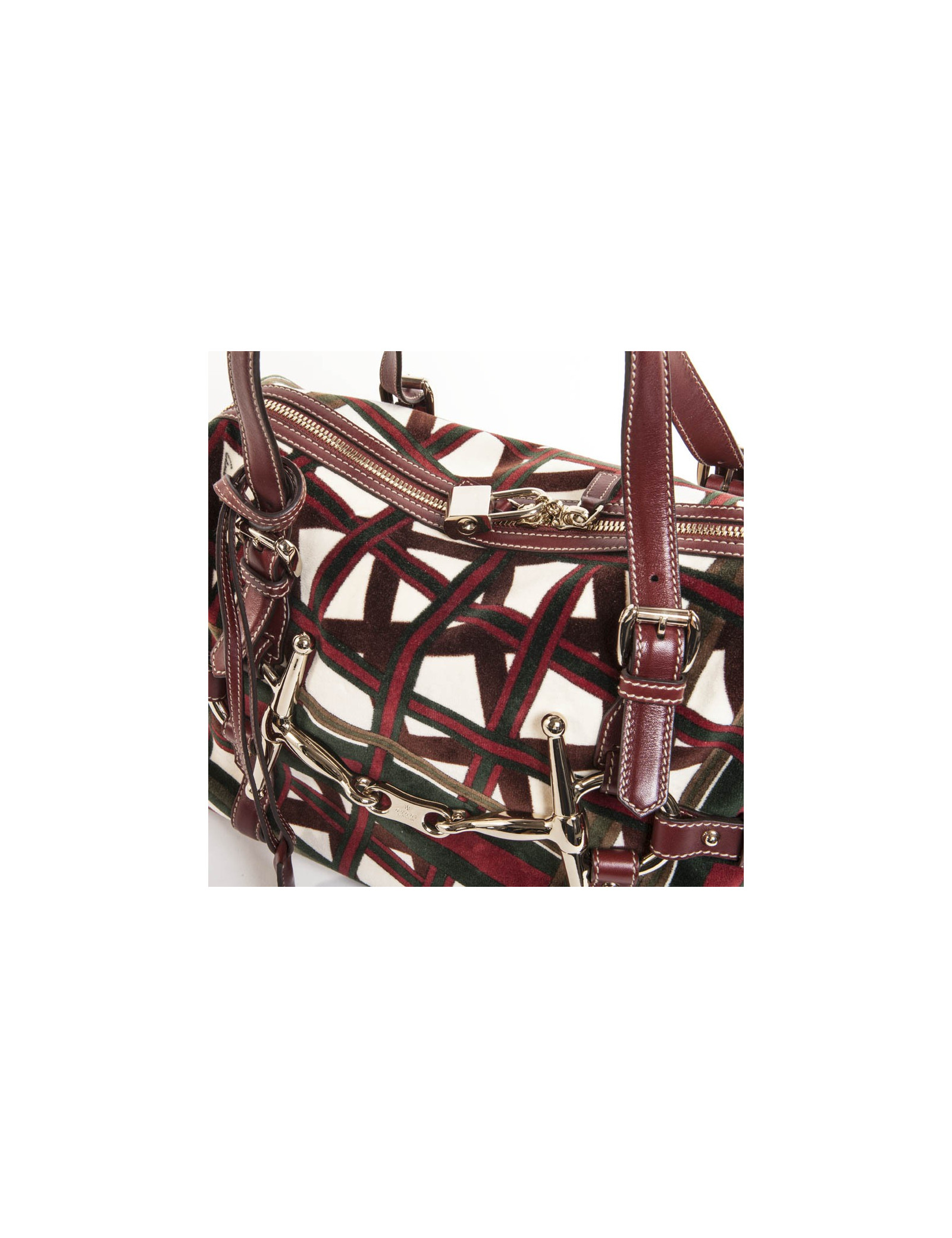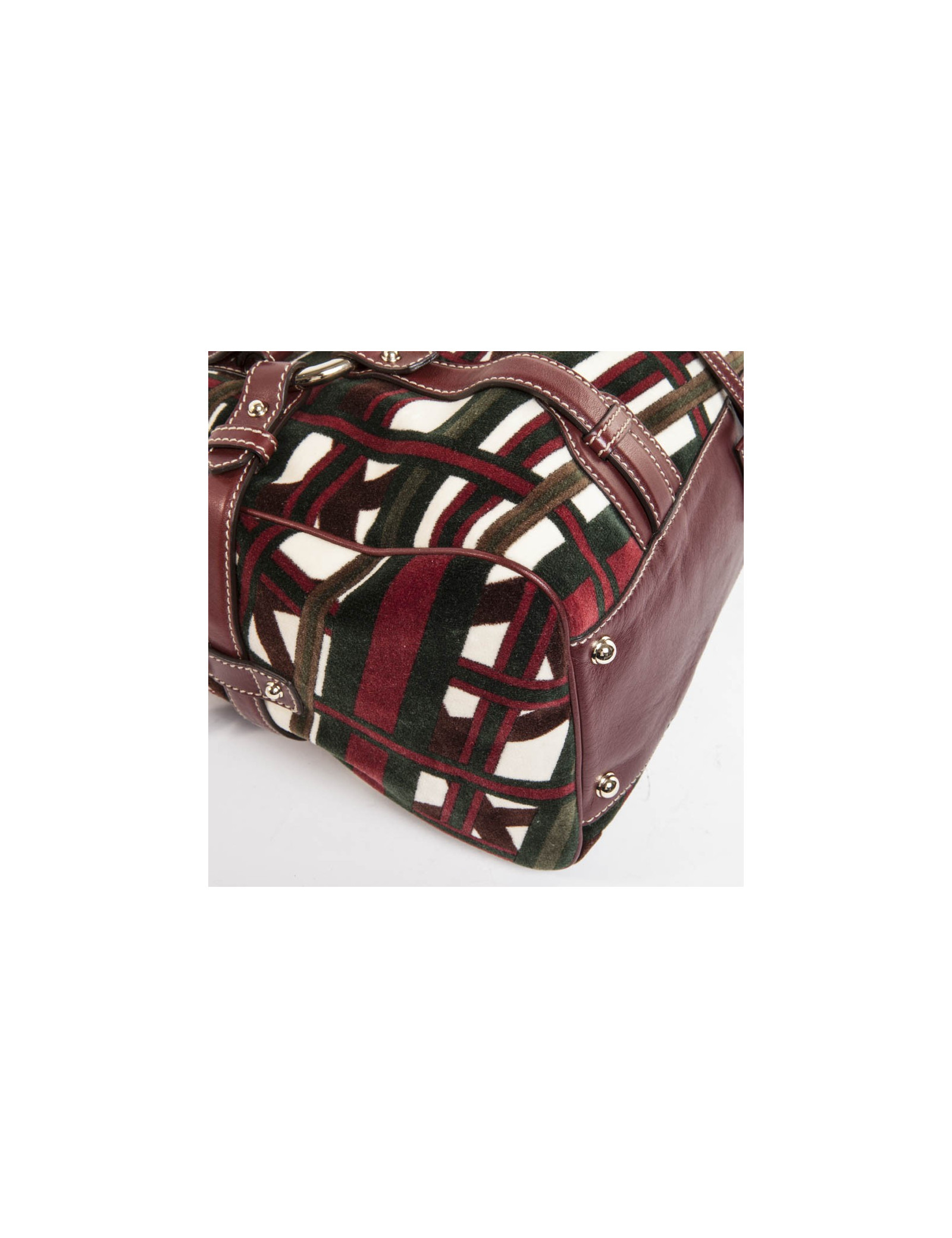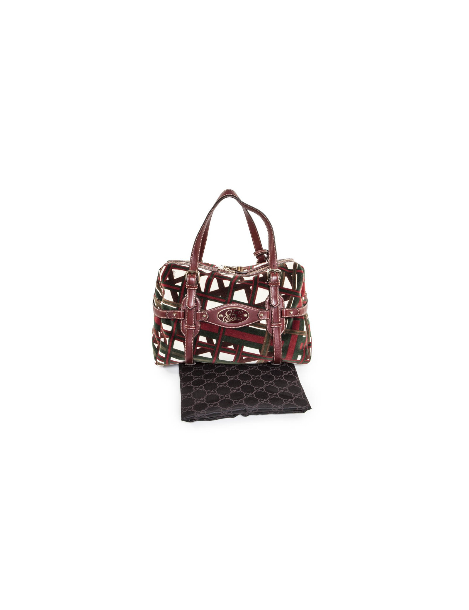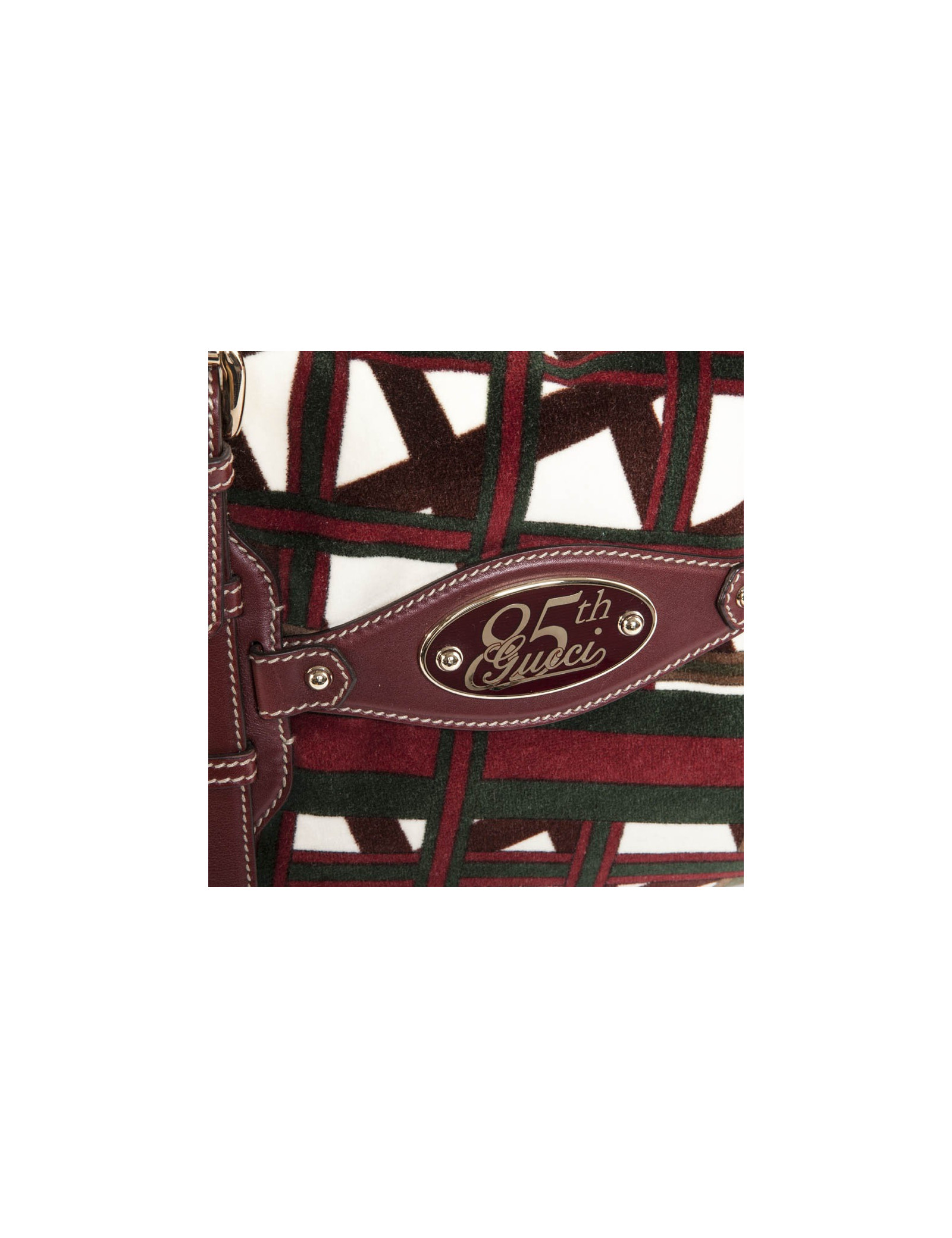 Sac cabas en velours motifs bolduc et cuir bordeaux de la Maison Gucci. Bijouterie dorée pâle. A l'avant, le "mors" emblème de la Maison Gucci. Fermeture zippée. L'intérieur est en tissu marron avec une grande poche zippée et une poche pour smartphone.