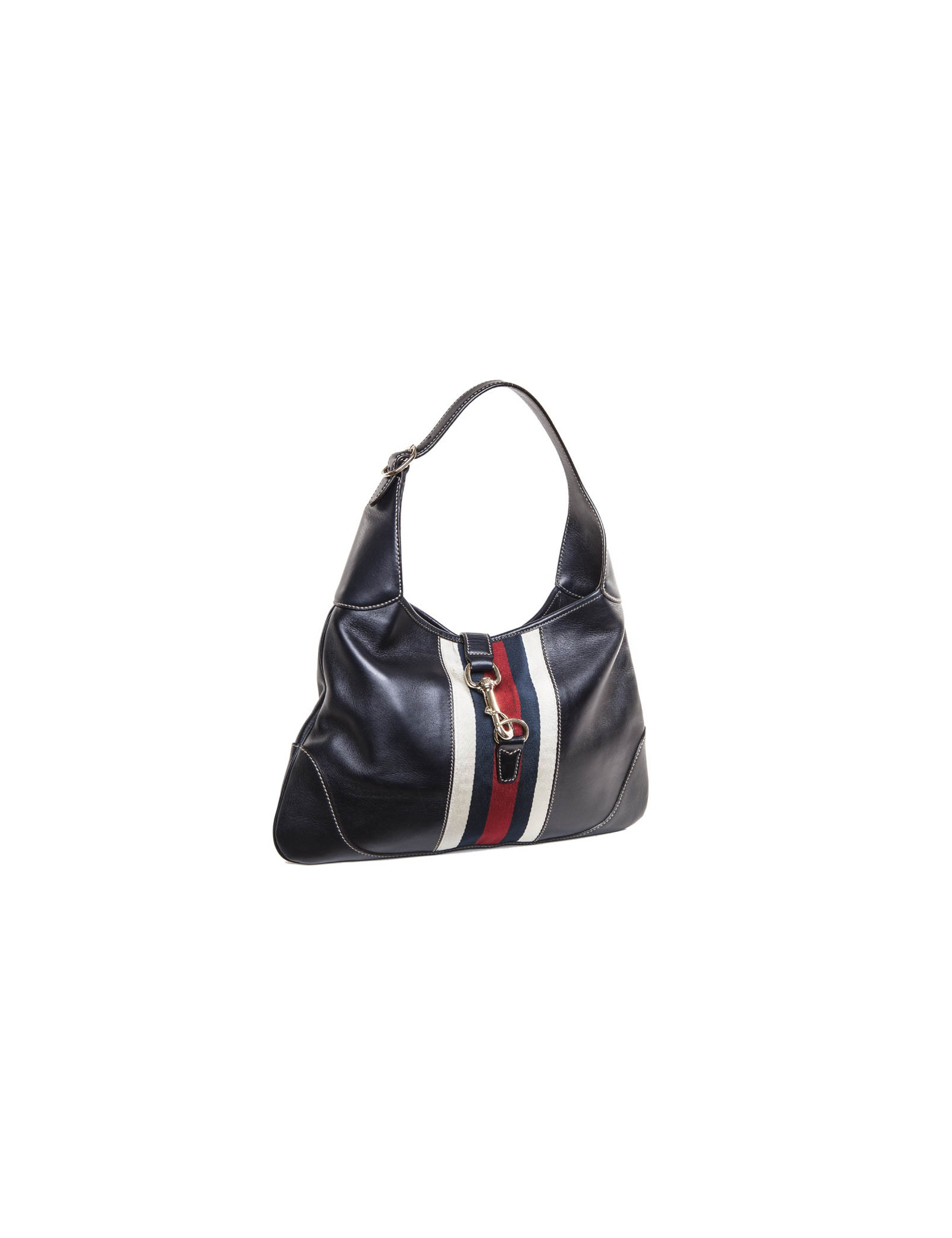 Collector. Sac Gucci en cuir bleu marine avec des bandes en toile bleue, blanche et rouge. Bijouterie dorée or pâle. L'intérieur est en lin gris clair avec une grande poche zippée et une poche pour smartphone. Surpiqûres beige. Numéro de série : 158029..... En très bon état (le cuir est légèrement marqué, dû à la matière).