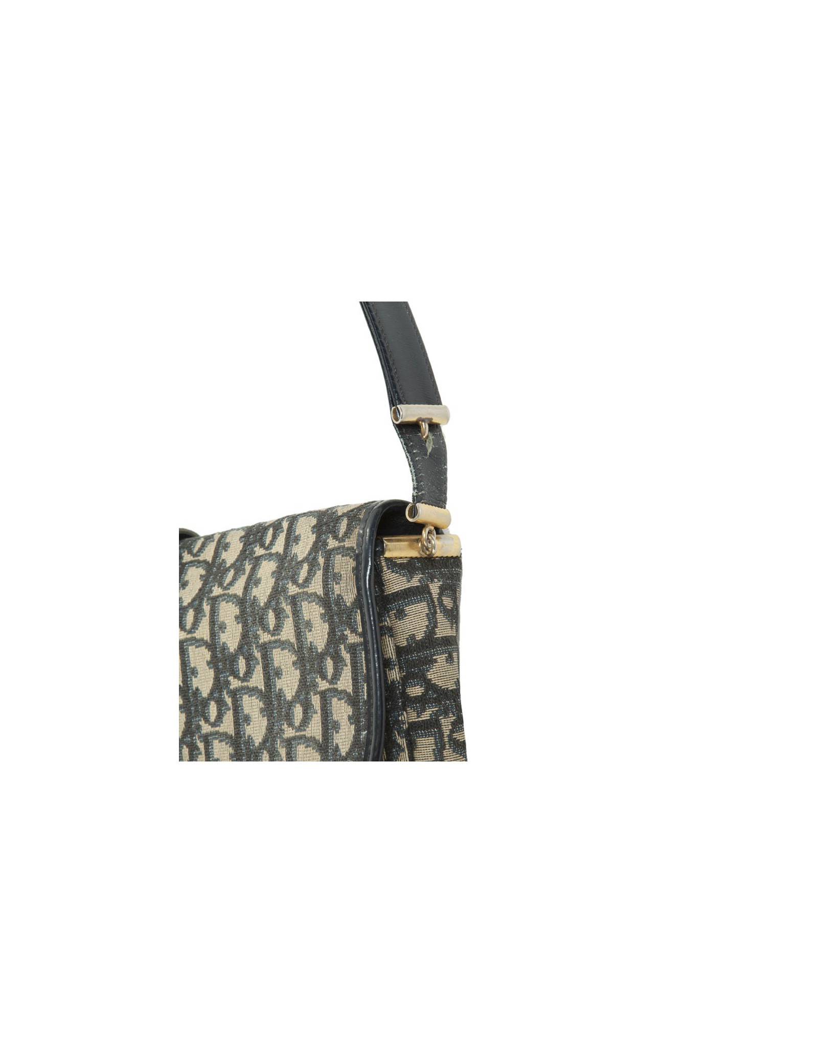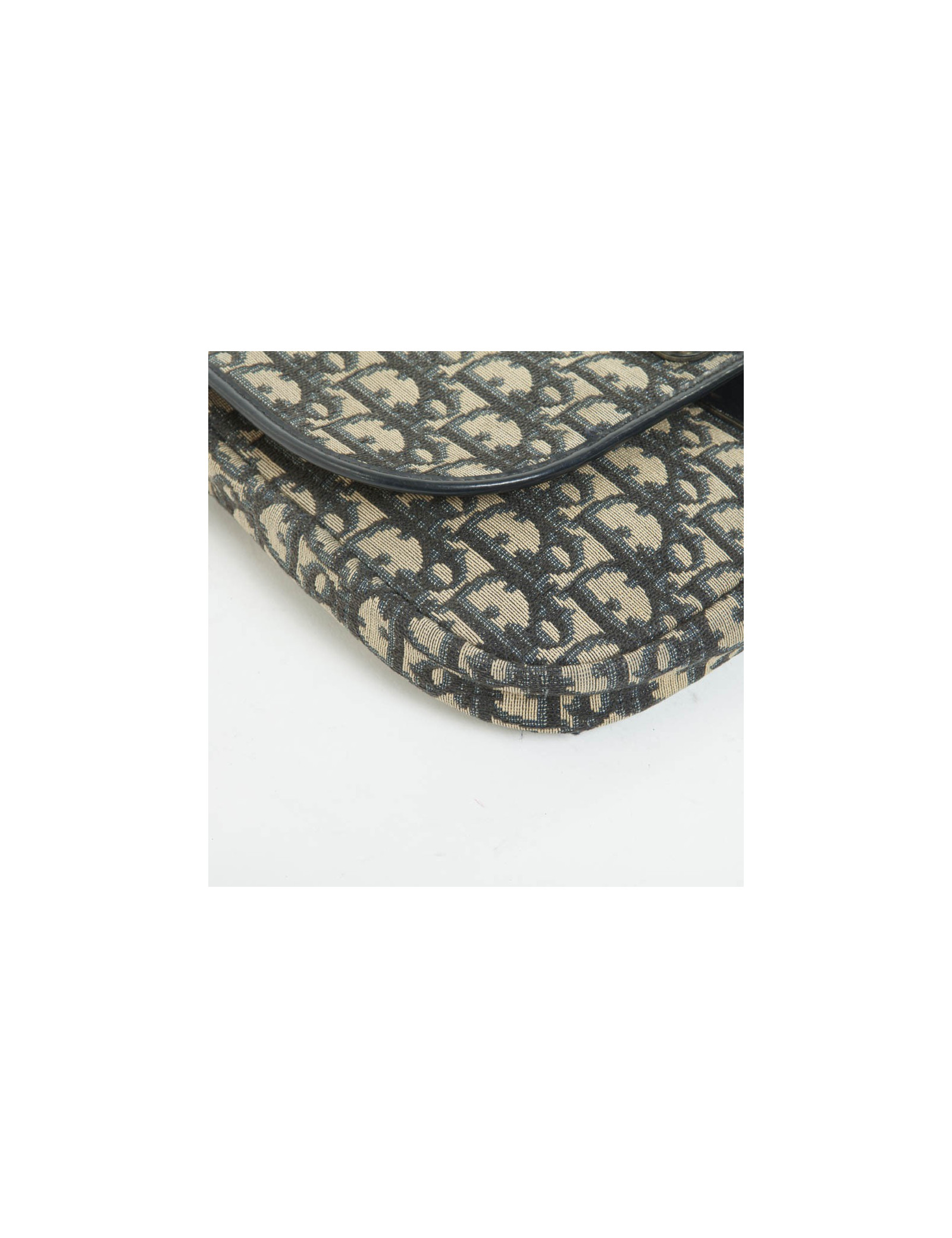 Sac Dior en toile Dior oblique bleu marine et gris, entouré d'une bande de cuir bleu marine agrémentée d'une boucle CD en métal argenté émaillée bleu.