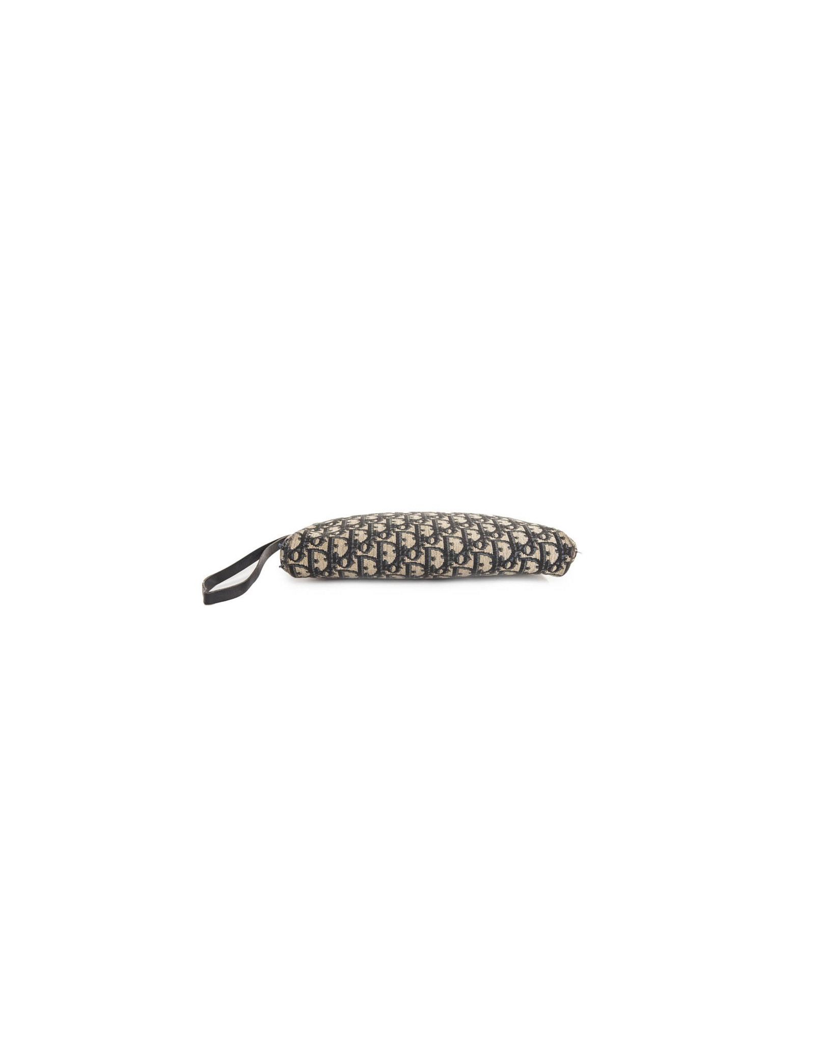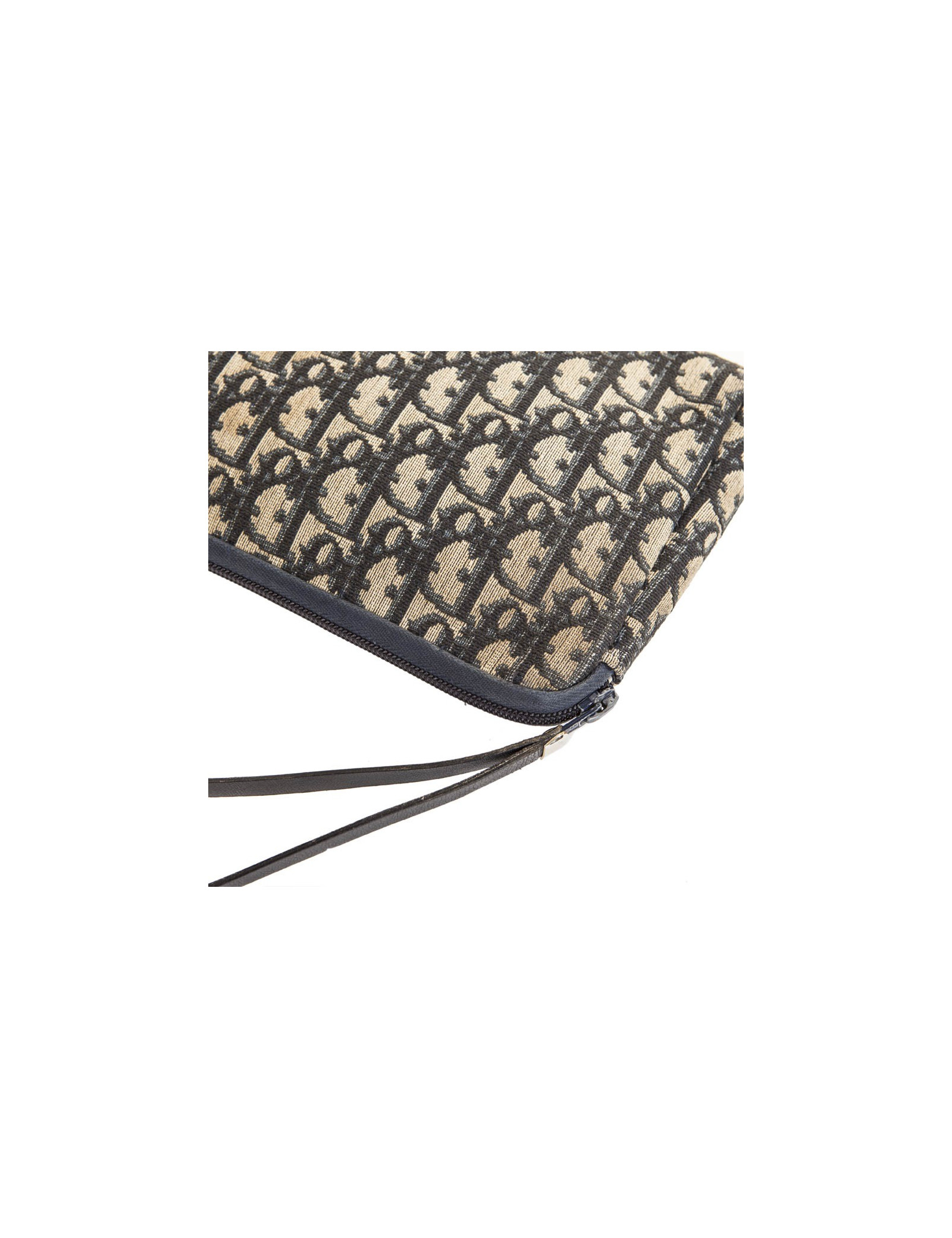 Pochette Dior en toile Dior oblique bleu gris, elle se ferme par un zip et se tient au poignet à l’aide d’une dragonne en cuir bleu. L’intérieur est en toile bleu marine. Usure d’usage dû à son age.
