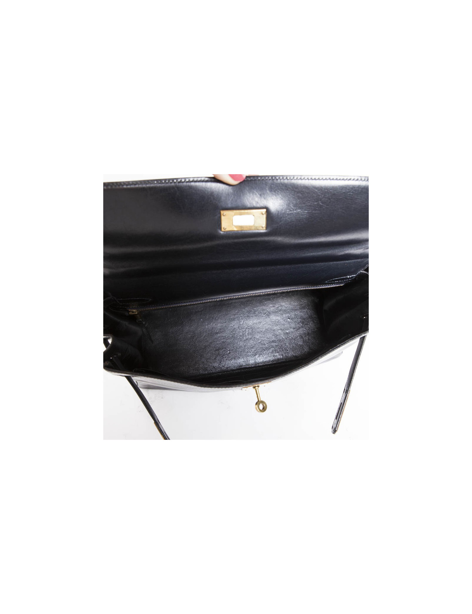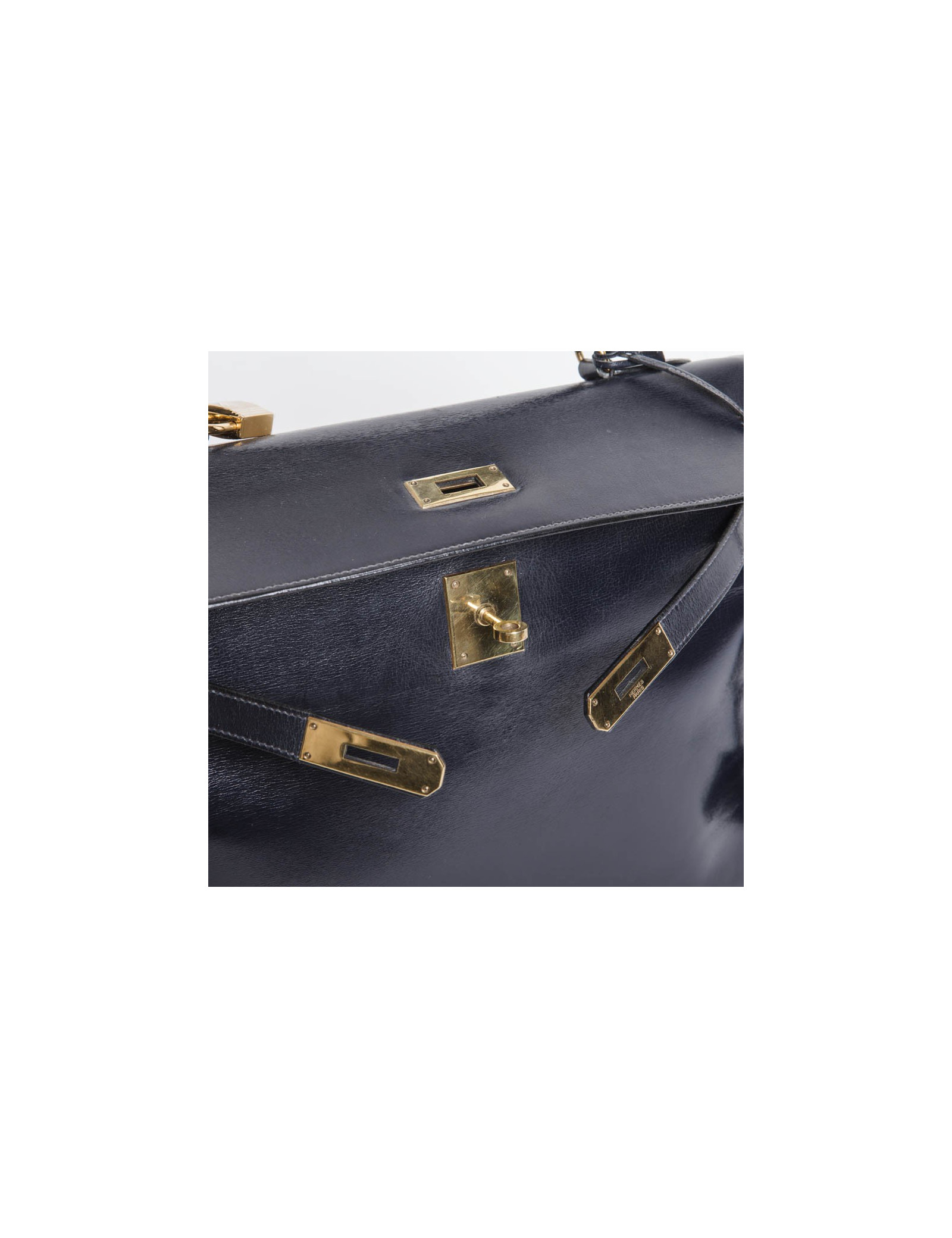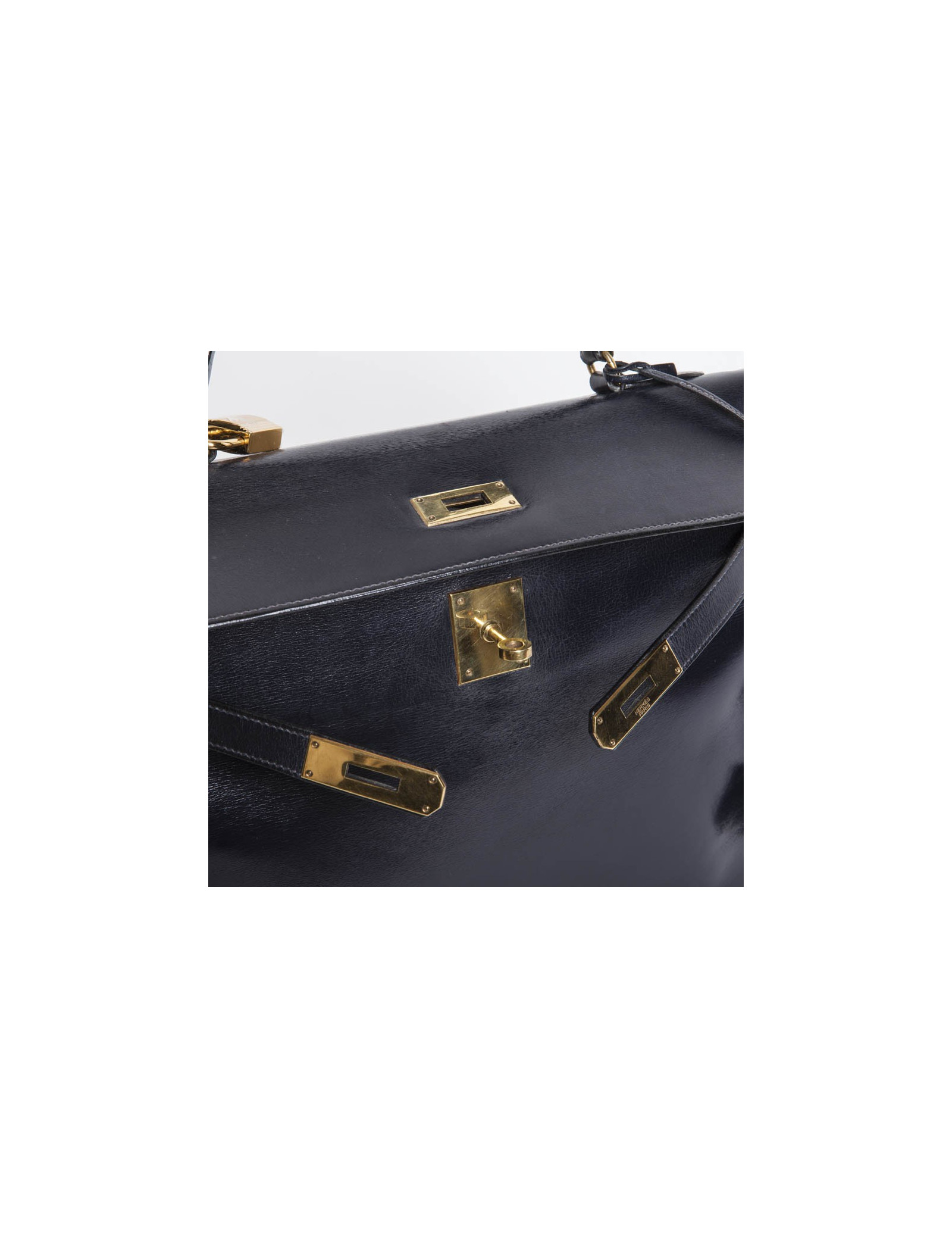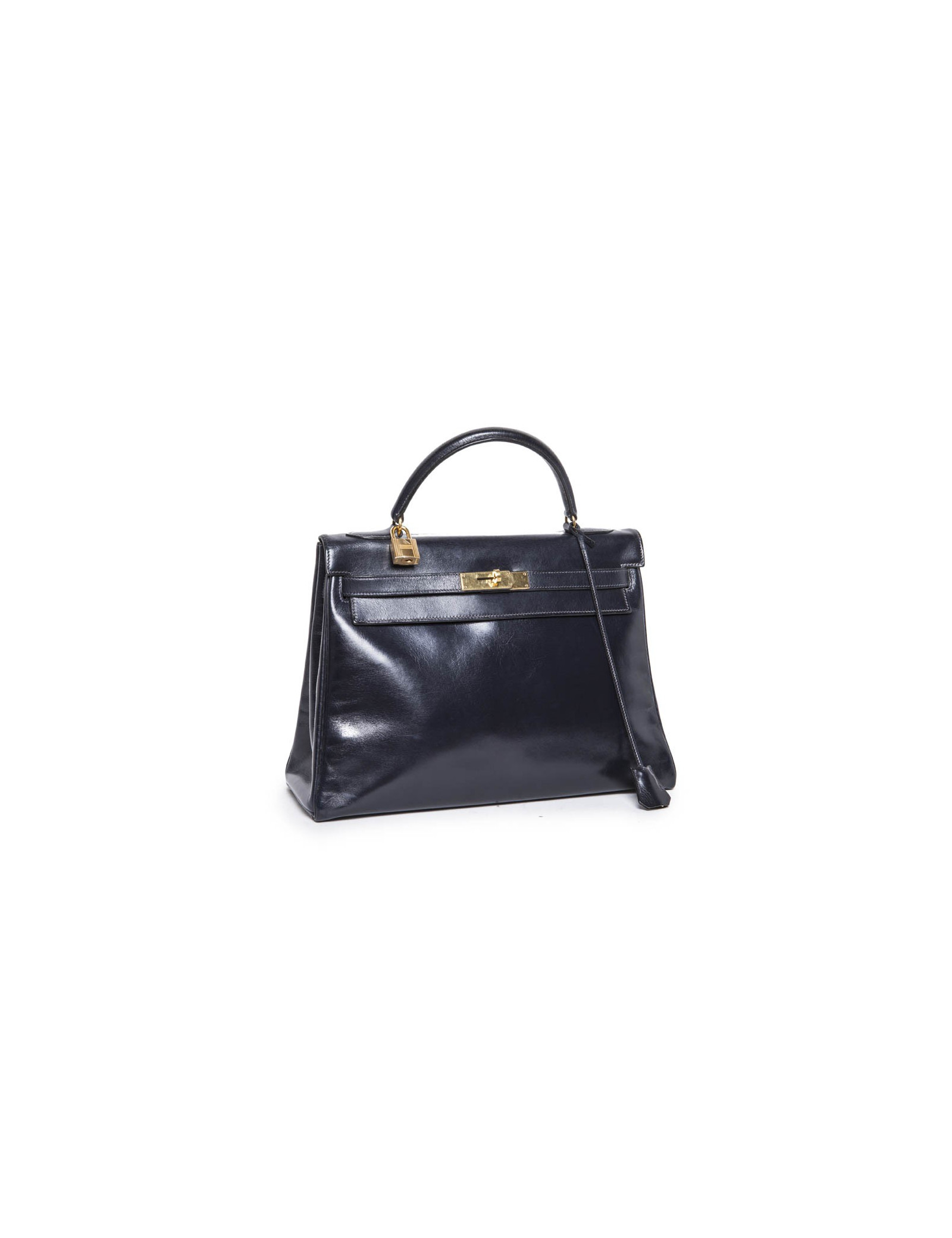 Vintage. Sac Kelly 32 en cuir box bleu marine de la Maison Hermès. Bijouterie dorée. Lettre K Année 1955. Cadenas, tirette, clochette et clefs. A l'intérieur, 2 poches plaquées dont 1 zippée. En excellent état.