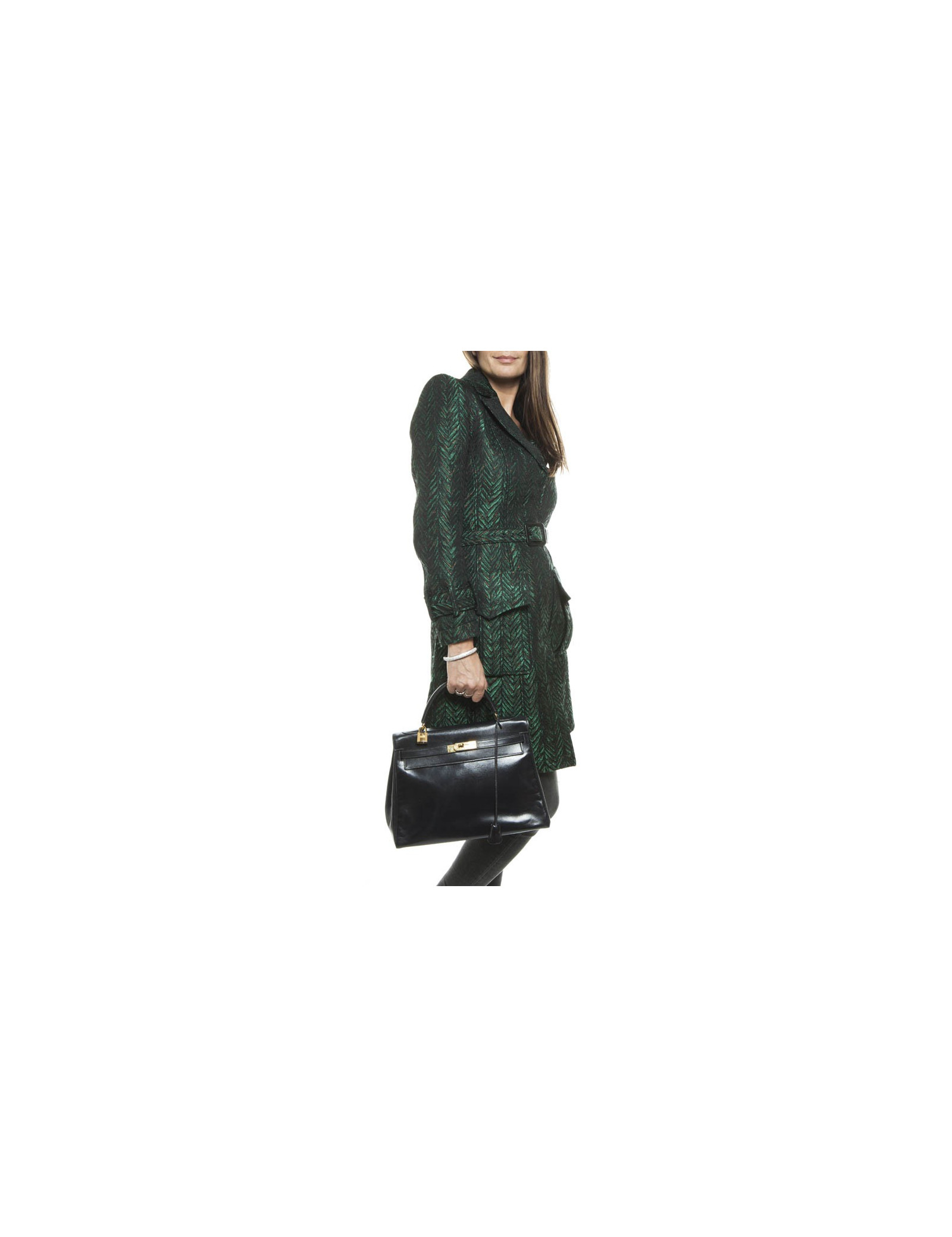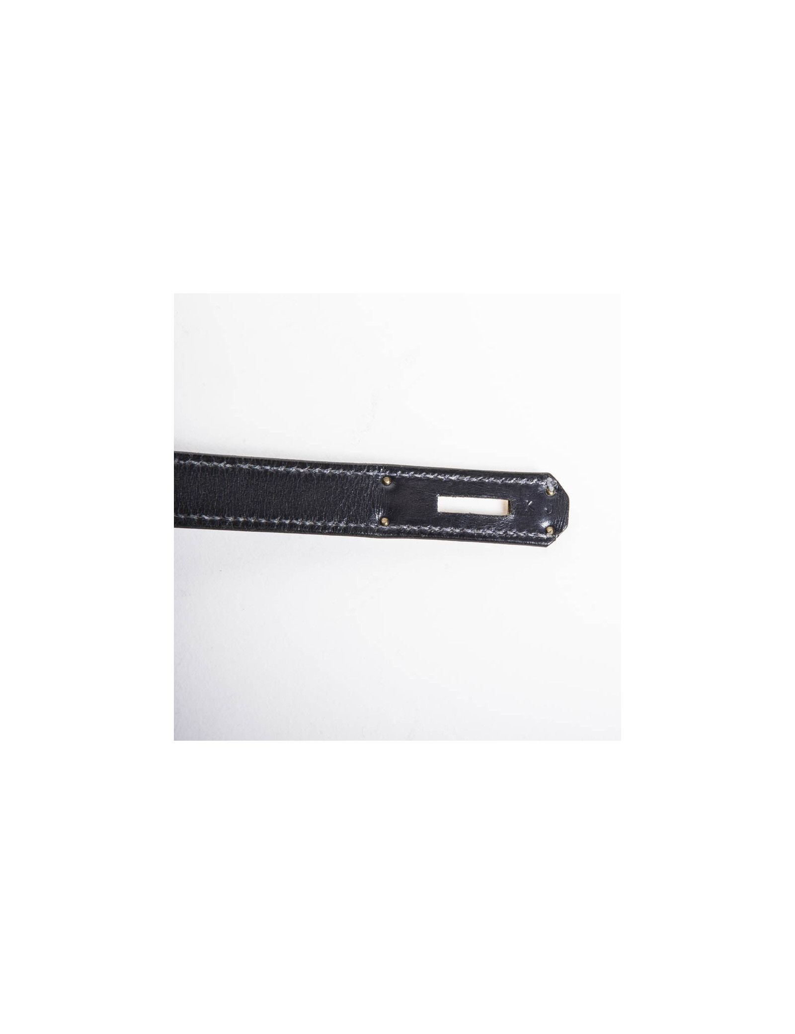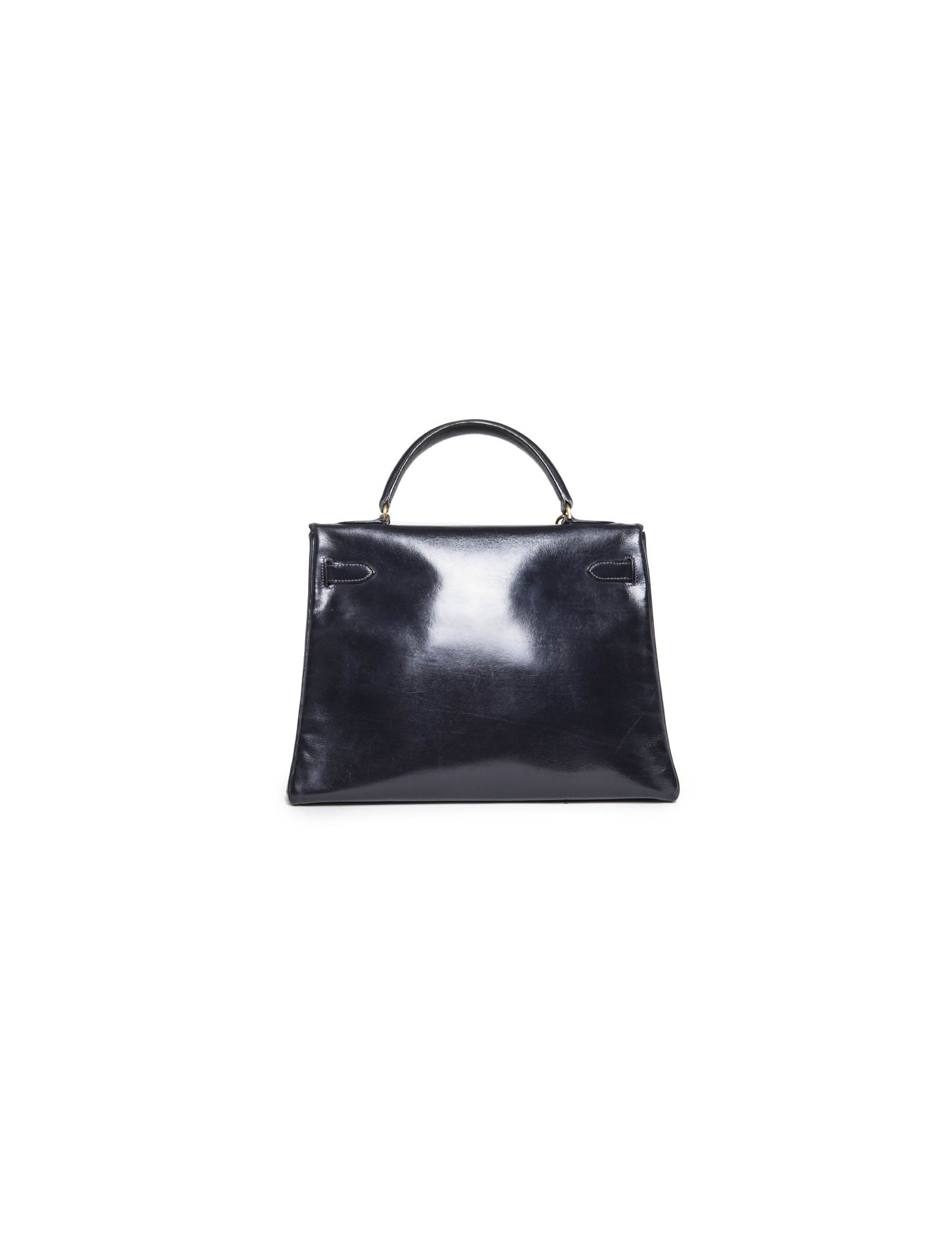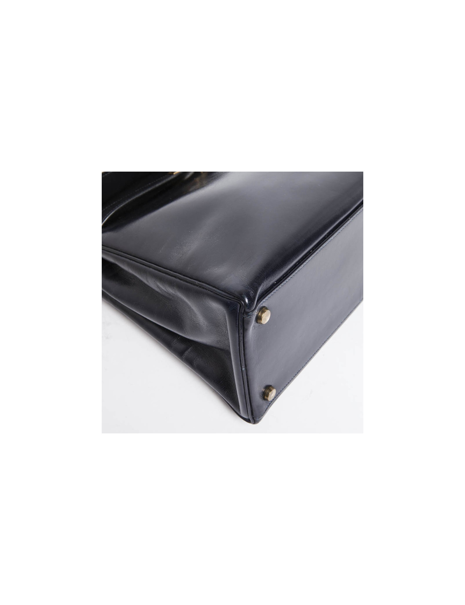 Vintage. Sac Kelly 32 en cuir box bleu marine de la Maison Hermès. Bijouterie dorée. Lettre K Année 1955. Cadenas, tirette, clochette et clefs. A l'intérieur, 2 poches plaquées dont 1 zippée. En excellent état.