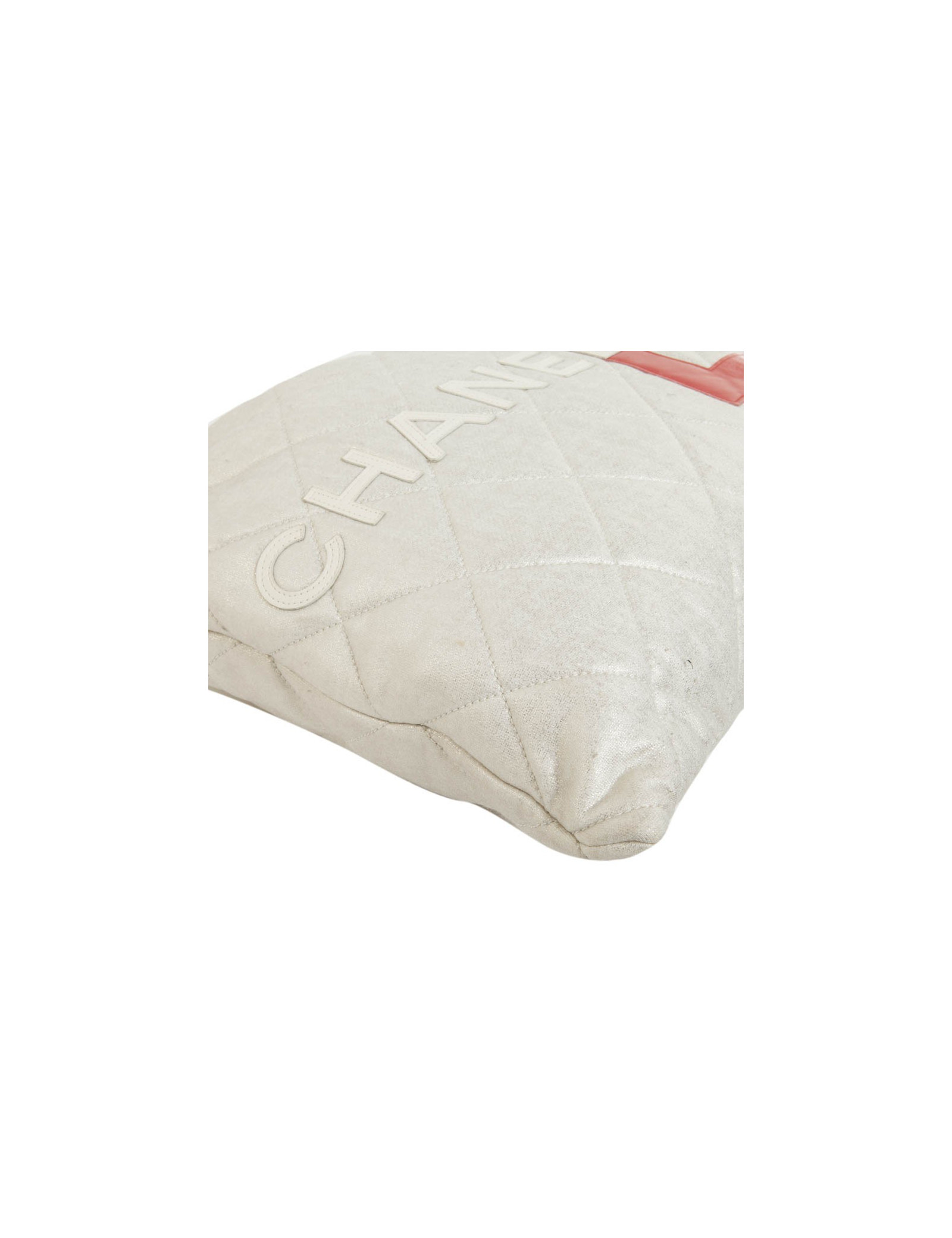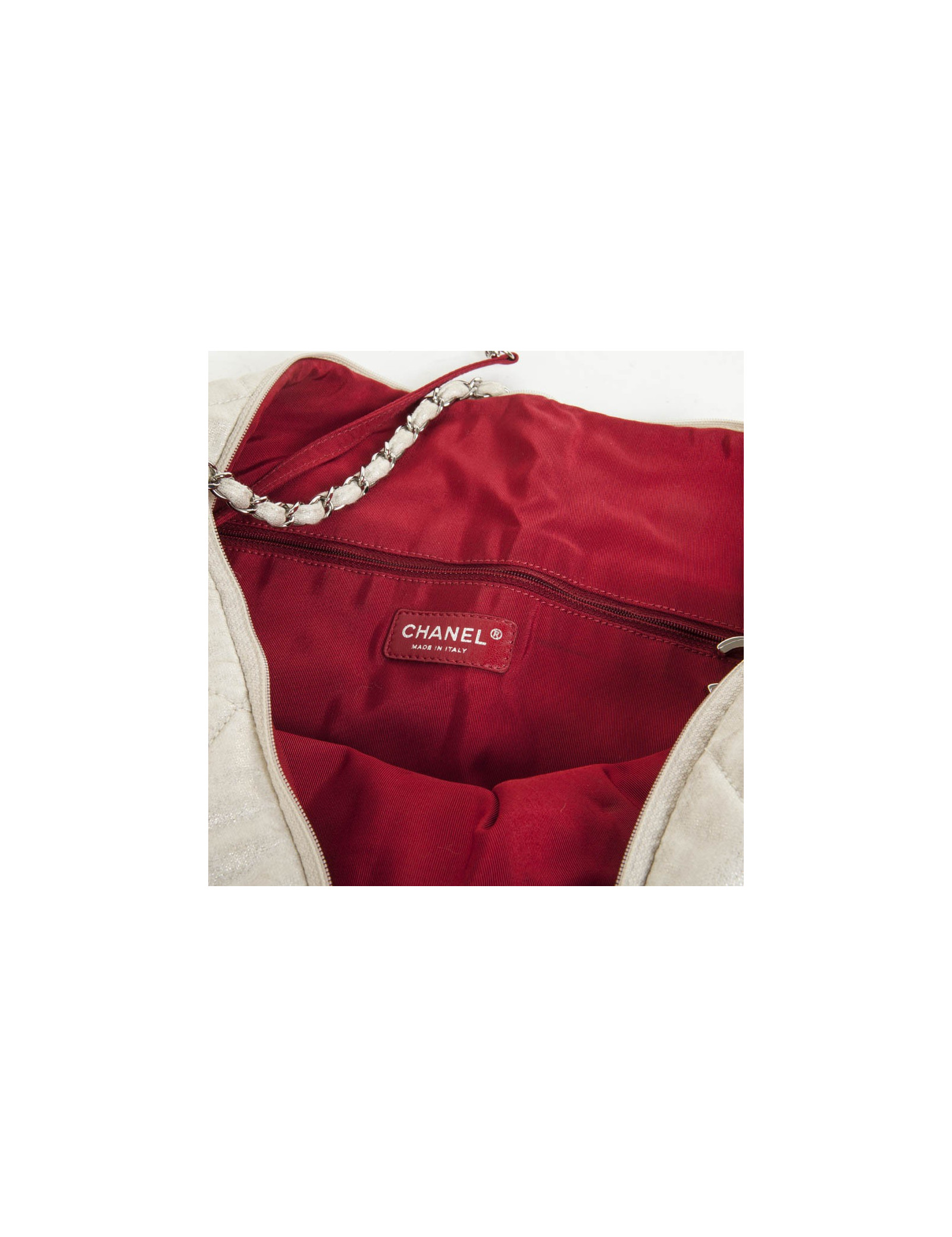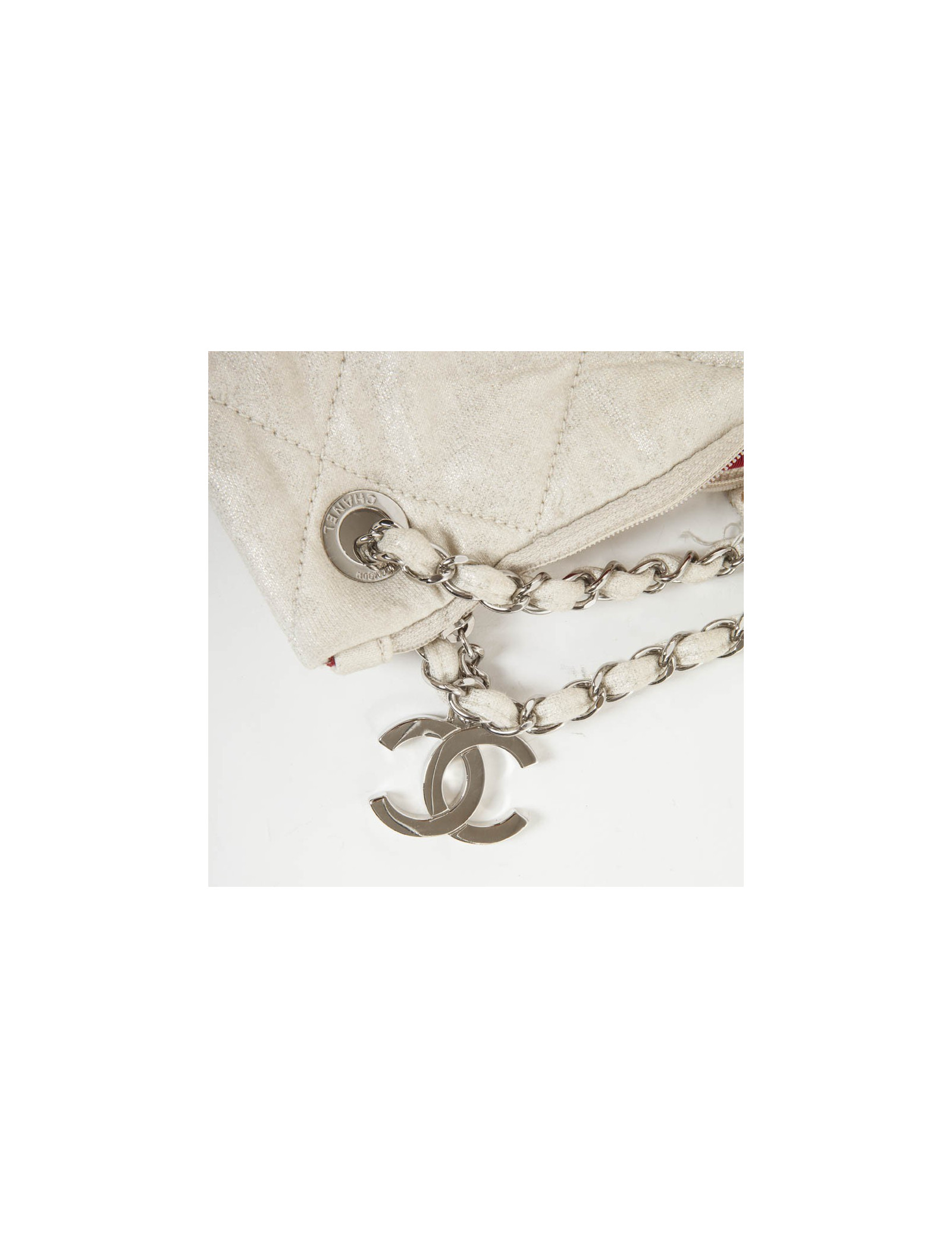 Sac 'LA' de la Maison Chanel en tissu souple matelassé beige avec des paillettes dorées. Fermeture zippée. Bijouterie argentée. Les inscriptions 'CHANEL' et 'LA' sont en cuir blanc et orange. L'intérieur est en toile rouge avec une grande poche zippée.