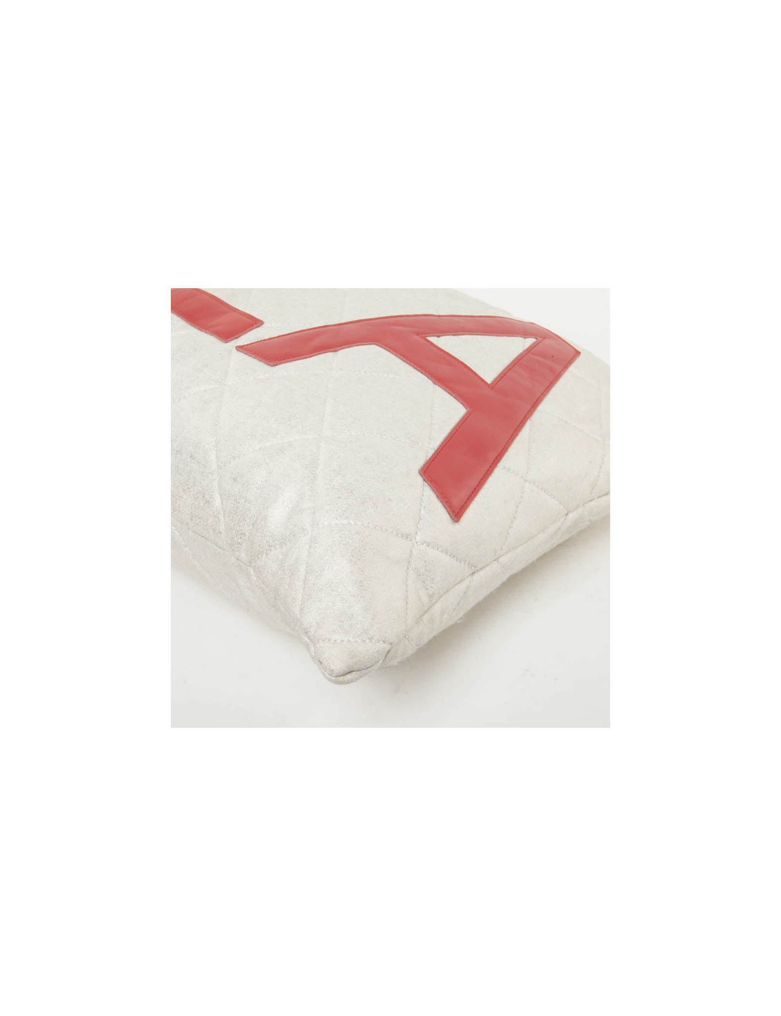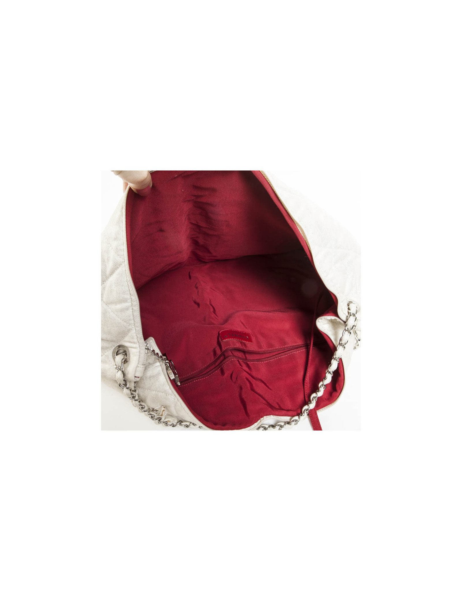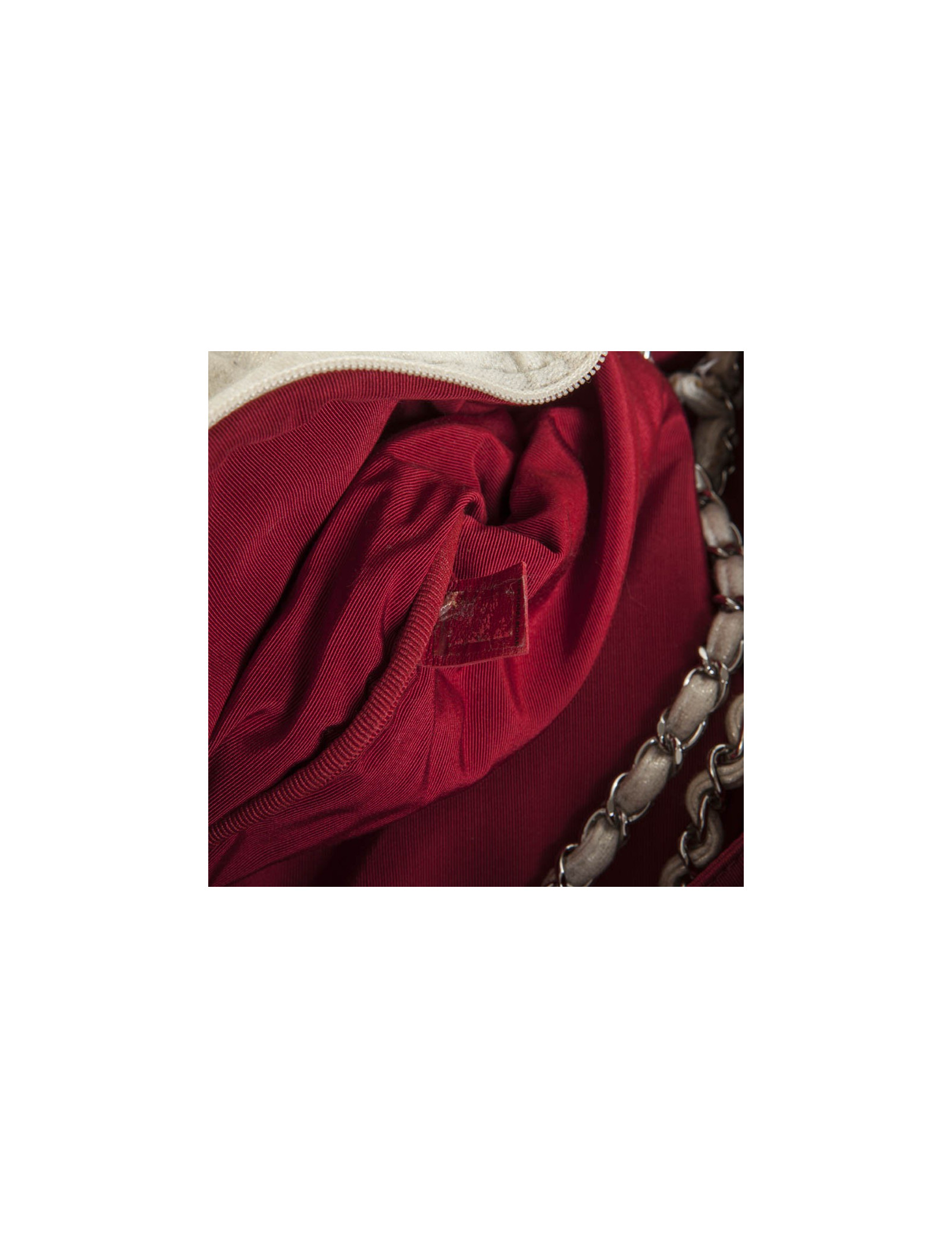 Sac 'LA' de la Maison Chanel en tissu souple matelassé beige avec des paillettes dorées. Fermeture zippée. Bijouterie argentée. Les inscriptions 'CHANEL' et 'LA' sont en cuir blanc et orange. L'intérieur est en toile rouge avec une grande poche zippée.