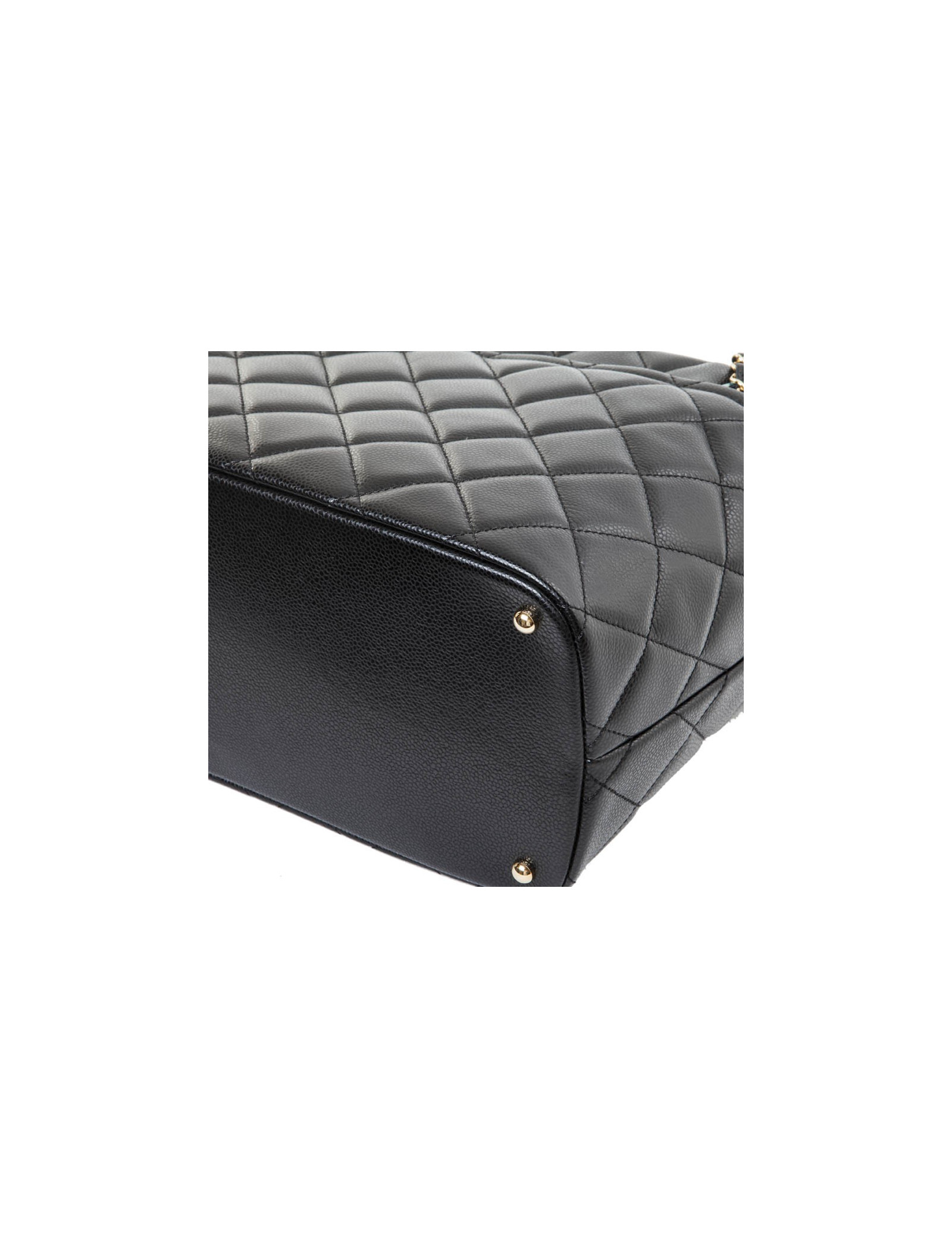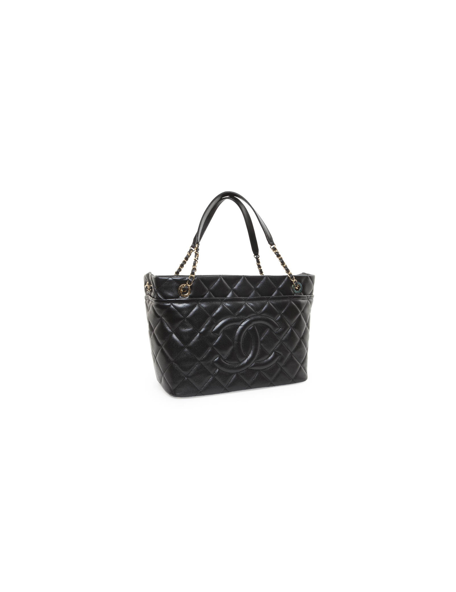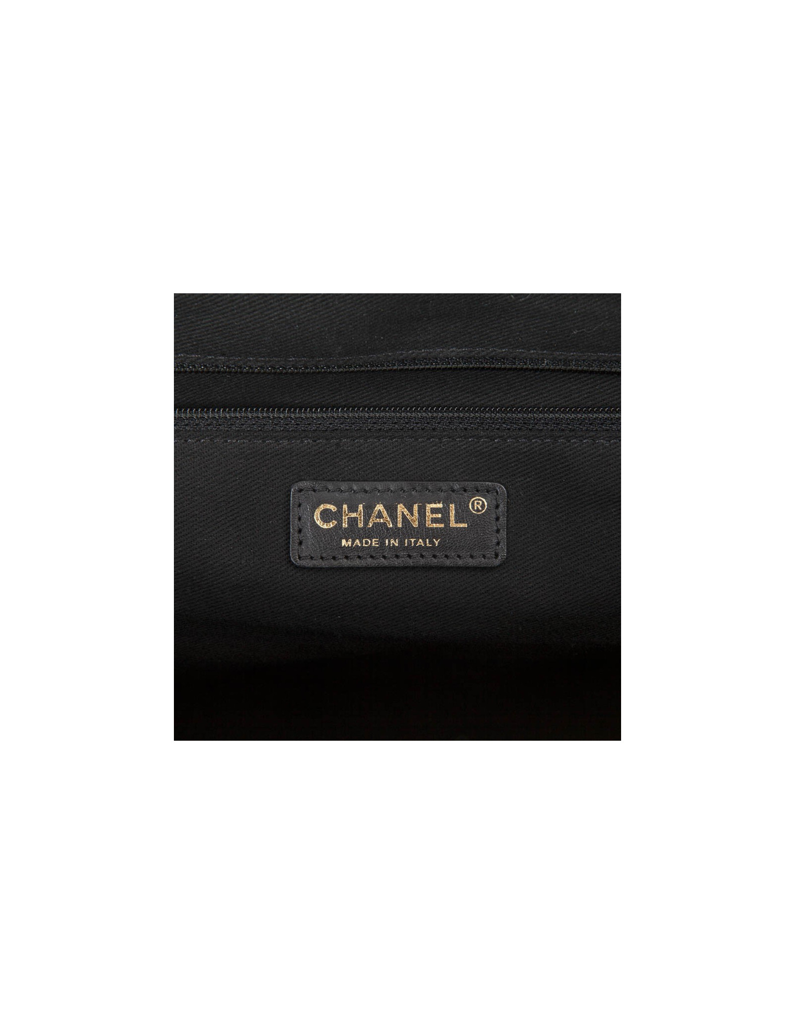 Sac cabas de la Maison Chanel en cuir caviar noir. Bijouterie dorée. Fermeture par bouton pression. L'intérieur est en tissu noir avec 3 poches dont 1 zippée, 1 plaquée et 1 pour smartphone. Deux grandes poches plaquées à l'avant et à l'arrière.