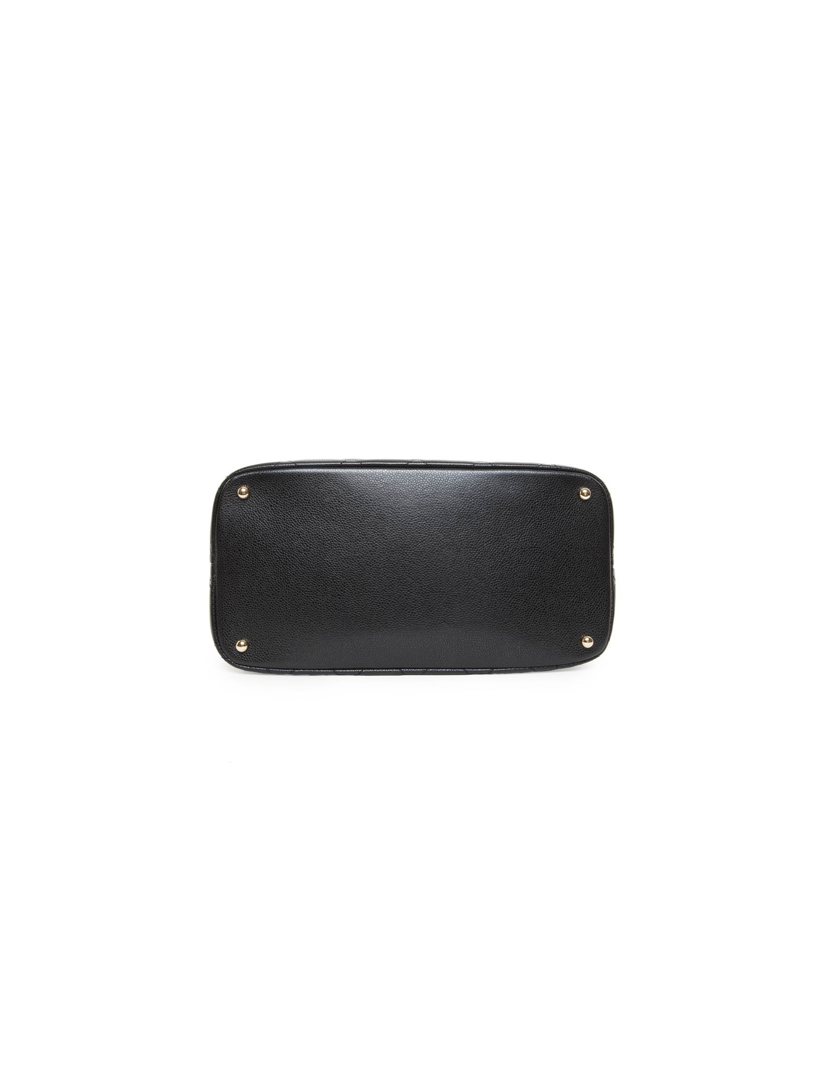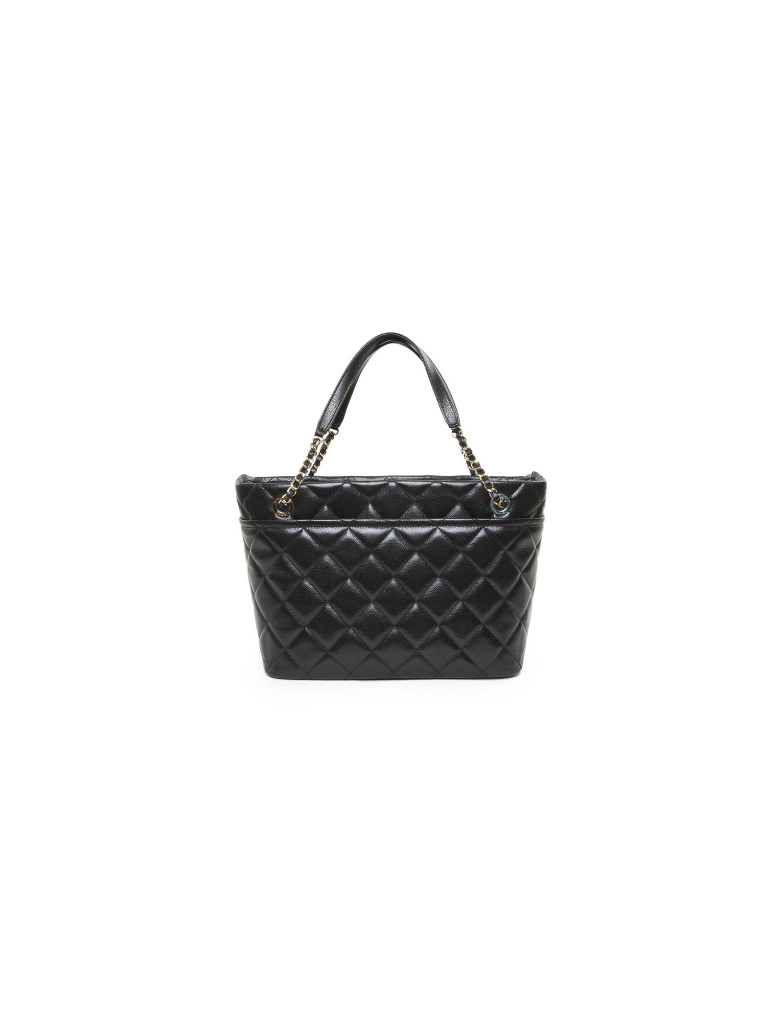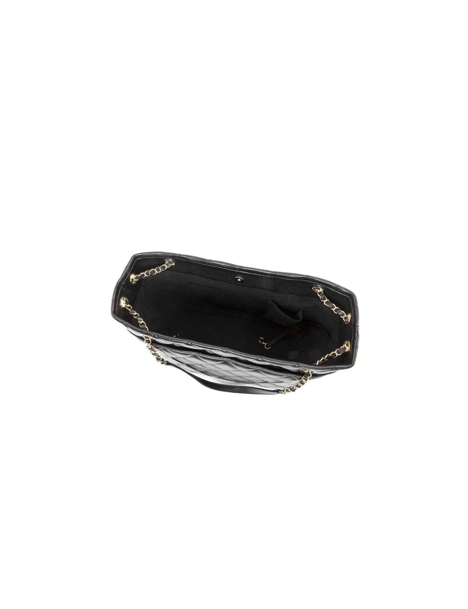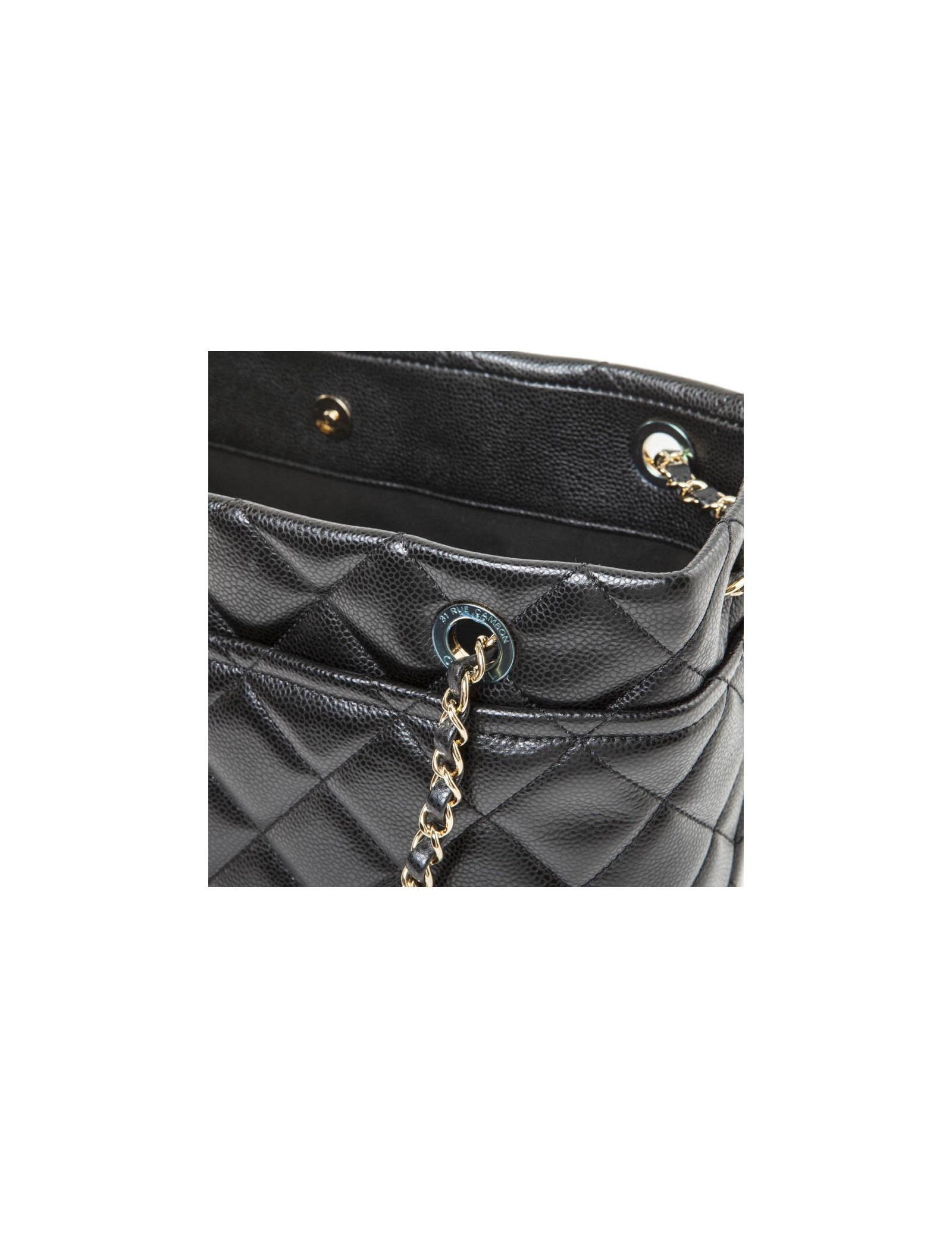 Sac cabas de la Maison Chanel en cuir caviar noir. Bijouterie dorée. Fermeture par bouton pression. L'intérieur est en tissu noir avec 3 poches dont 1 zippée, 1 plaquée et 1 pour smartphone. Deux grandes poches plaquées à l'avant et à l'arrière.