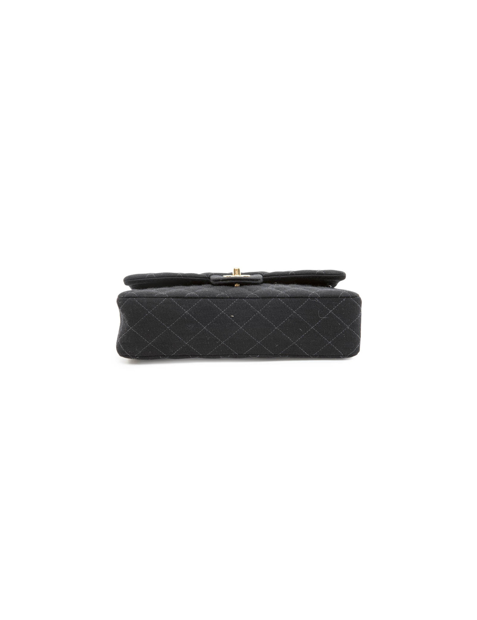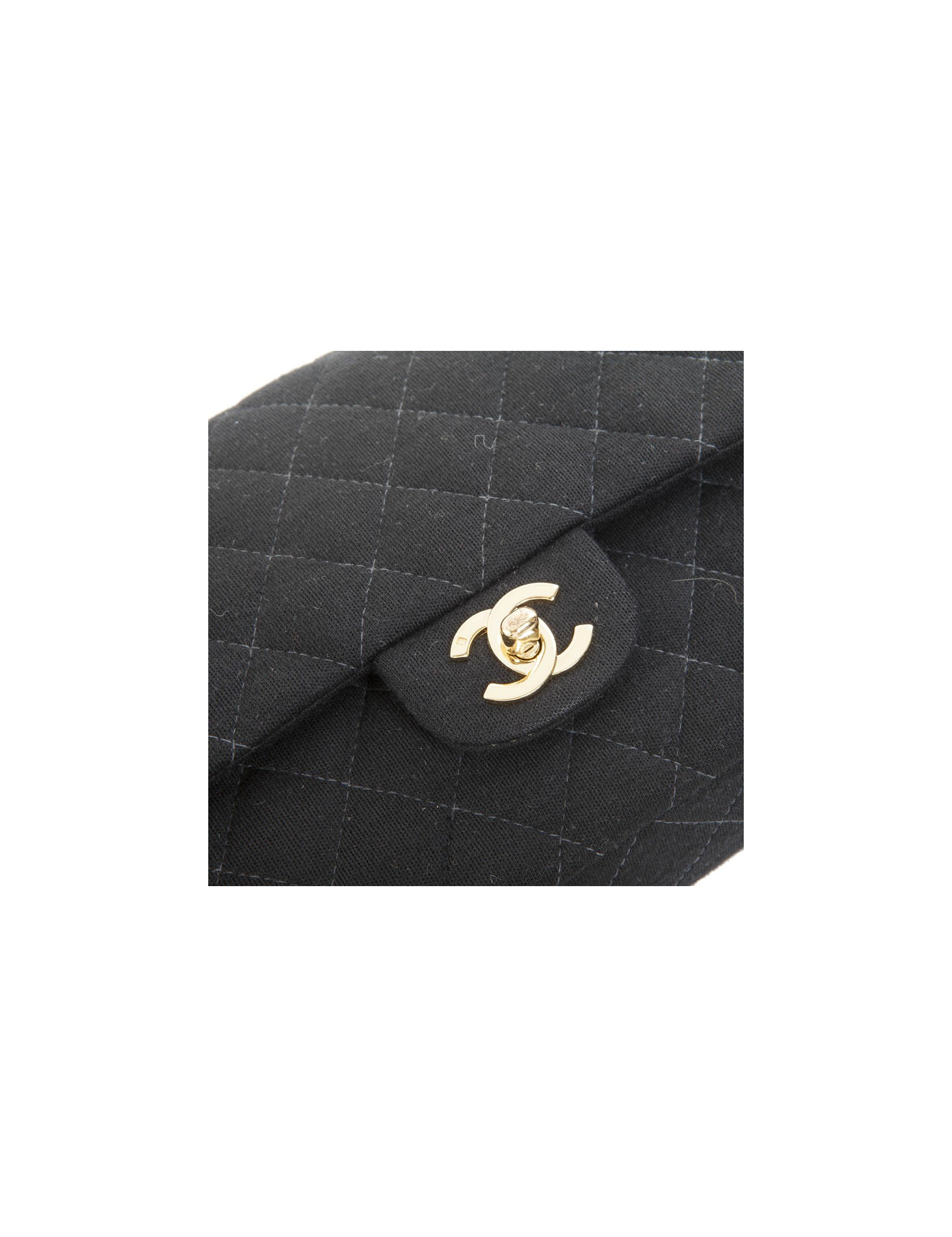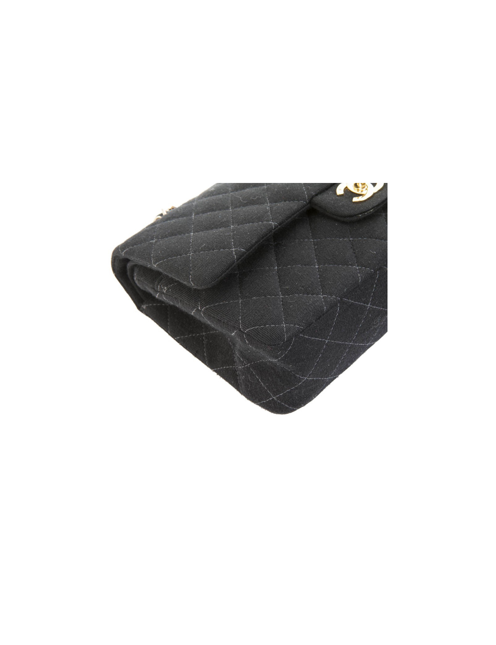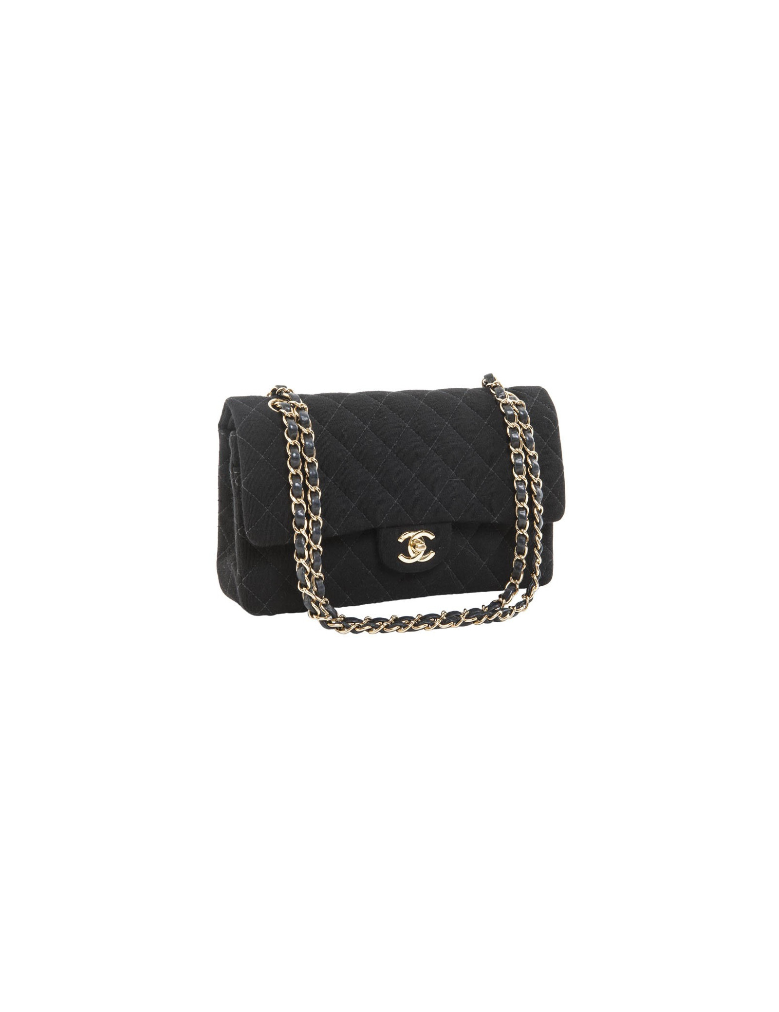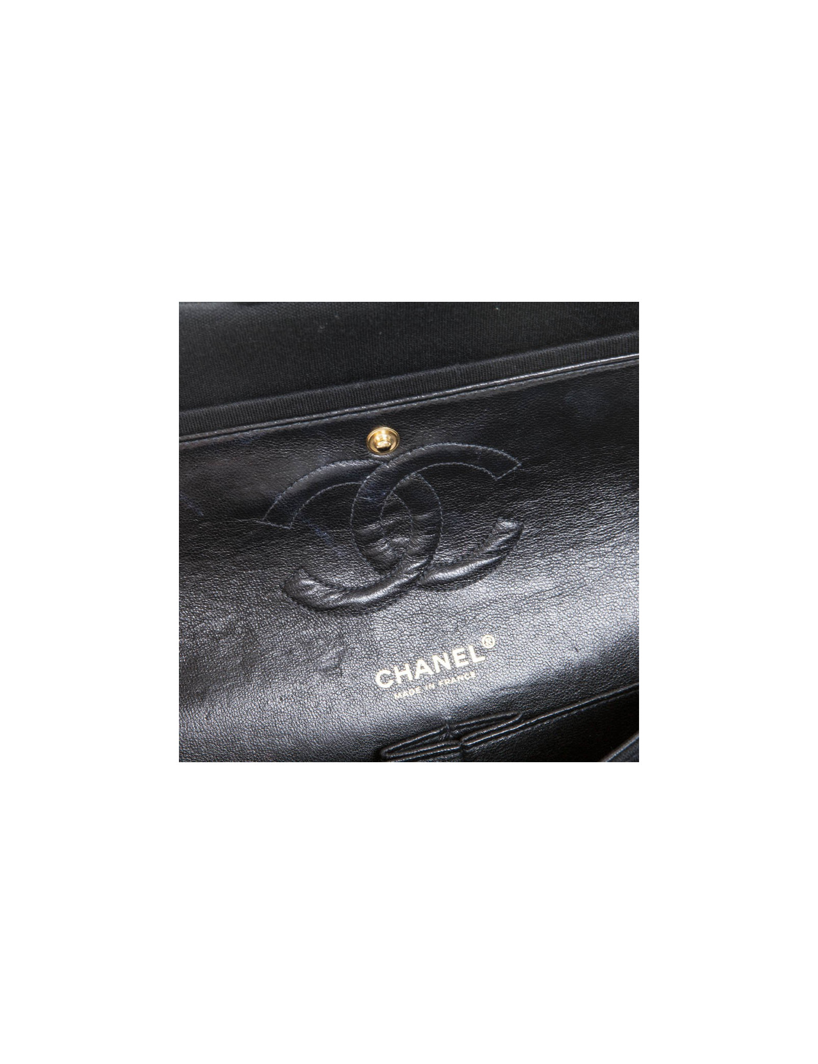 Sac timeless en jersey noir de la Maison Chanel. Bijouterie dorée. Double rabat. Hologramme: 9053... et sa carte d'authenticité.