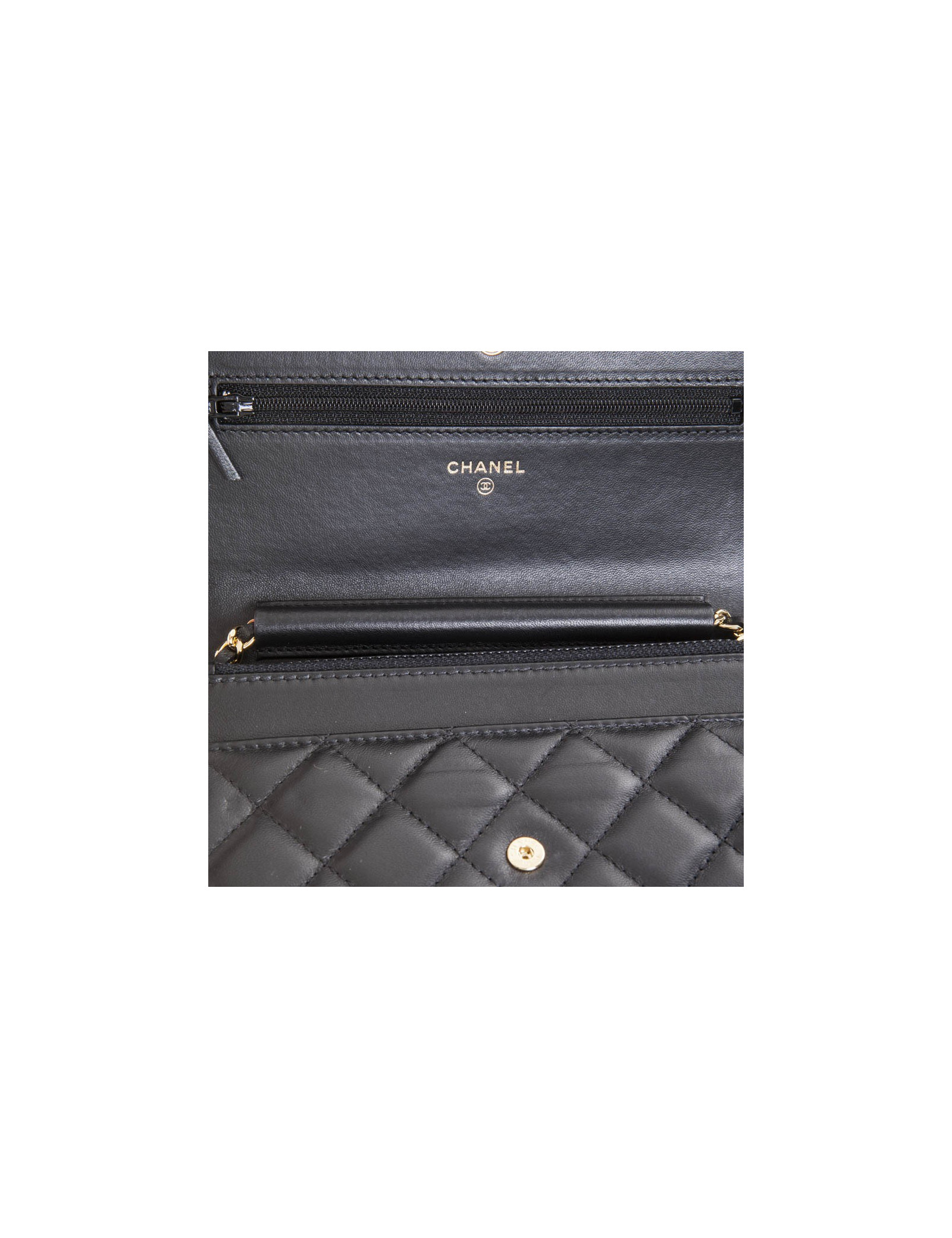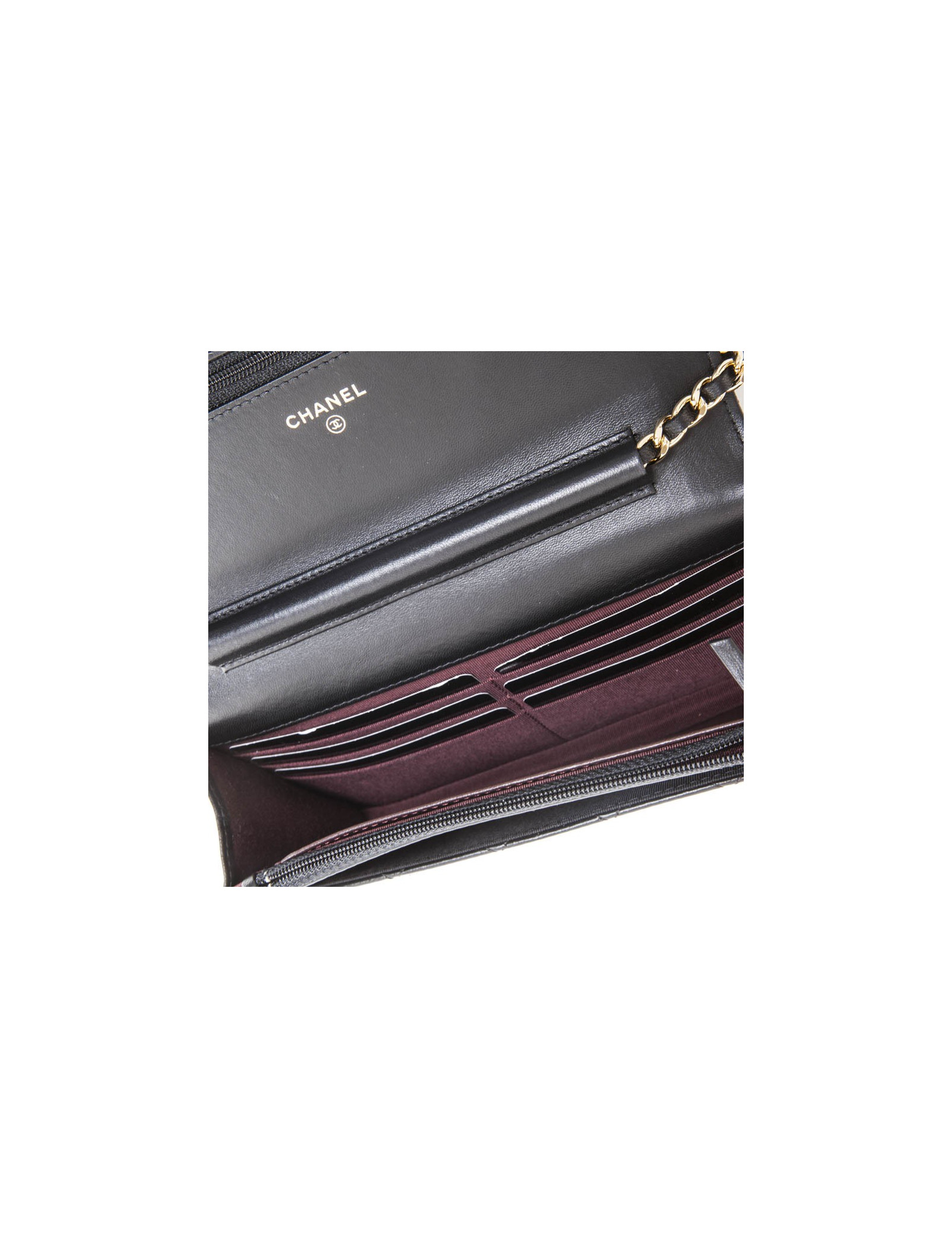 Mini sac pochette de la Maison Chanel en cuir d'agneau lisse matelassé noir. Bijouterie dorée. Fermeture par bouton pression. Porté épaule ou en crossover. Hologramme: 2267... et sa carte d'authenticité. L'intérieur est en cuir bordeaux avec une poche zippée, 6 poches pour cartes et une poche plaquée à l'avant.