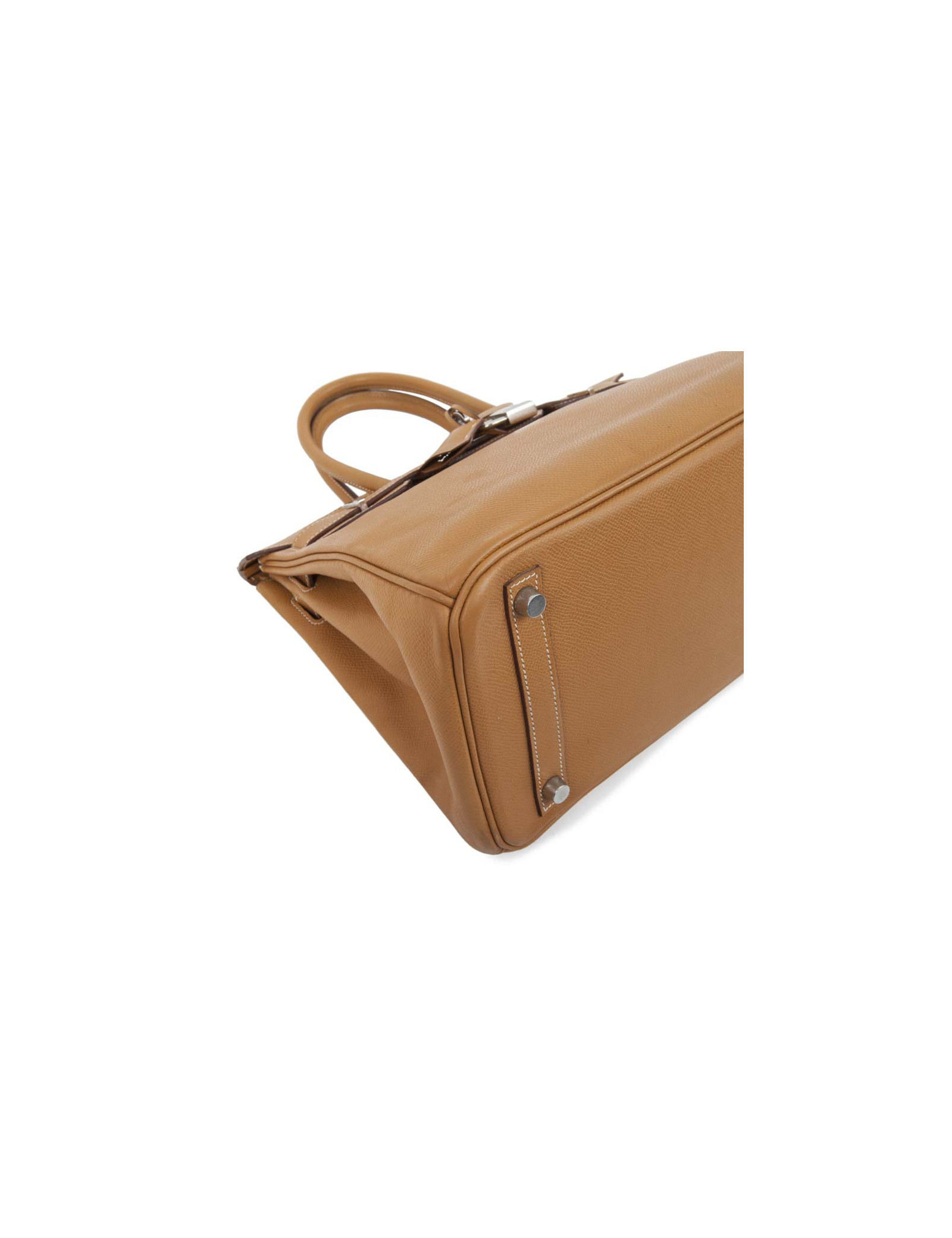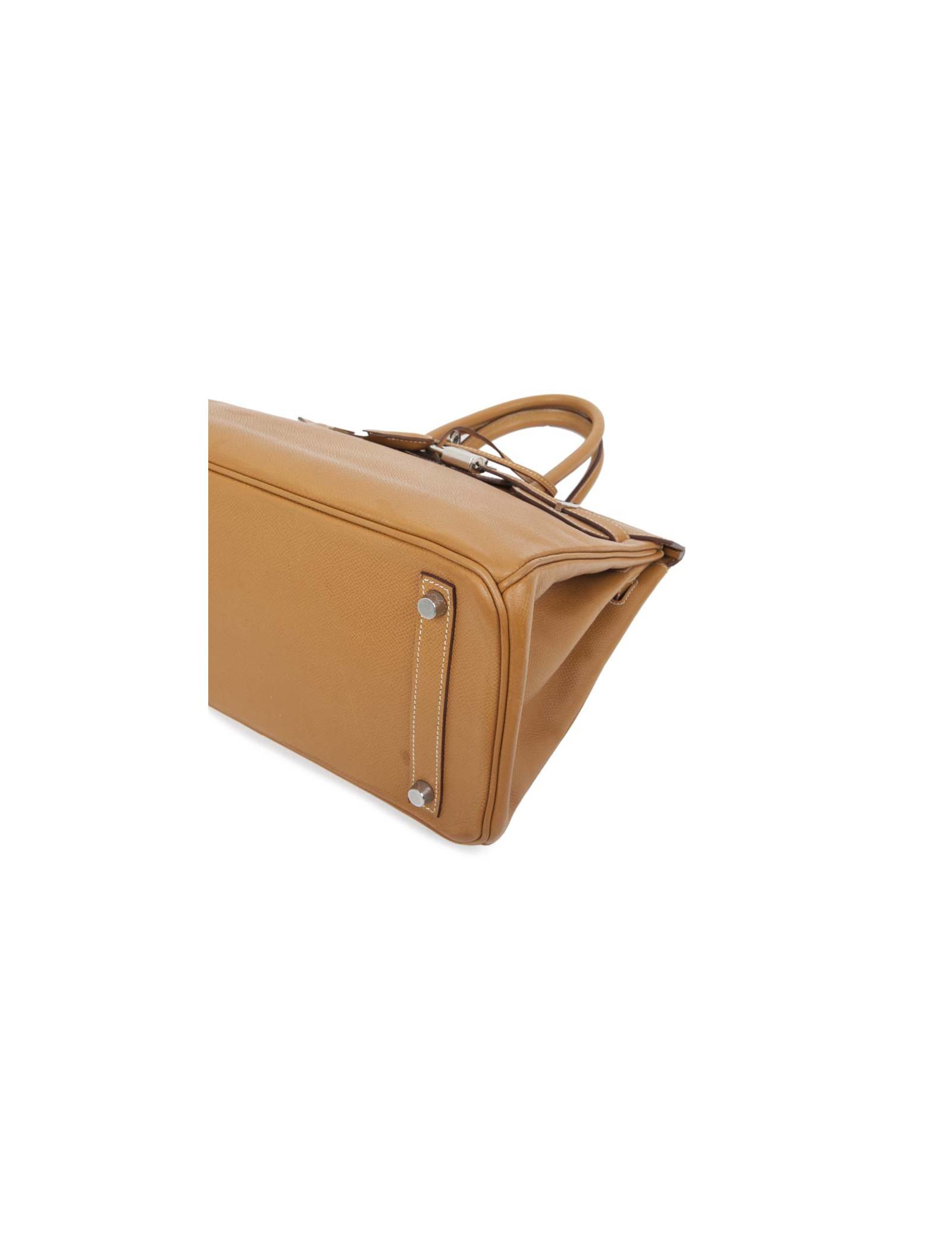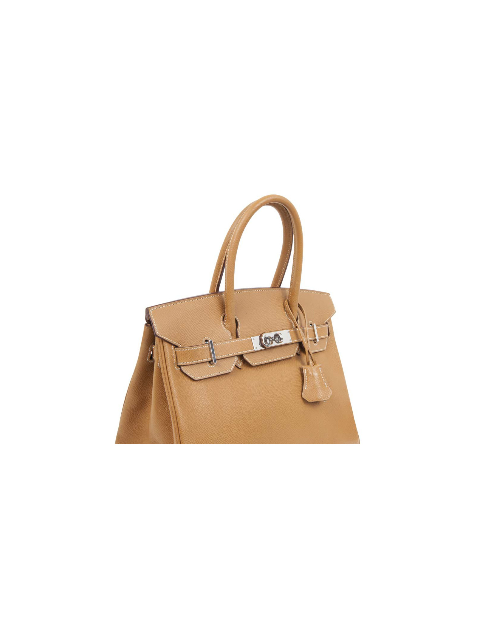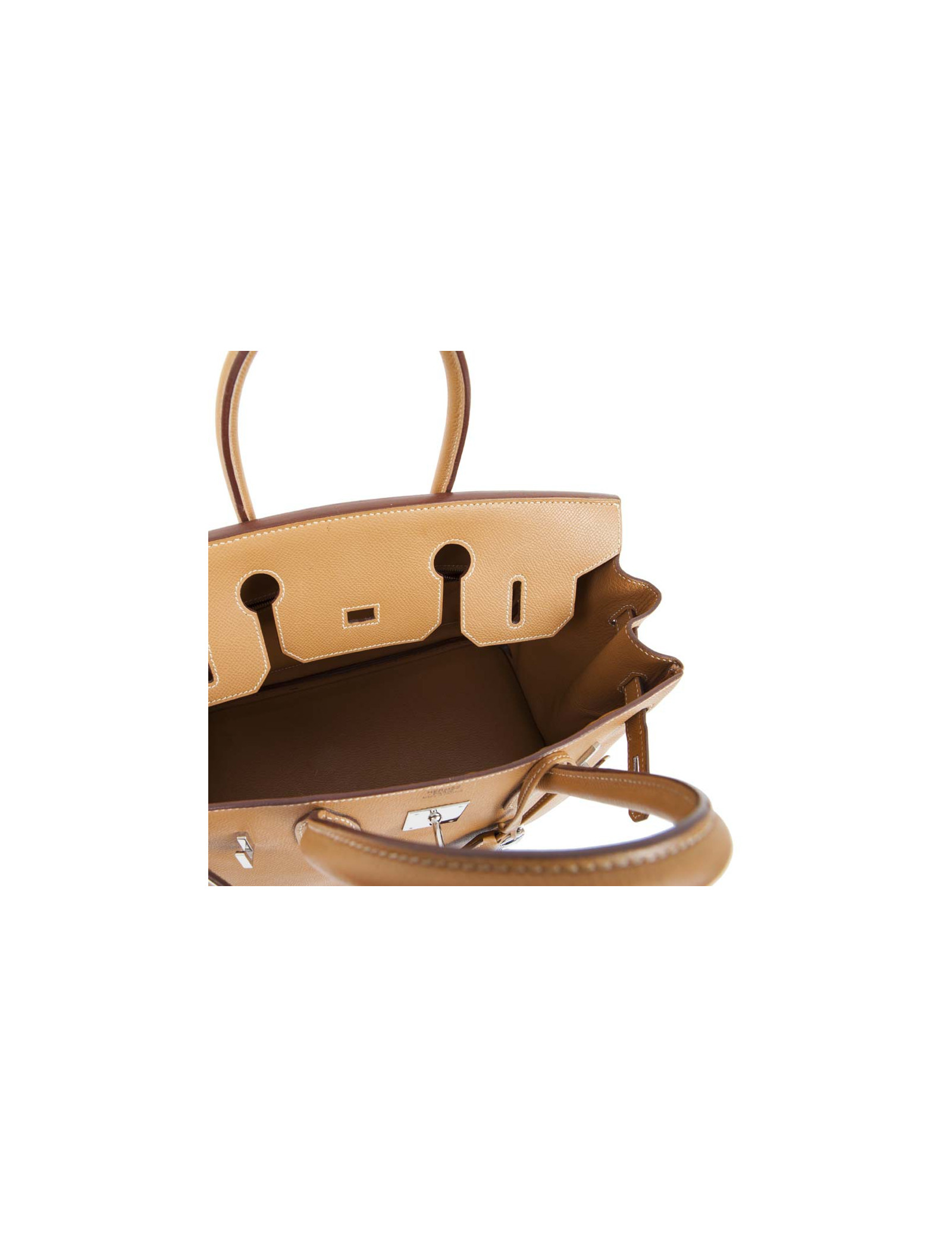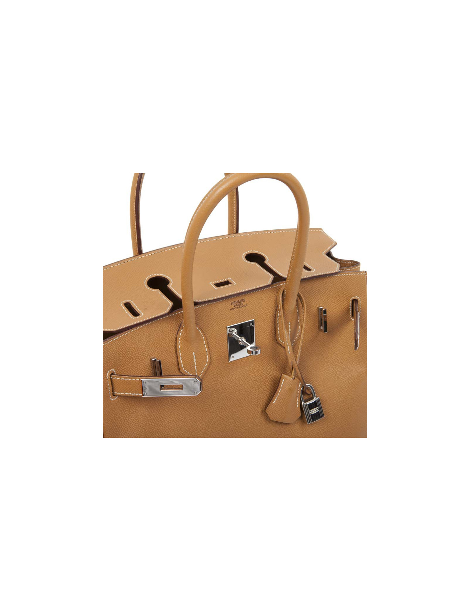 Rare! Sac Birkin 30 en cuir epsom gold H de la Maison Hermès. Lettre K dans un carré : année 2007. Bijouterie argent palladium. Surpiqûres beige. A l'intérieur, 2 poches plaquées dont 1 zippée. Tirette, clochette, cadenas et clefs. En très bon état. Quelques marques de stylo à l'intérieur.