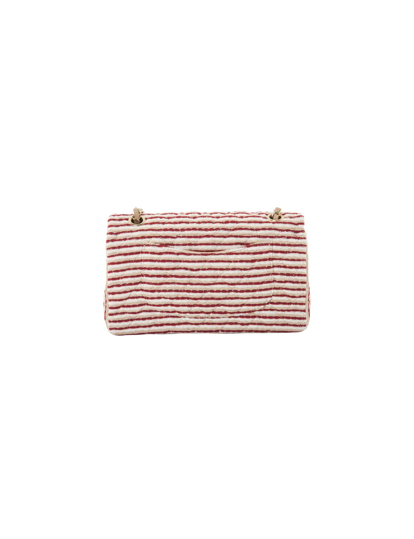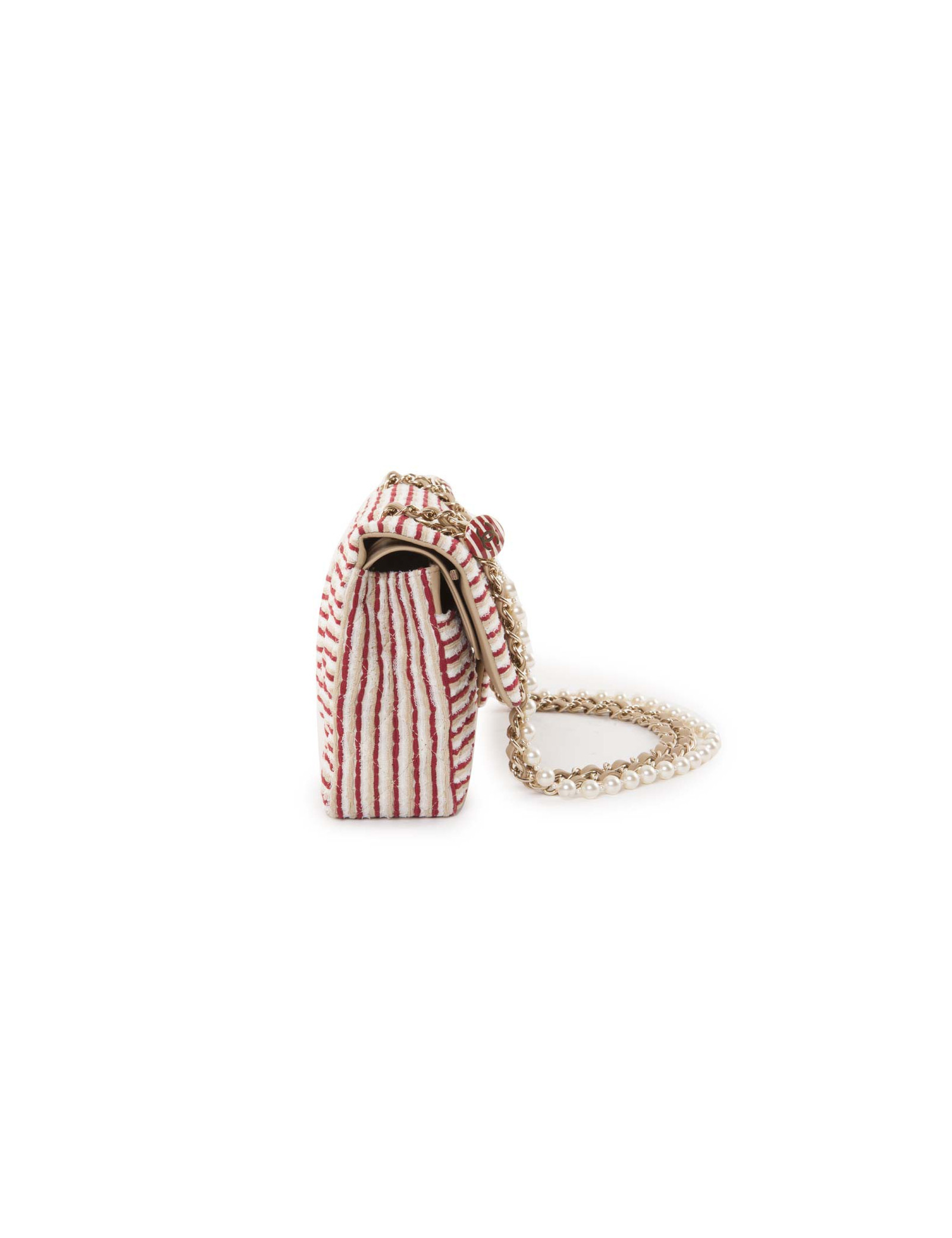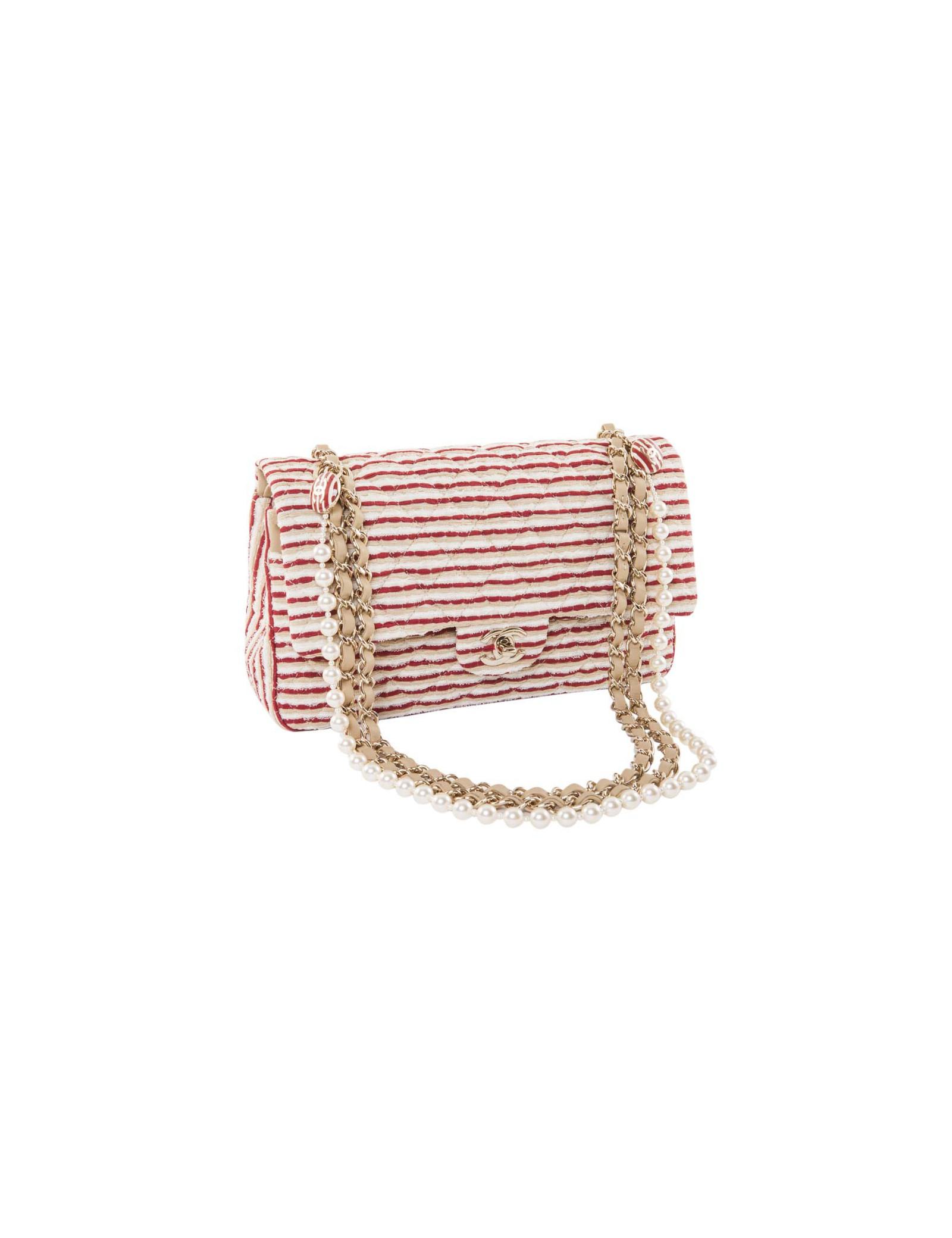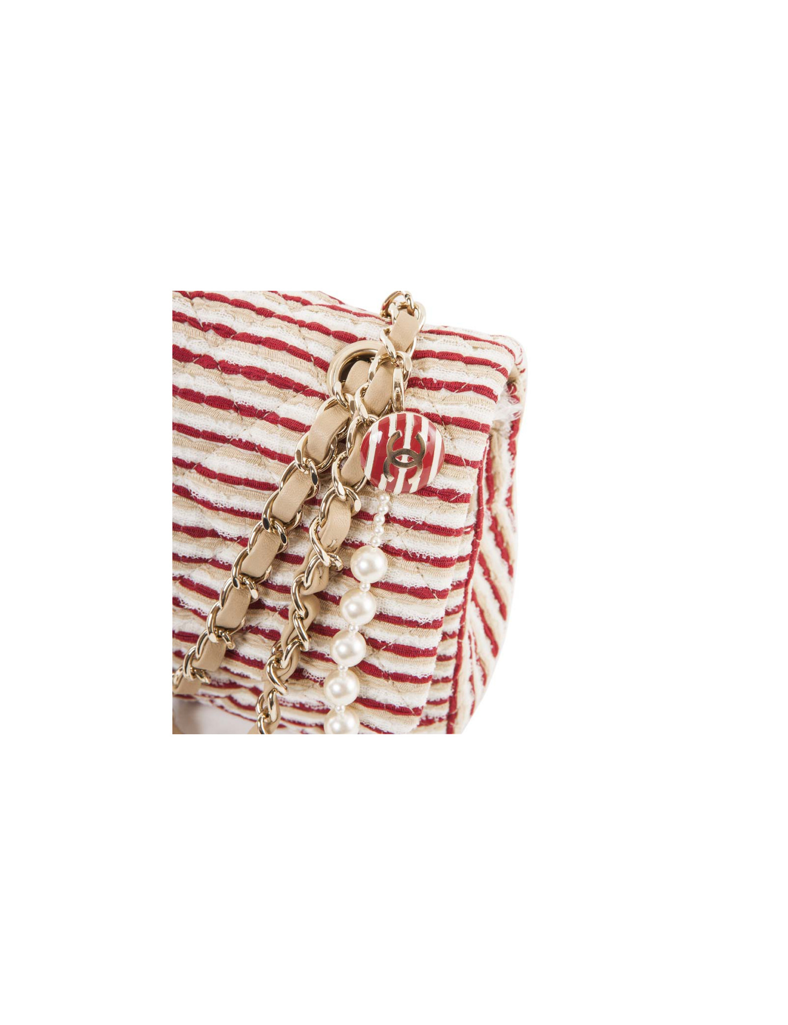 Sac 'Timeless' de la Maison Chanel en tissu et dentelle tricolore: rouge, beige et blanc. Bijouterie dorée. Double rabat. L'intérieur est en cuir beige. Porté épaule ou en crossover. Une chaine perlée s'accroche ou s'enlève sur la chaine déjà existante (peut se porter en chaine sautoir). Ventes privées 2016. Hologramme: 1983... pas de carte d'authenticité (année 2015). Etat neuf.