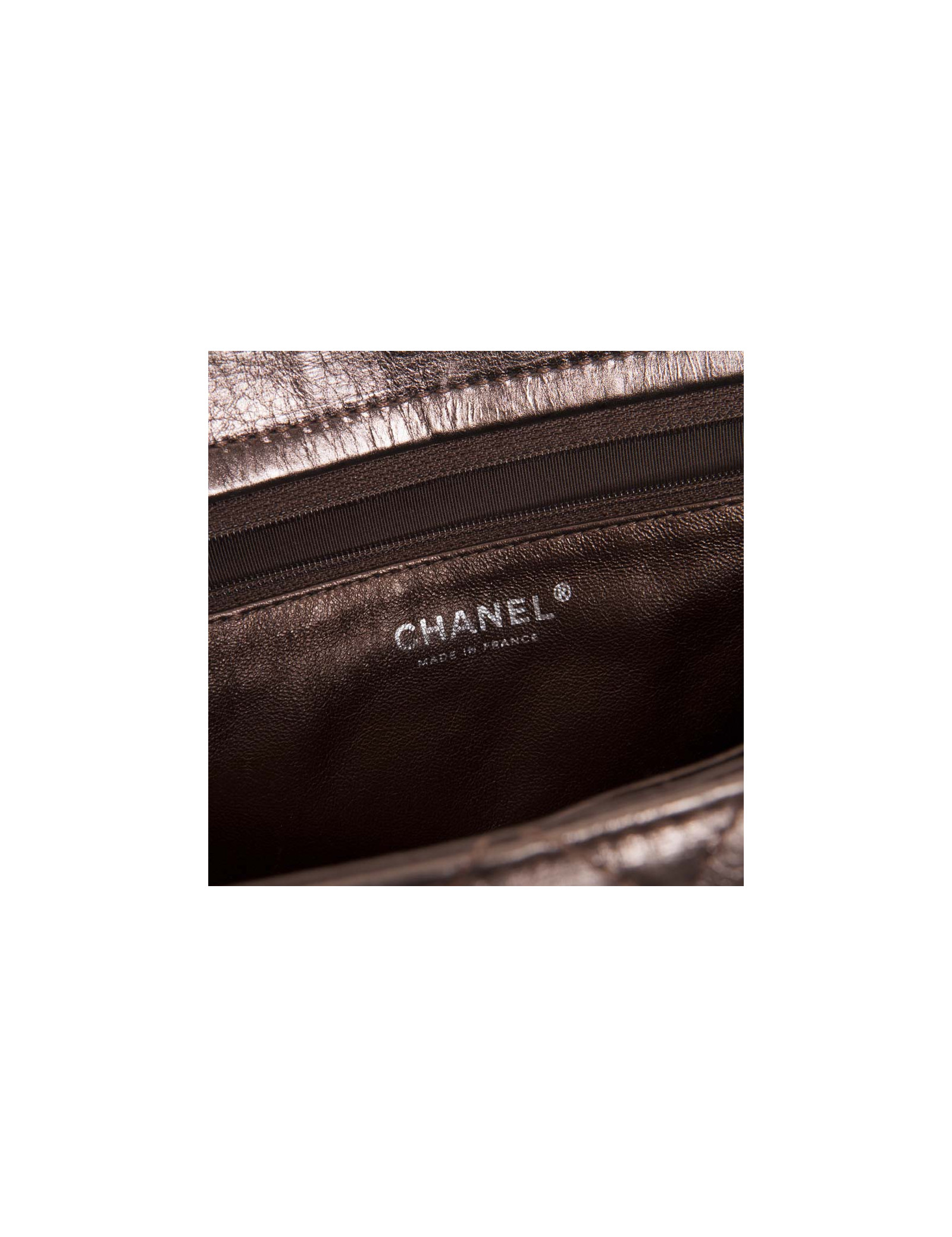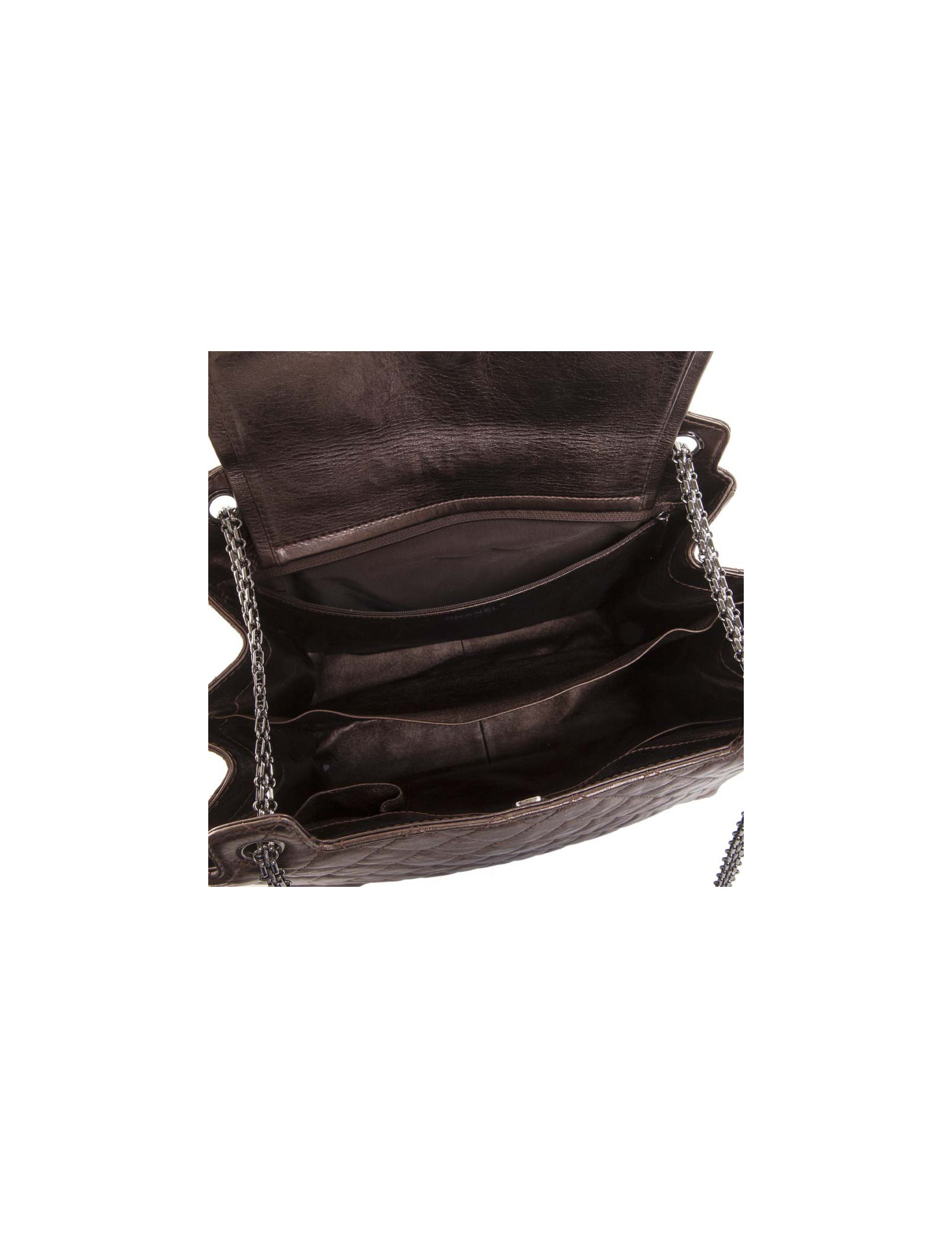 Bijouterie argent brillant ruthénium. Fermoir Mademoiselle. Plusieurs espaces de rangements avec une poche centrale fermant par un bouton pression ainsi qu'une autre à l'avant. Hologramme: 1245..(année 2009). Pas de carte d'authenticité. Porté épaule ou en crossover. En très bon état. infime patine des coins sous le sac.