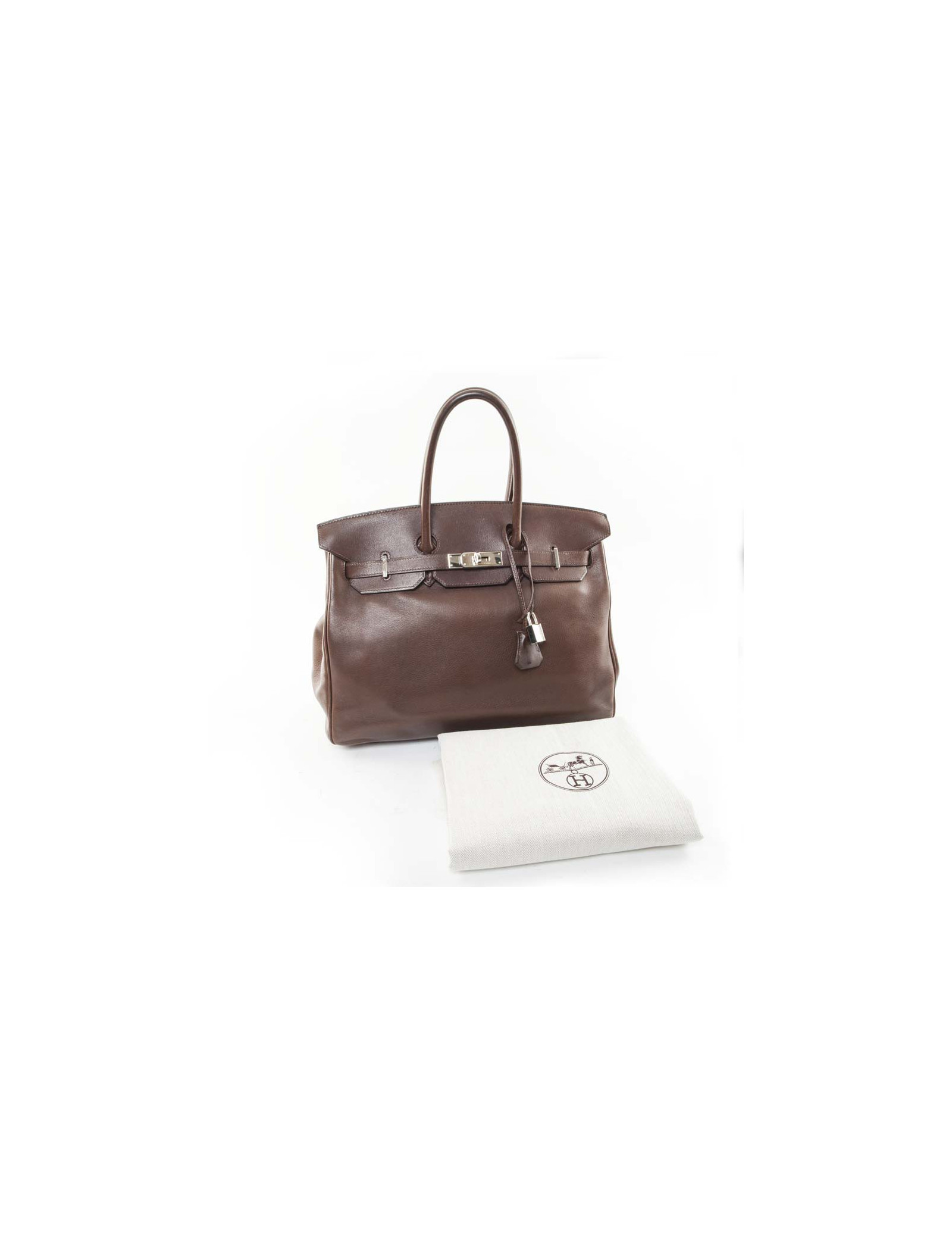 Sac Birkin 35 de la Maison Hermès en cuir lisse souple chocolat. Attributs argent palladié. Lettre K dans un carré (année 2007). Tirette, clochette, cadenas et clefs. A l'intérieur, 2 poches plaquées dont 1 zippée.