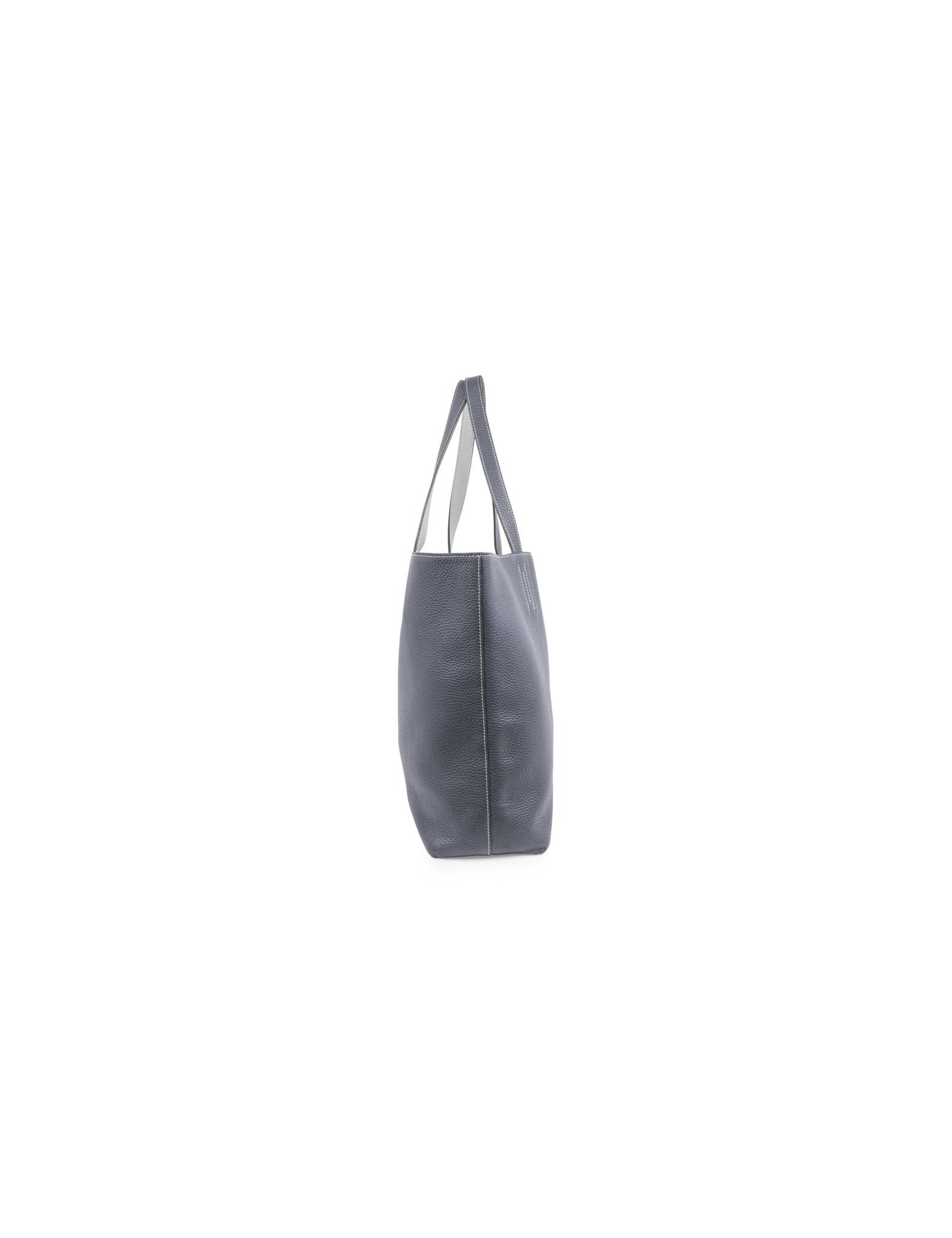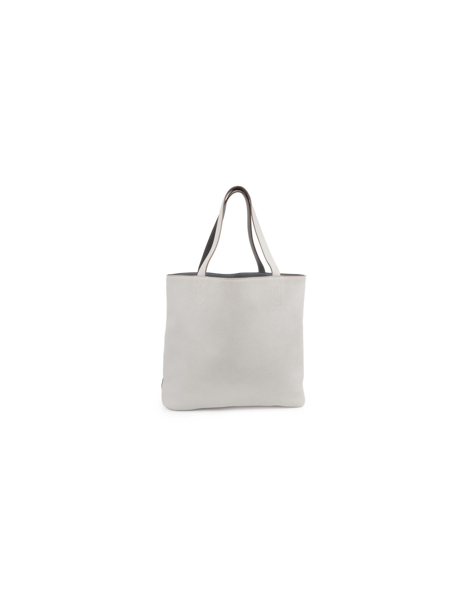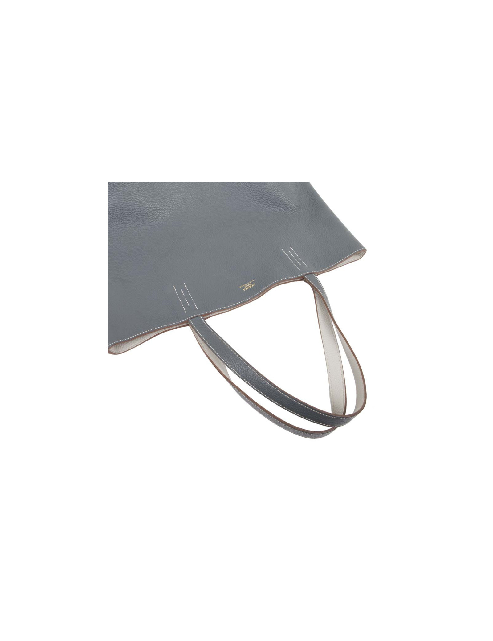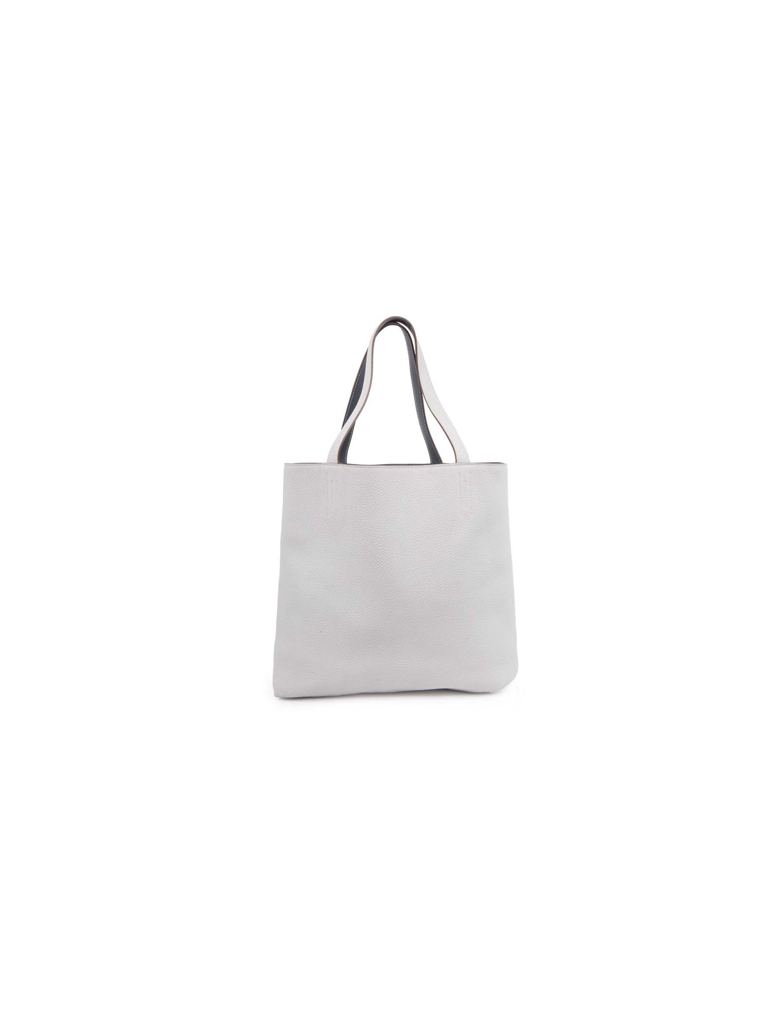 Sac 'double sens' de la Maison Hermès de couleur bleu acier et gris clair, en cuir grainé. Ce sac est réversible. En très bon état. Légère usure sur les coins sous le sac du côté bleu.