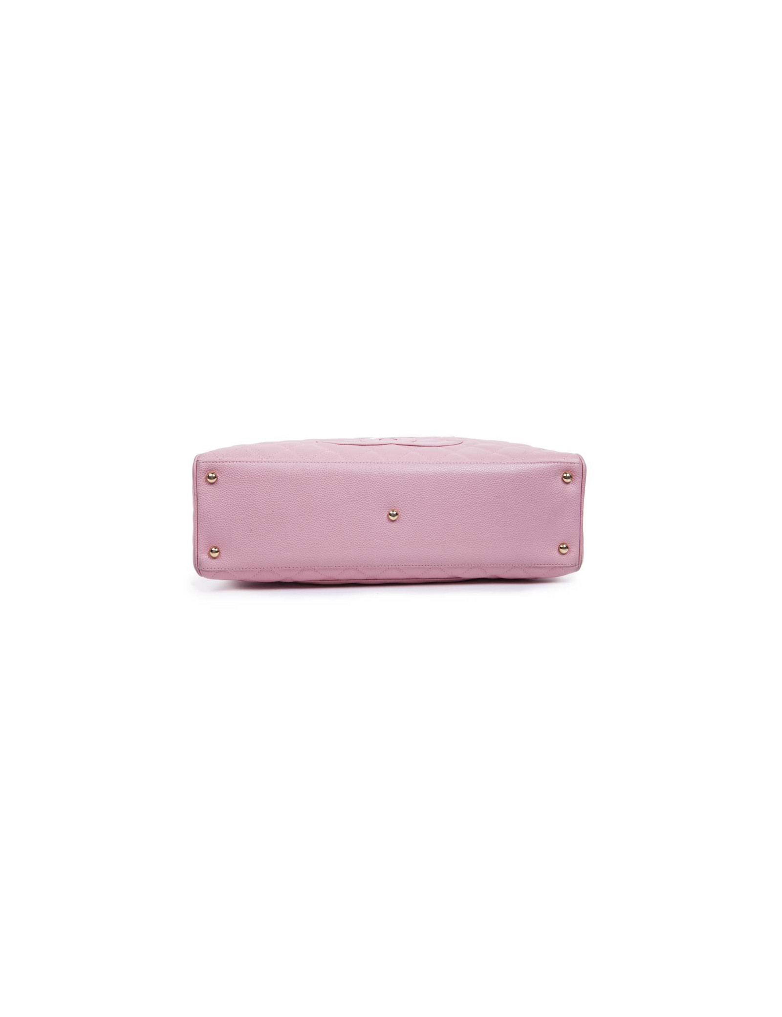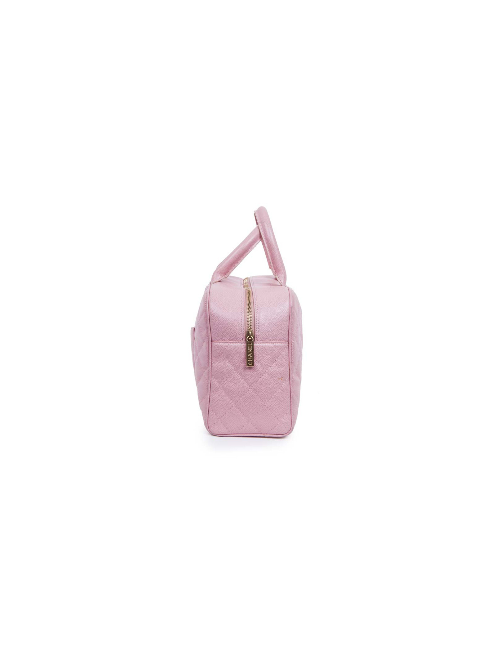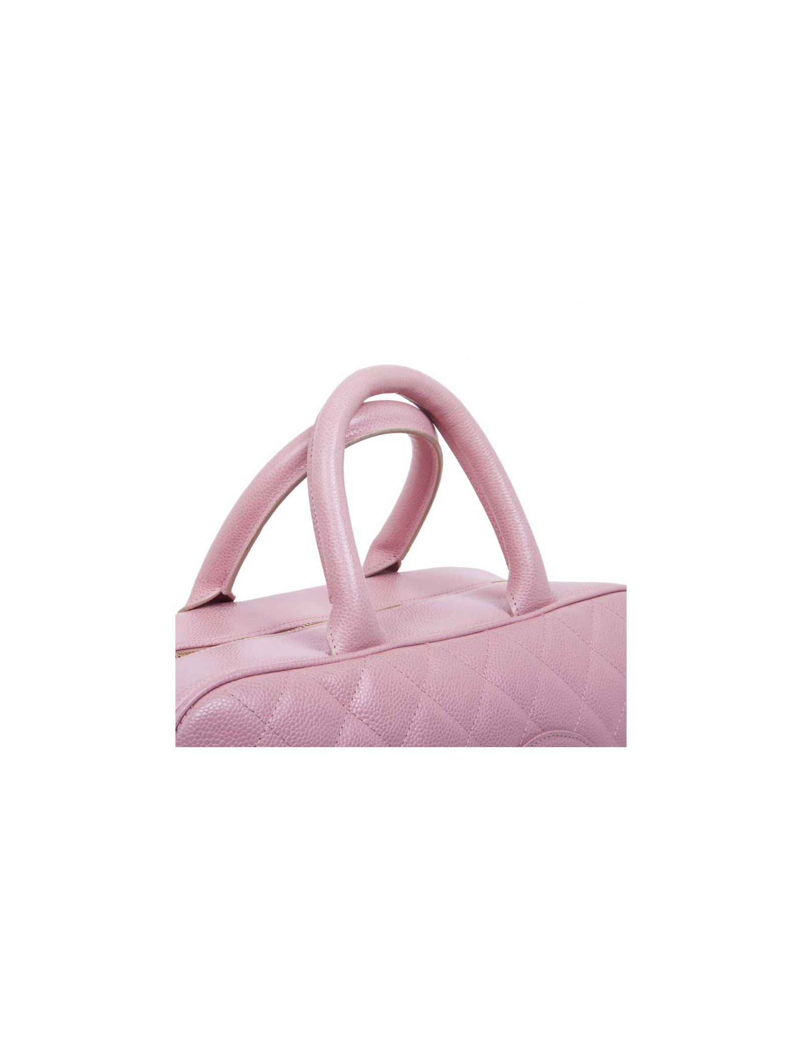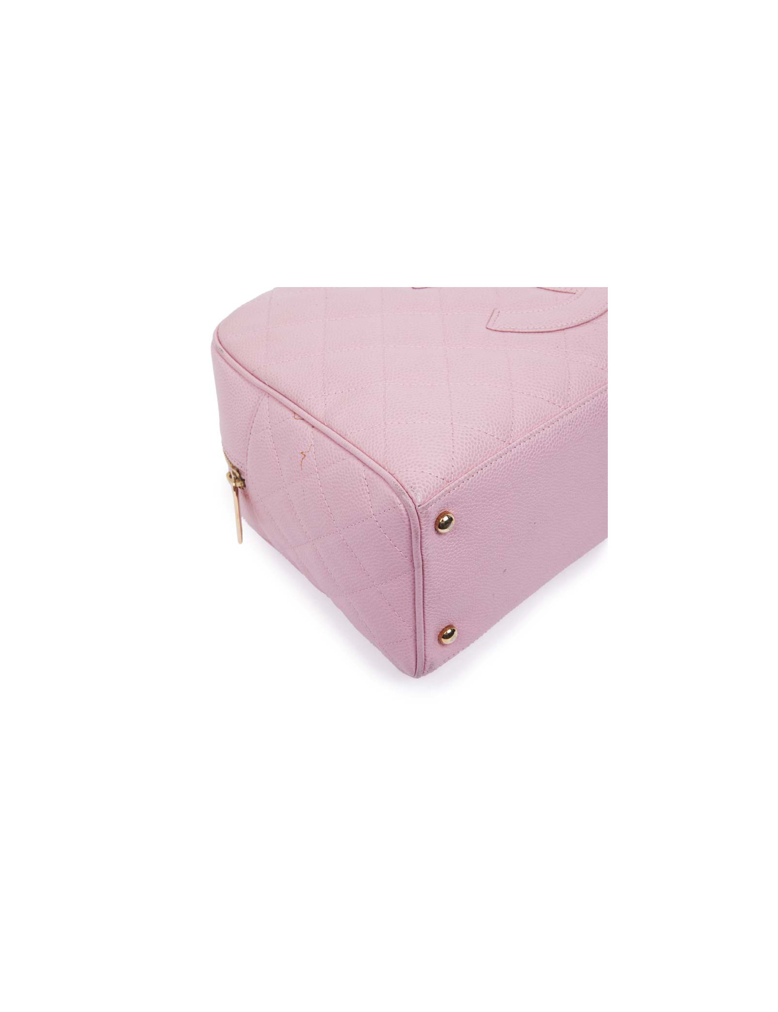 Sac de la Maison Chanel en cuir grainé matelassé rose. Fermeture zippée. Bijouterie dorée. L'intérieur est en toile beige avec une grande poche plaquée. Pas d'hologramme ni de carte d'authenticité. S des soldes. En très bon état. Très légère usure des coins sous le sac mais à peine visible.
