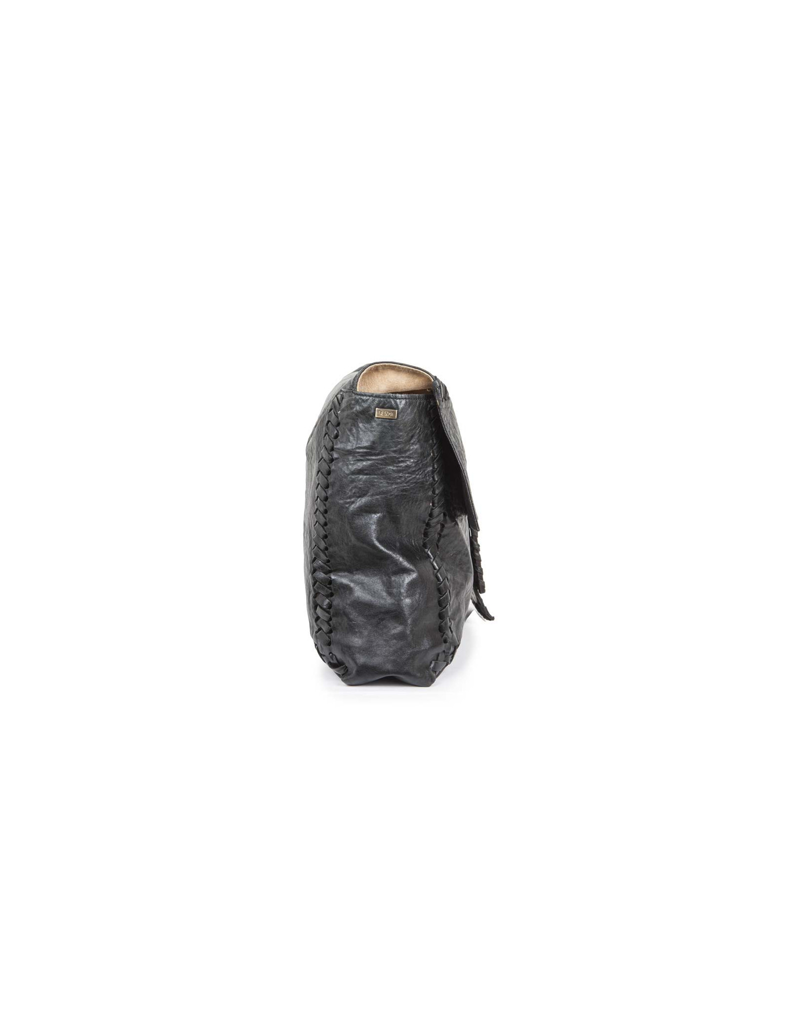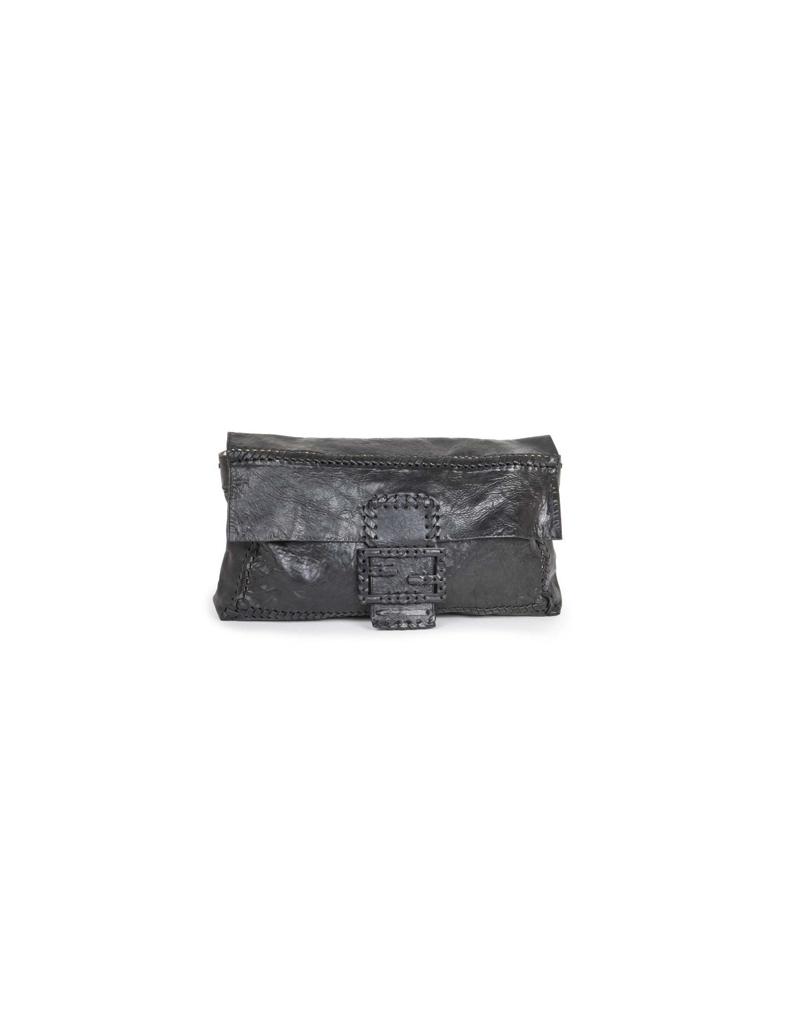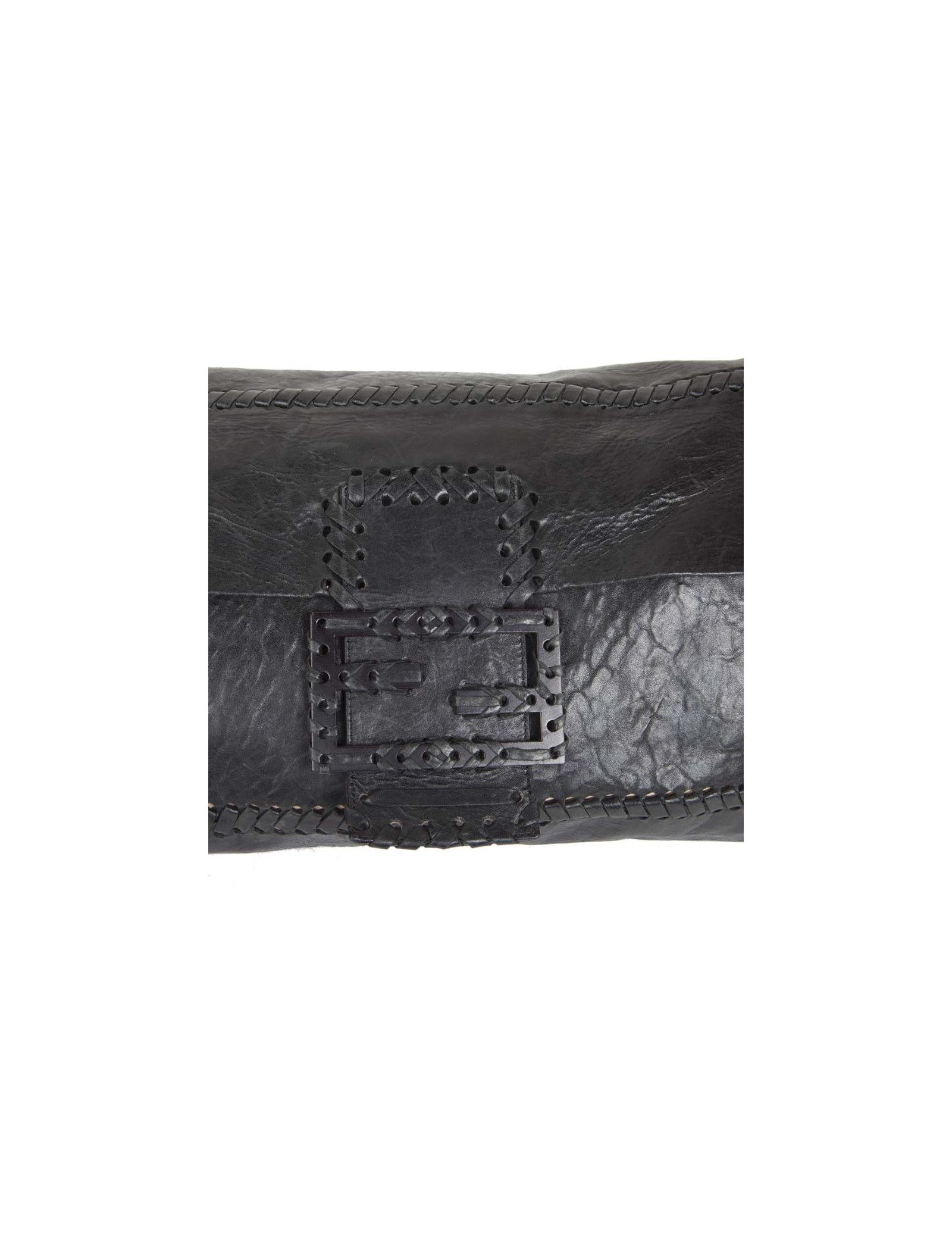 Sac pochette GM de la Maison Fendi en cuir vieilli noir. Fermeture par bouton pression. L'intérieur est en suède avec une grande poche zippée. En très bon état. Quelques marques à l'intérieur du sac. Infime usure des coins sous le sac.