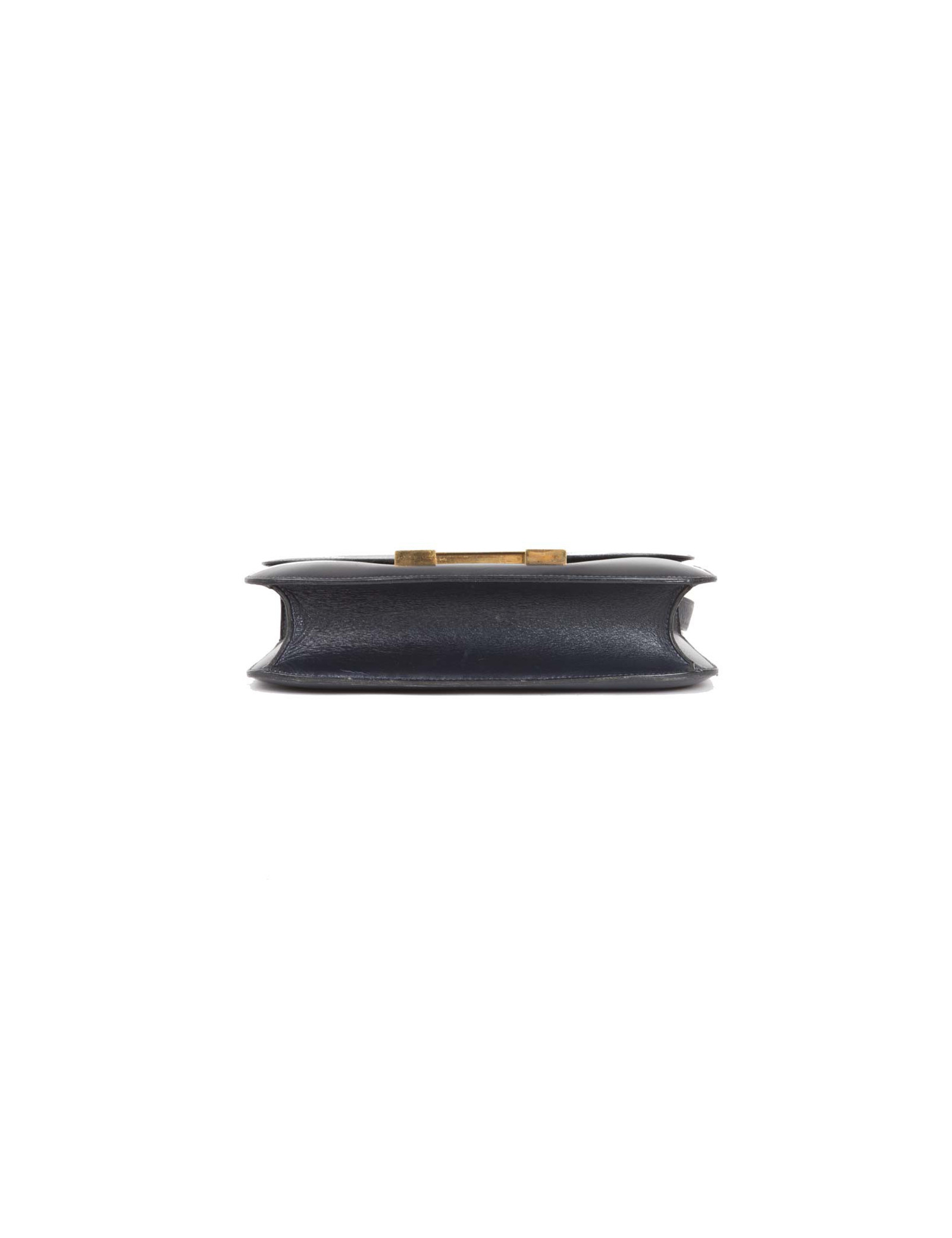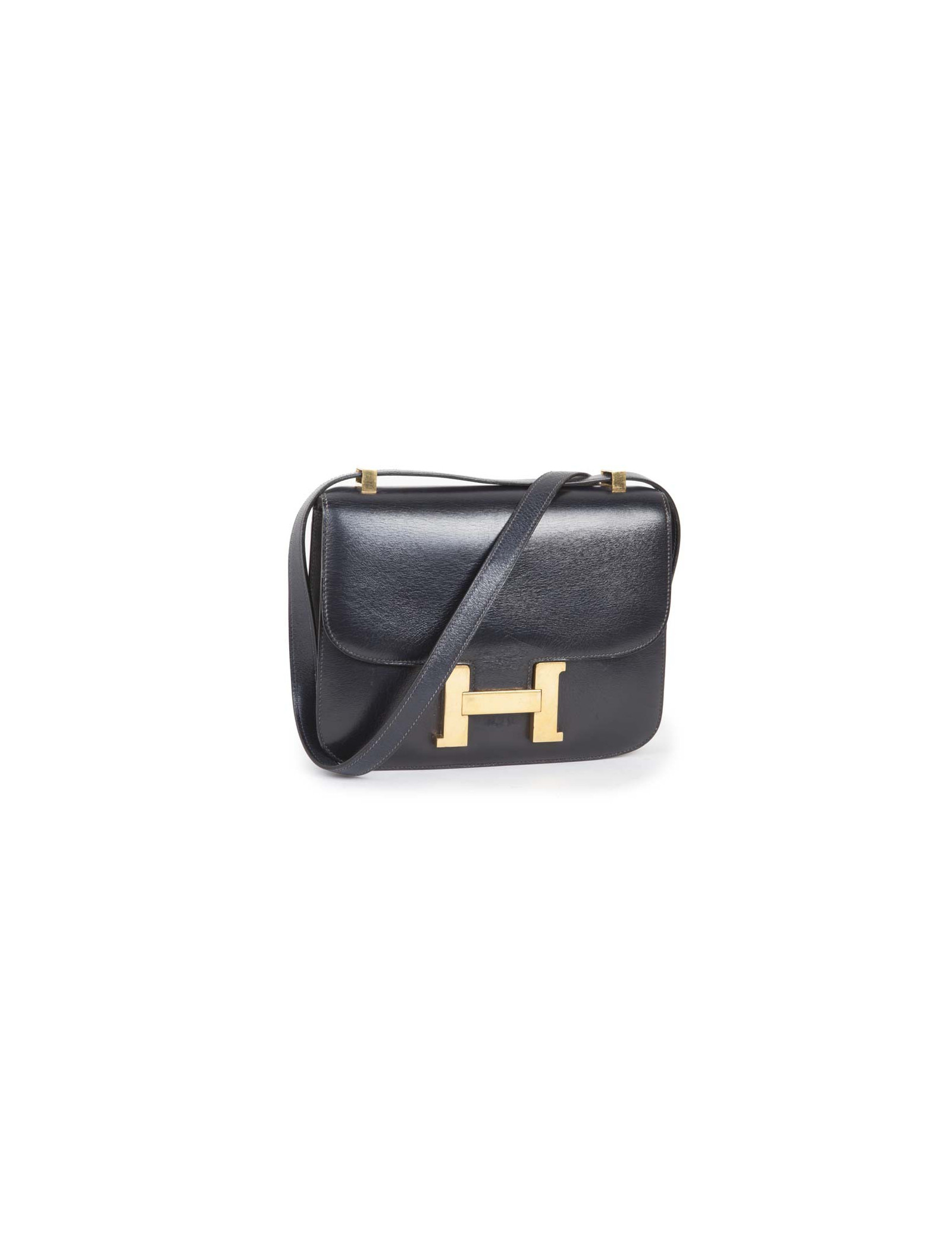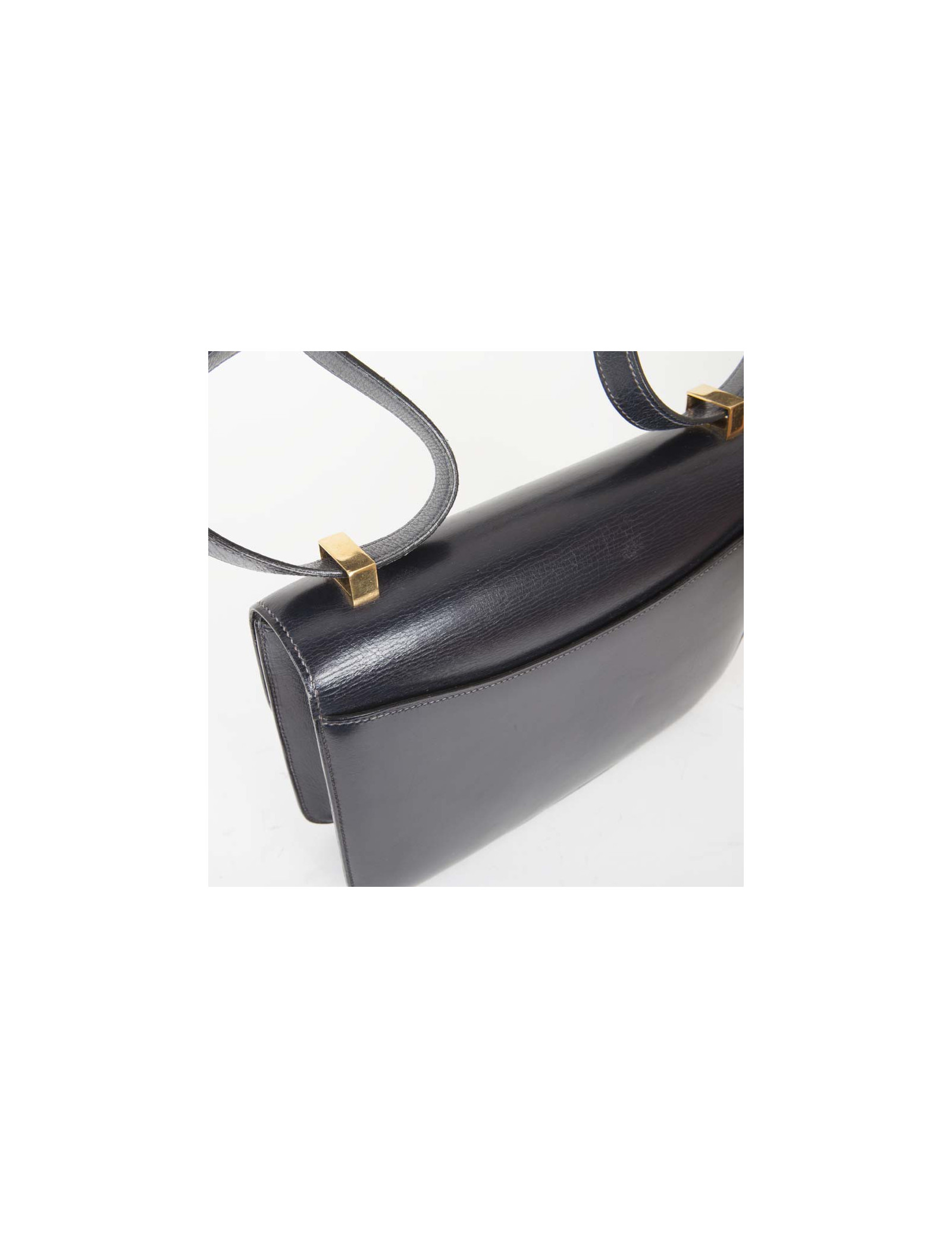 Sac Constance de la Maison Hermès en cuir box bleu marine. Bijouterie dorée avec micro rayures. L'intérieur est en cuir d'agneau lisse bleu marine avec deux poches plaquées dont 1 zippée. Porté épaule. Pas de lettre, circa 1970.