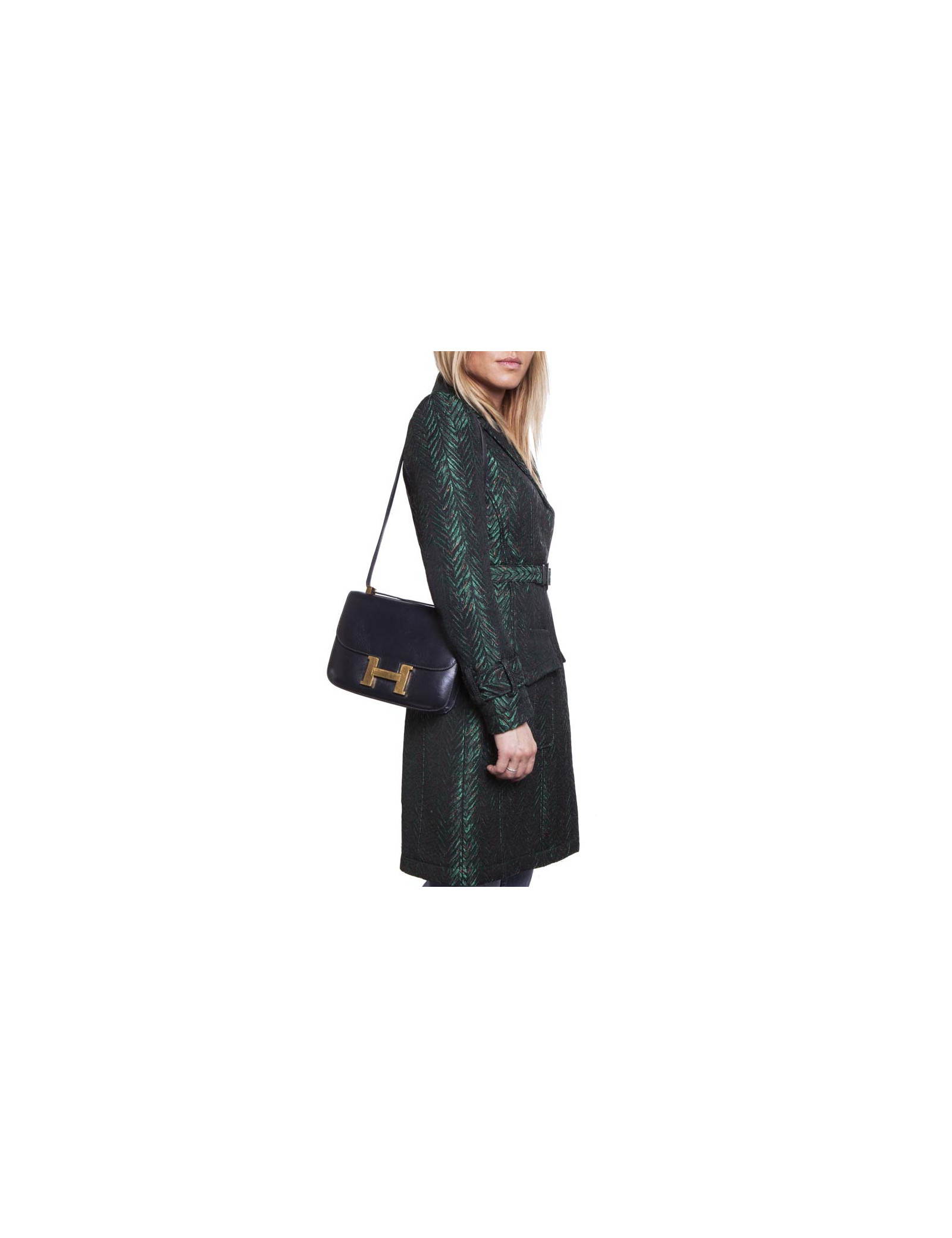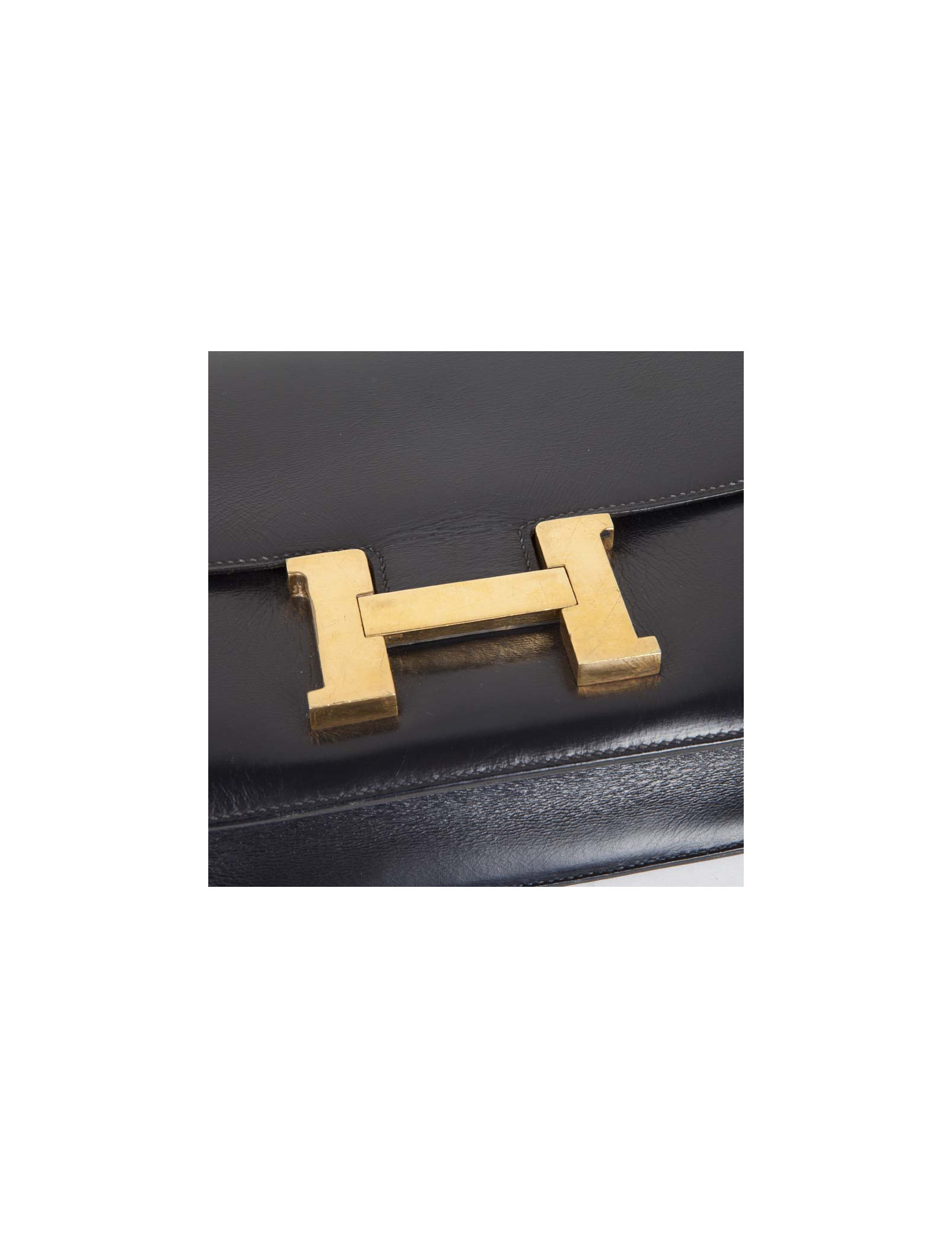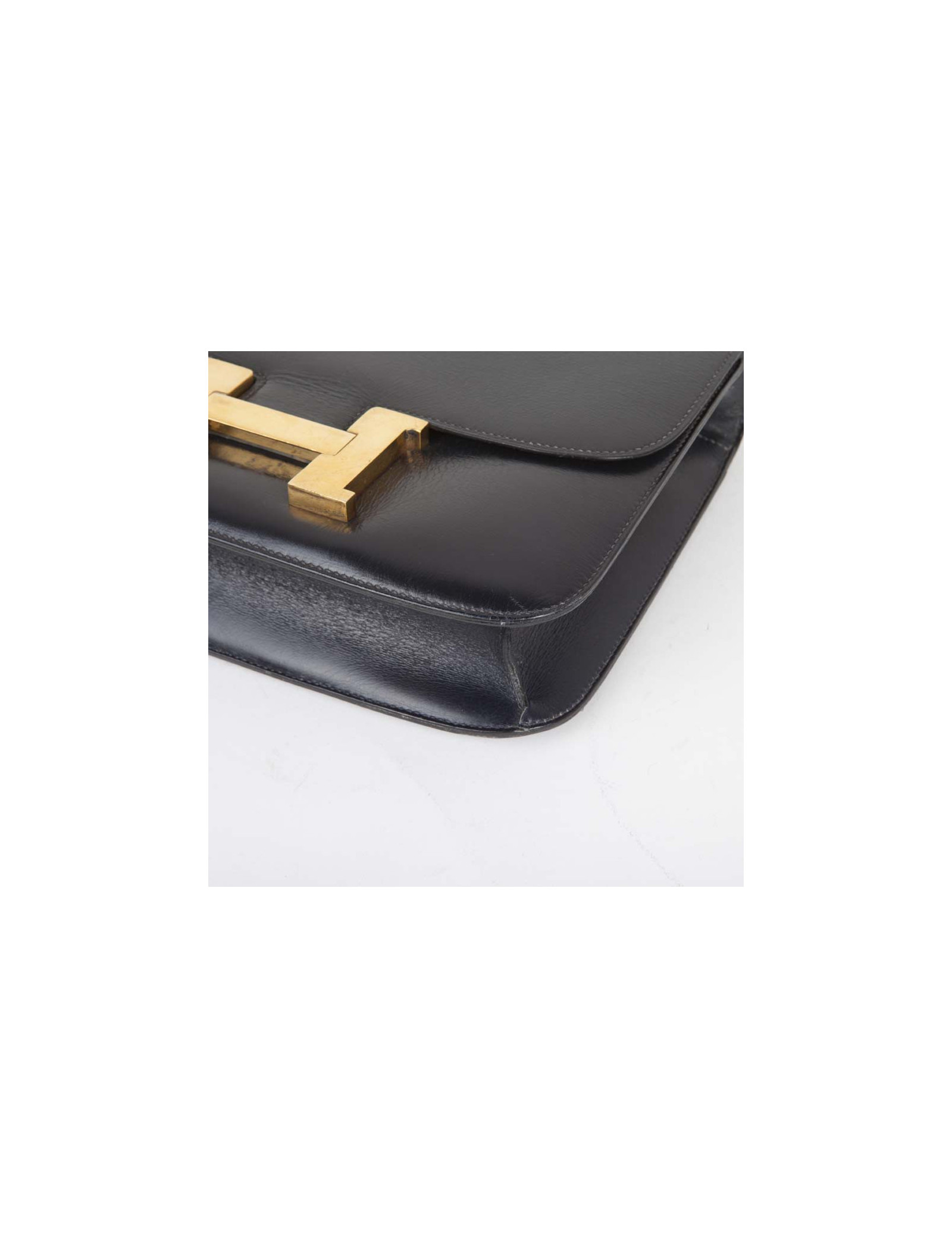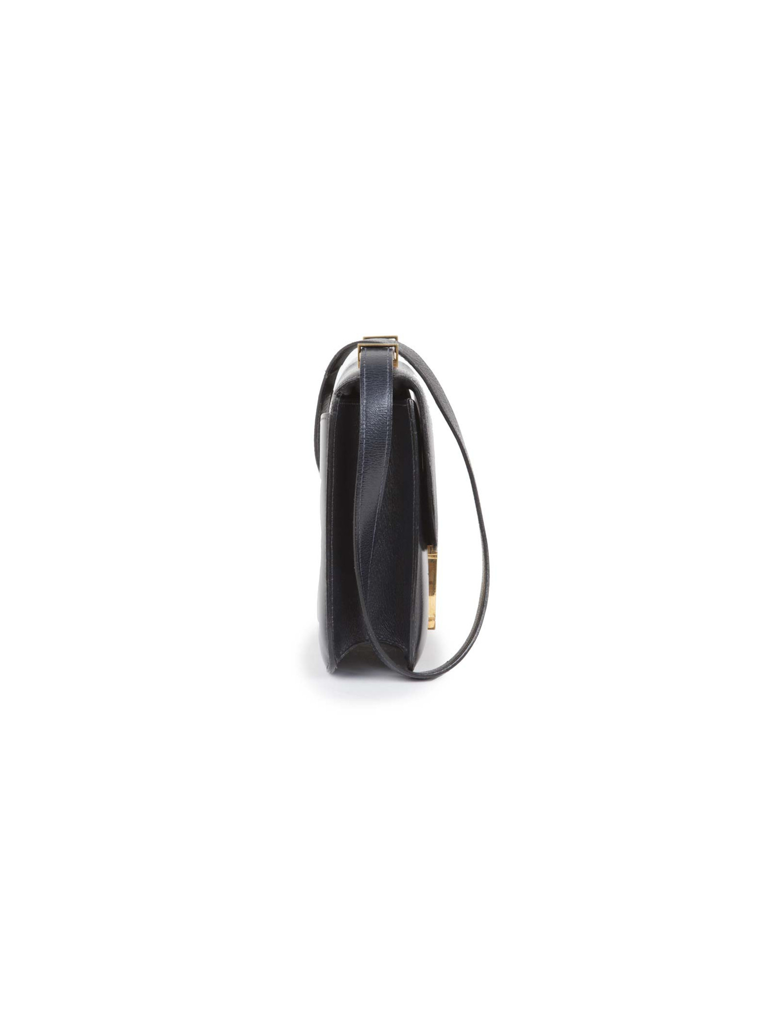 Sac Constance de la Maison Hermès en cuir box bleu marine. Bijouterie dorée avec micro rayures. L'intérieur est en cuir d'agneau lisse bleu marine avec deux poches plaquées dont 1 zippée. Porté épaule. Pas de lettre, circa 1970.