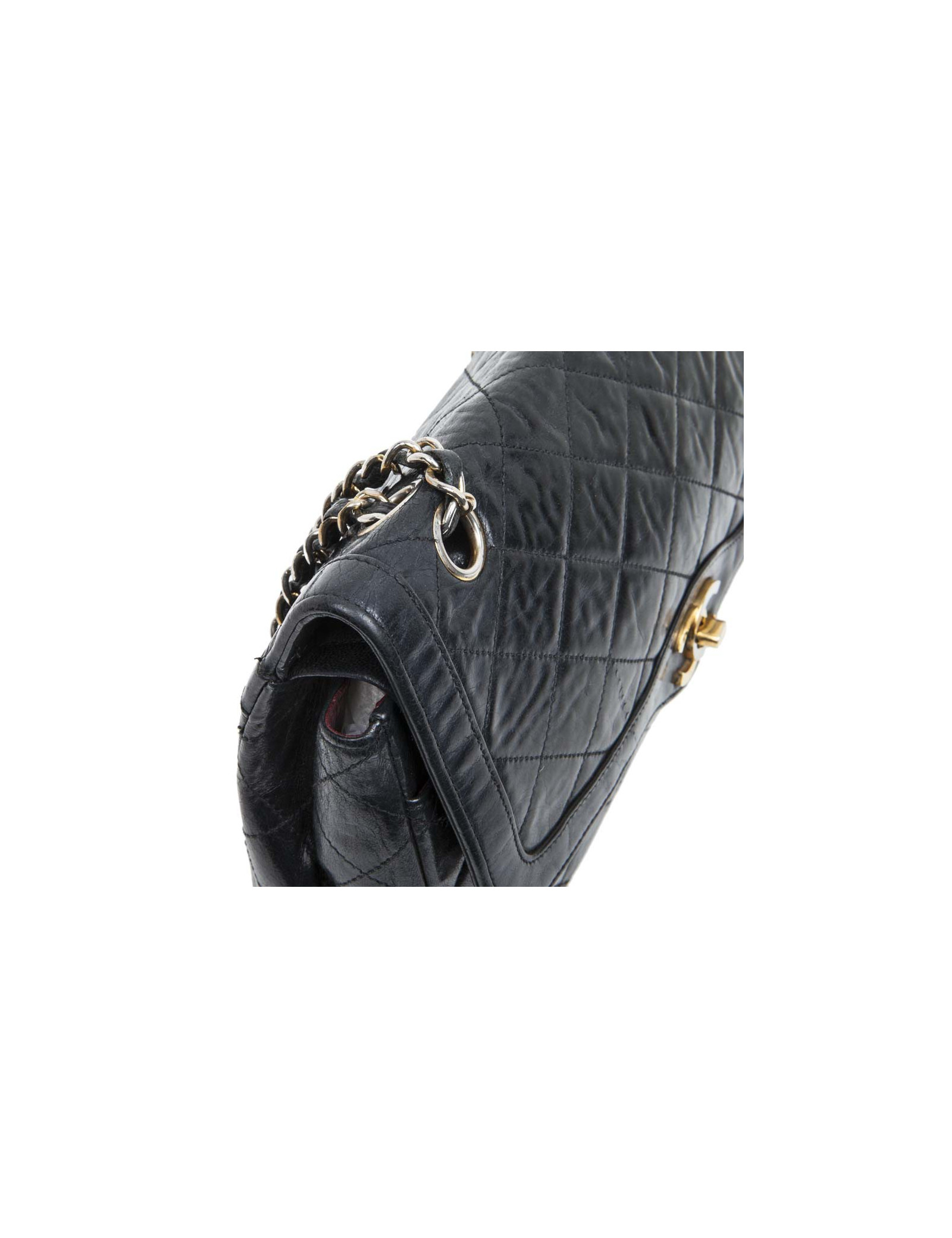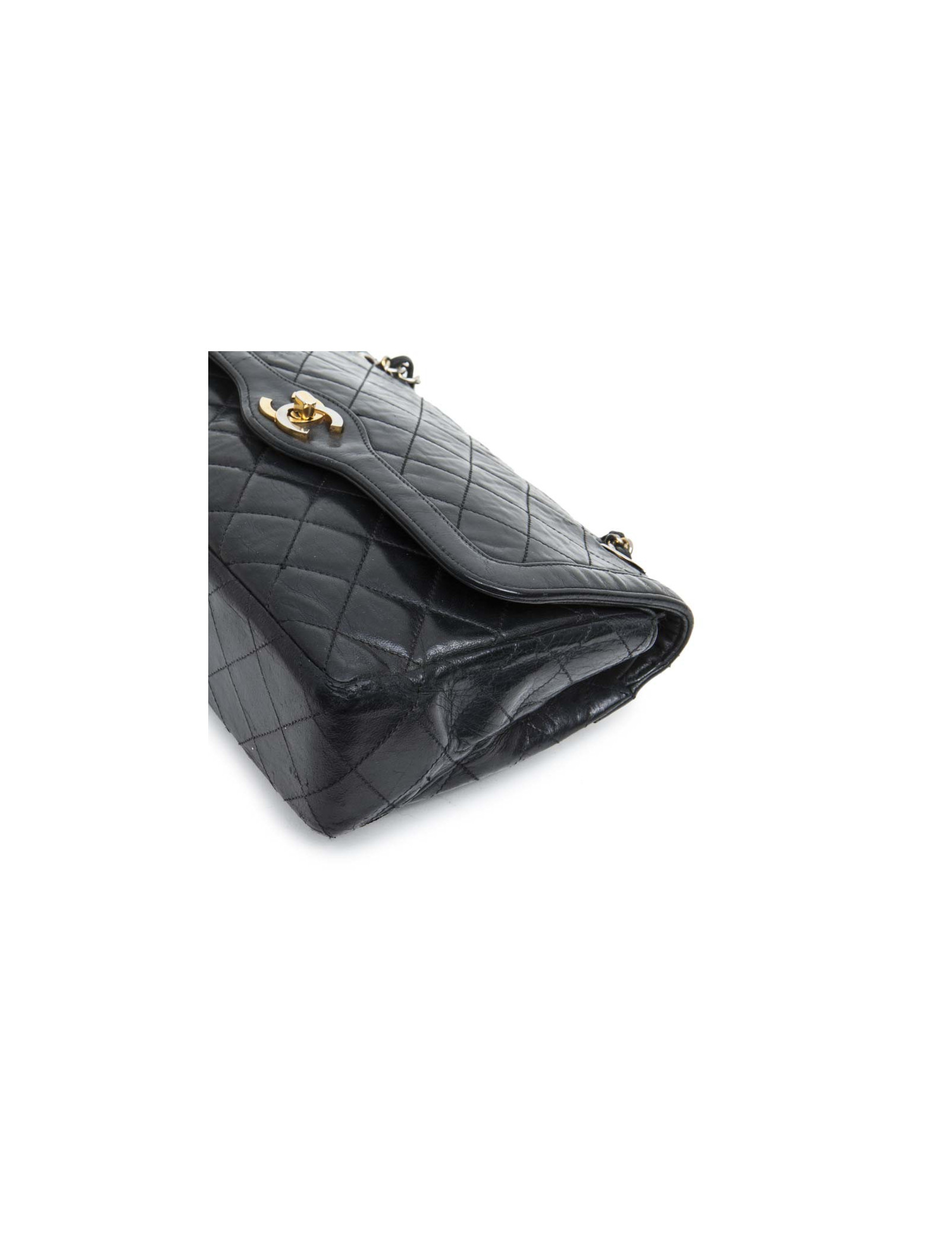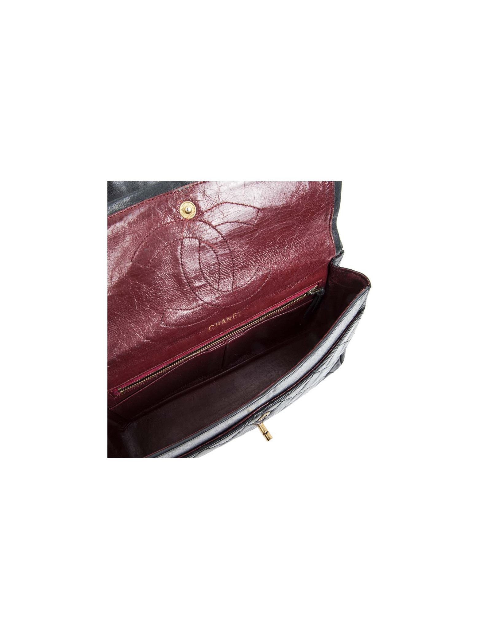 Vintage couture ! Sac 'Timeless' en cuir matelassé noir bleu nuit de la Maison Chanel. Double rabat. L'intérieur est en cuir lisse bordeaux. Porté épaule. Etat vintage. Légère usure des coins sous le sac.