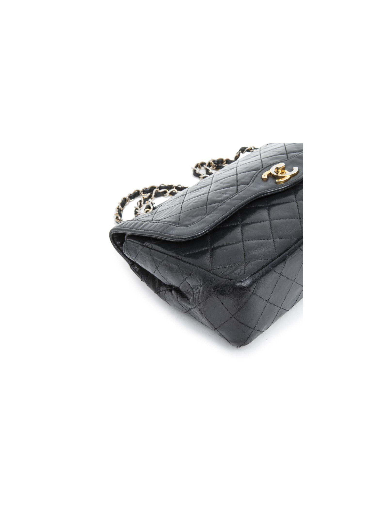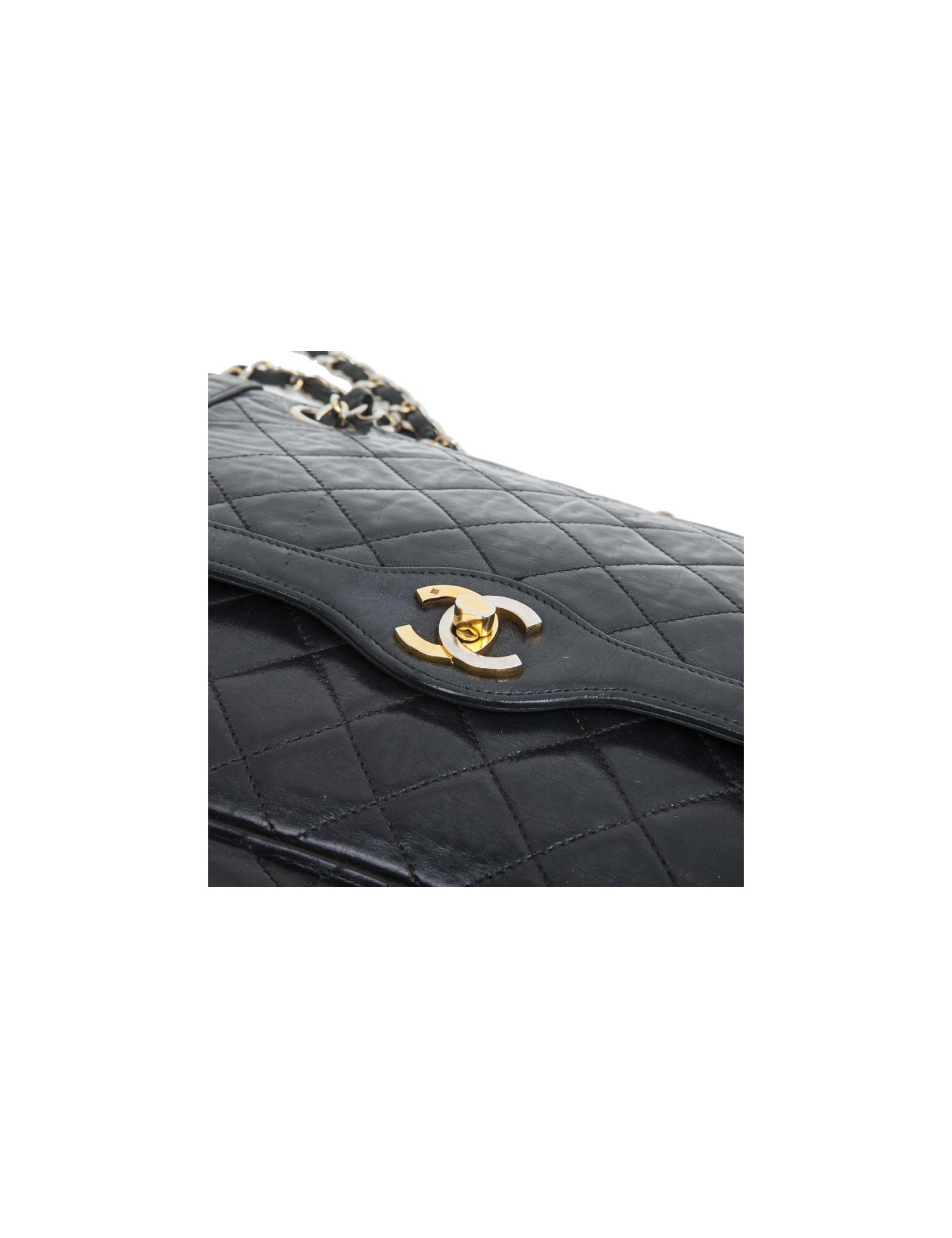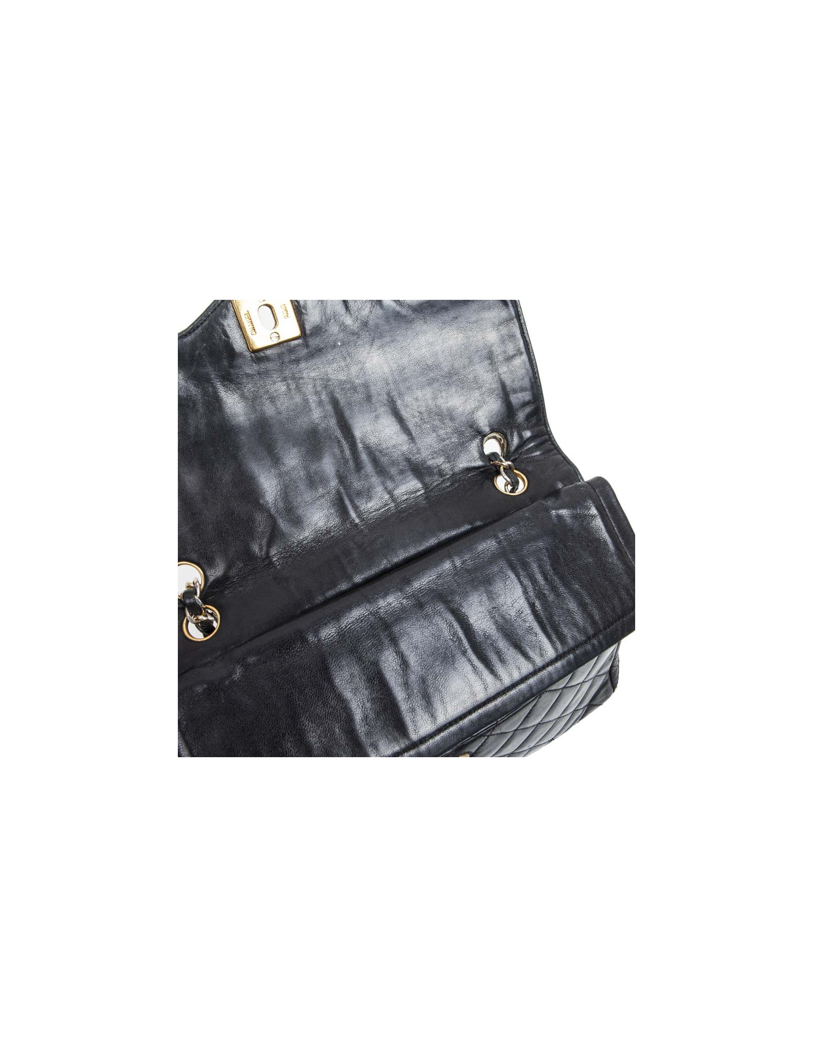 Vintage couture ! Sac 'Timeless' en cuir matelassé noir bleu nuit de la Maison Chanel. Double rabat. L'intérieur est en cuir lisse bordeaux. Porté épaule. Etat vintage. Légère usure des coins sous le sac.