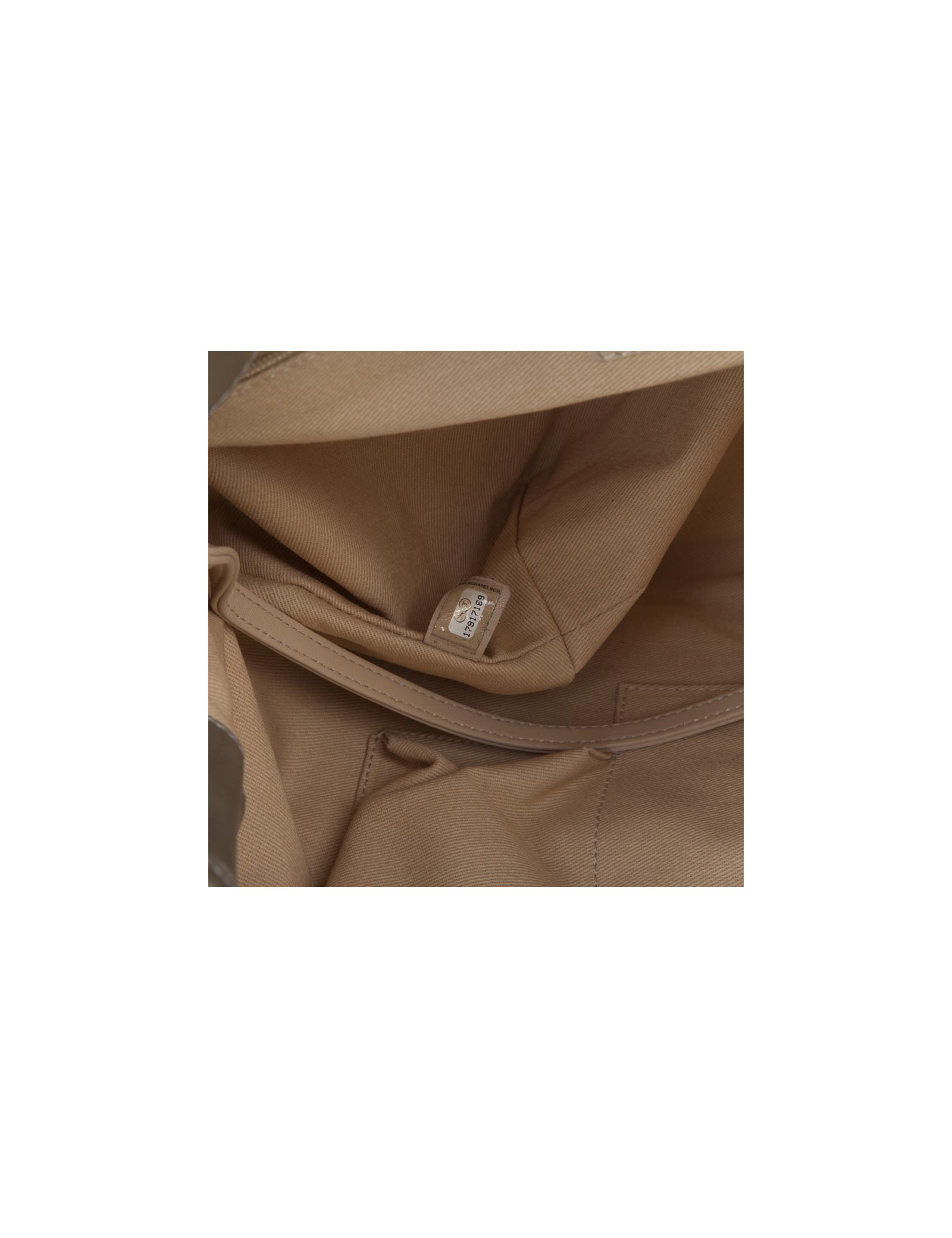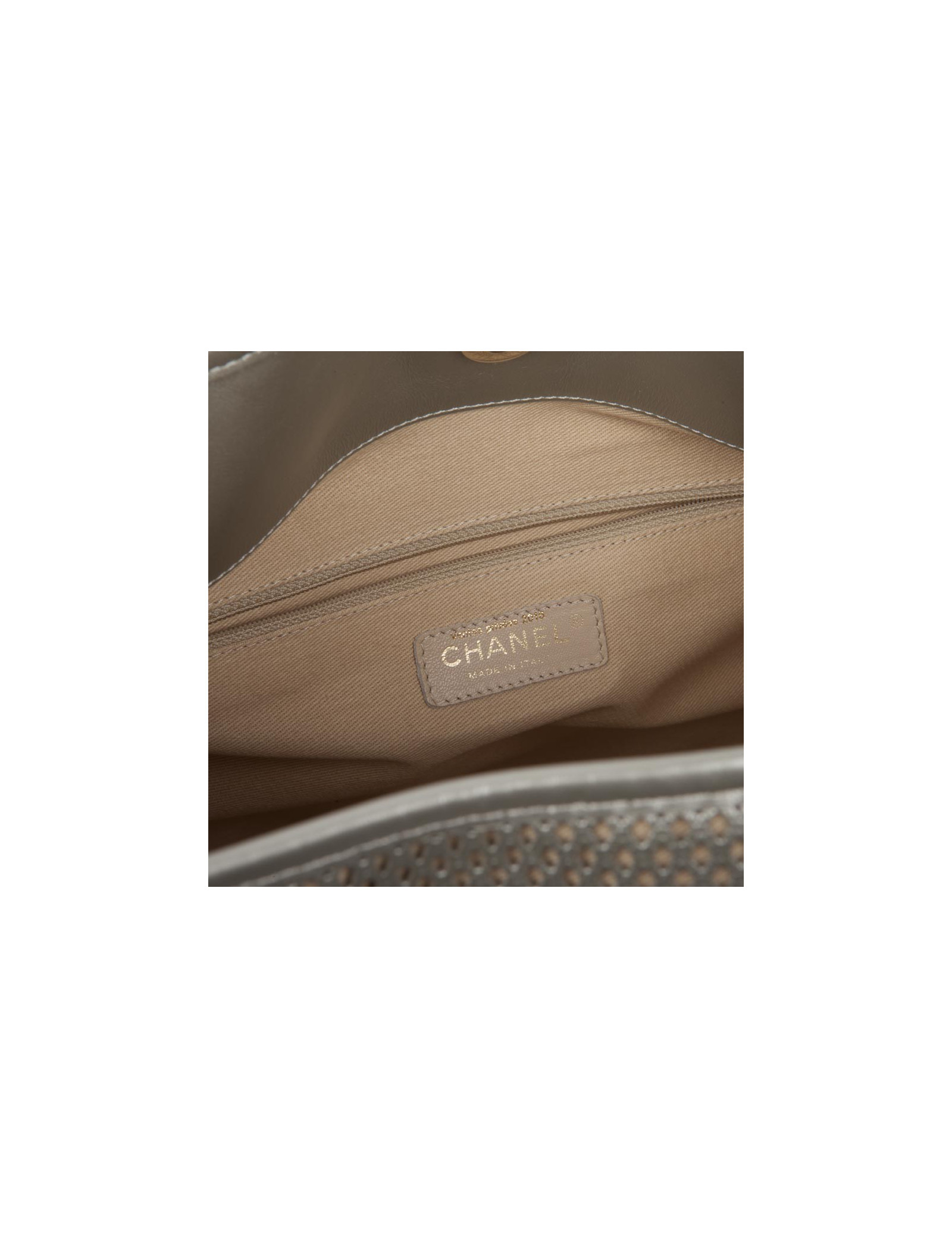 Sac de la Maison Chanel en cuir matelassé et perforé argent semi brillant. Bijouterie or pâle mat. Fermeture par bouton pression. L'intérieur est en toile beige. Hologramme : 1791... pas de carte d'authenticité. ventes privées 2016. Etat neuf.