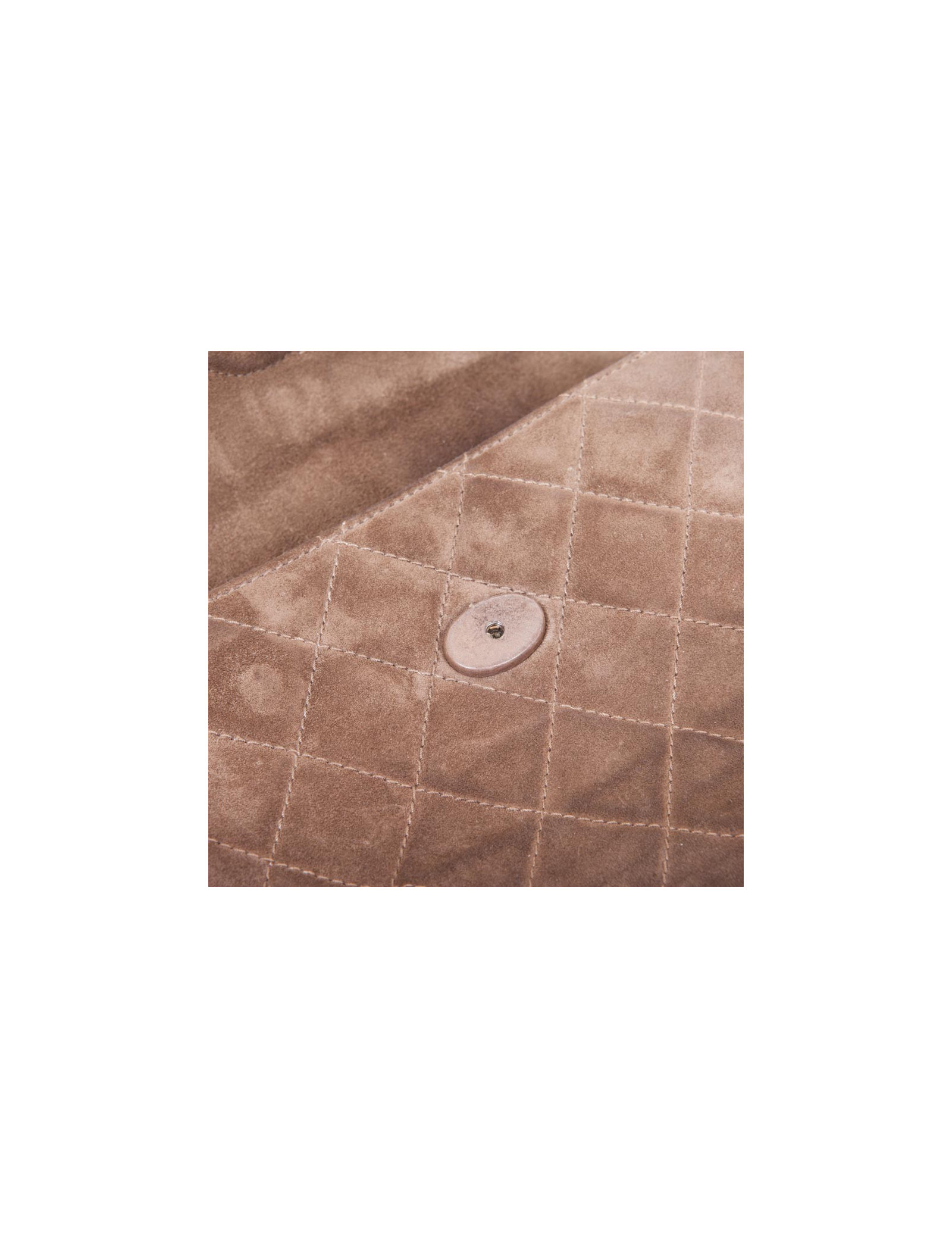 Sac vintage en veau velours taupe légèrement patiné de la Maison CHANEL. Se ferme à l'aide d'un bouton pression.