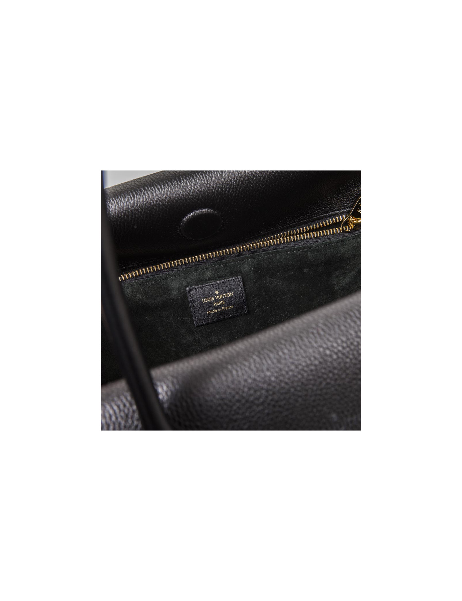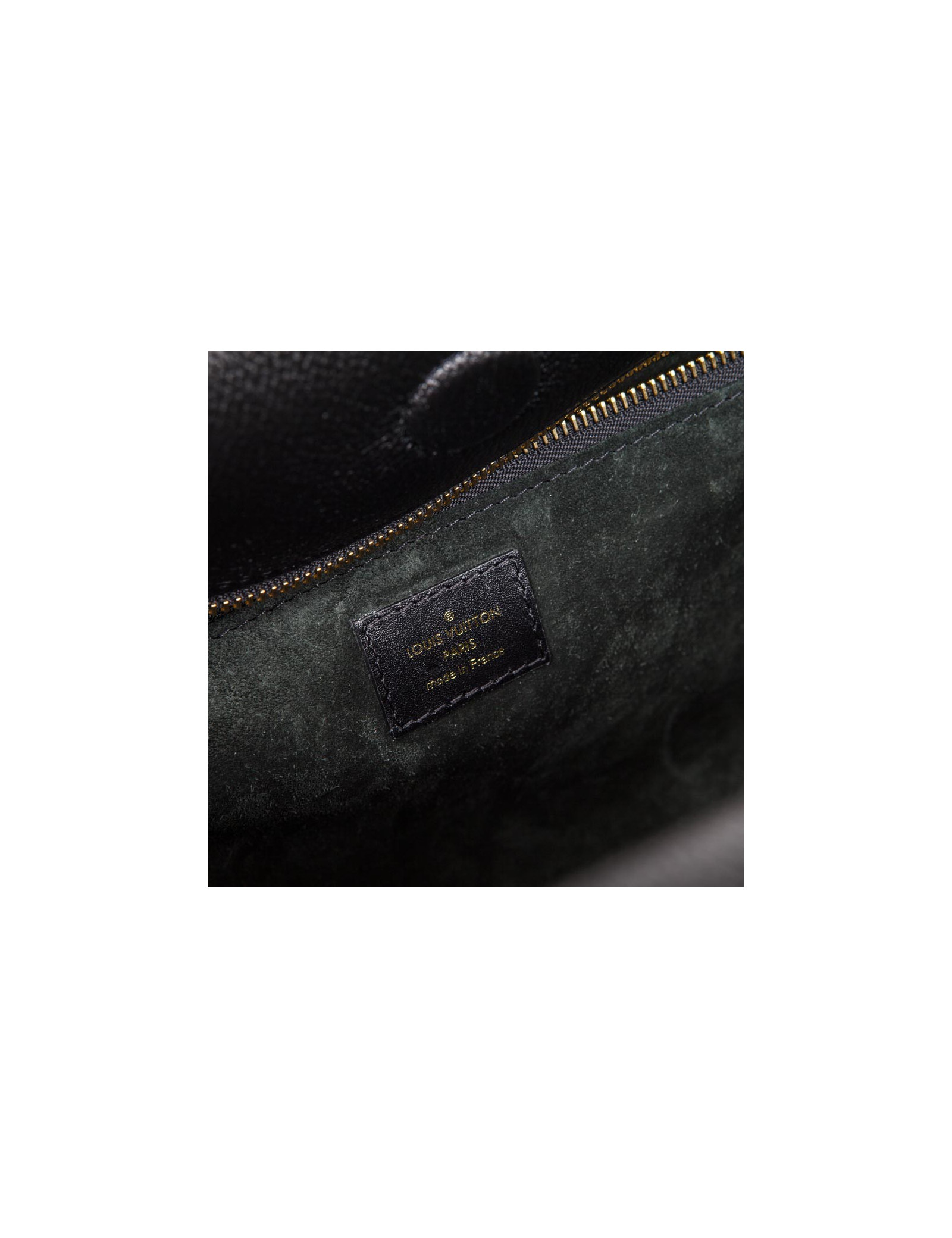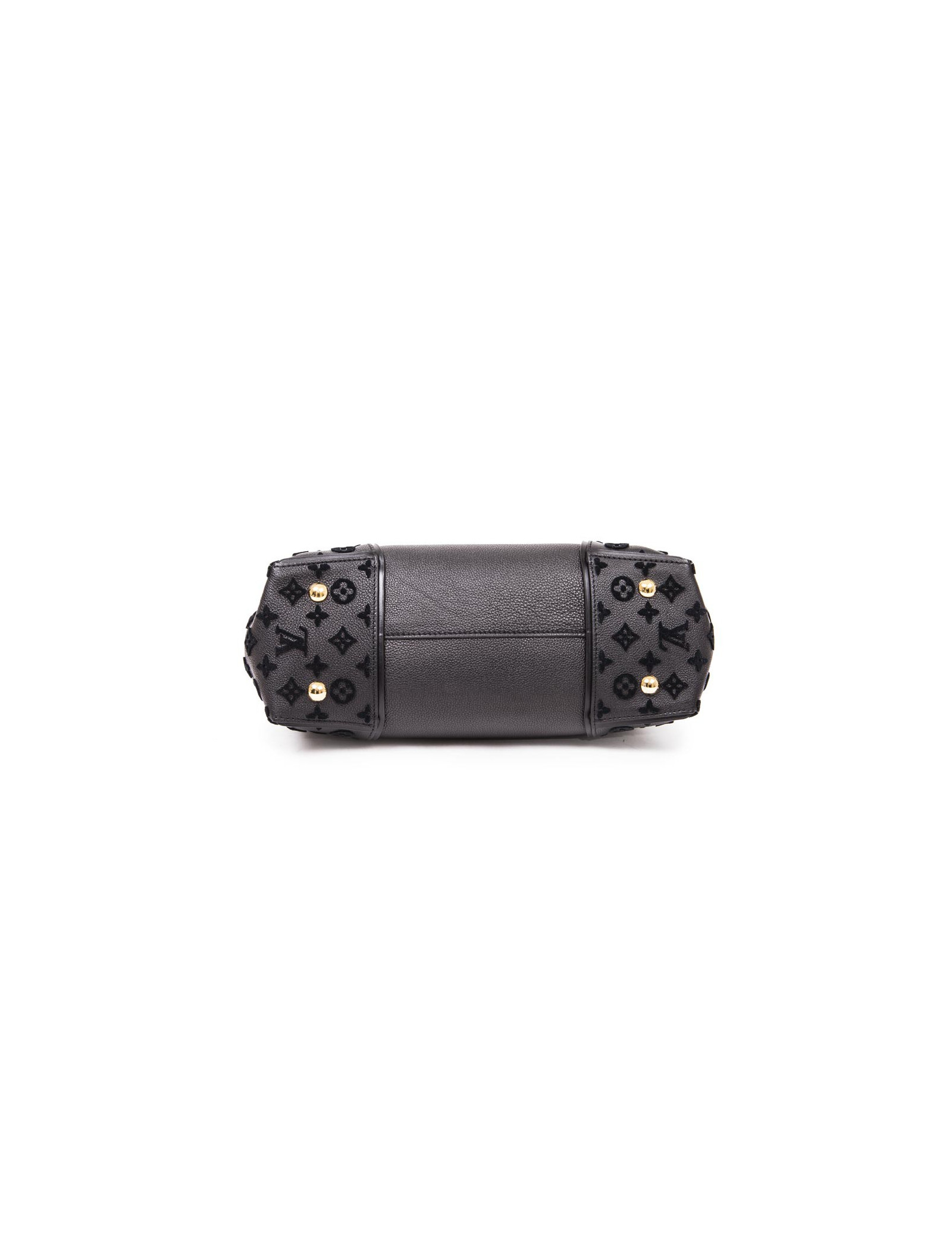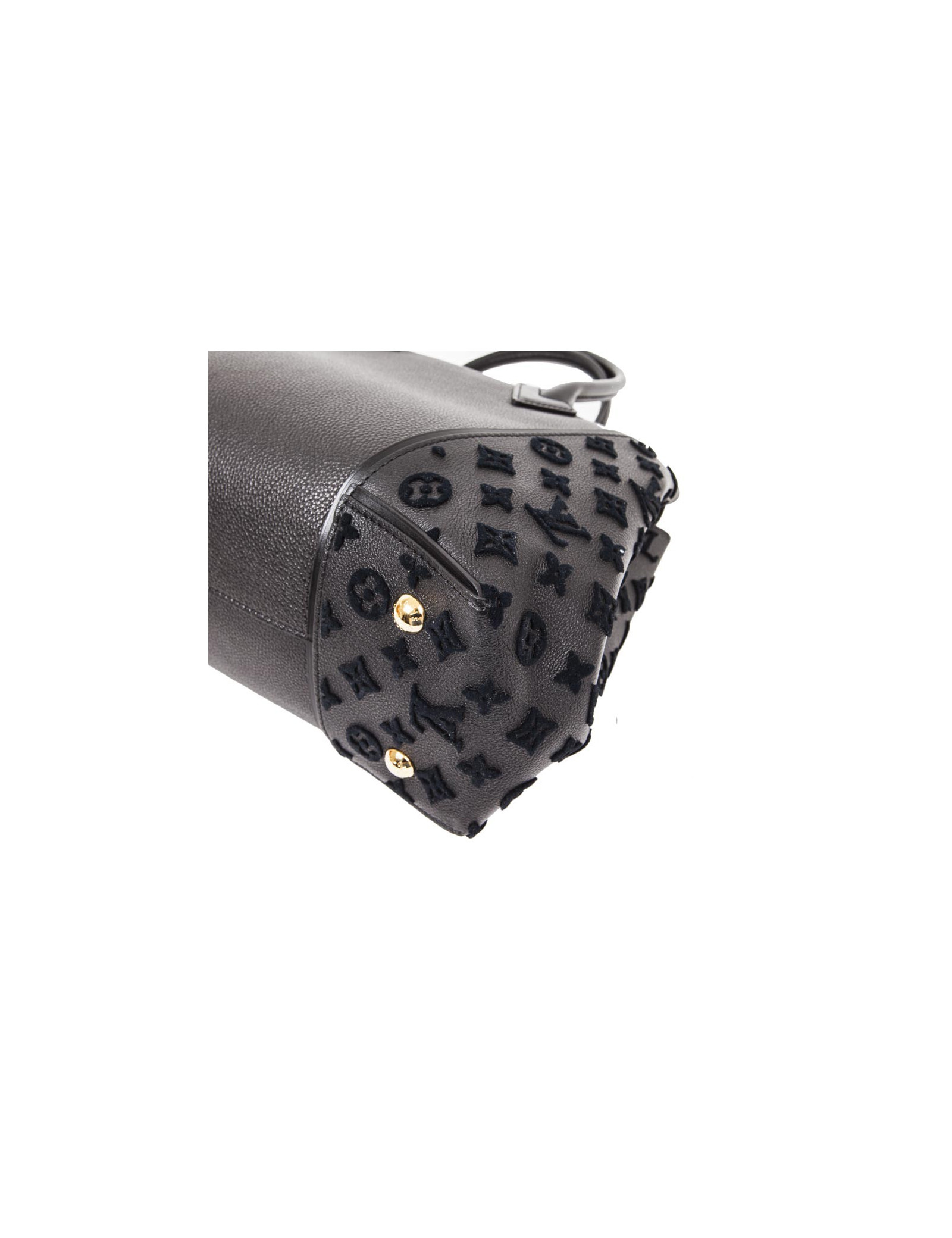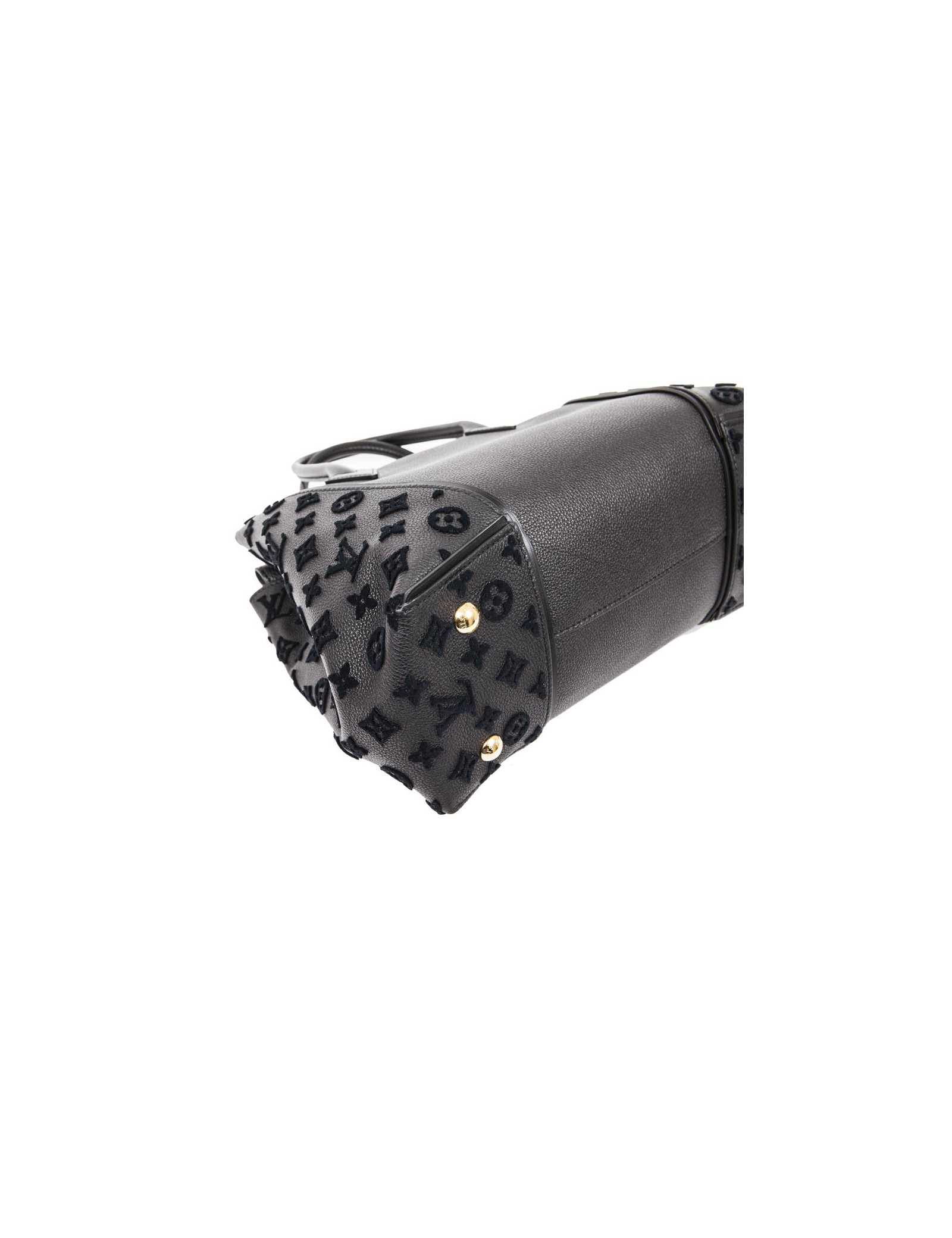 Sac "Tote W" de la maison Louis Vuitton en cuir taurillon noir et monogram en relief velours bleu nuit sur les côtés. Accastillage doré. Fermeture par mousqueton et aimant. Porté main avec deux petites anses. Intérieur en suède vert avec deux grandes poches zippées et une fente plaquée. Etat neuf.