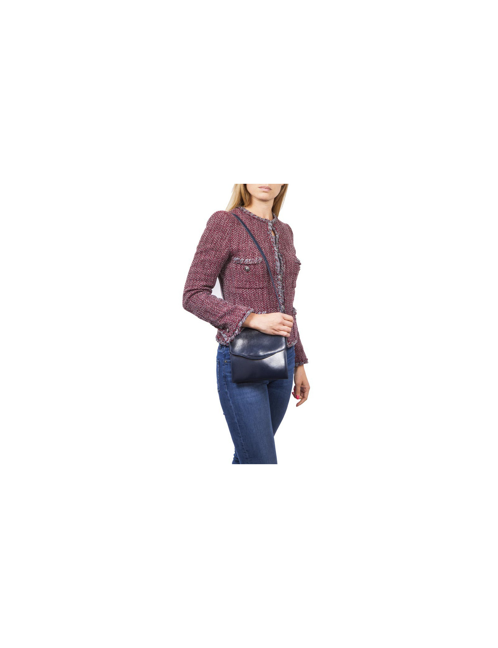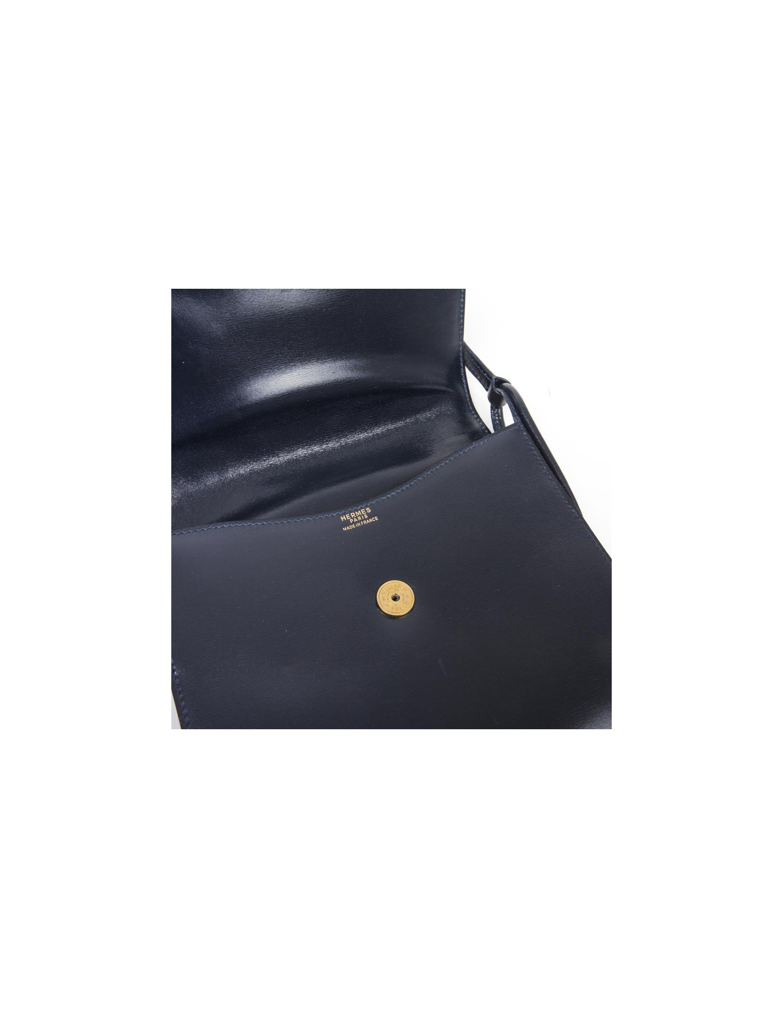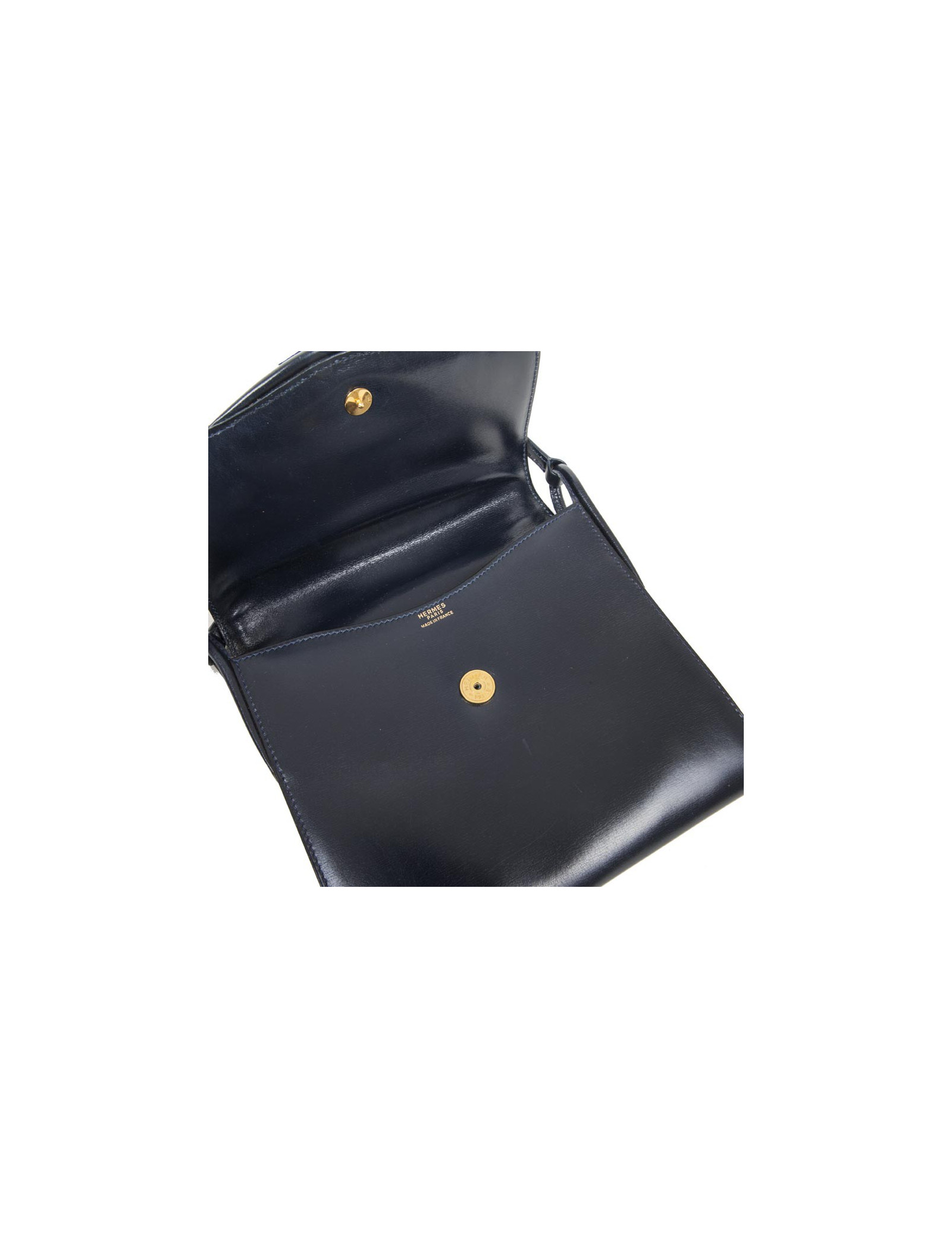 Vintage ! Pochette en cuir box bleu nuit Hermès. Fermeture par bouton pression. Porté à l'épaule ou en crossover.