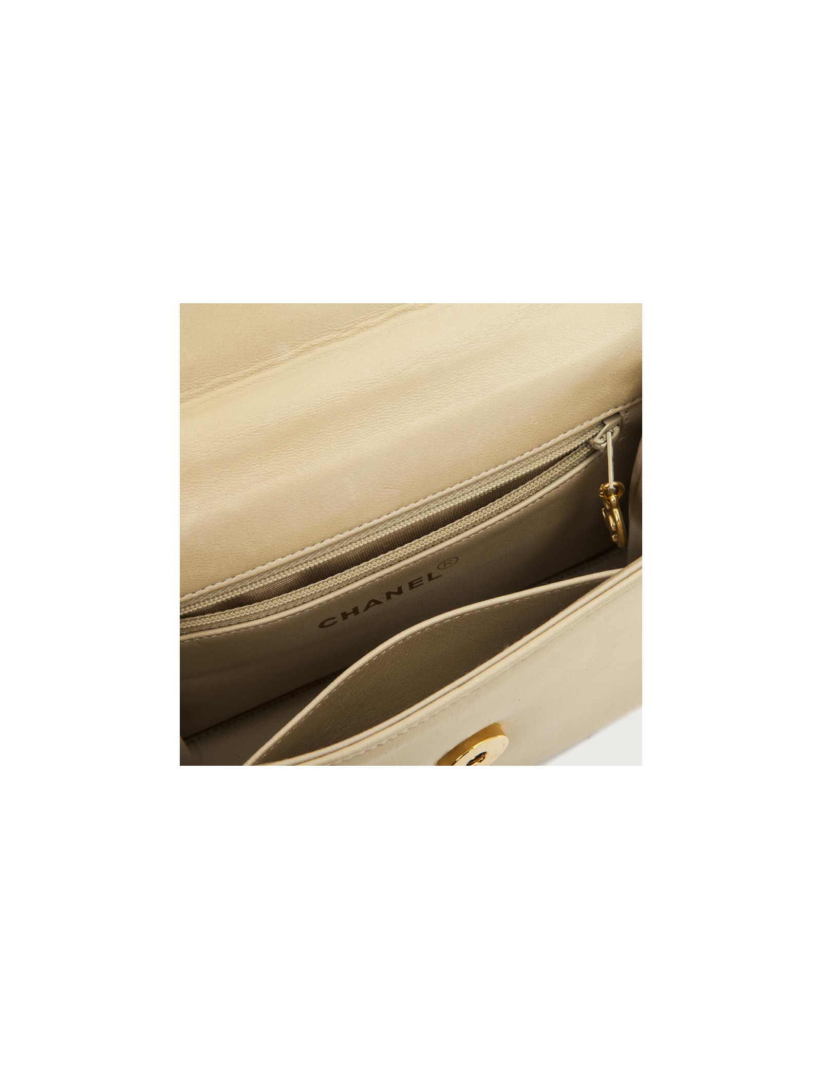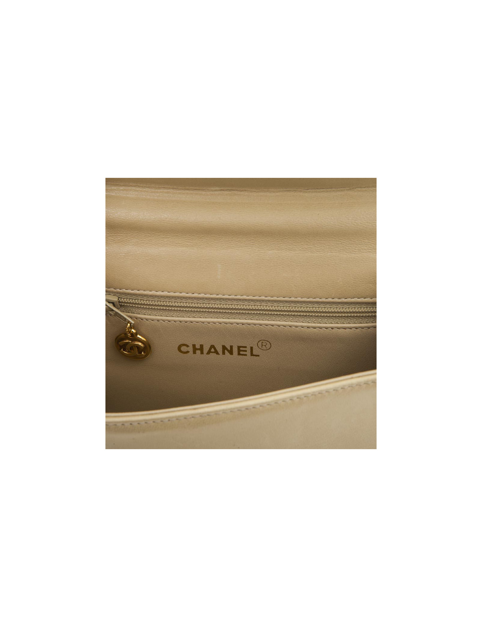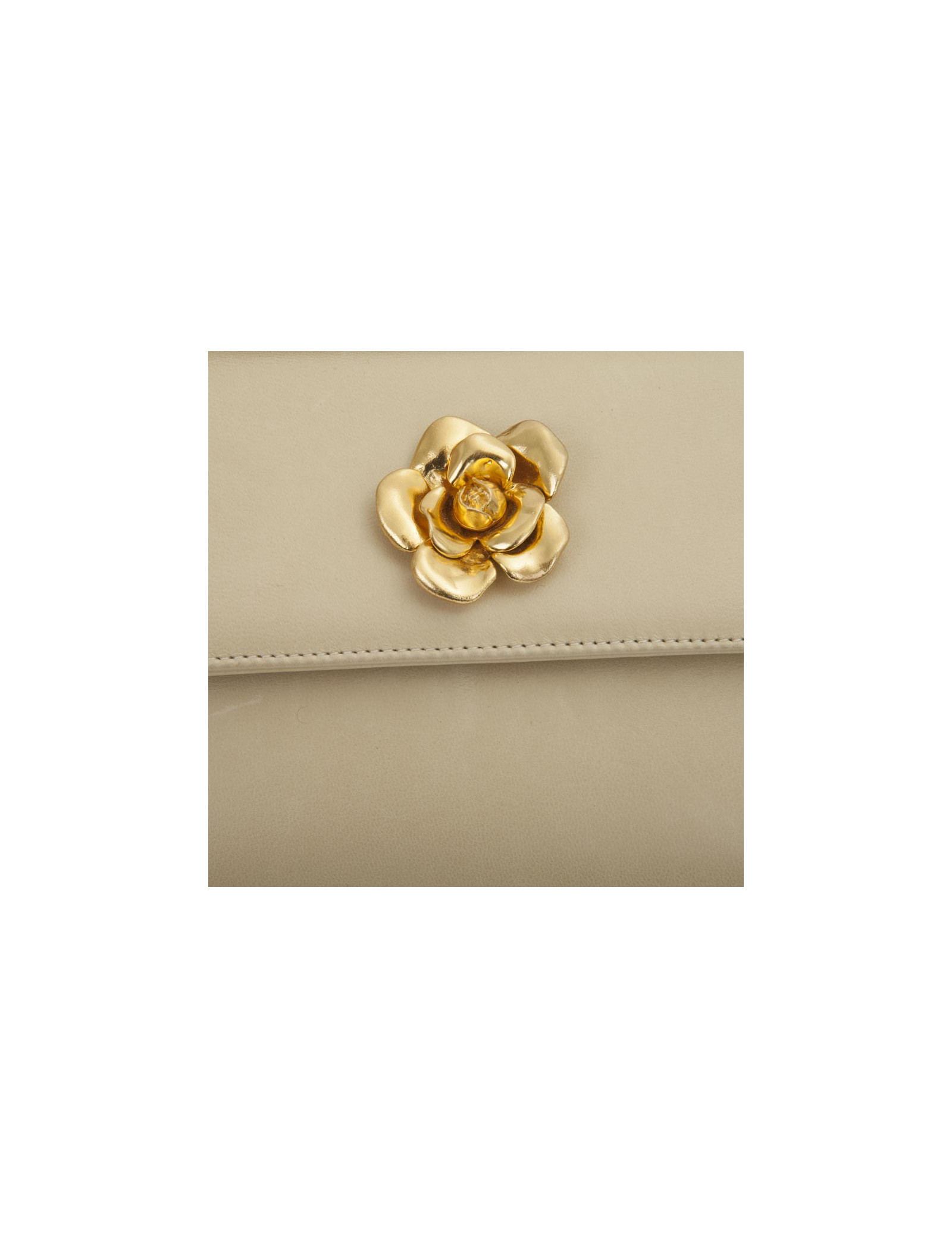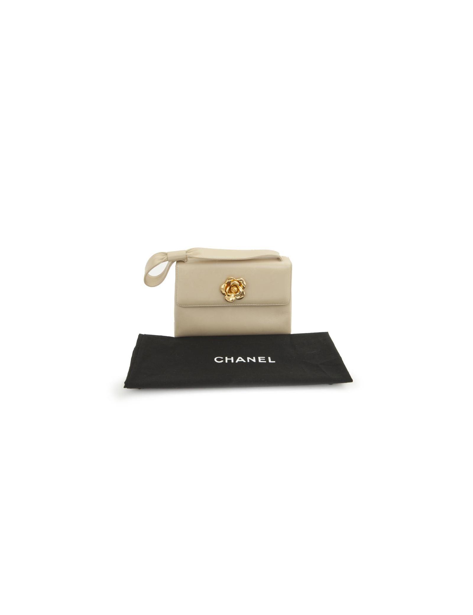 Petit sac de la maison Chanel en cuir beige. Garniture dorée. Fermeture pression avec un camélia en métal doré. Intérieur en cuir beige avec une poche zippé et une fente plaquée. Porté à la main avec la petite anse de 34 cm.