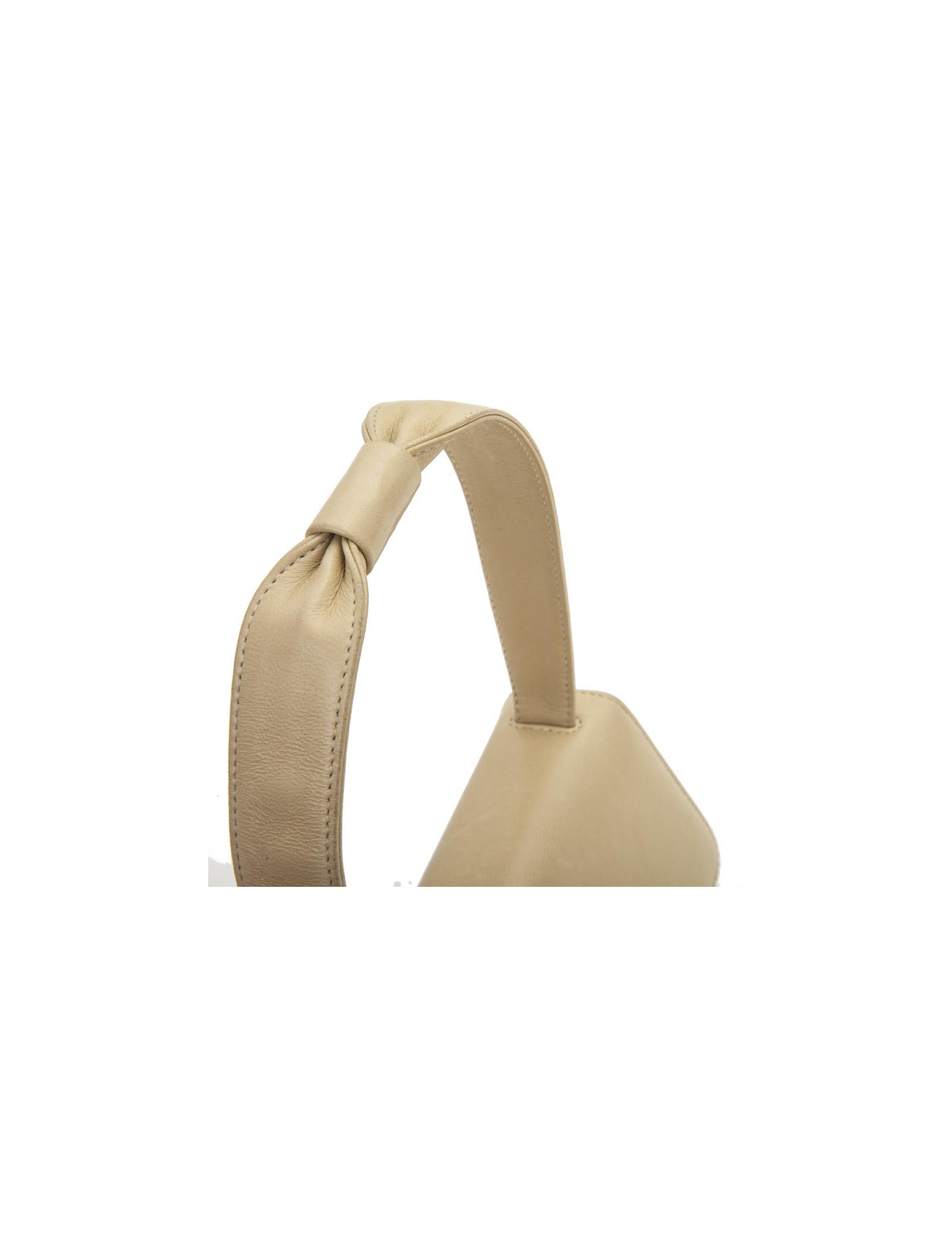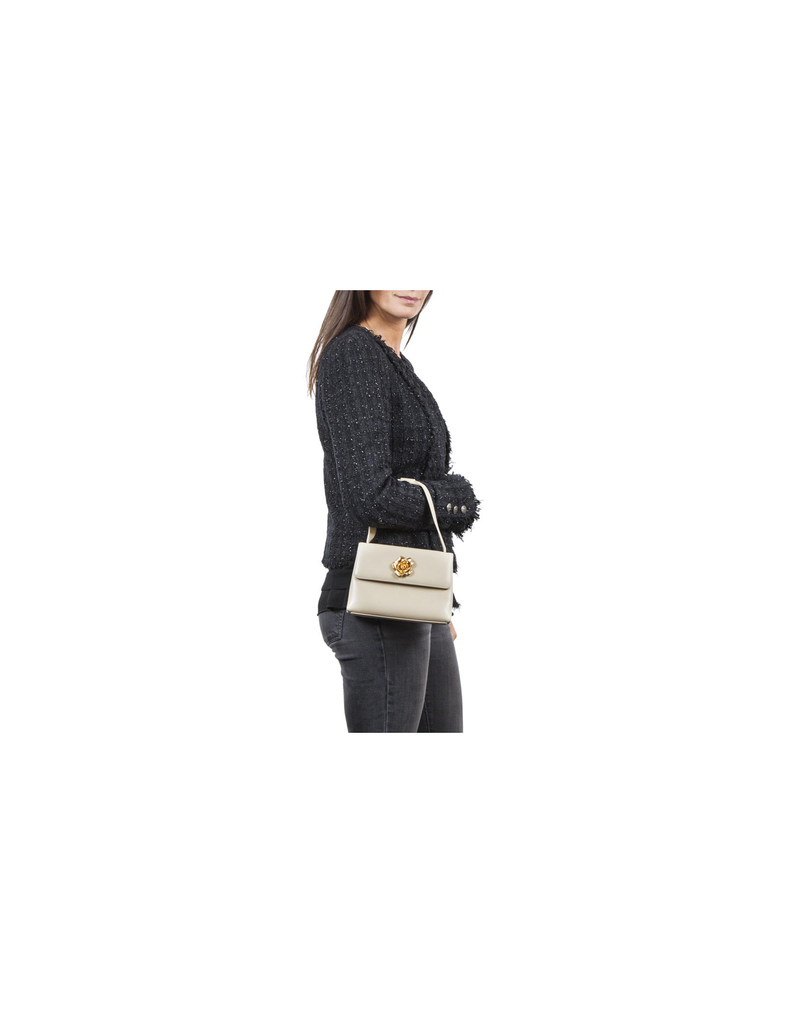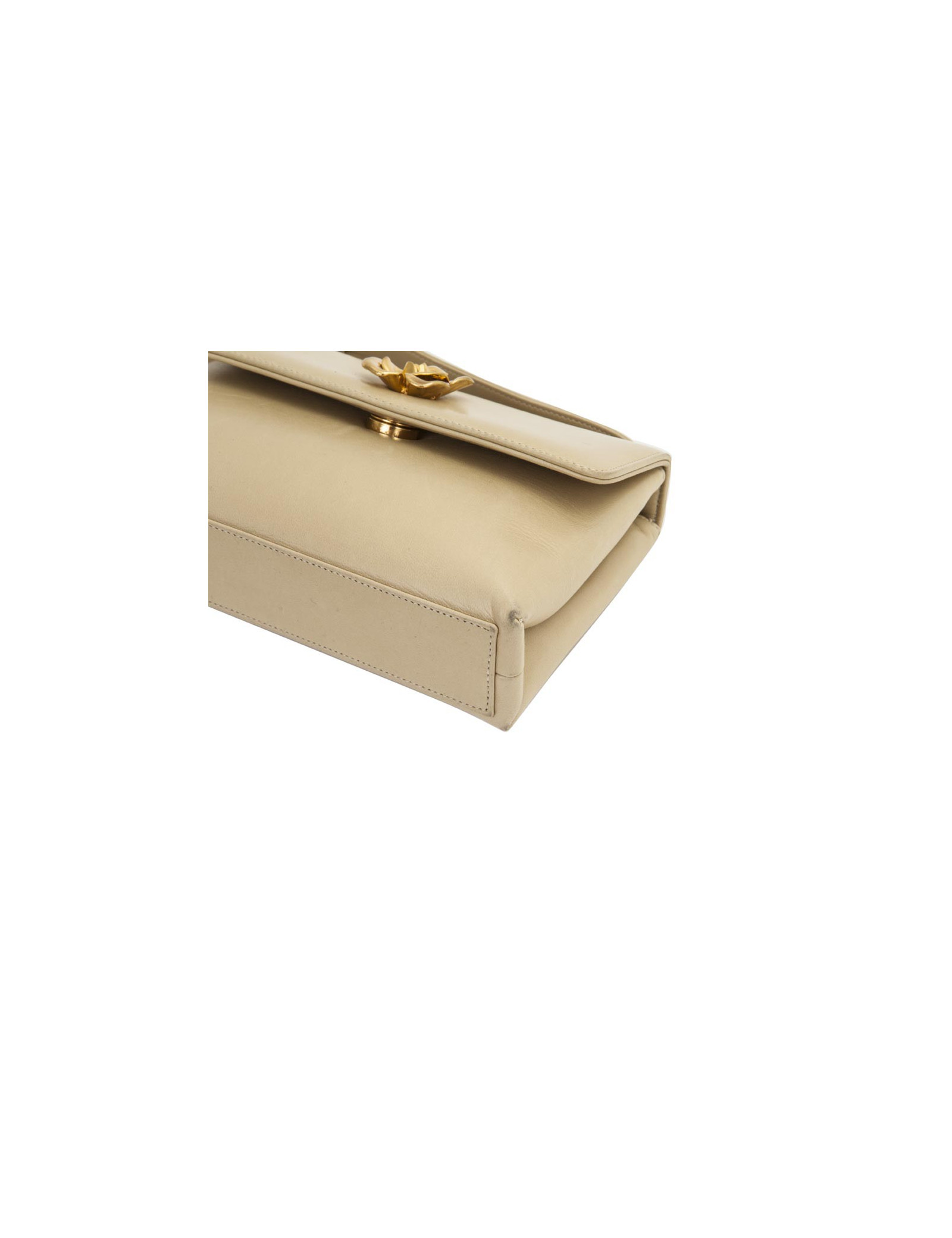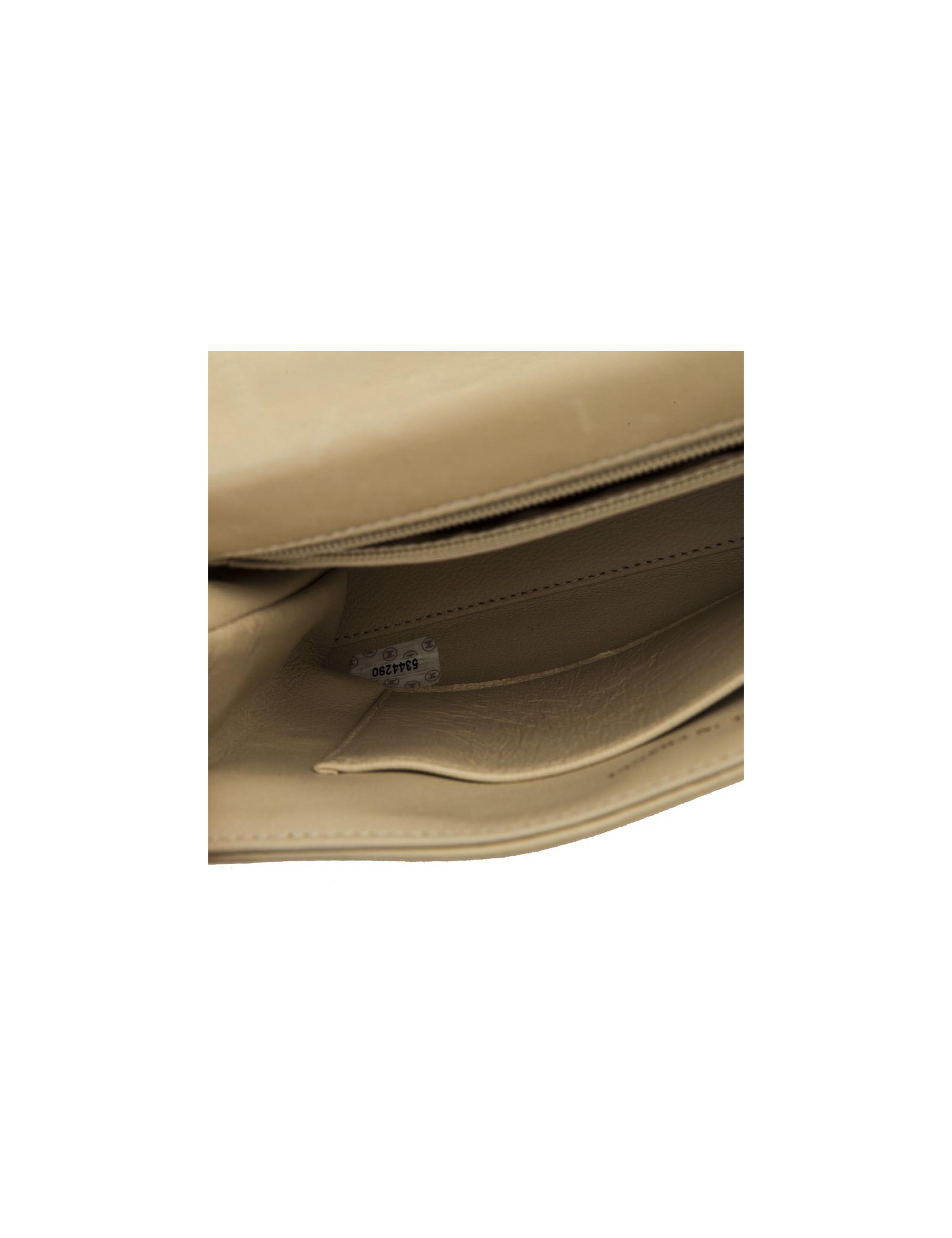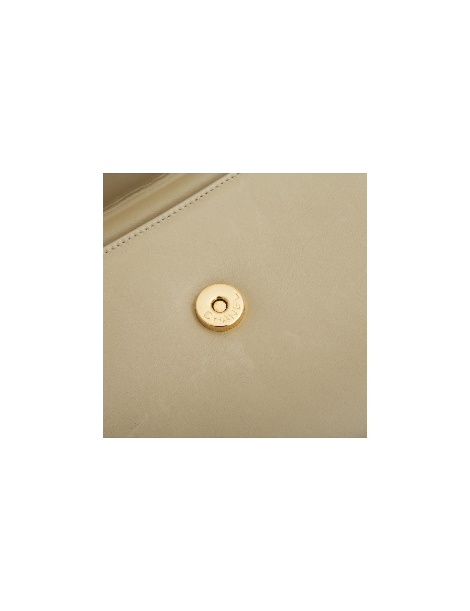 Petit sac de la maison Chanel en cuir beige. Garniture dorée. Fermeture pression avec un camélia en métal doré. Intérieur en cuir beige avec une poche zippé et une fente plaquée. Porté à la main avec la petite anse de 34 cm.