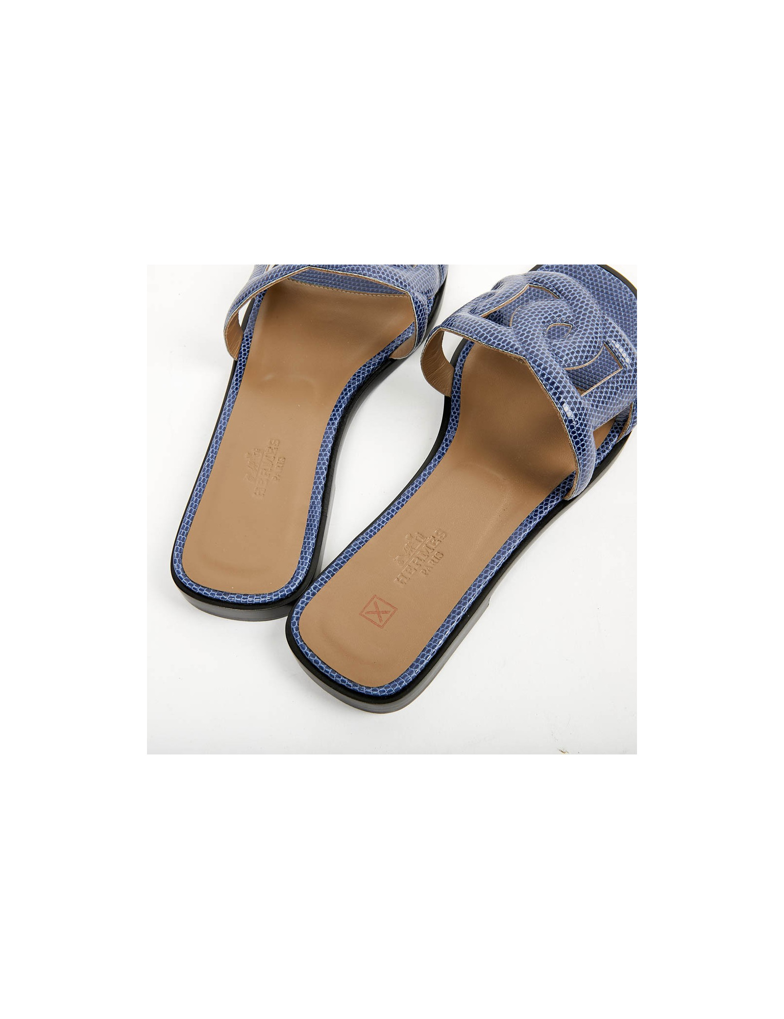 Très belle paire de sandales ouvertes HERMES modèle Omaha en lézard bleu, taille 37 fr.