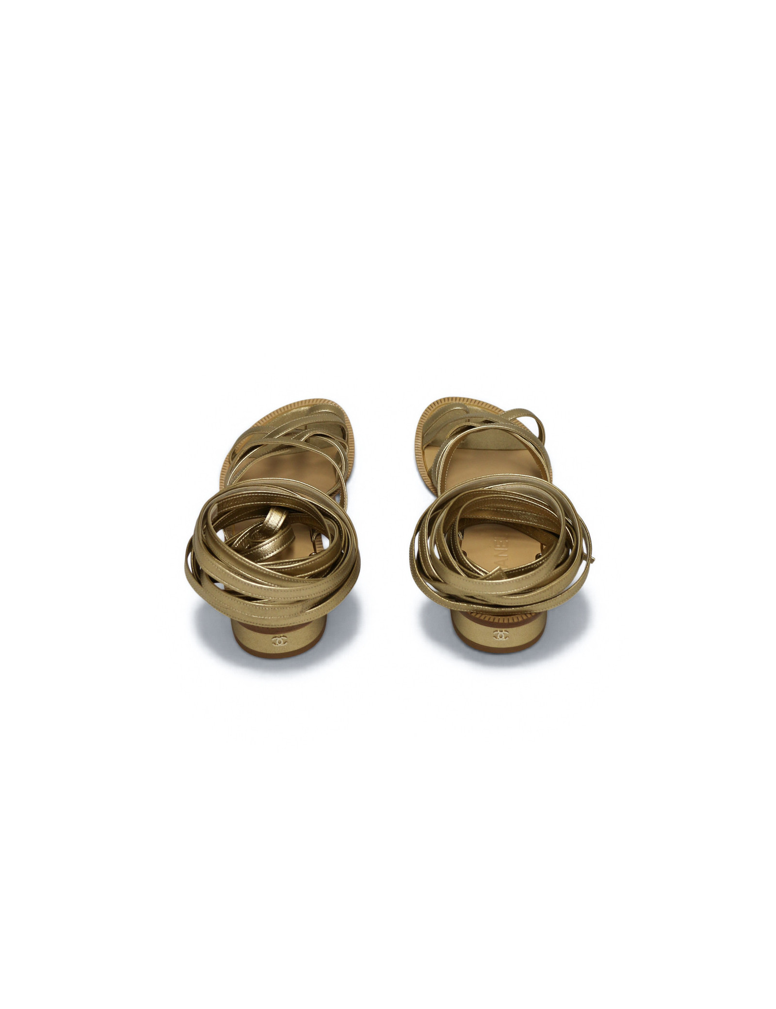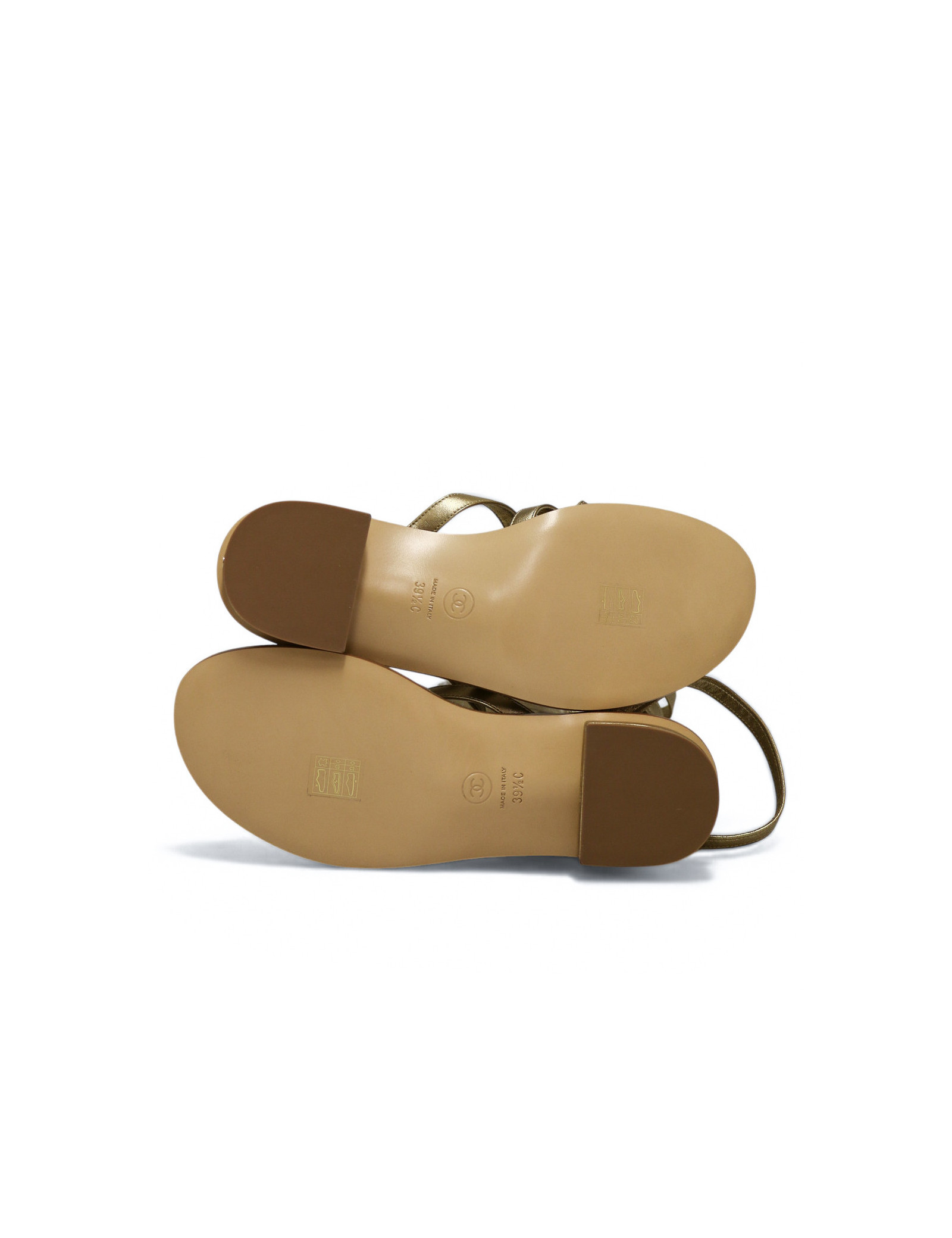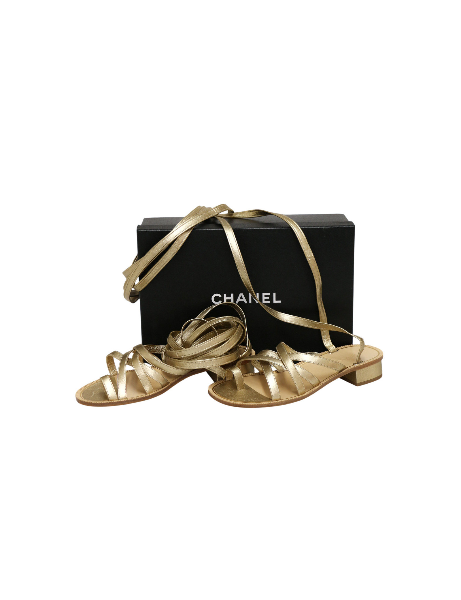 Sandales spartiates Chanel taille 39.5, élégantes réalisées en cuir doré brillant. Elles se présentent avec de fines lanières qui s’entrecroisent sur le pied et s’enroulent autour de la cheville pour un rendu à la fois moderne et raffiné.