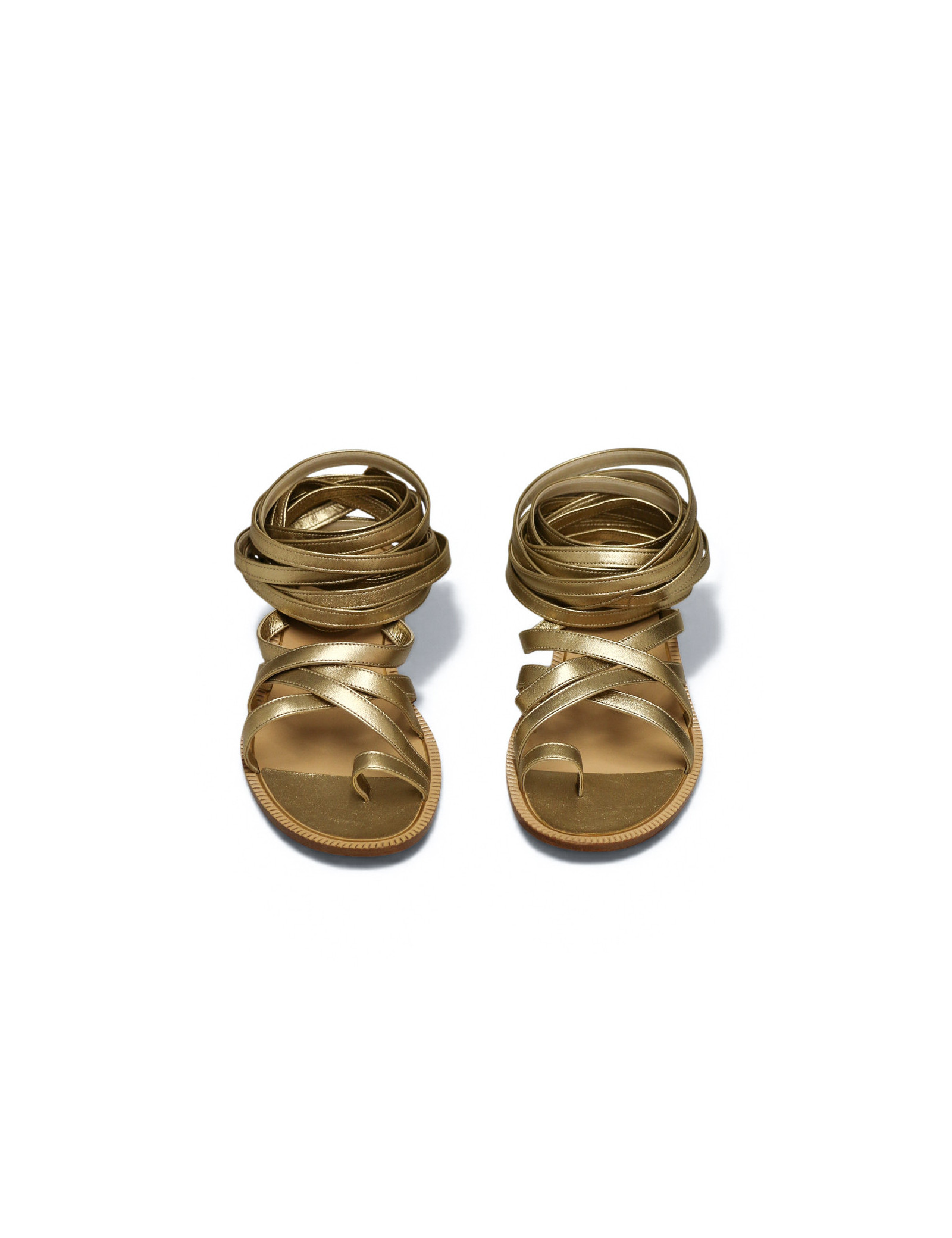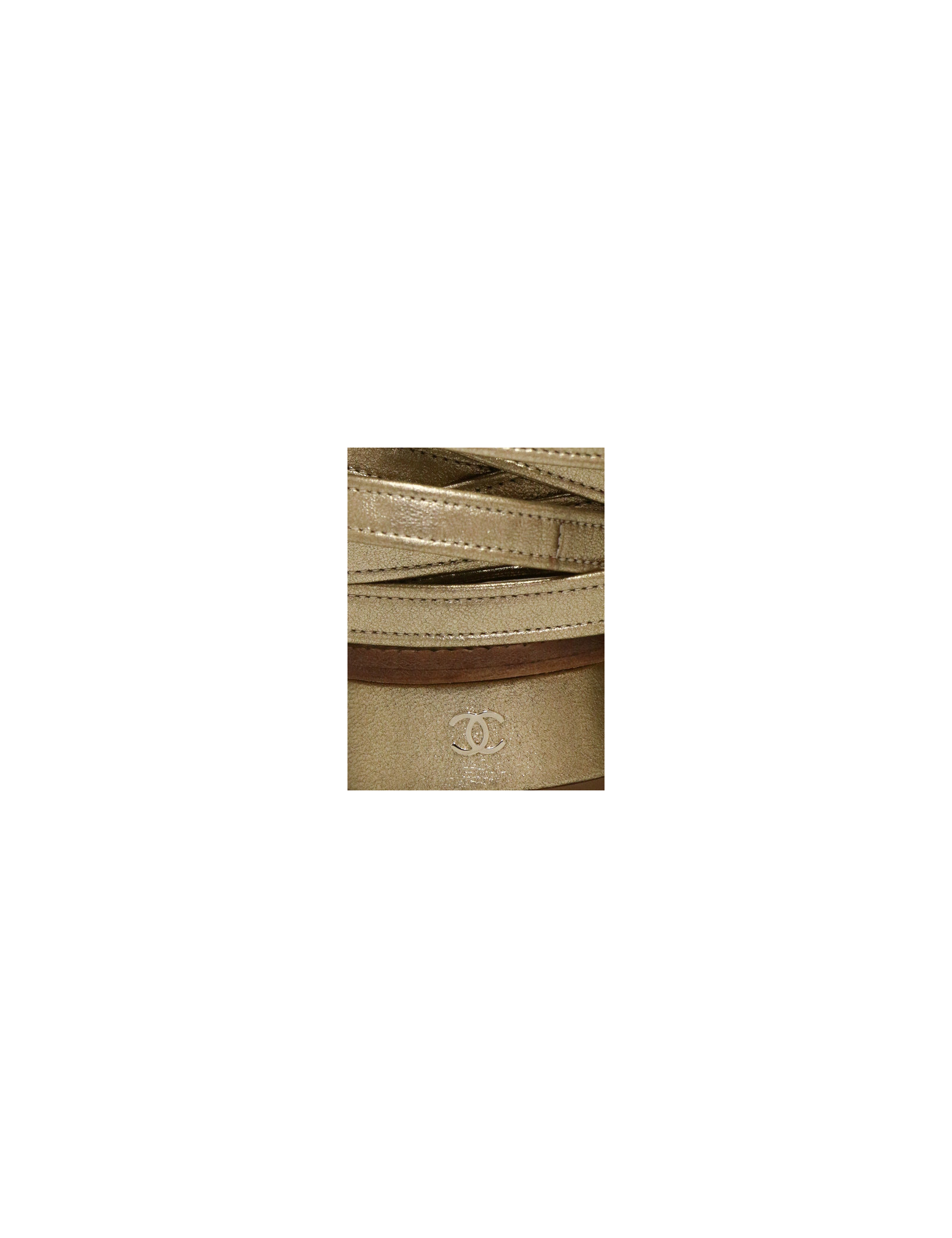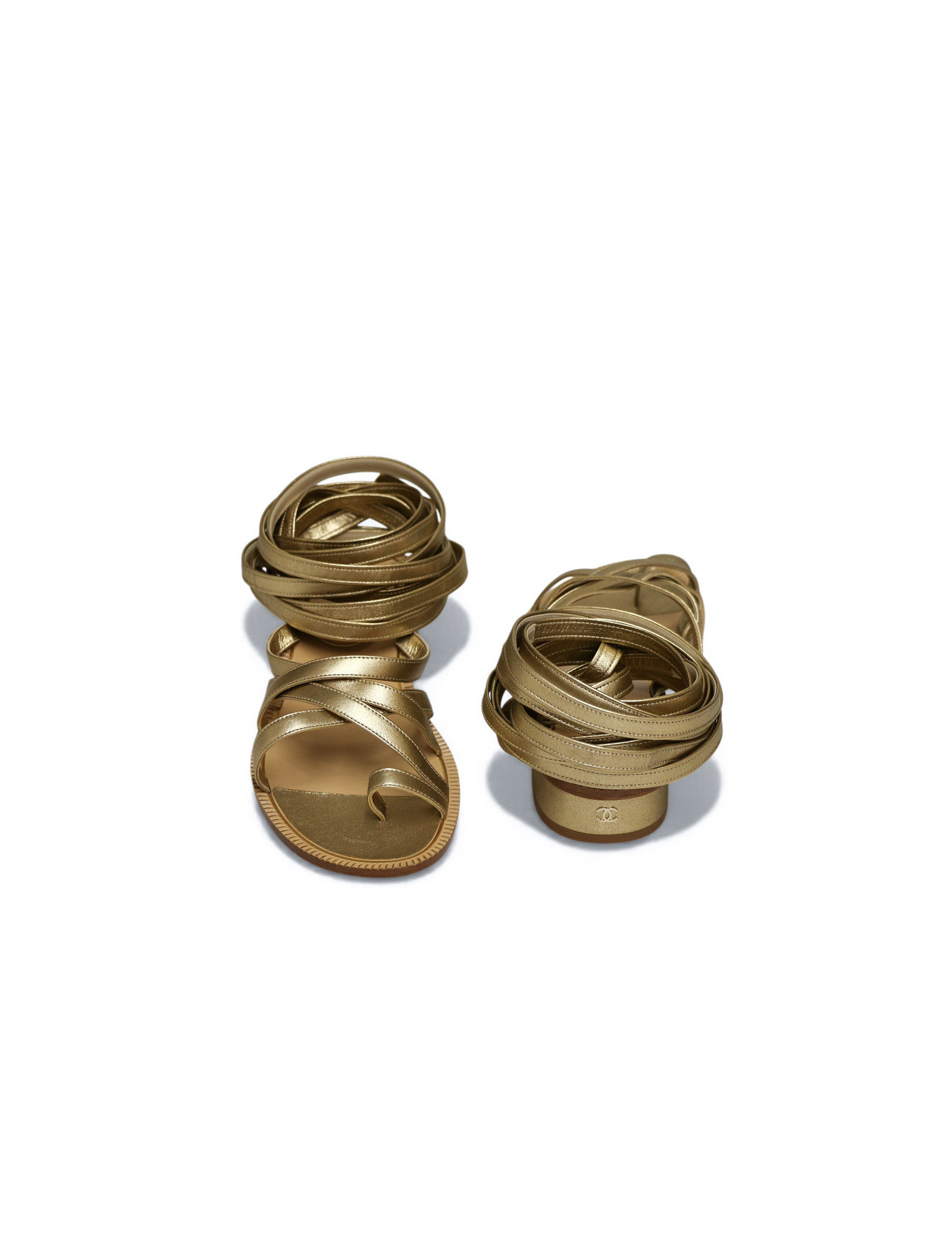 Sandales spartiates Chanel taille 39.5, élégantes réalisées en cuir doré brillant. Elles se présentent avec de fines lanières qui s’entrecroisent sur le pied et s’enroulent autour de la cheville pour un rendu à la fois moderne et raffiné.