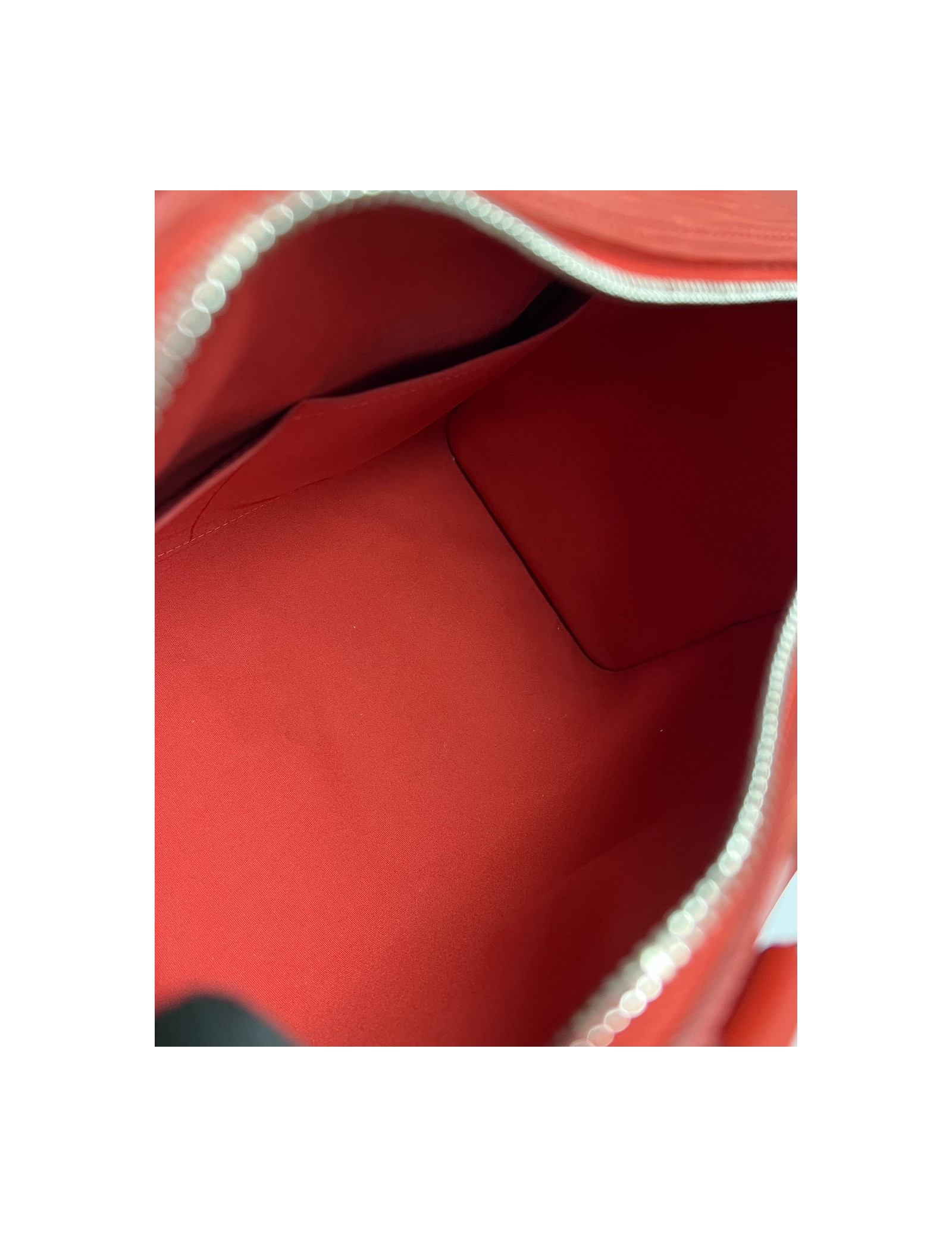 Détails : sac en cuir rouge en très bon état comme neuf, aucune usure visible sur les coins. Fermeture à glissière qui s'ouvre sur un grand espace de rangement avec deux poches plates, pas de tache sur la doublure intérieure. Il se porte à la main. Une poche plaquée sur le côté du sac. Absence du cadenas et clé.