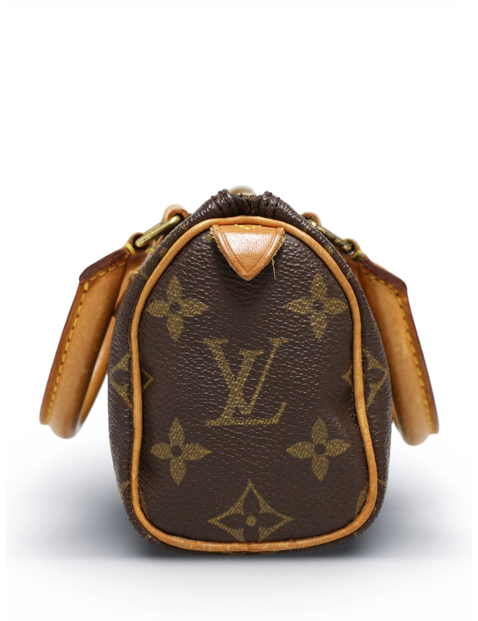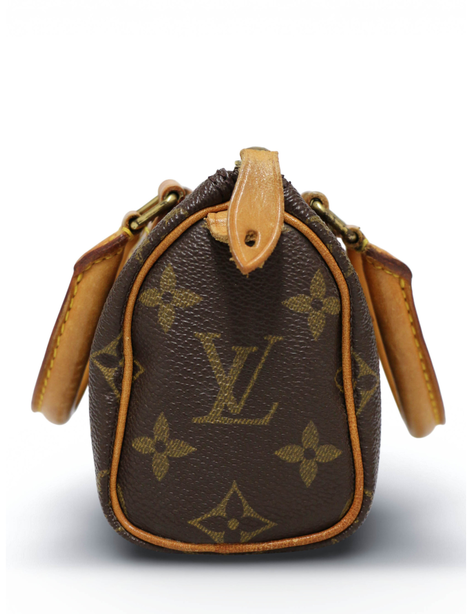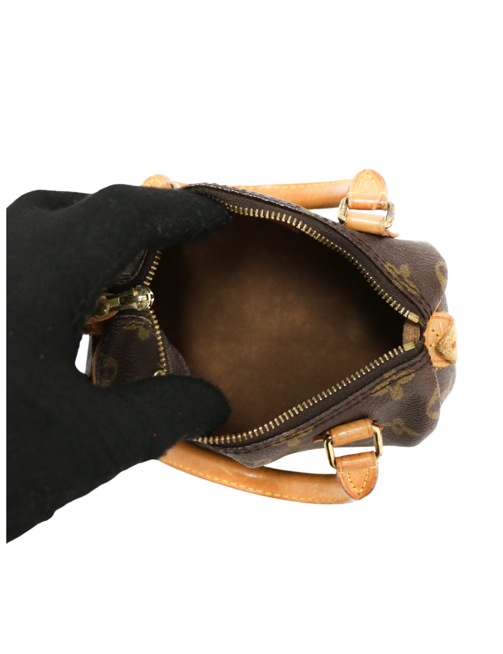 Ce sac Mini Speedy de la Maison Louis Vuitton incarne l'élégance intemporelle avec sa toile Monogram marron emblématique et ses anses en cuir de vachette naturel.
