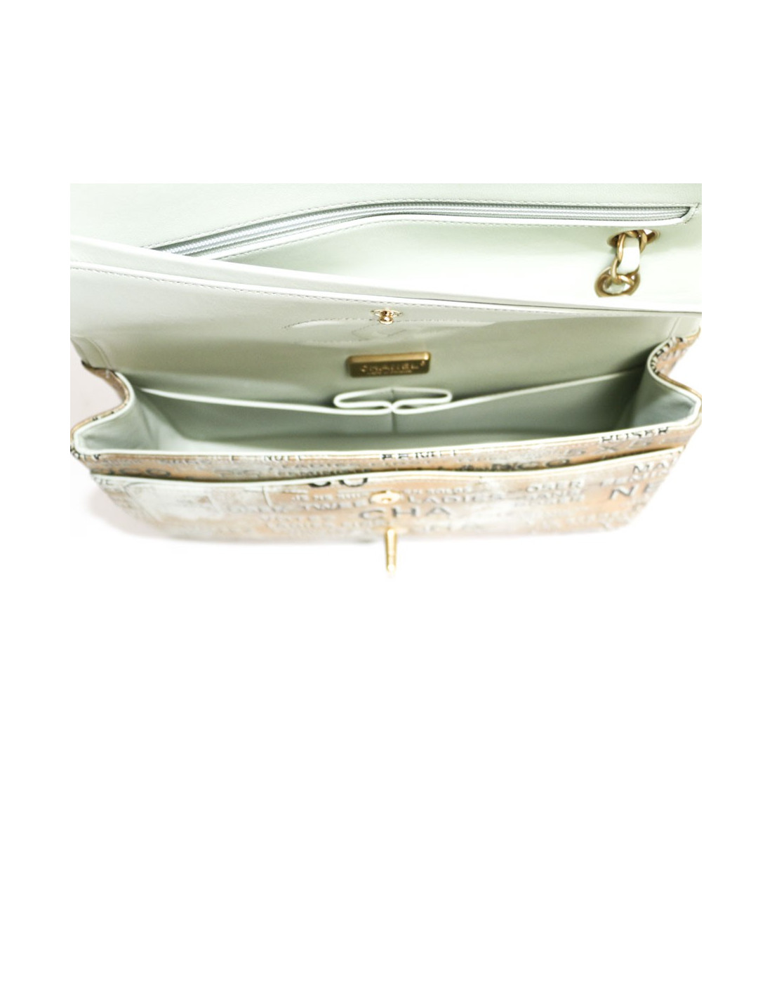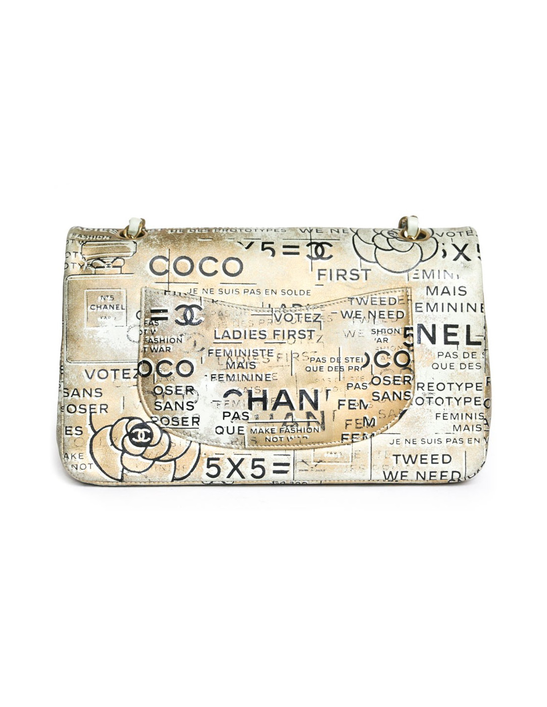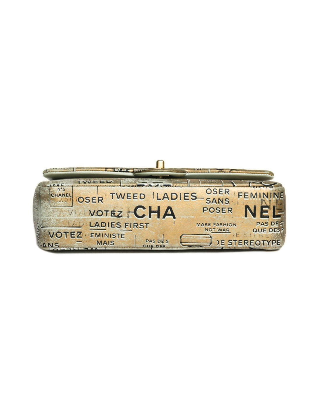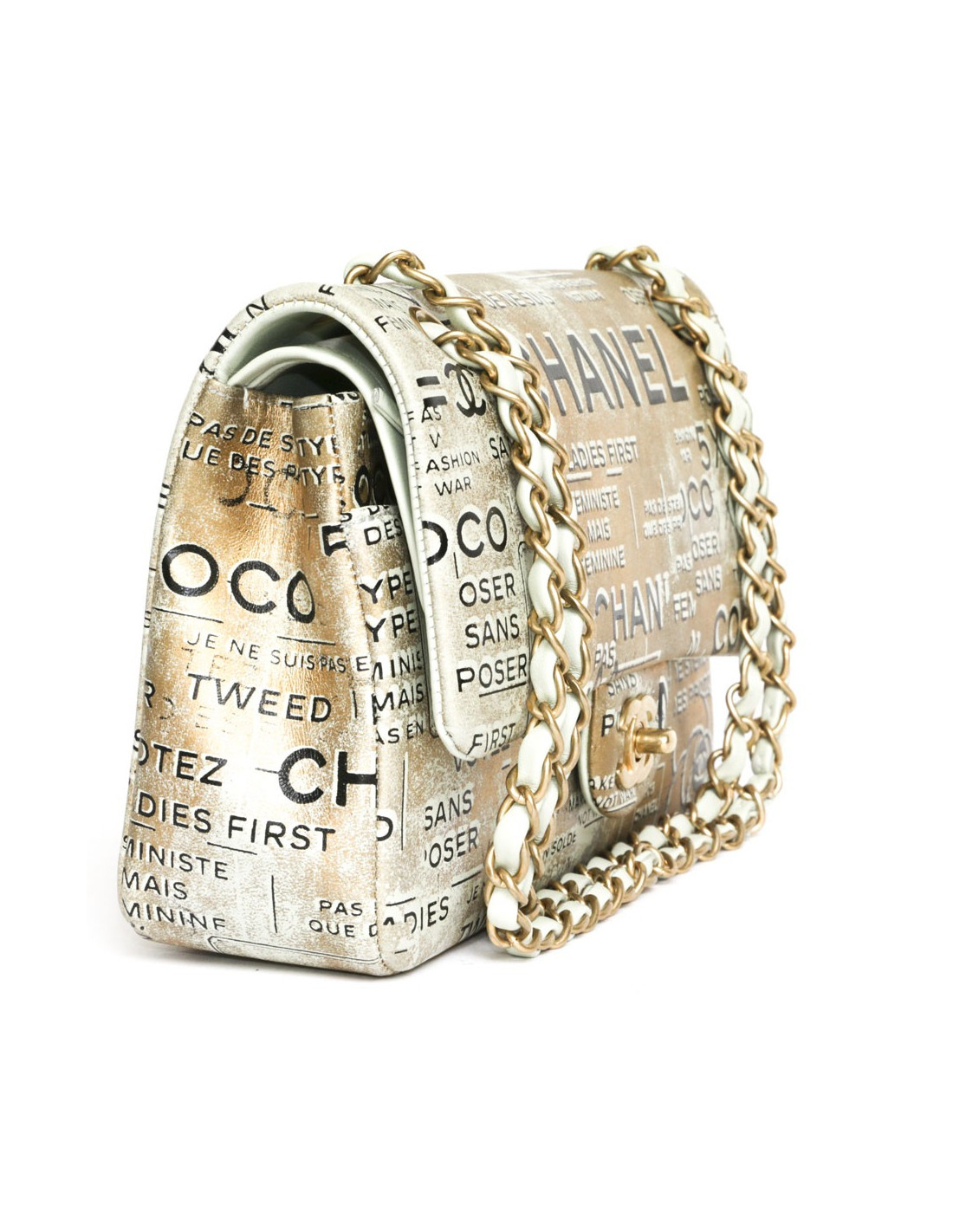 Sac d'exception ! Timeless de la Maison Chanel. Collection Coco Printemps/été  2015, édition limitée en cuir doré sur fond vert d'eau comme tagué. On peut voir des inscriptions mythiques tels que : Coco, Chanel, tweed, ladies first, féministe mais pas féminine, etc.... Bijouterie cuivrée.