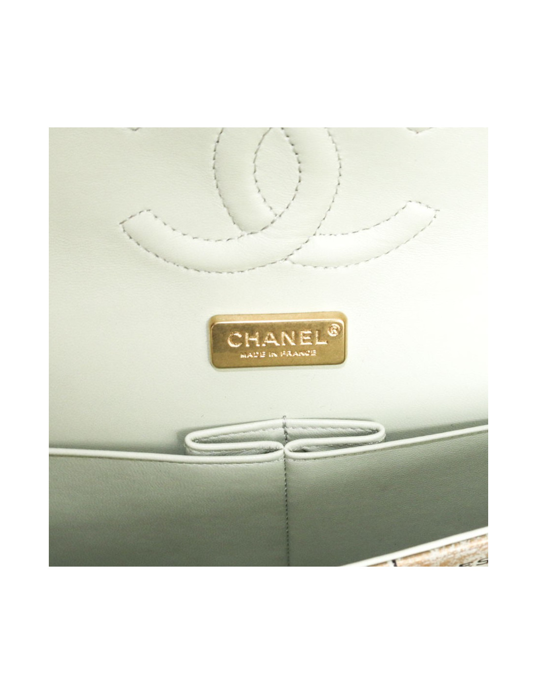 Fermoir 'CC'. Double rabat. L'intérieur est en cuir d'agneau lisse vert d'eau avec 3 poches plaquées.