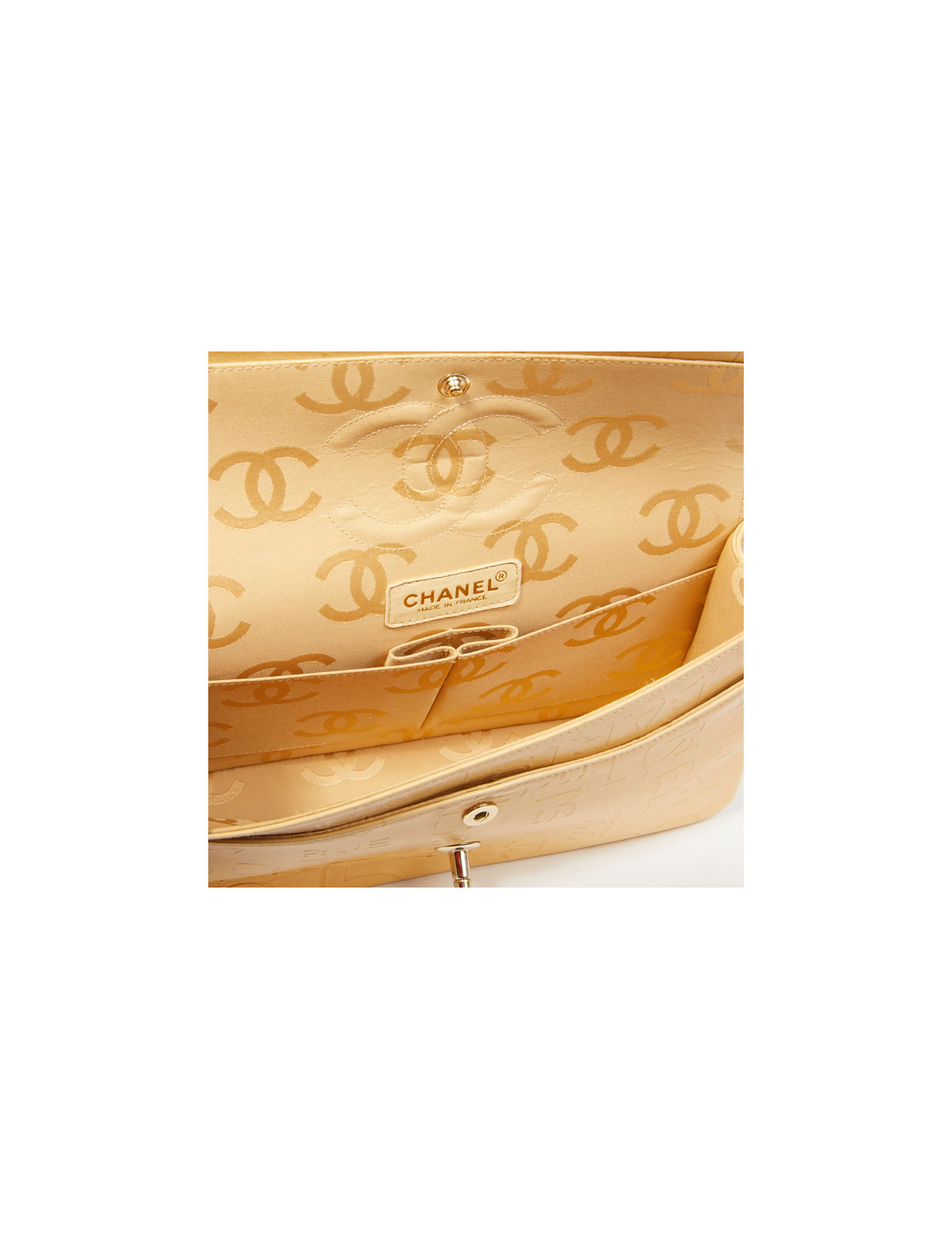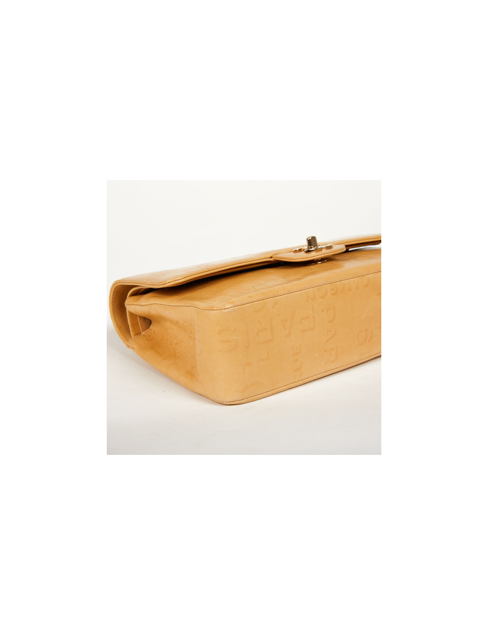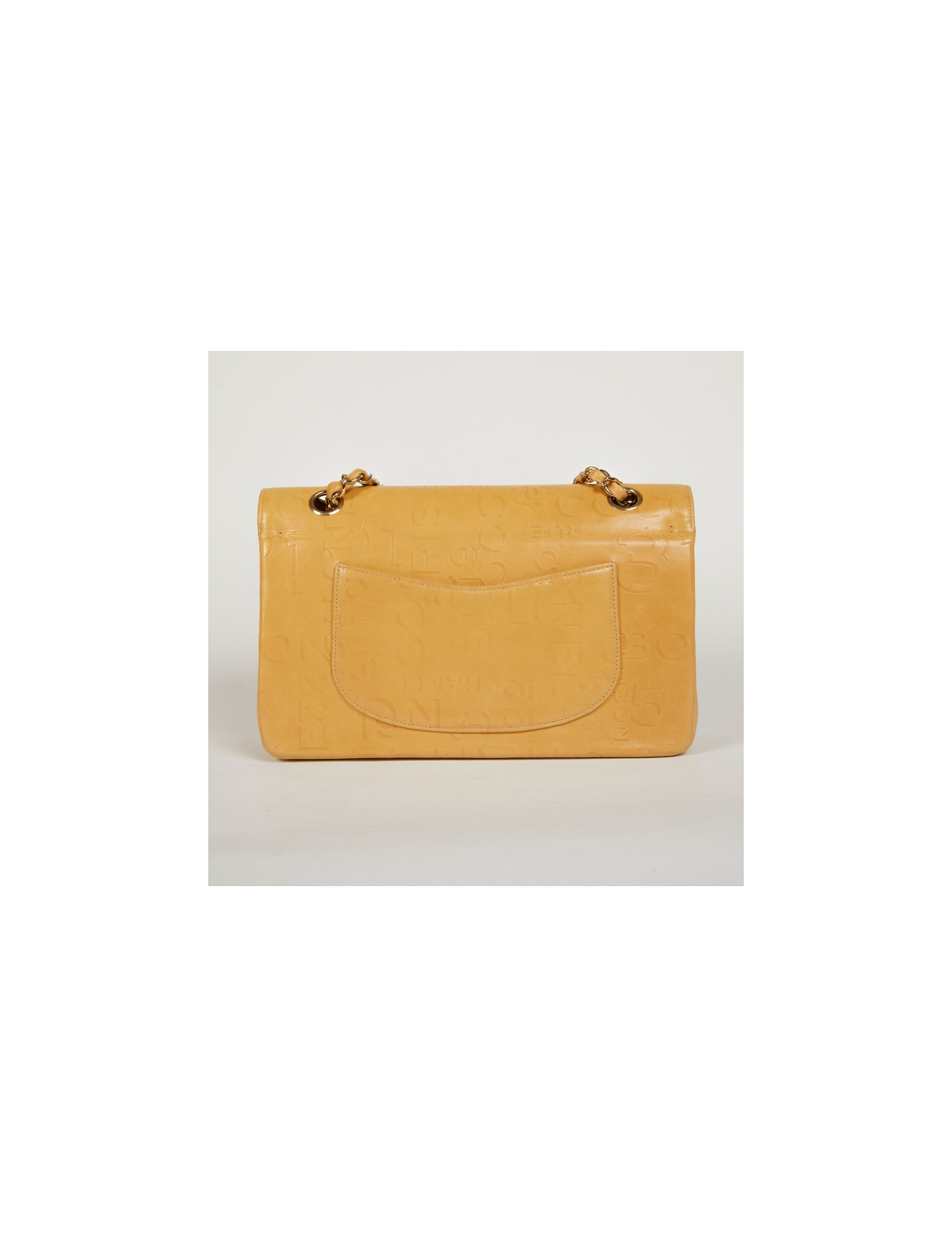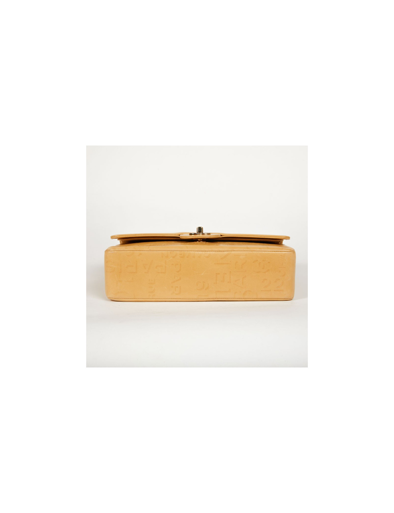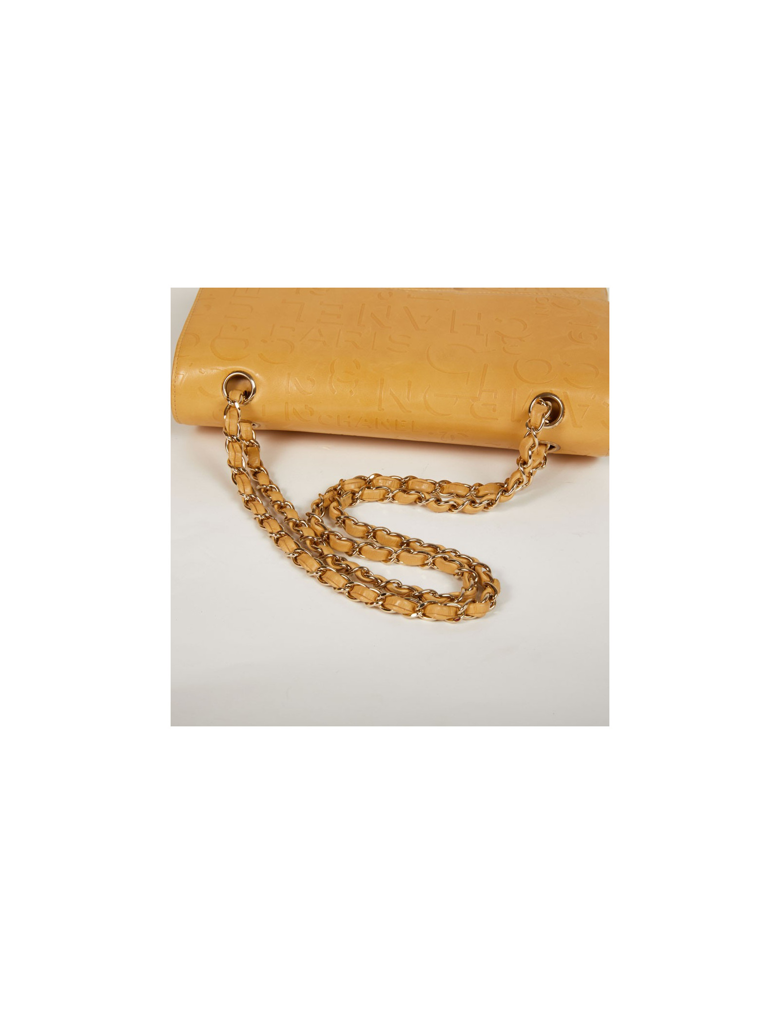 Ce sac Chanel siglé en cuir beige embossé d’inscriptions Chanel, de logo CC, rue Cambon et 5 qui représentent les signes iconiques de la célèbre Marque aux double C. L'accastillage est en métal couleur champagne. Ce sac Chanel possède un double-rabat avec bouton pression, une grande poche zippée dans le rabat. La doublure intérieure de ce sac est en tissu monogrammé.