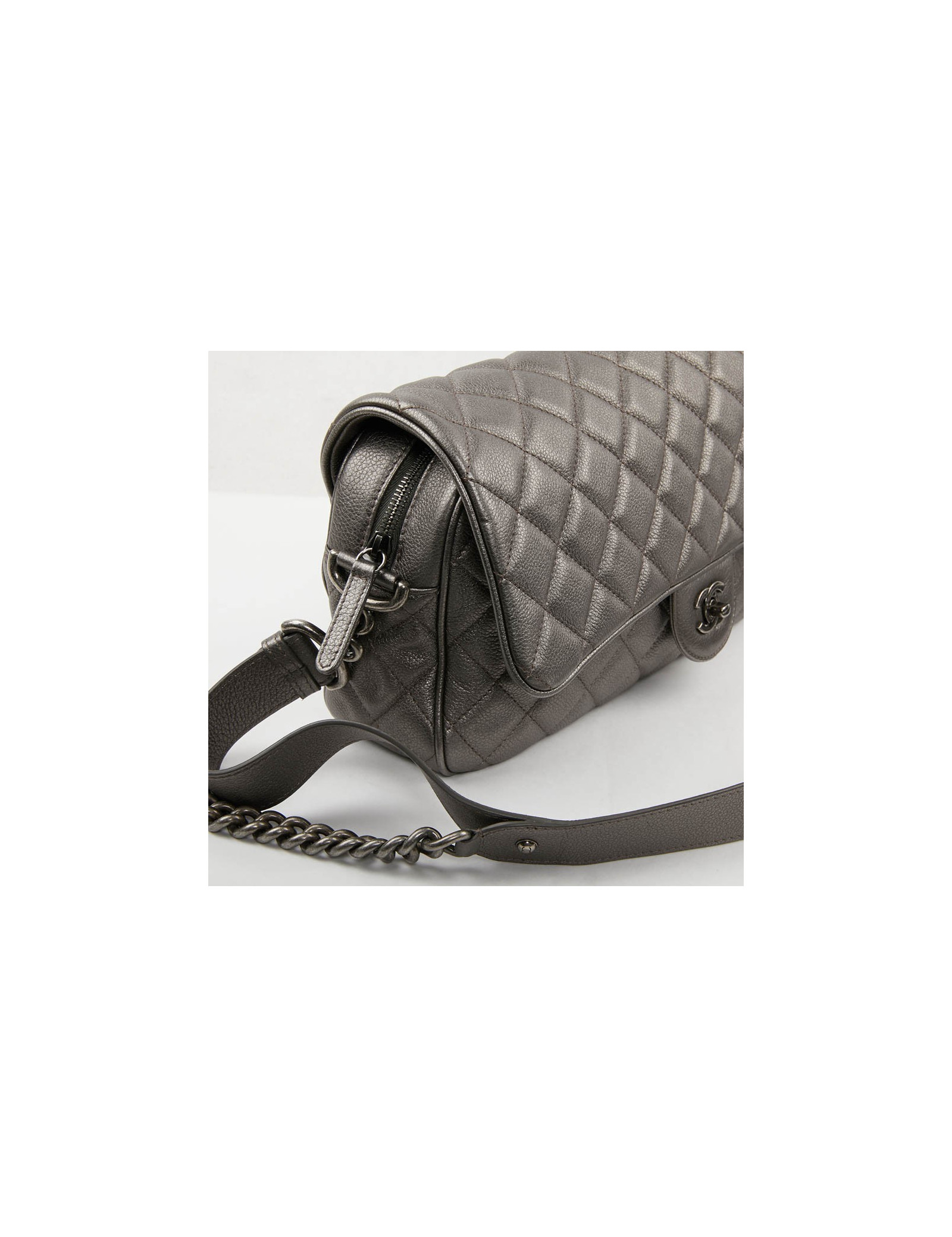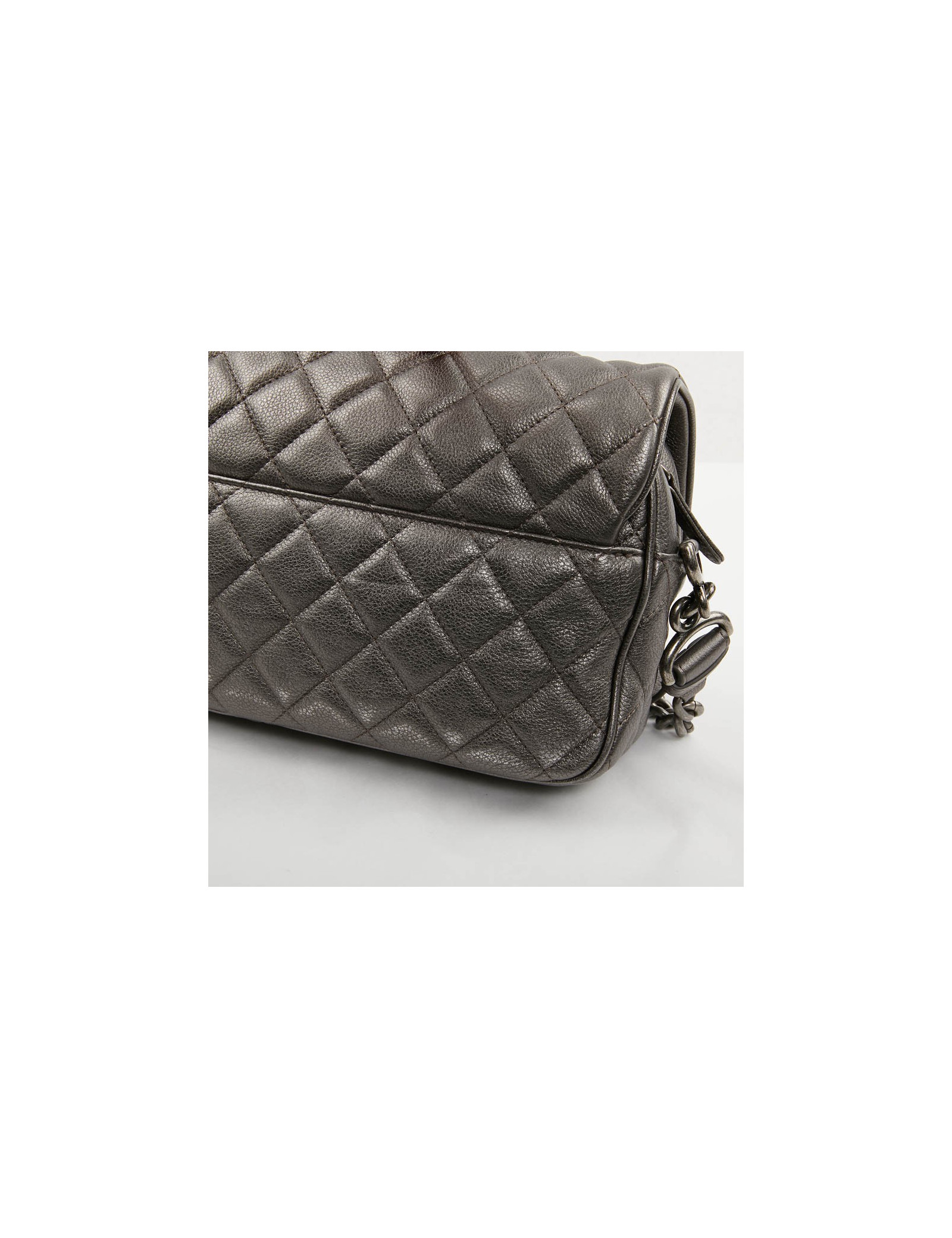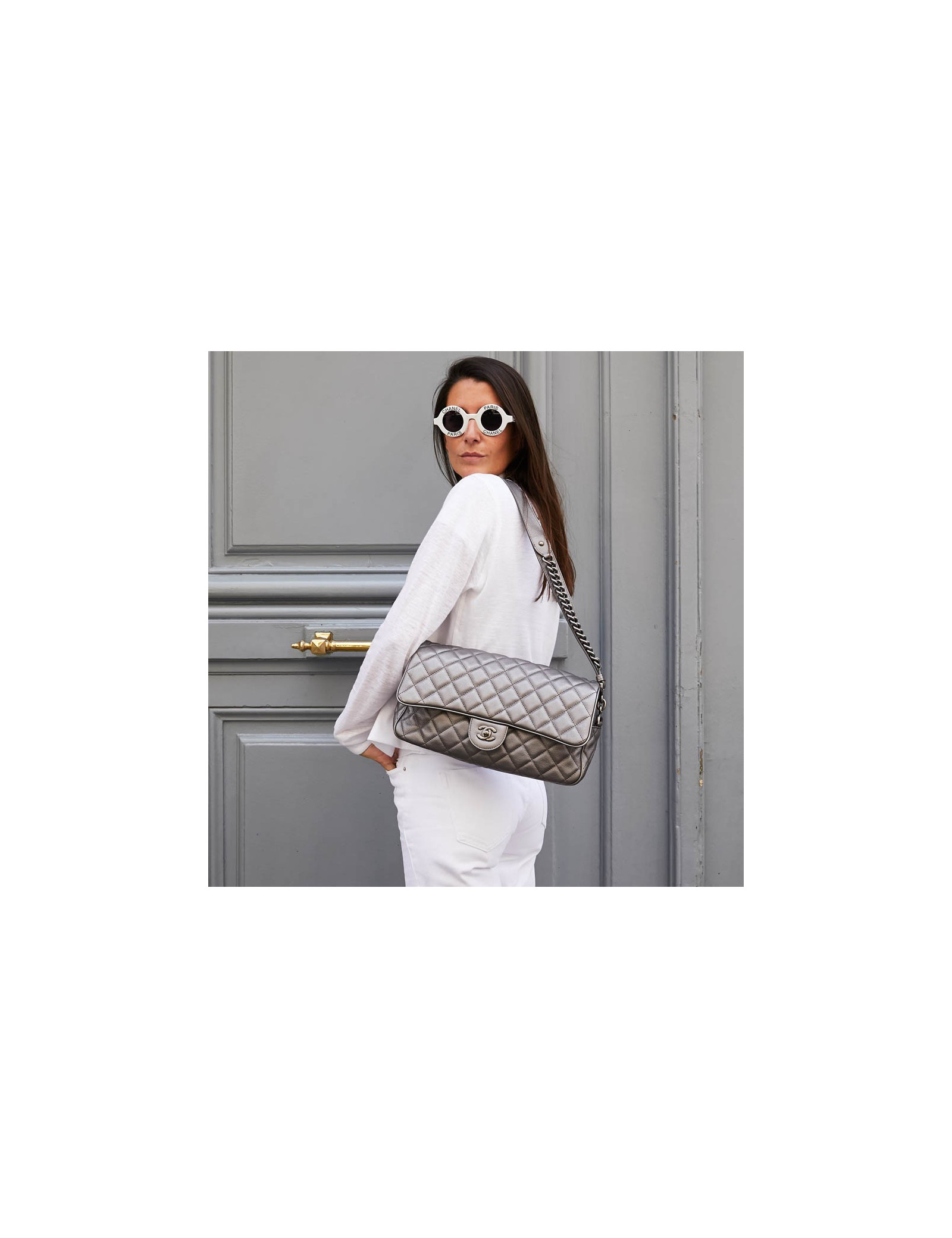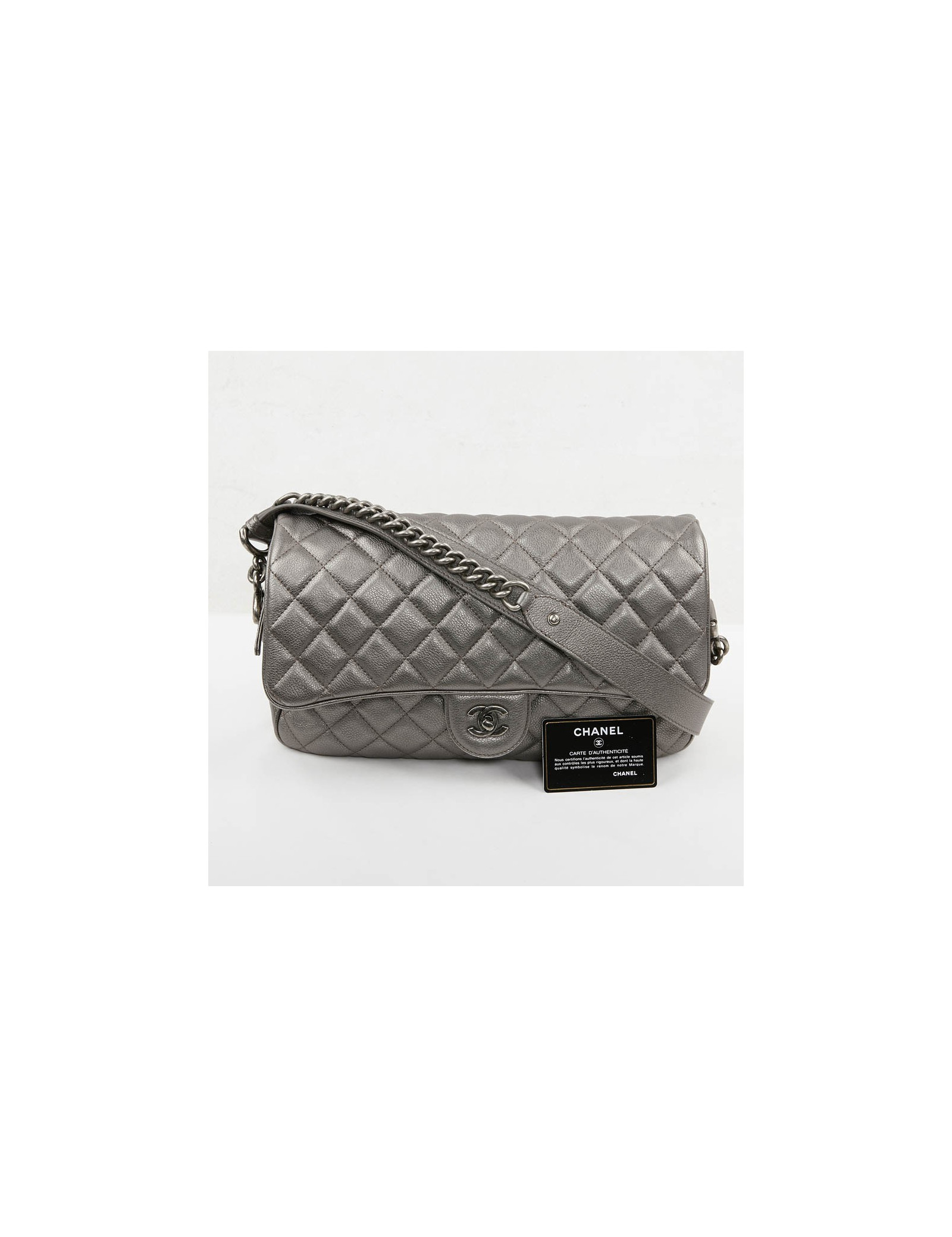 Ce sac CHANEL s'apparente au modèle Timeless avec quelques déclinaisons. Il est en cuir grainé métallisé et sa bijouterie est en métal argenté vieilli, ce qui lui donne un aspect rock. L'intérieur est en toile avec une poche zippée. Sa bandoulière est faite d'un mélange de cuir et de larges maillons. Il se porte à l'épaule.