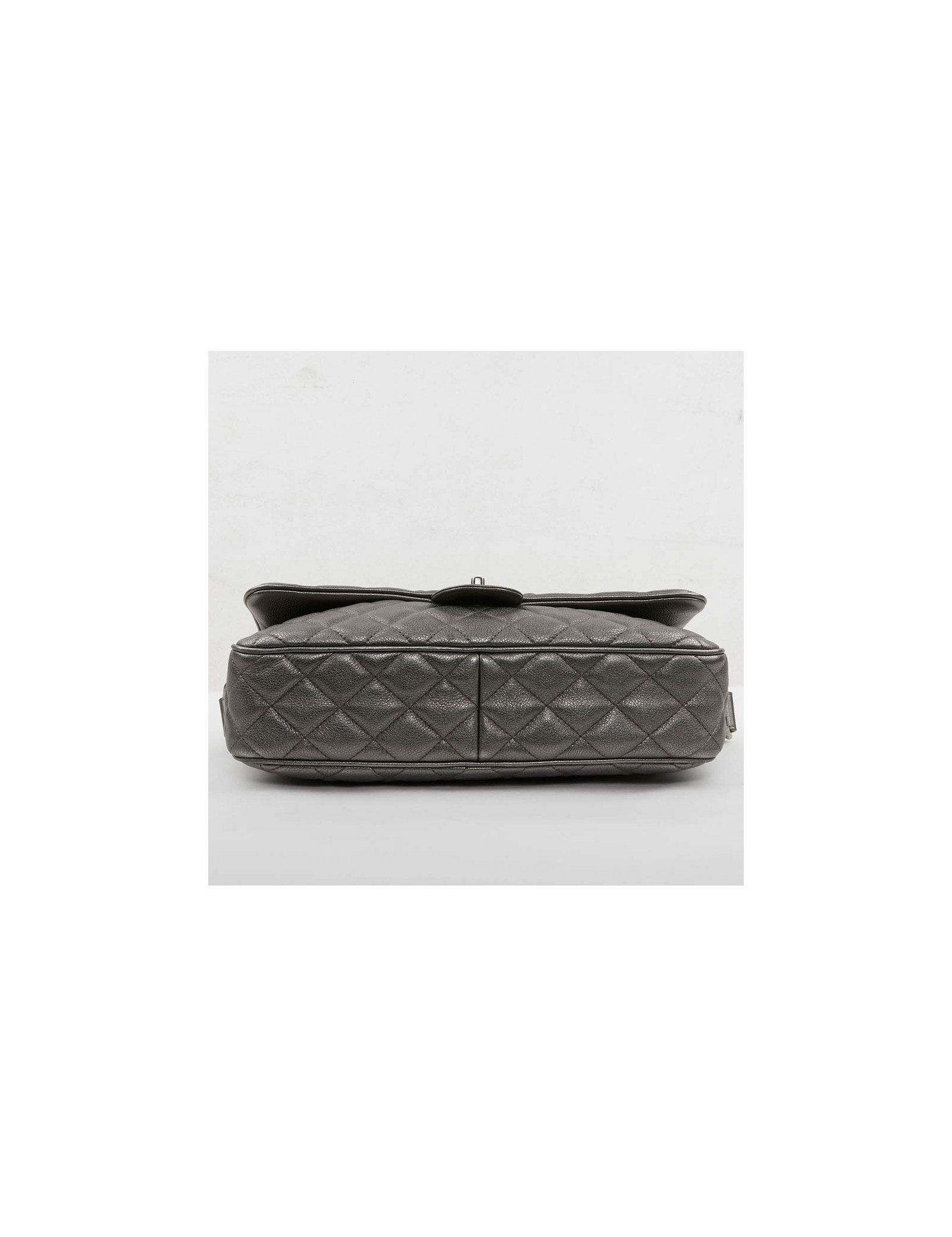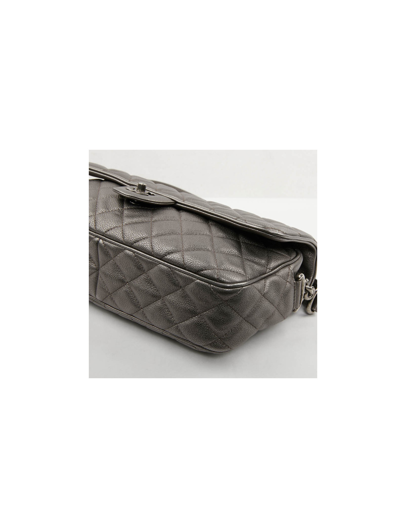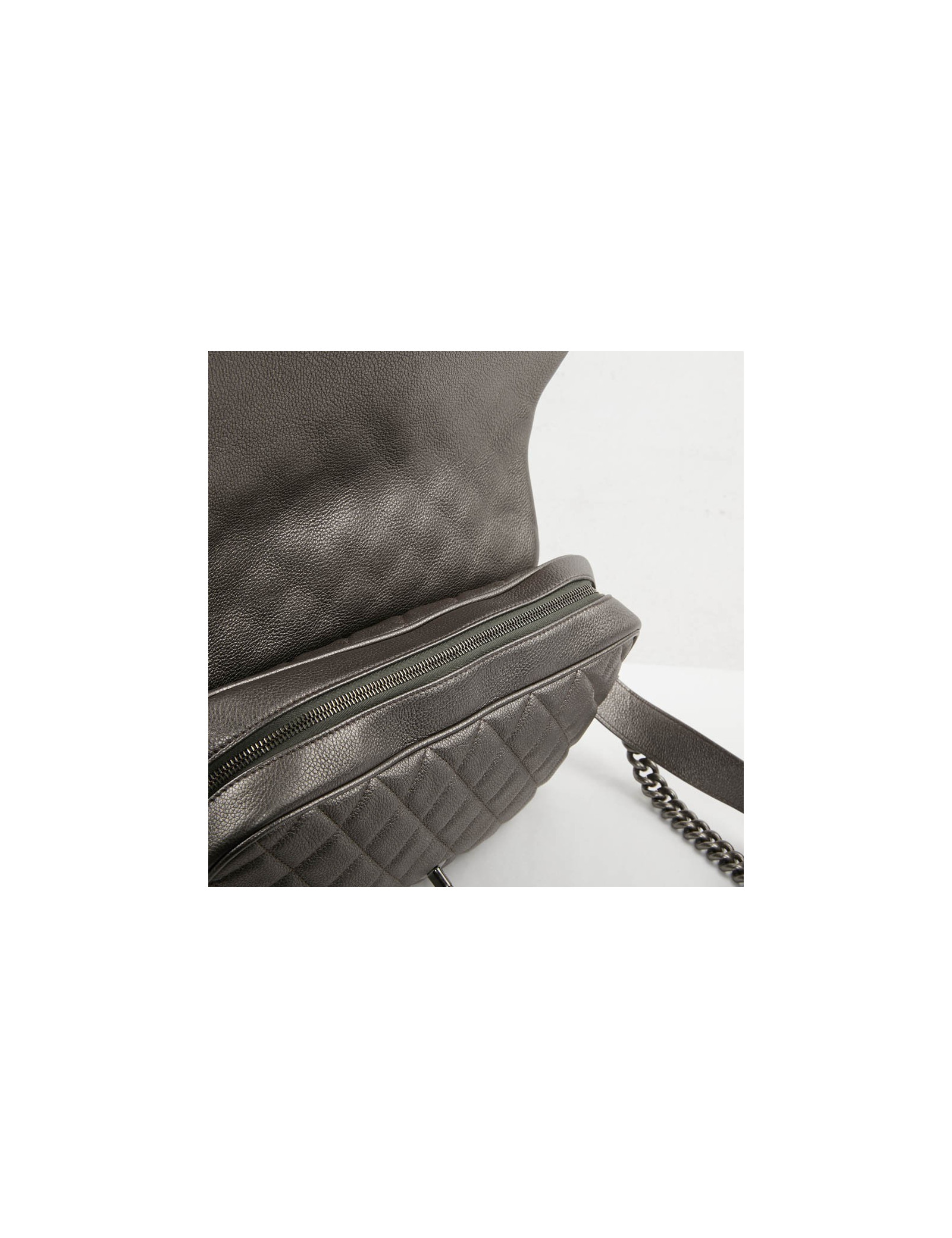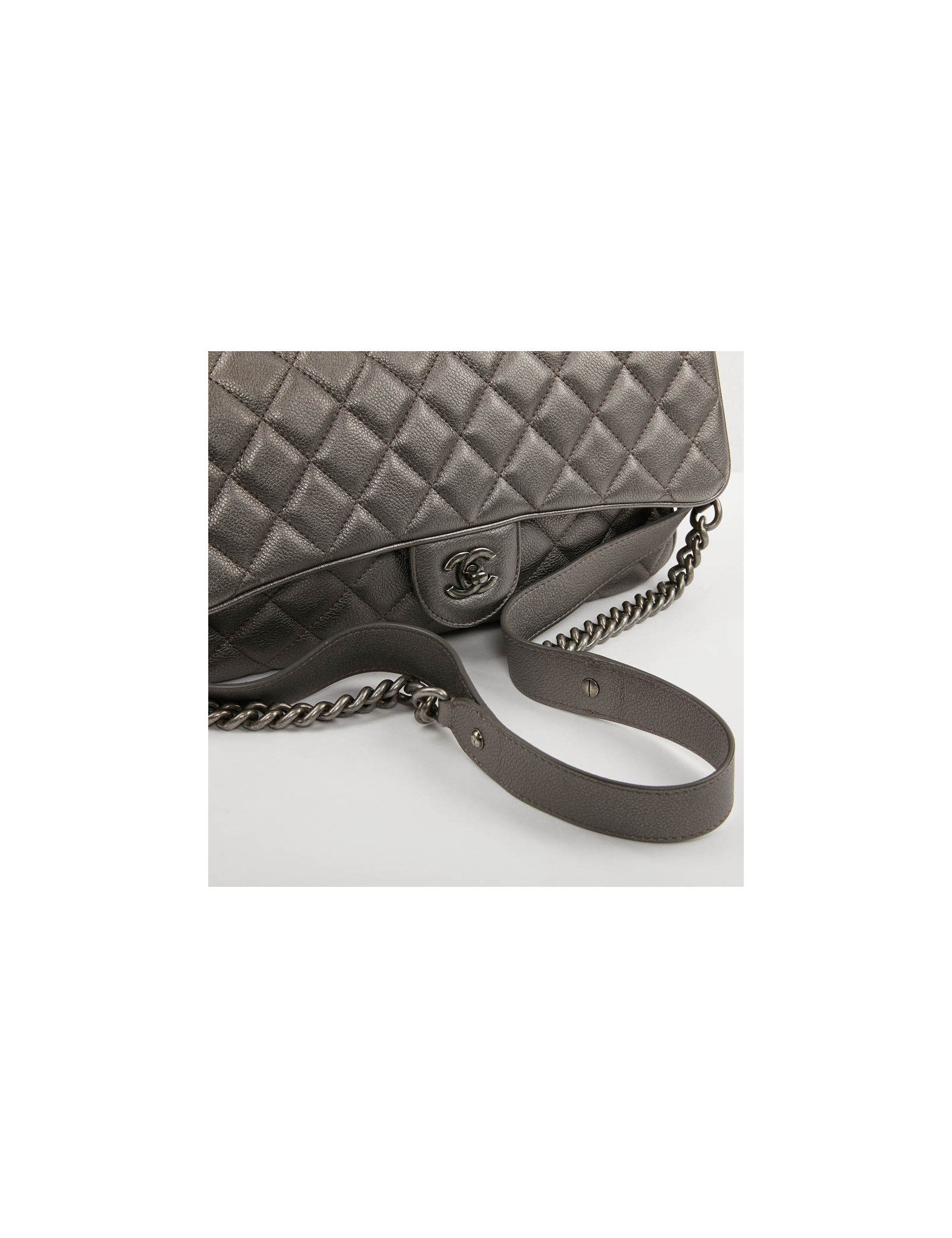 Ce sac CHANEL s'apparente au modèle Timeless avec quelques déclinaisons. Il est en cuir grainé métallisé et sa bijouterie est en métal argenté vieilli, ce qui lui donne un aspect rock. L'intérieur est en toile avec une poche zippée. Sa bandoulière est faite d'un mélange de cuir et de larges maillons. Il se porte à l'épaule.
