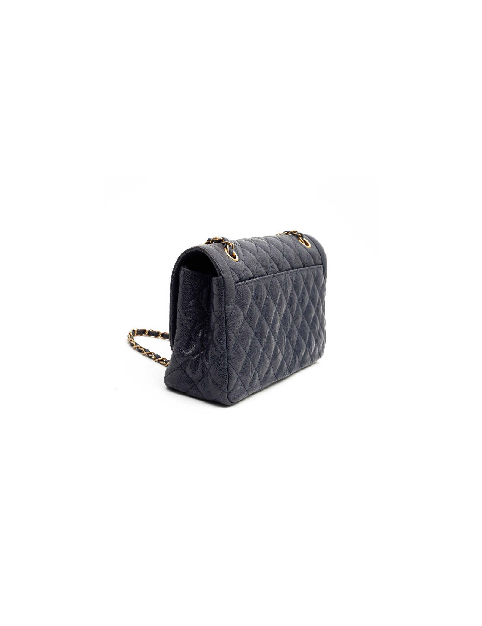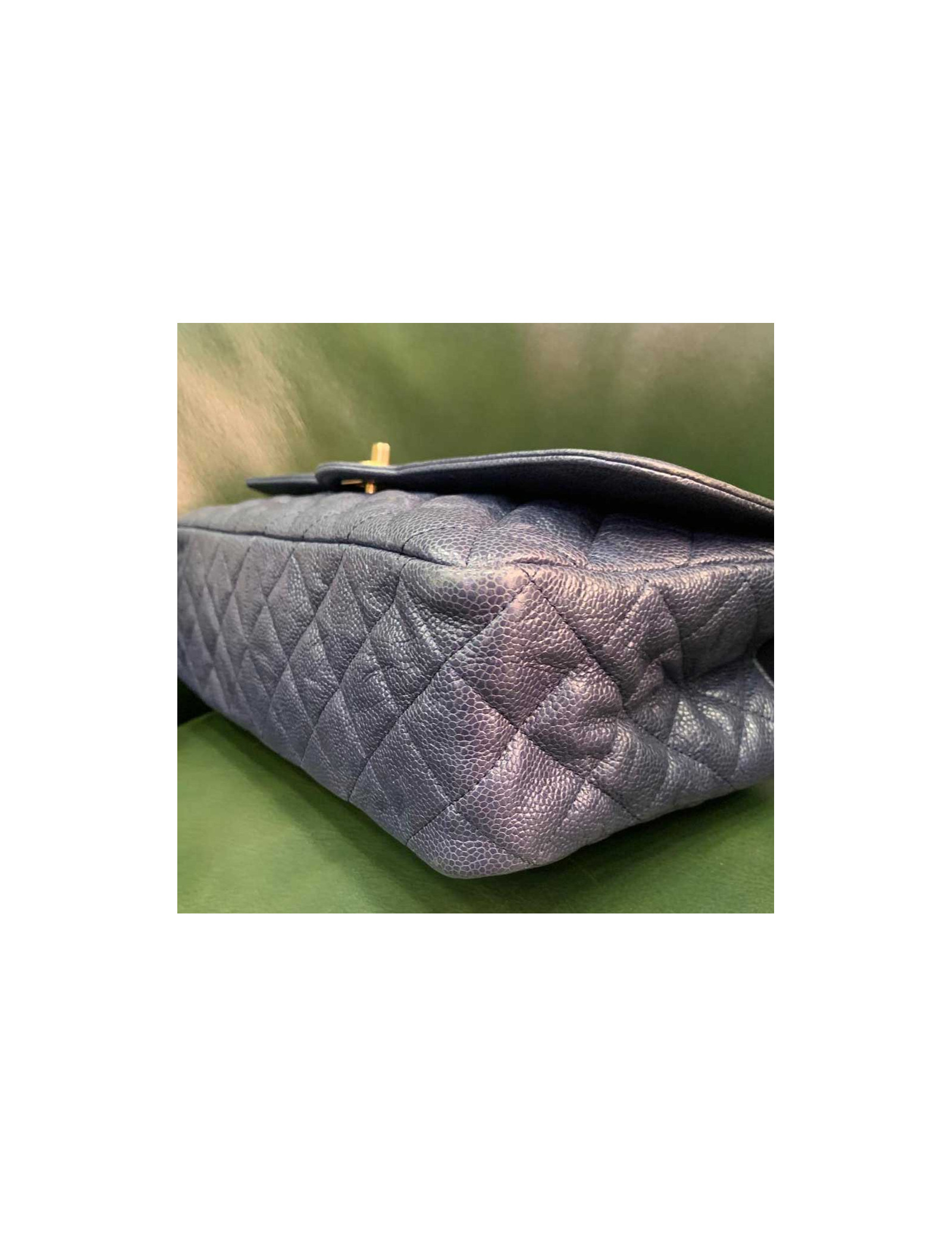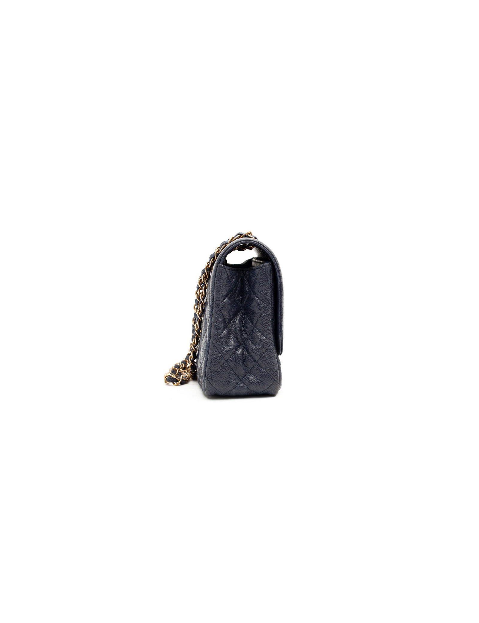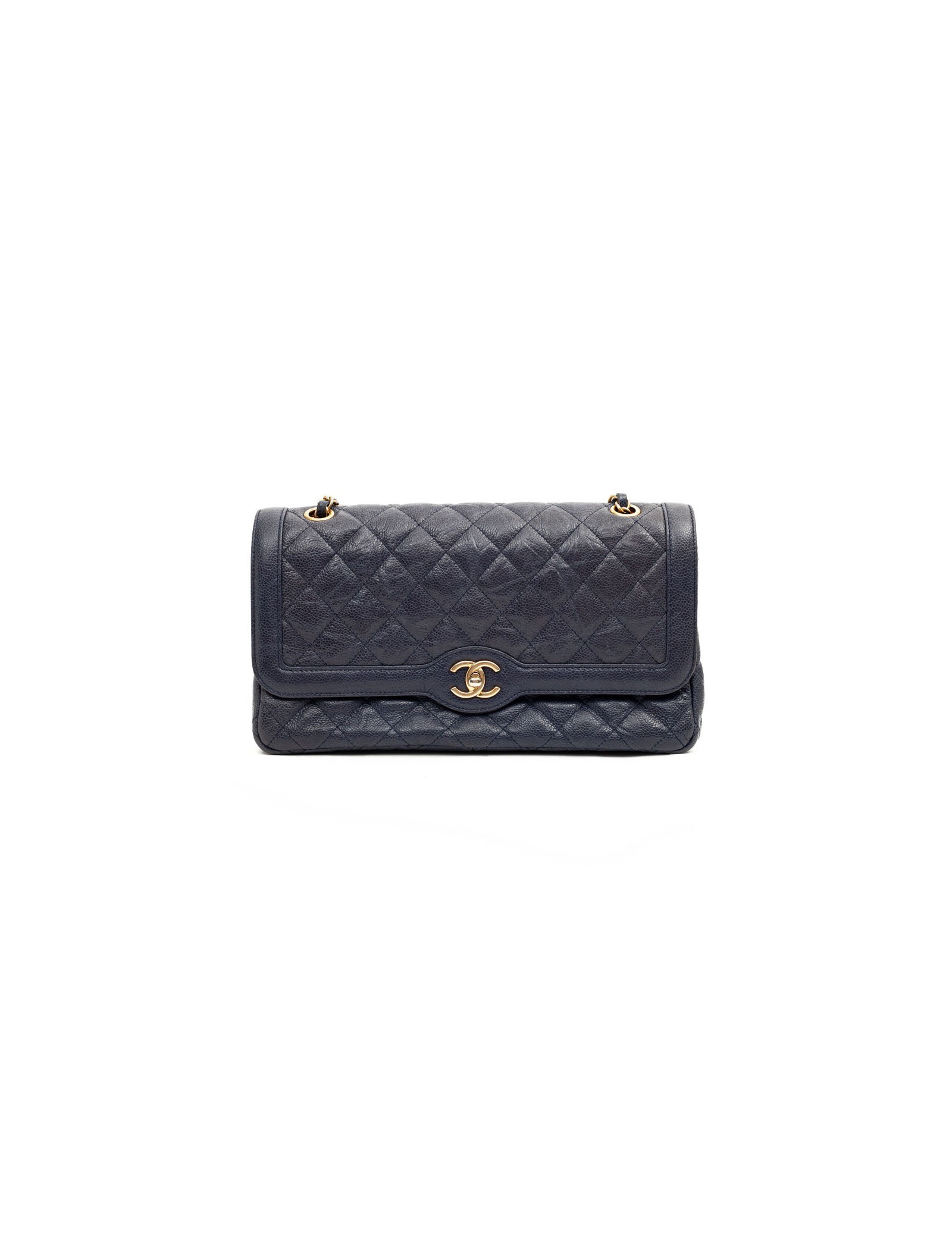 Sac à la taille idéale pour tous les jours. Il pourra contenir tous vos accessoires du quotidien. Il se porte à l'épaule ou crossbody à l'aide d'une bandoulière en chaine dorée mat et cuir. Fermoir CC, emblématique de la marque. Il est de couleur bleu en cuir matelassé grainé froissé.