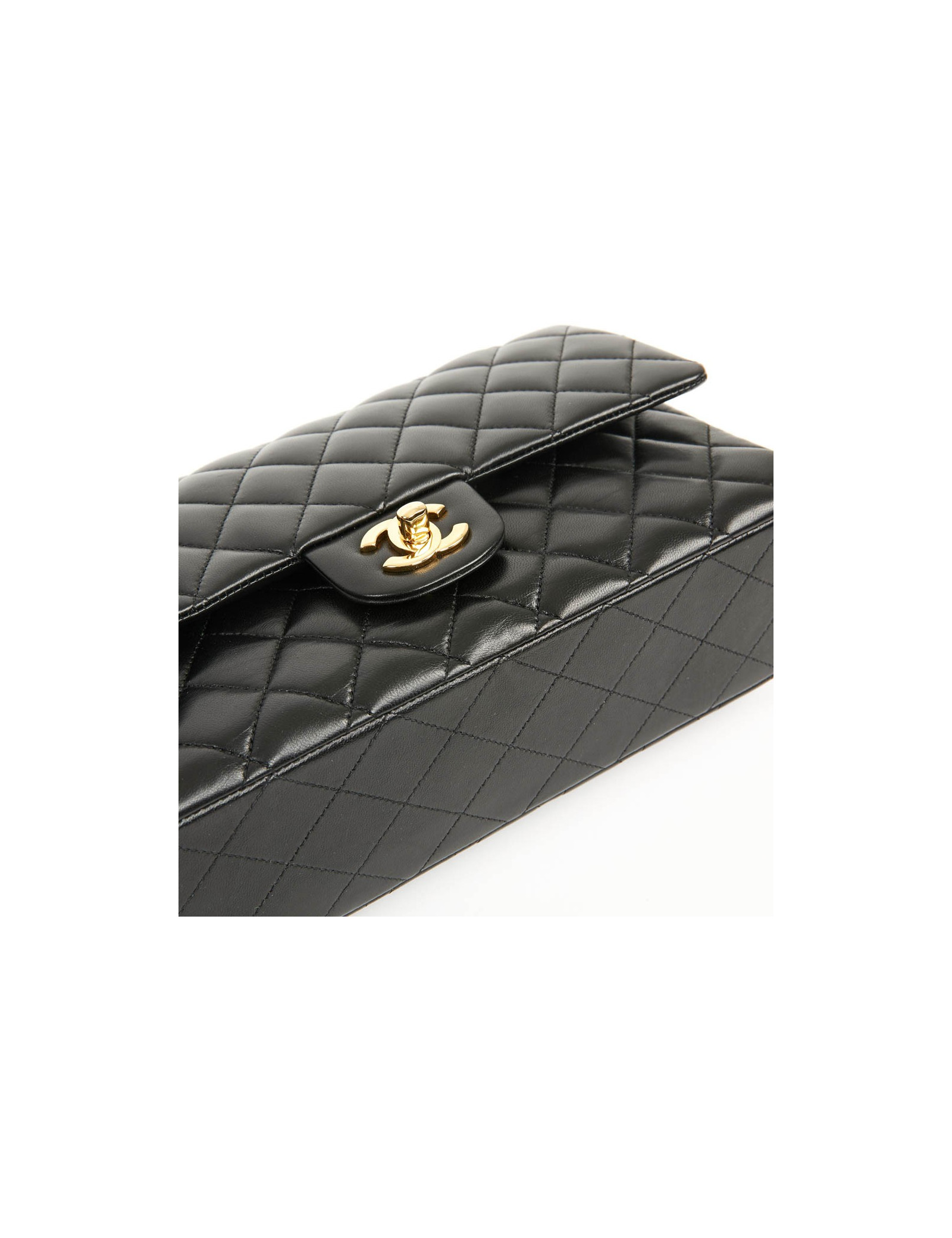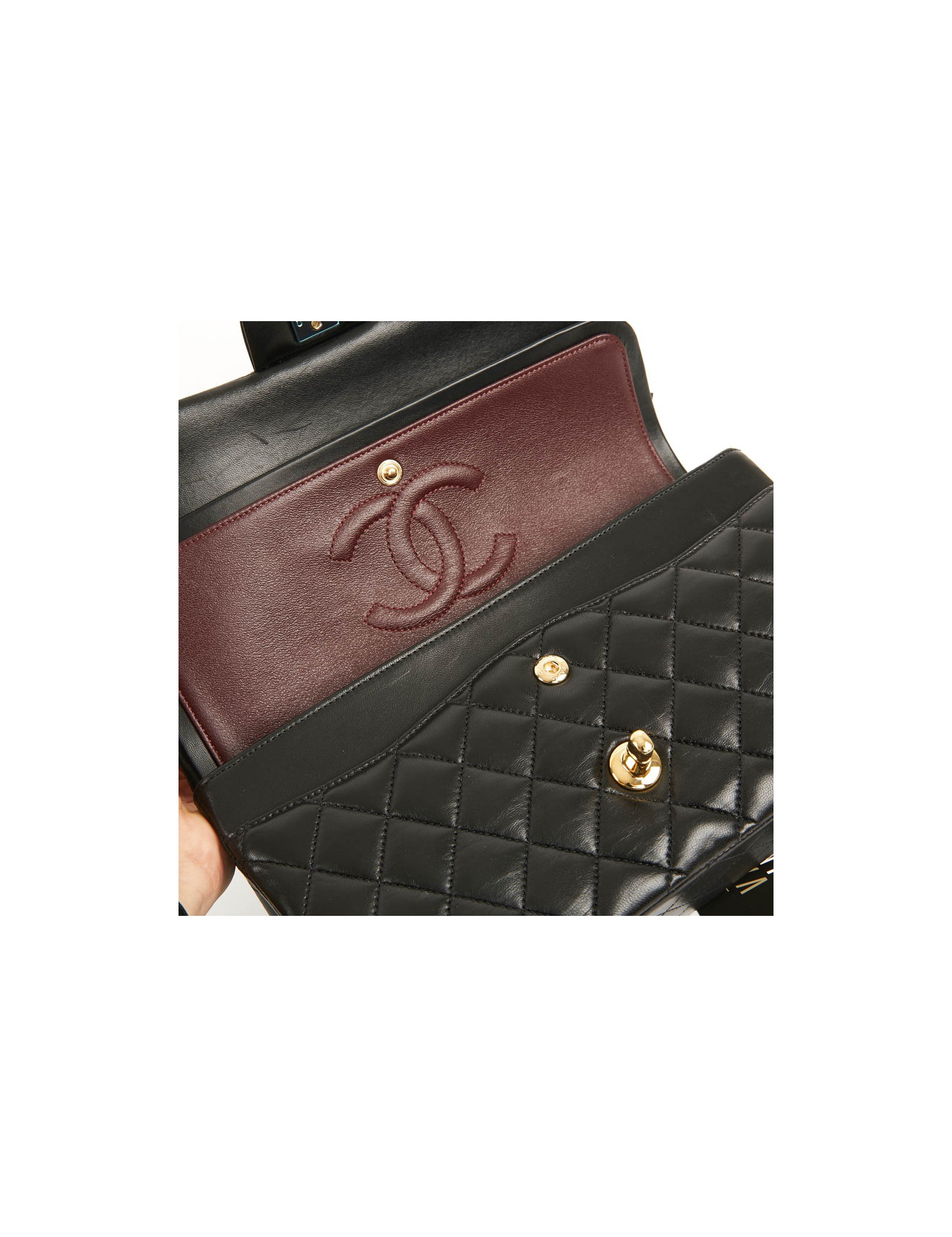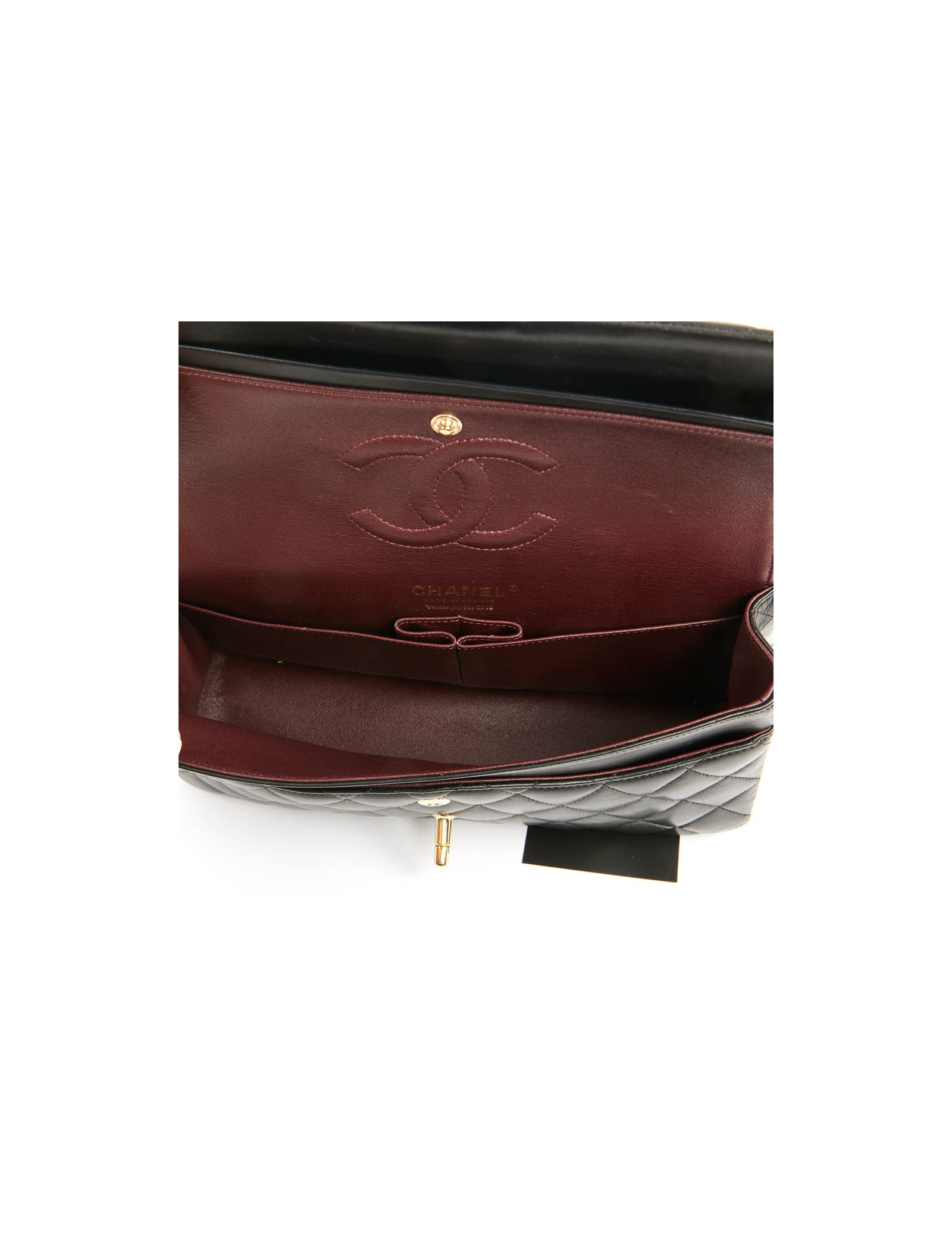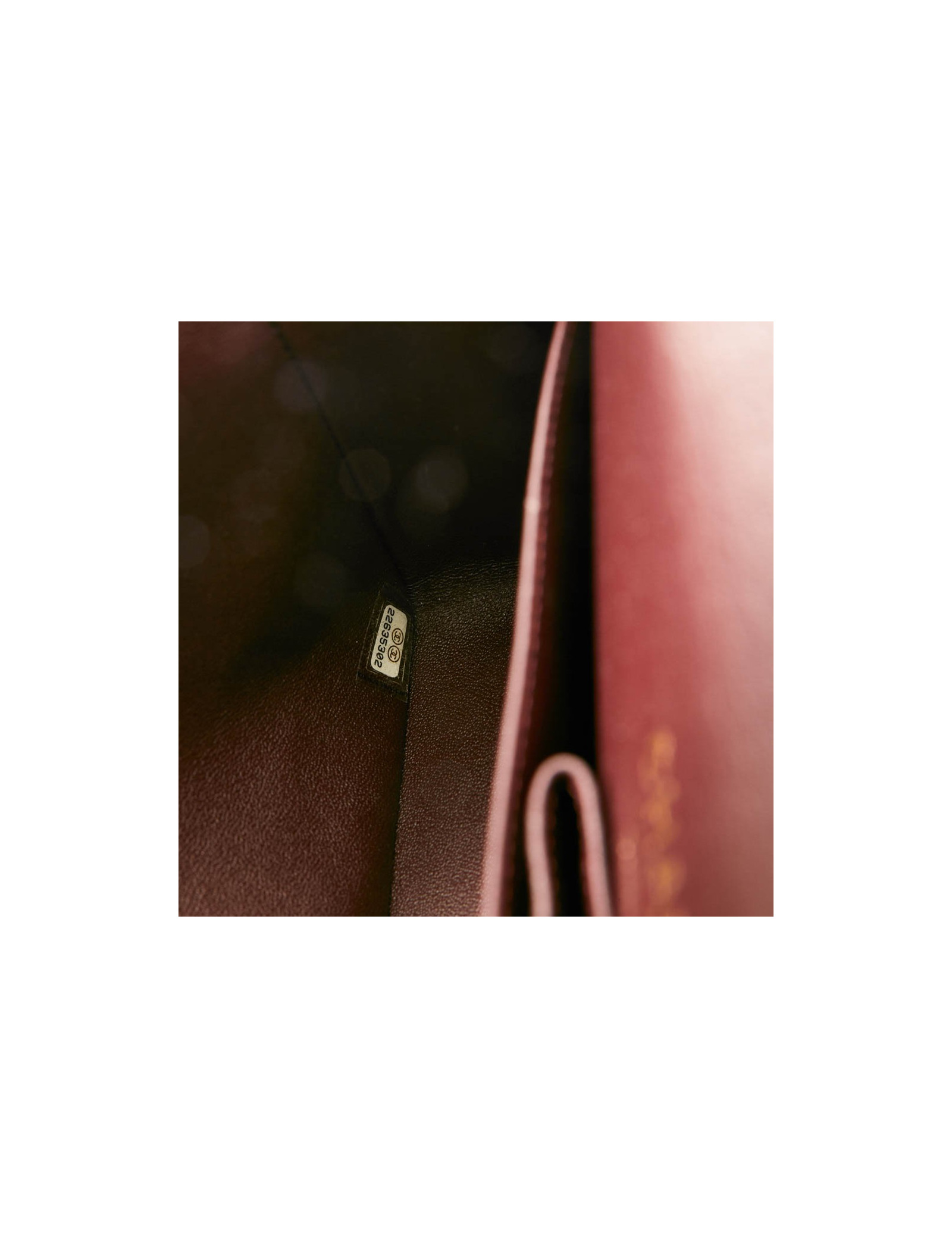 Elégant sac à main Chanel, en cuir d'agneau lisse matelassé. La bijouterie est dorée. Il se porte à l'épaule. Il a un double rabat. L'intérieur est doublé en cuir bordeaux. Sur le double rabat, légères griffures dues à la fragilité du cuir.