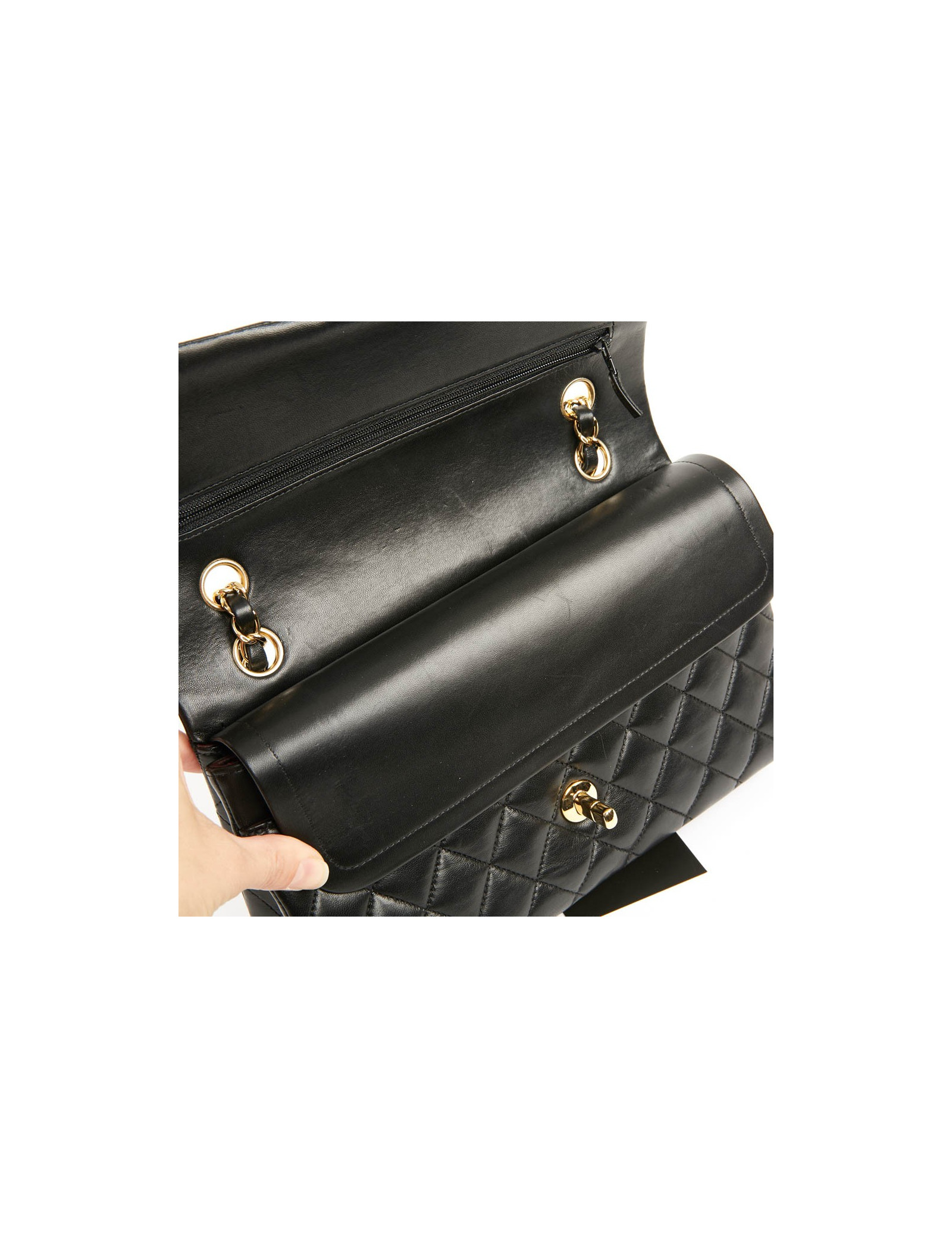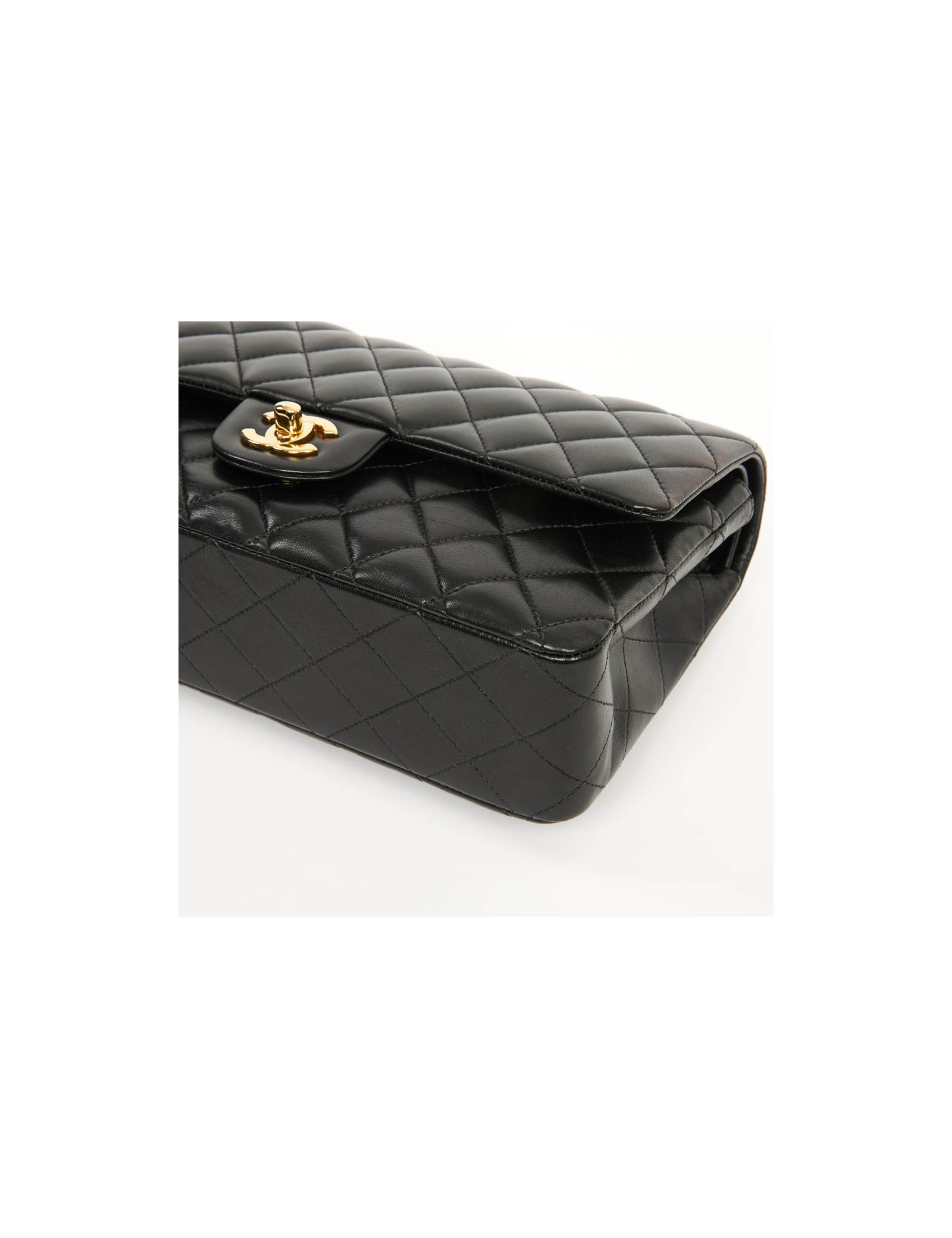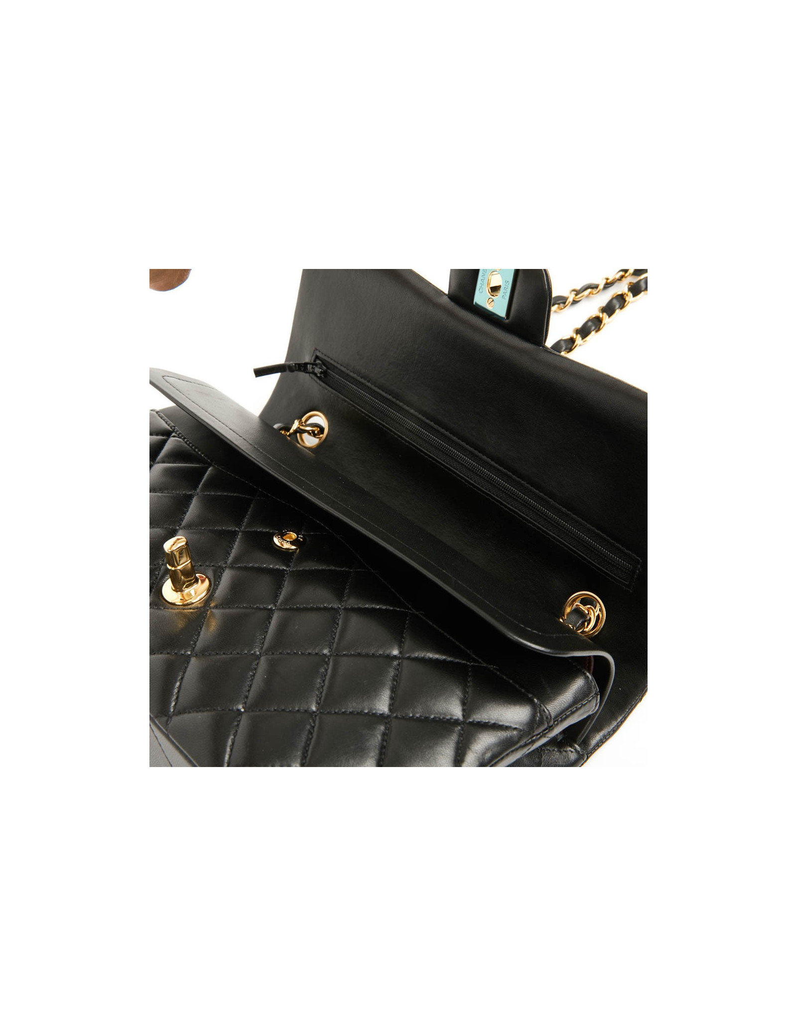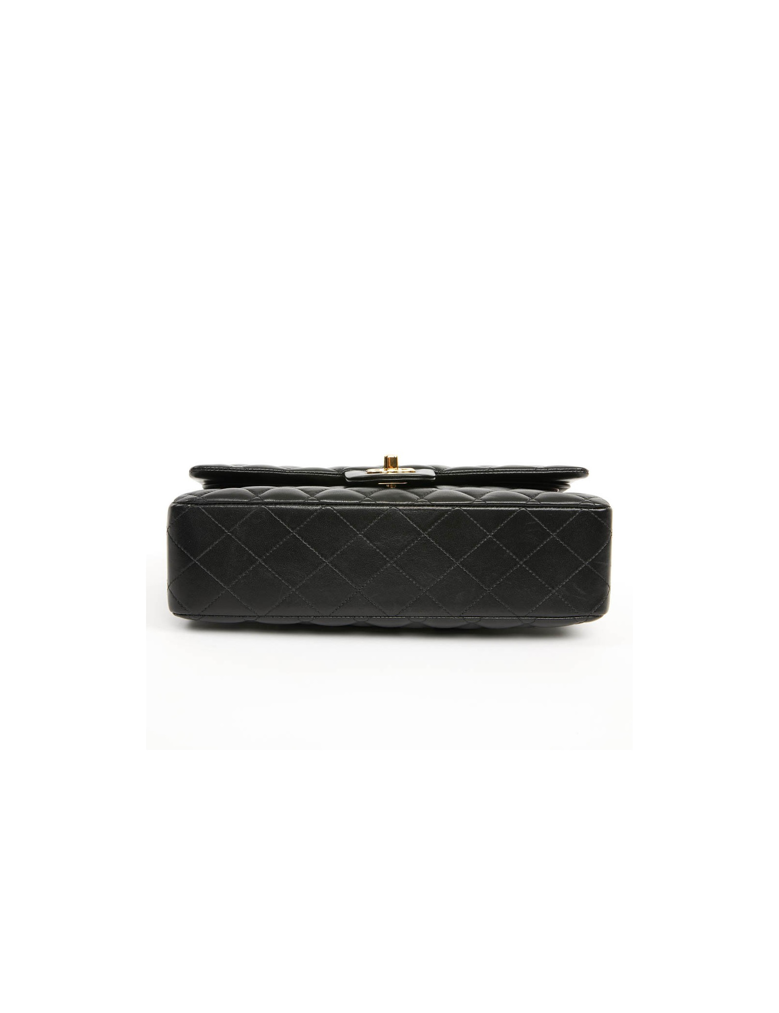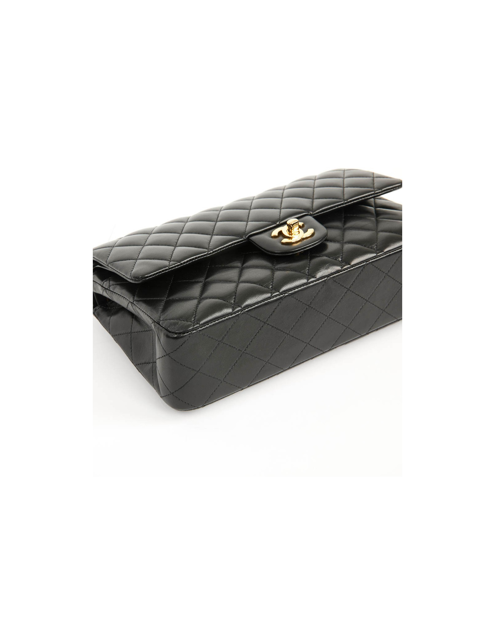 Elégant sac à main Chanel, en cuir d'agneau lisse matelassé. La bijouterie est dorée. Il se porte à l'épaule. Il a un double rabat. L'intérieur est doublé en cuir bordeaux. Sur le double rabat, légères griffures dues à la fragilité du cuir.